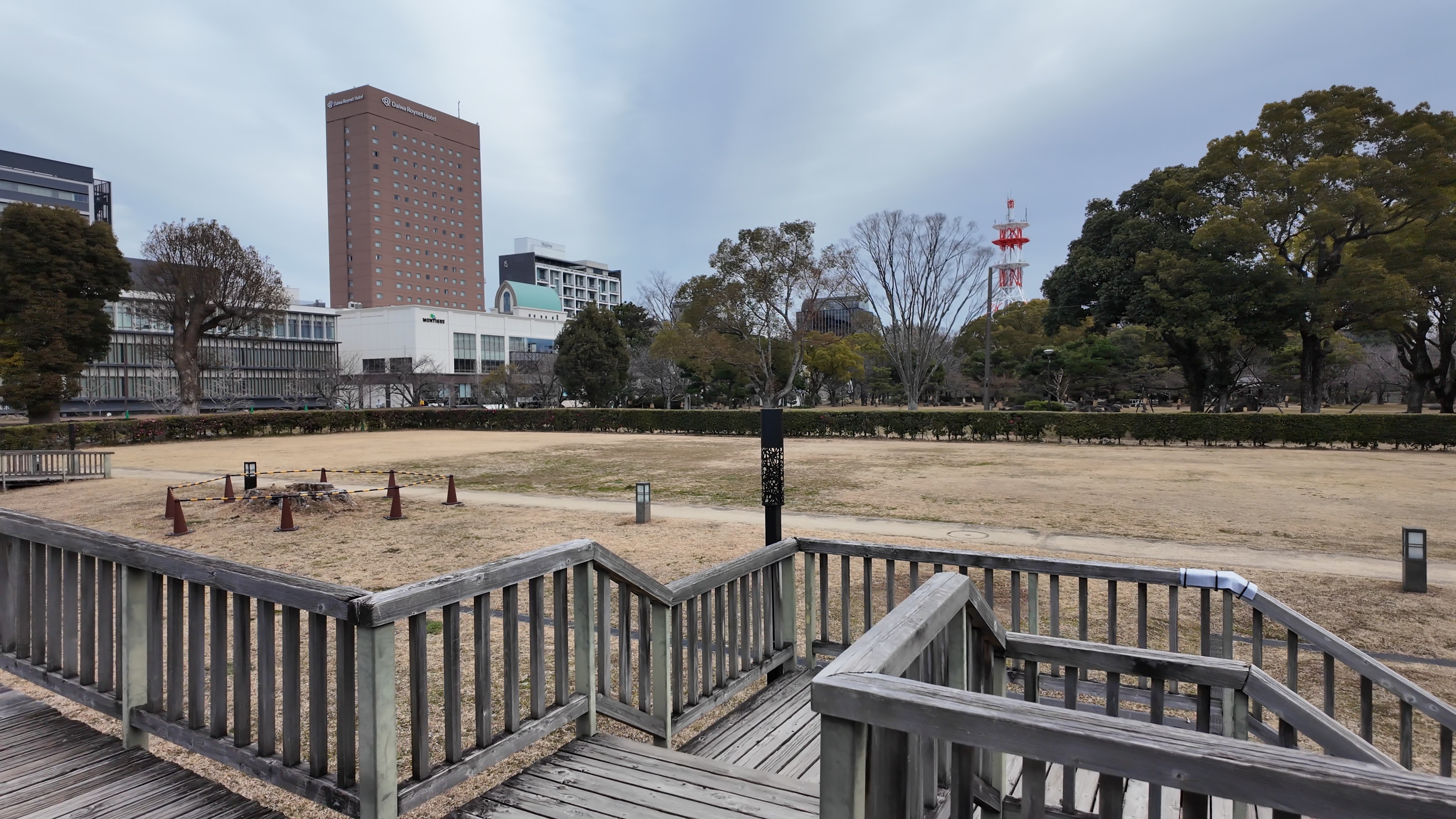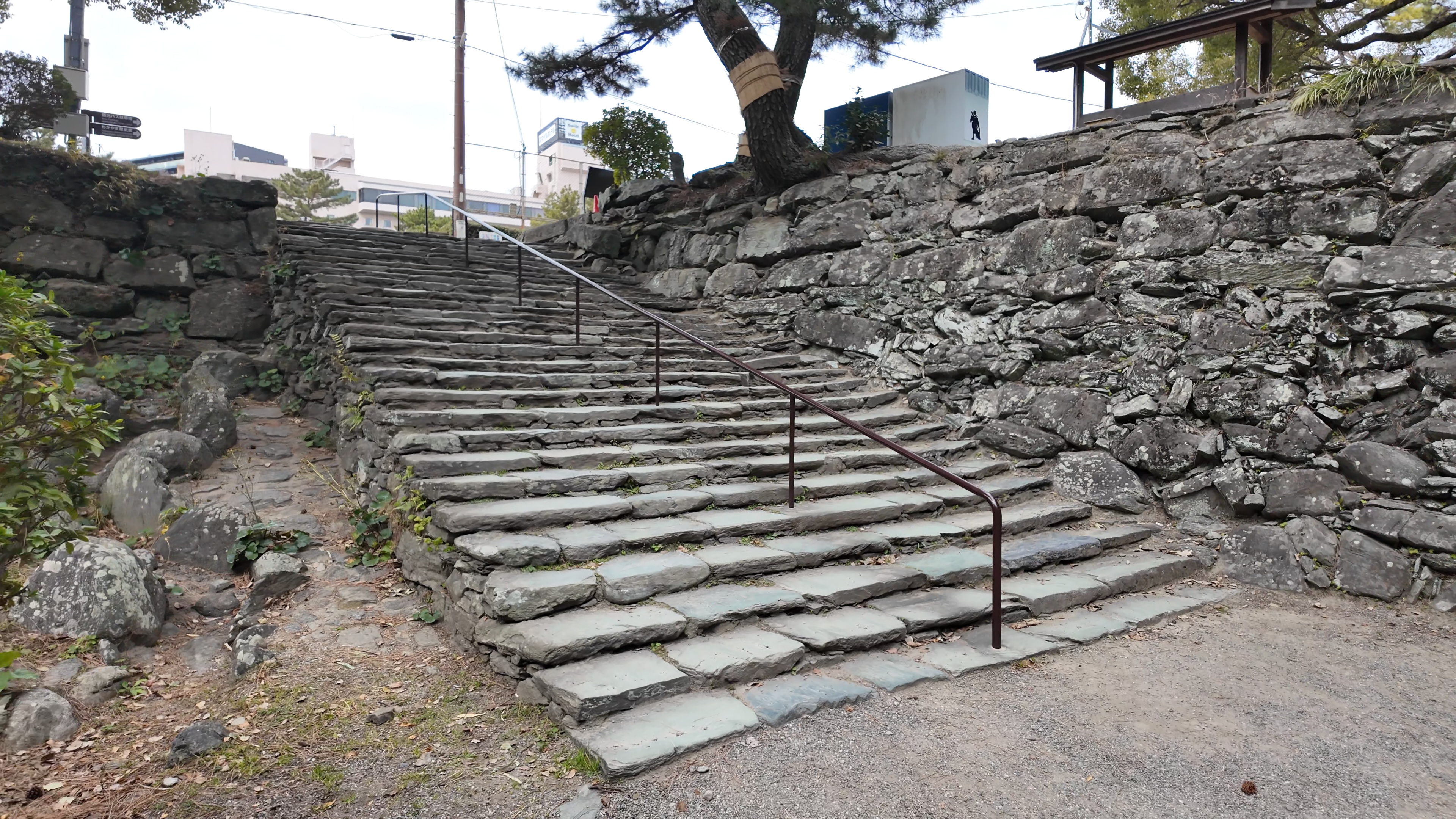 小倉城は北九州市にある梯郭式平城で続日本100名城の181番です。江戸時代には小倉藩の藩庁が置かれました。駐車場から地上に出て西へ進むと石垣が現れますが、石垣の切れ目が走る白い忍者のようにみえてかわいいです。ここから天守の方向へ進み、右側一段高くなっているところは御城米屋跡、正面にしろテラス。ここはお土産屋で、スタンプと御城印はここで入手できます。