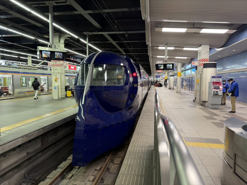 7:40ごろ宿を出て、大阪メトロでなんばへ。南海のなんば駅では斬新なかたちの特急ラピートがあったのでパチリ。やっぱりこのデザインはすごいです、銀河鉄道999を思い起こさせます。8:15発の特急サザンで和歌山市までいきますが、空いていたので自由席で。この特急、指定席はちゃんとした特急車両、自由席は普通の通勤車両なんですね。なんばではガラガラだったのに、次の駅からどんどん人が乗ってきたので帰りは指定席にしようと決めたのでした。