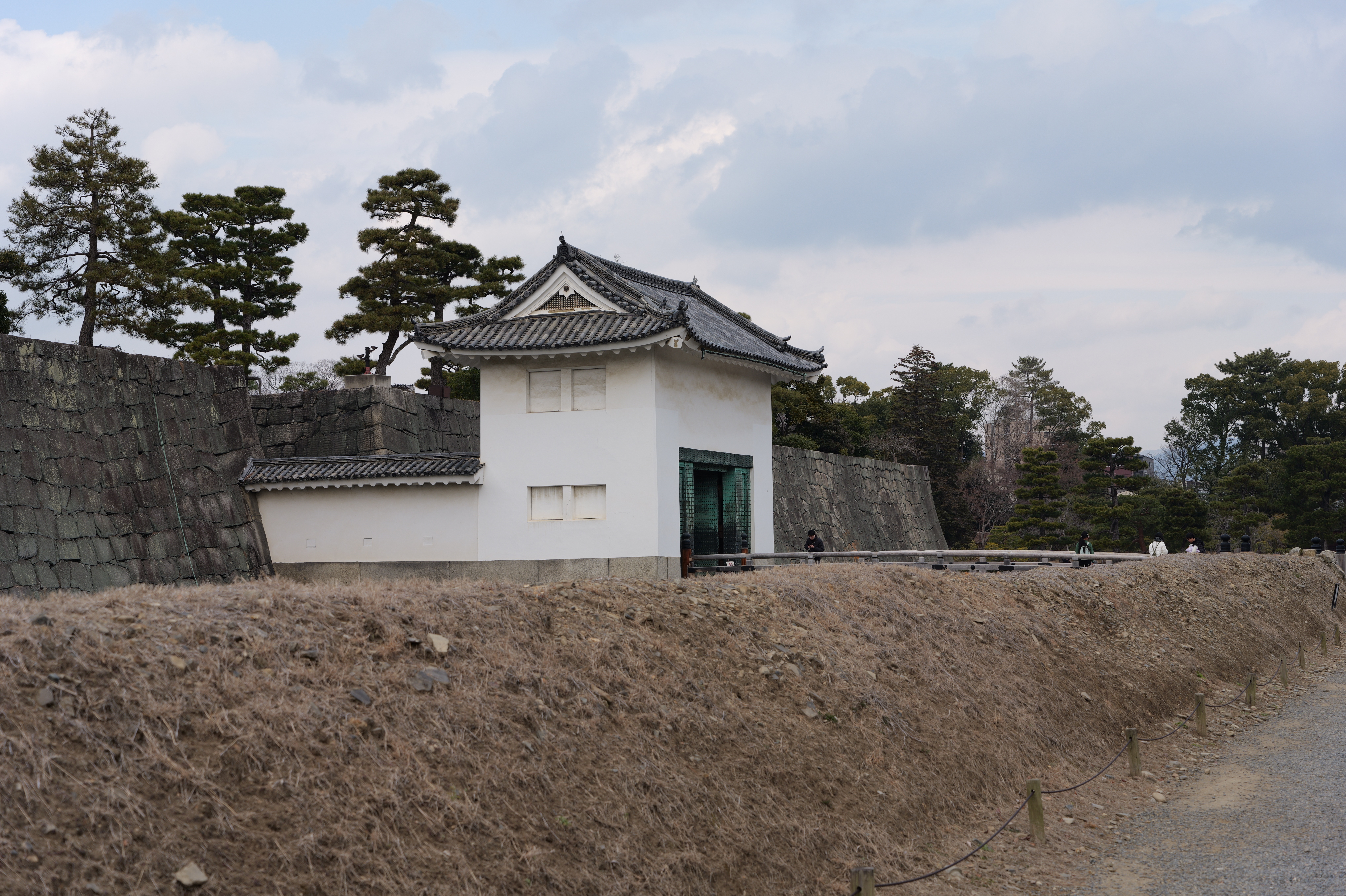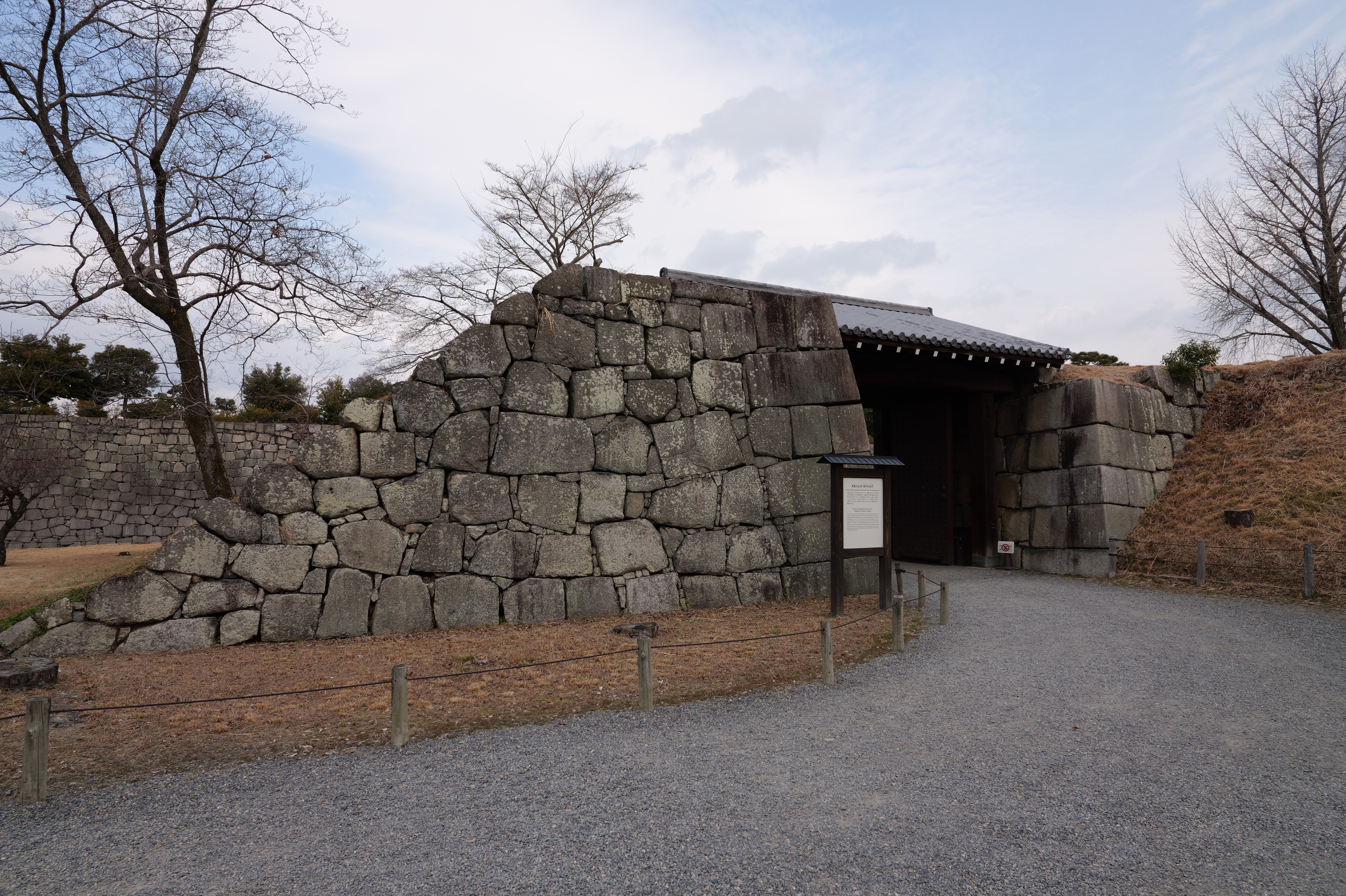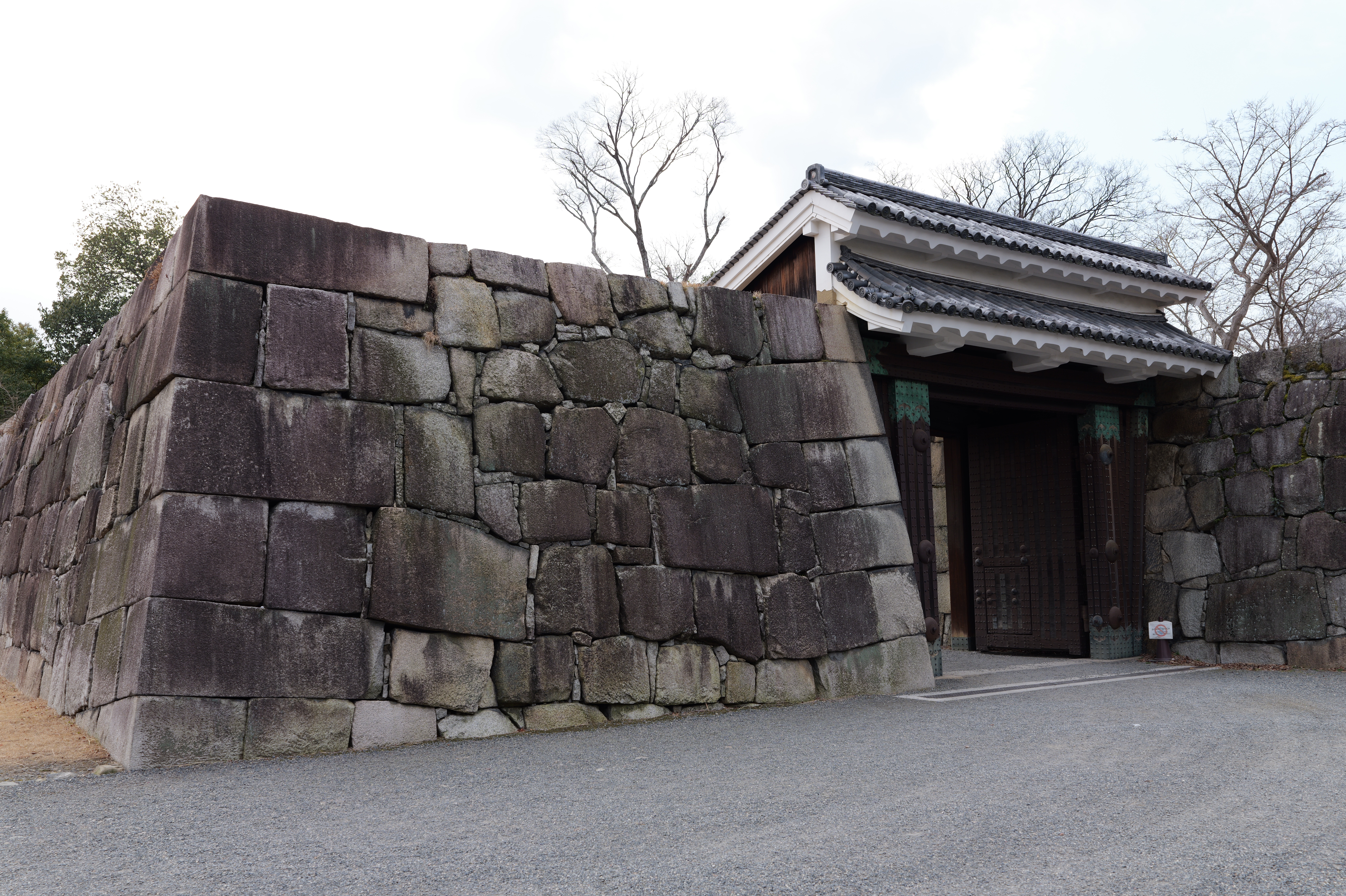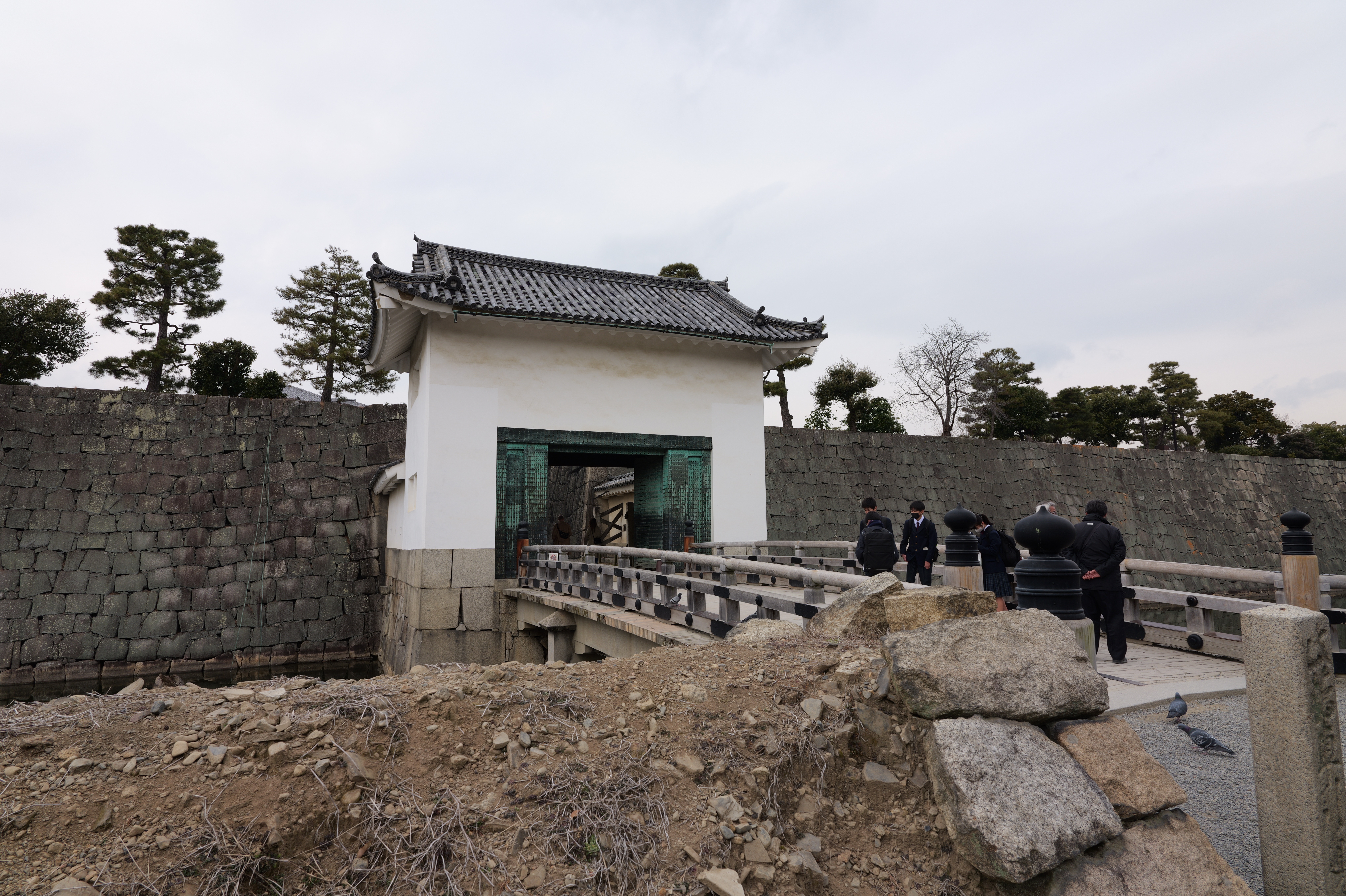 南の丸の東側に出ると右側に岡口門、左側に岡中門跡。岡口門に進みます。岡口門は築城当時の大手門でした。空襲でも焼けずに残った数少ない遺構で、北側の土塀とともに重要文化財に指定されています。岡口門を出たところには東内堀が広がっています。岡中門跡をとおり、二の丸、御橋廊下、勘定御門を通って13時半前、約三時間半の散策終了です。