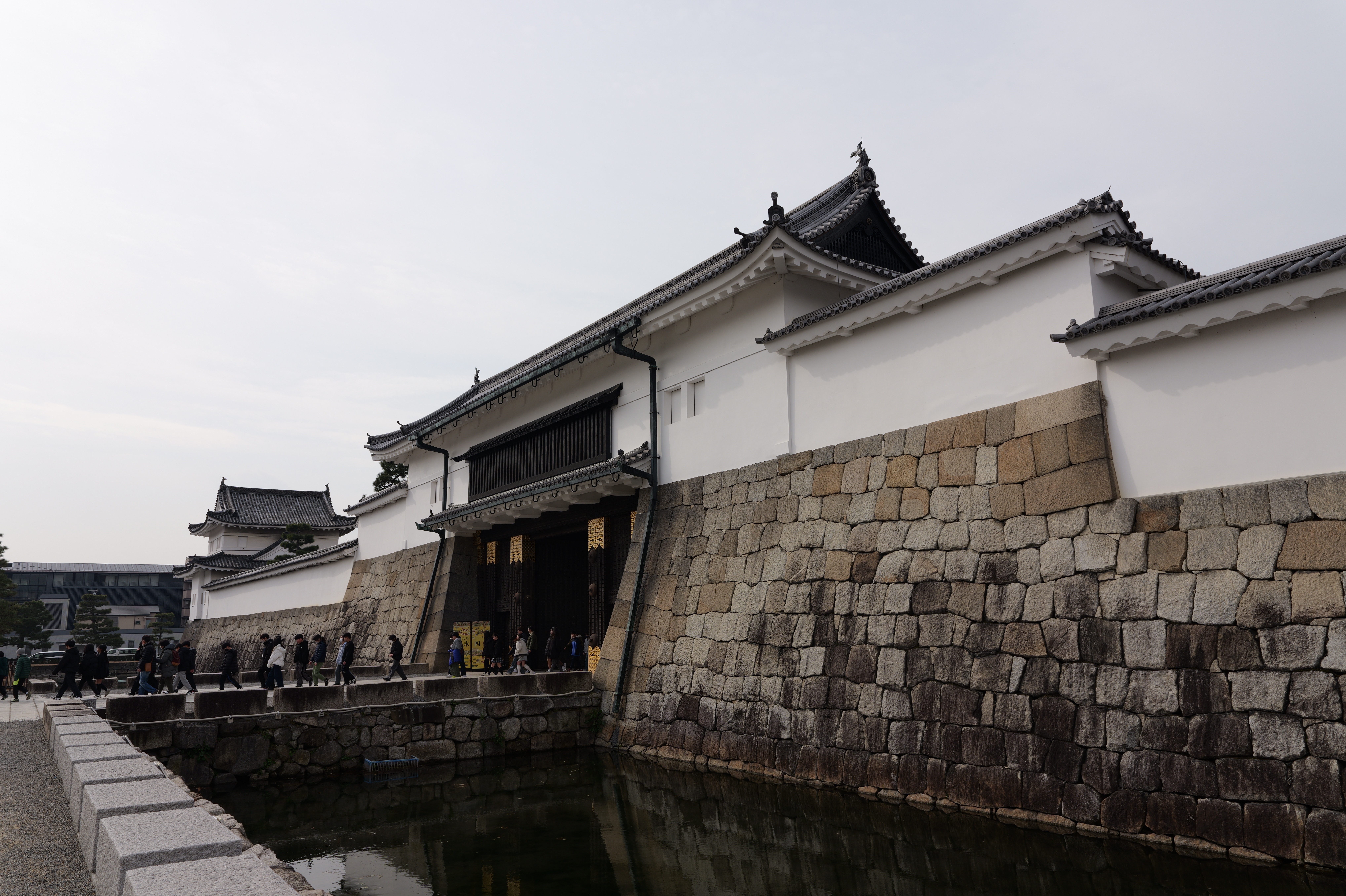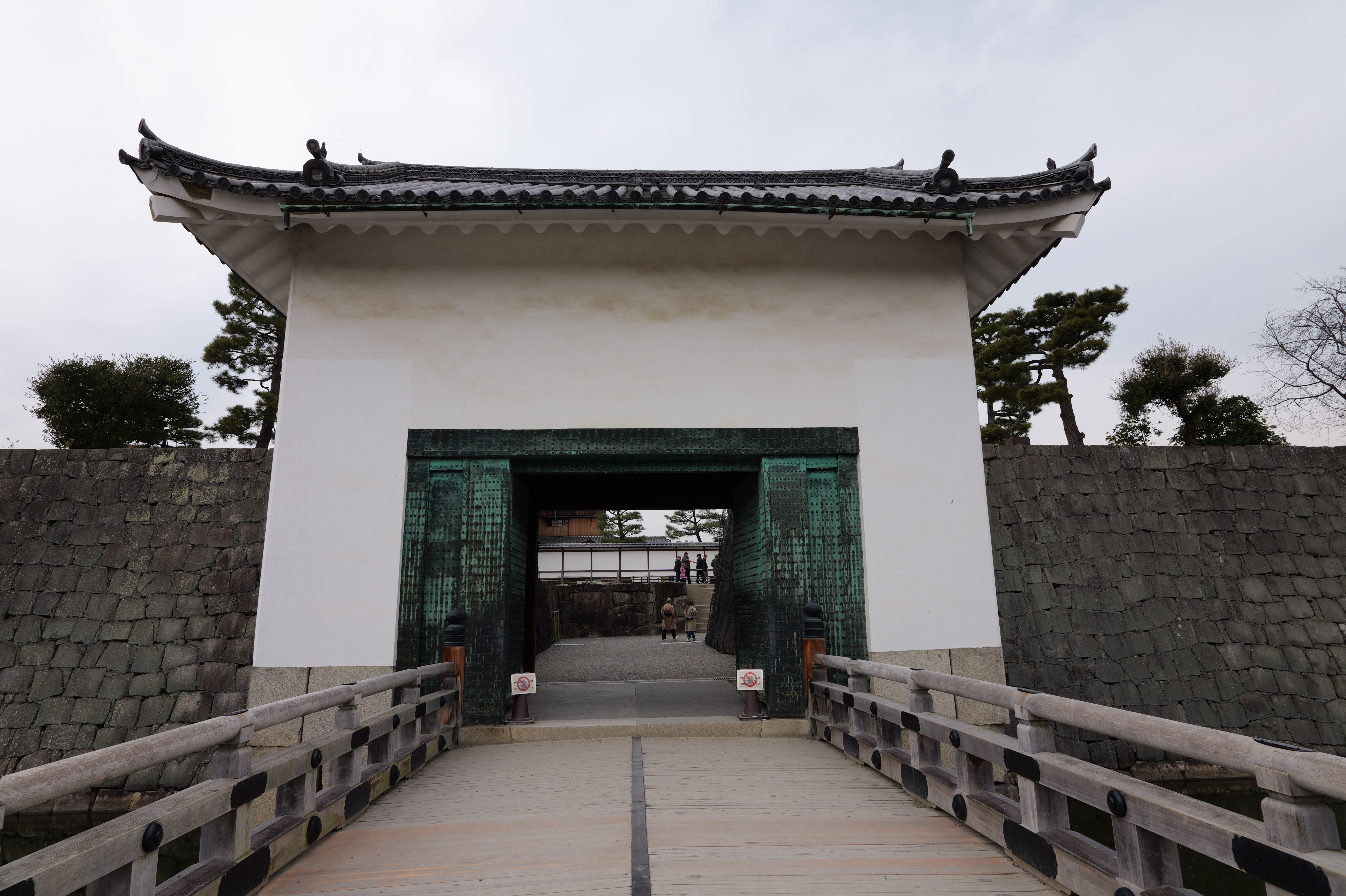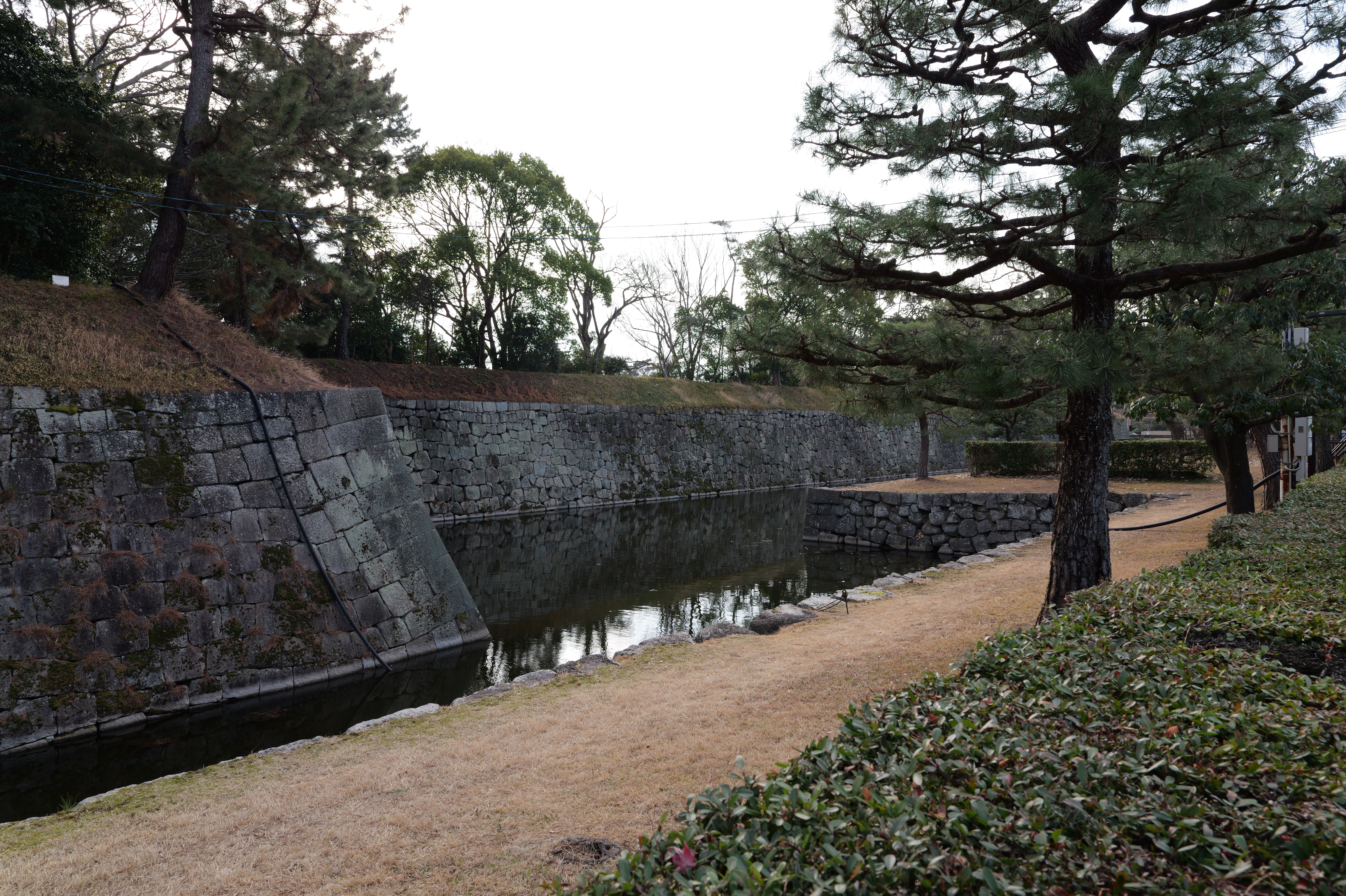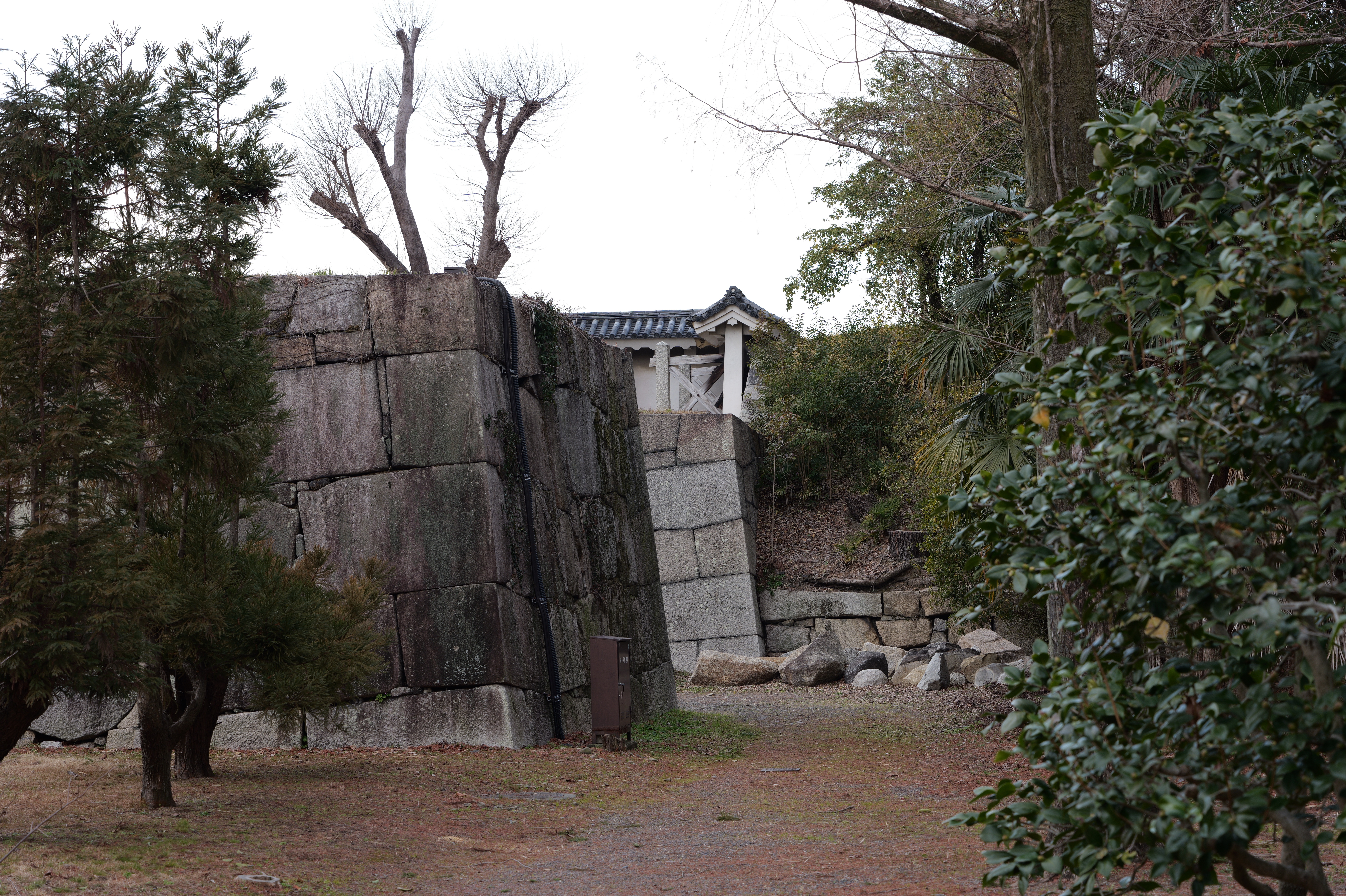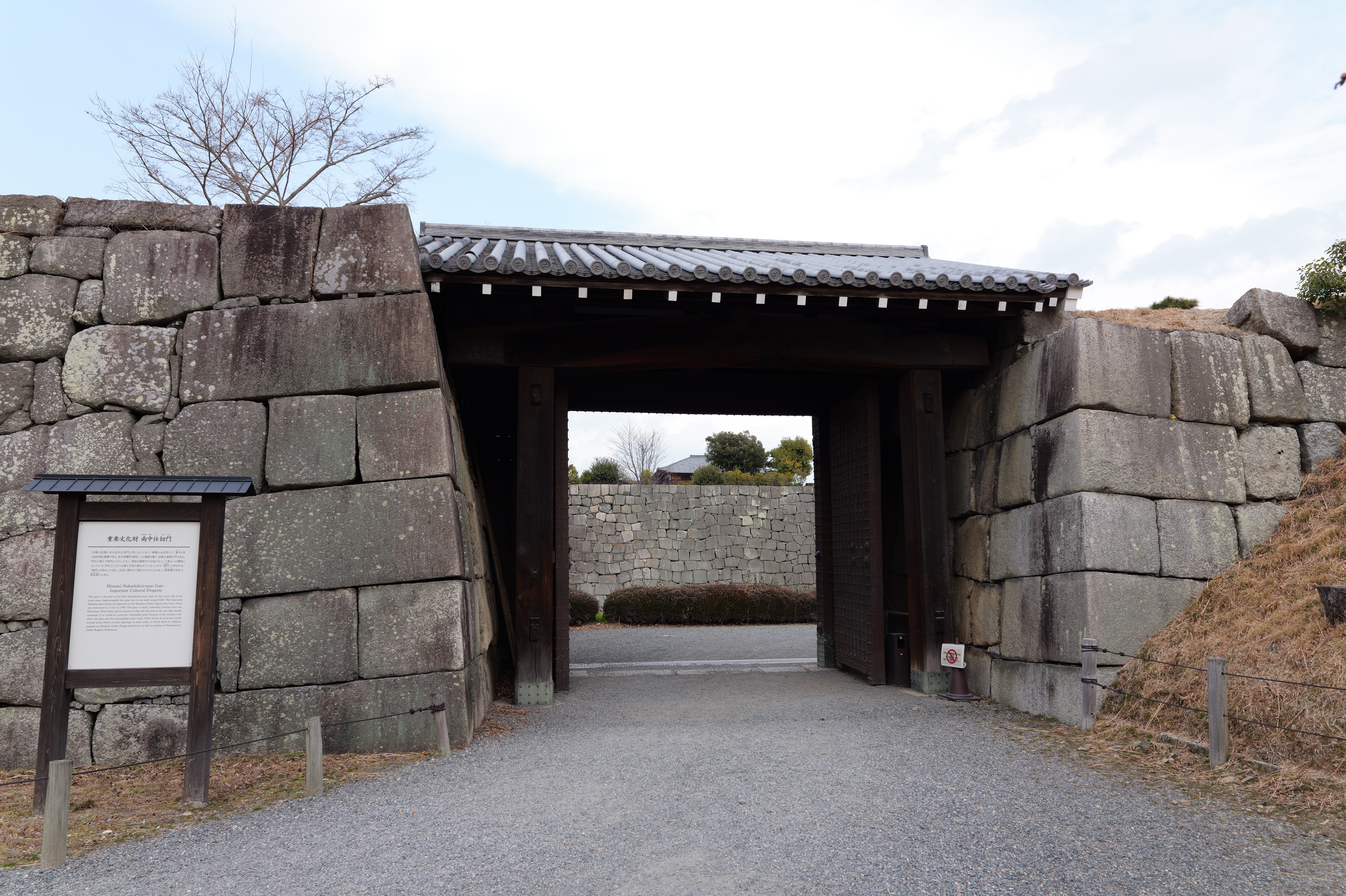 南の丸の東側に出ると右側に岡口門、左側に岡中門跡。岡口門に進みます。岡口門は築城当時の大手門でした。空襲でも焼けずに残った数少ない遺構で、北側の土塀とともに重要文化財に指定されています。岡口門を出たところには東内堀が広がっています。岡中門跡をとおり、二の丸、御橋廊下、勘定御門を通って13時半前、約三時間半の散策終了です。
