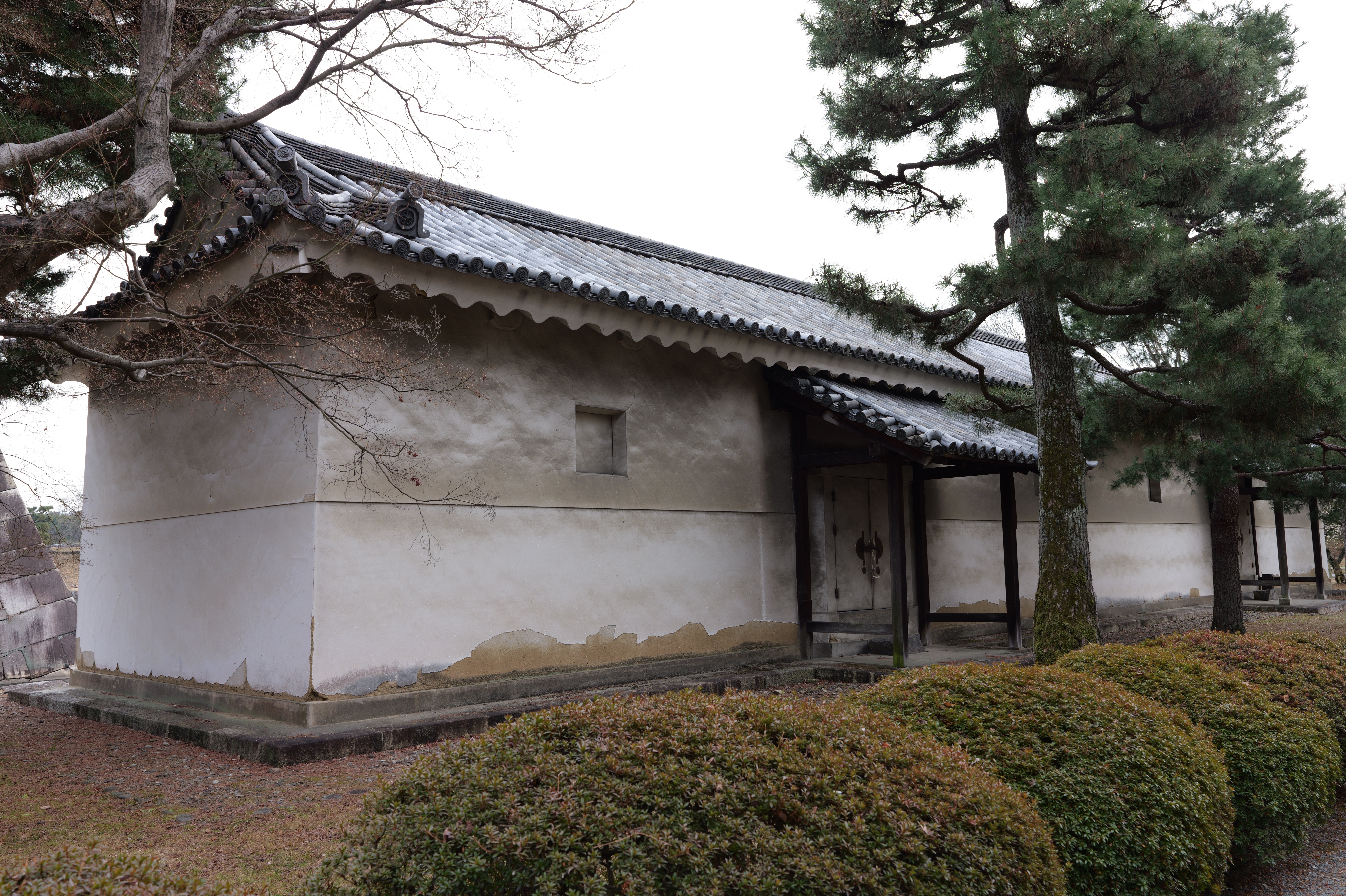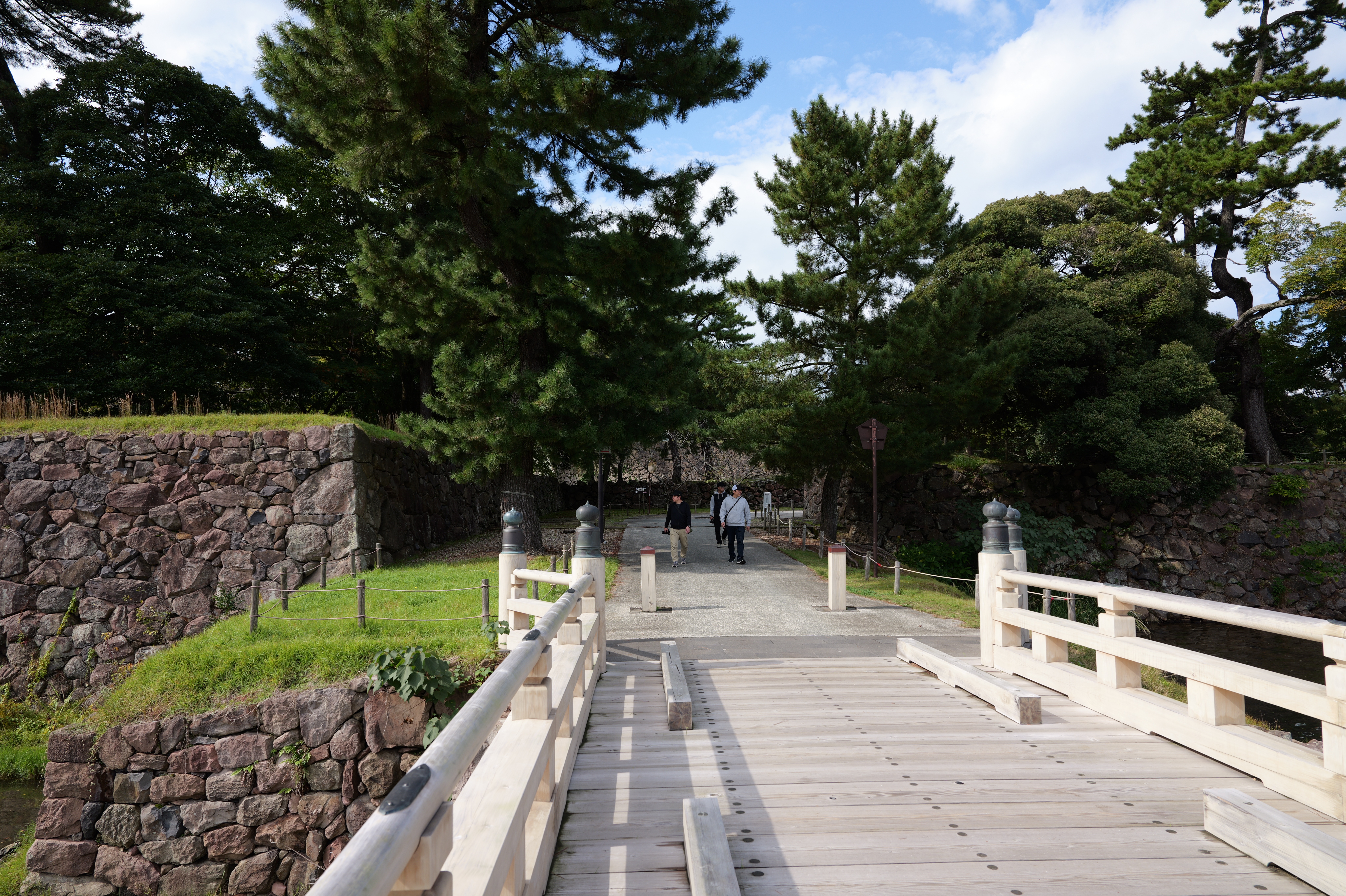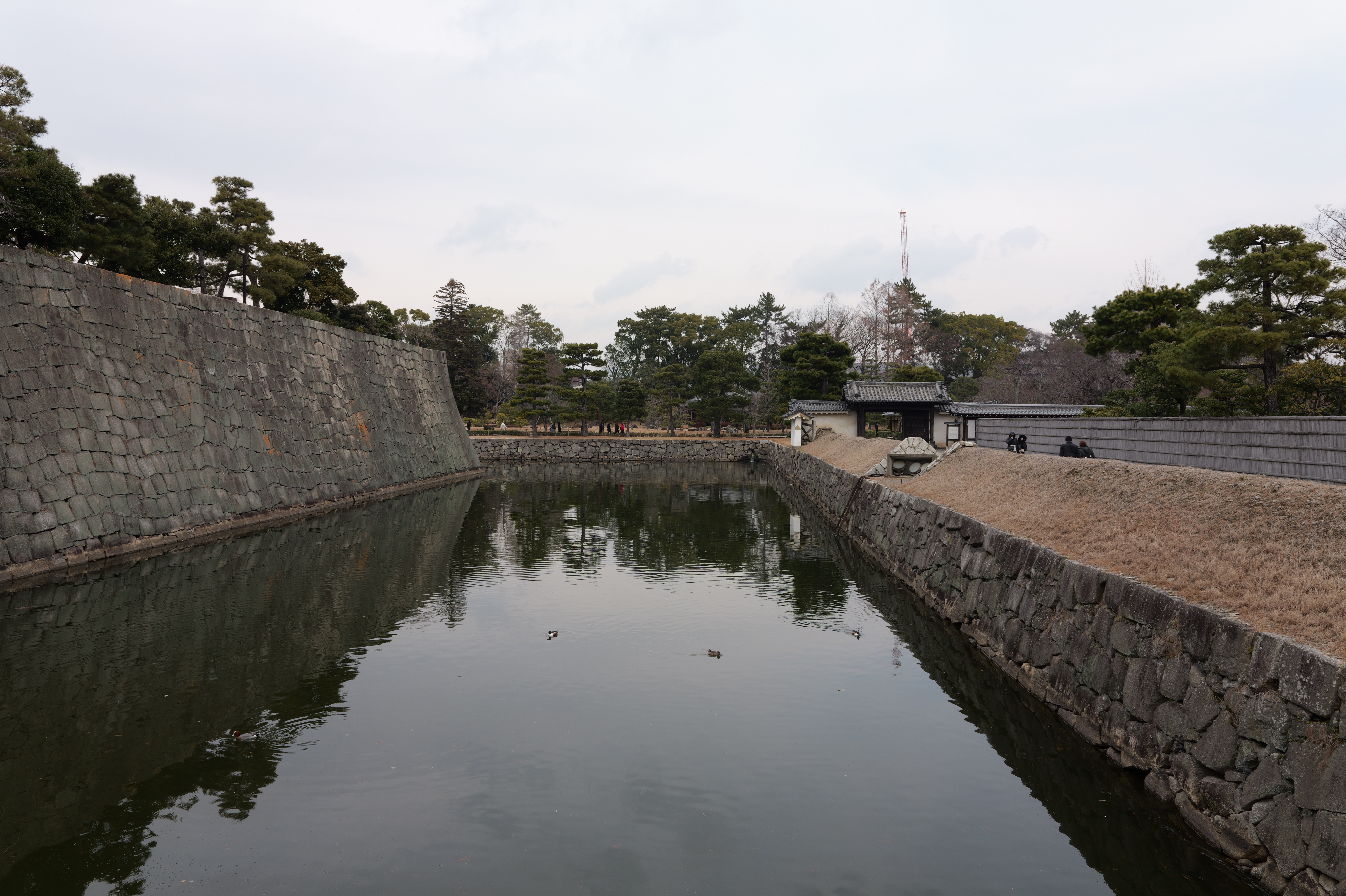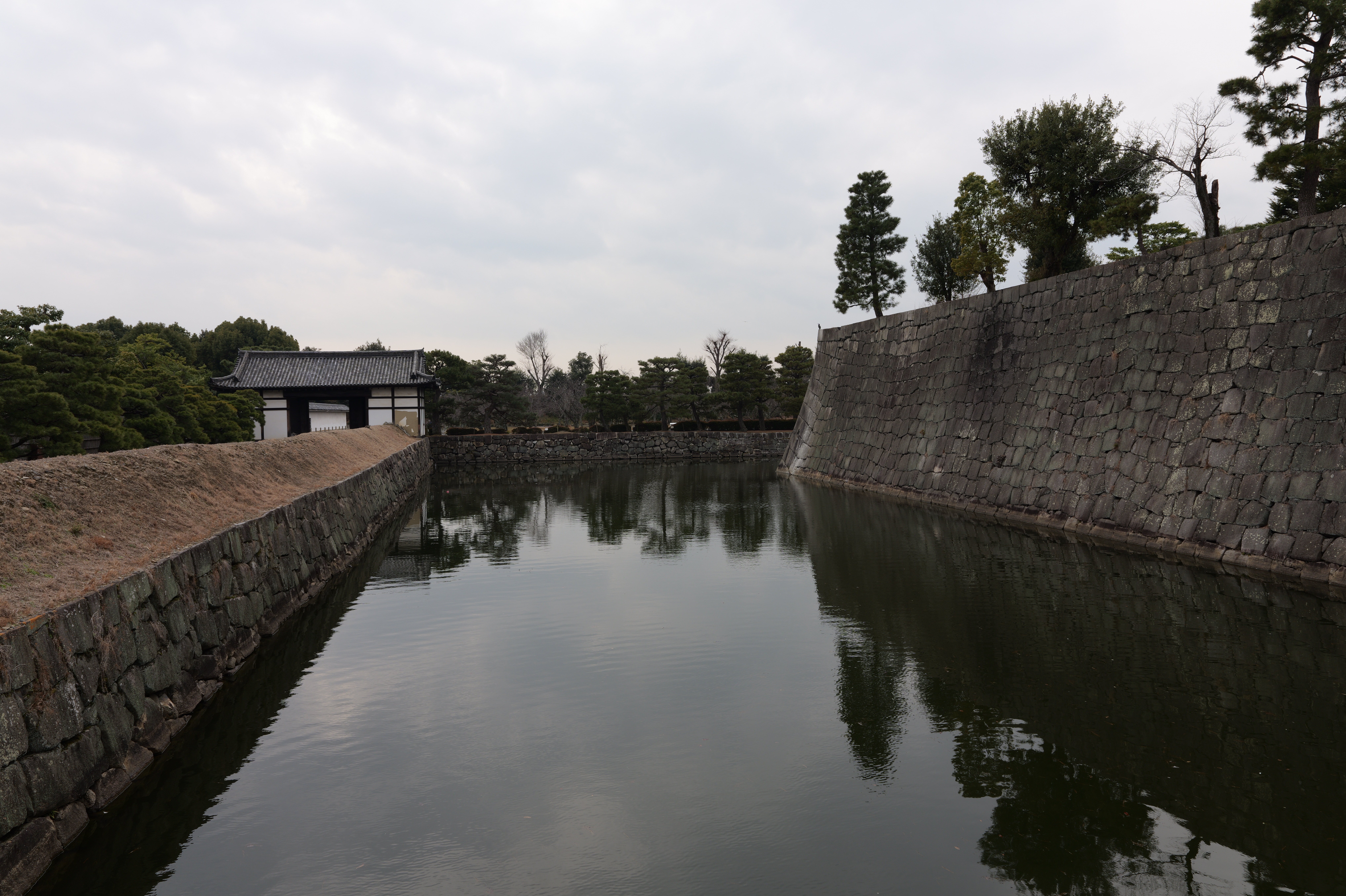 南の丸の東側に出ると右側に岡口門、左側に岡中門跡。岡口門に進みます。岡口門は築城当時の大手門でした。空襲でも焼けずに残った数少ない遺構で、北側の土塀とともに重要文化財に指定されています。岡口門を出たところには東内堀が広がっています。岡中門跡をとおり、二の丸、御橋廊下、勘定御門を通って13時半前、約三時間半の散策終了です。