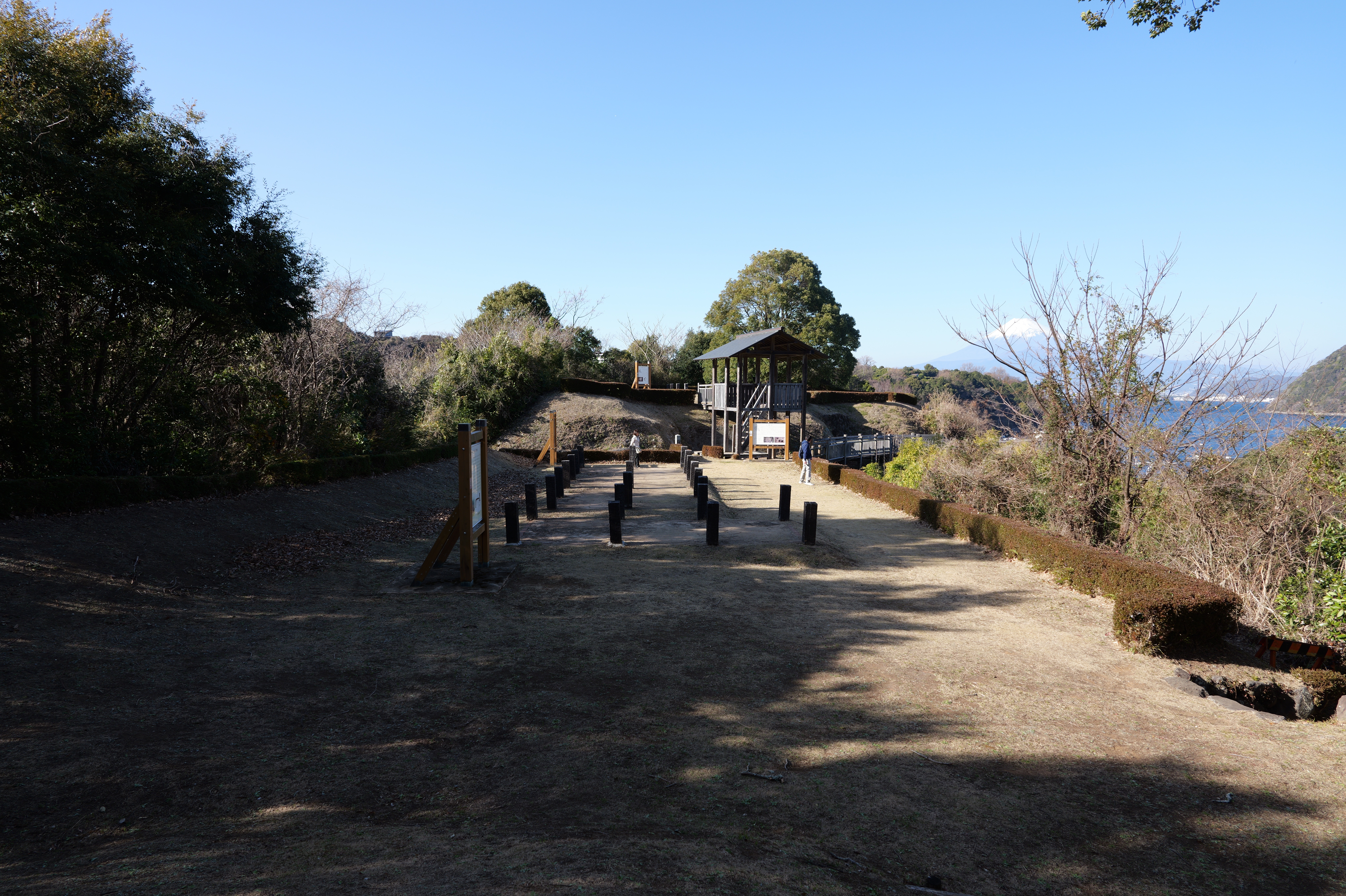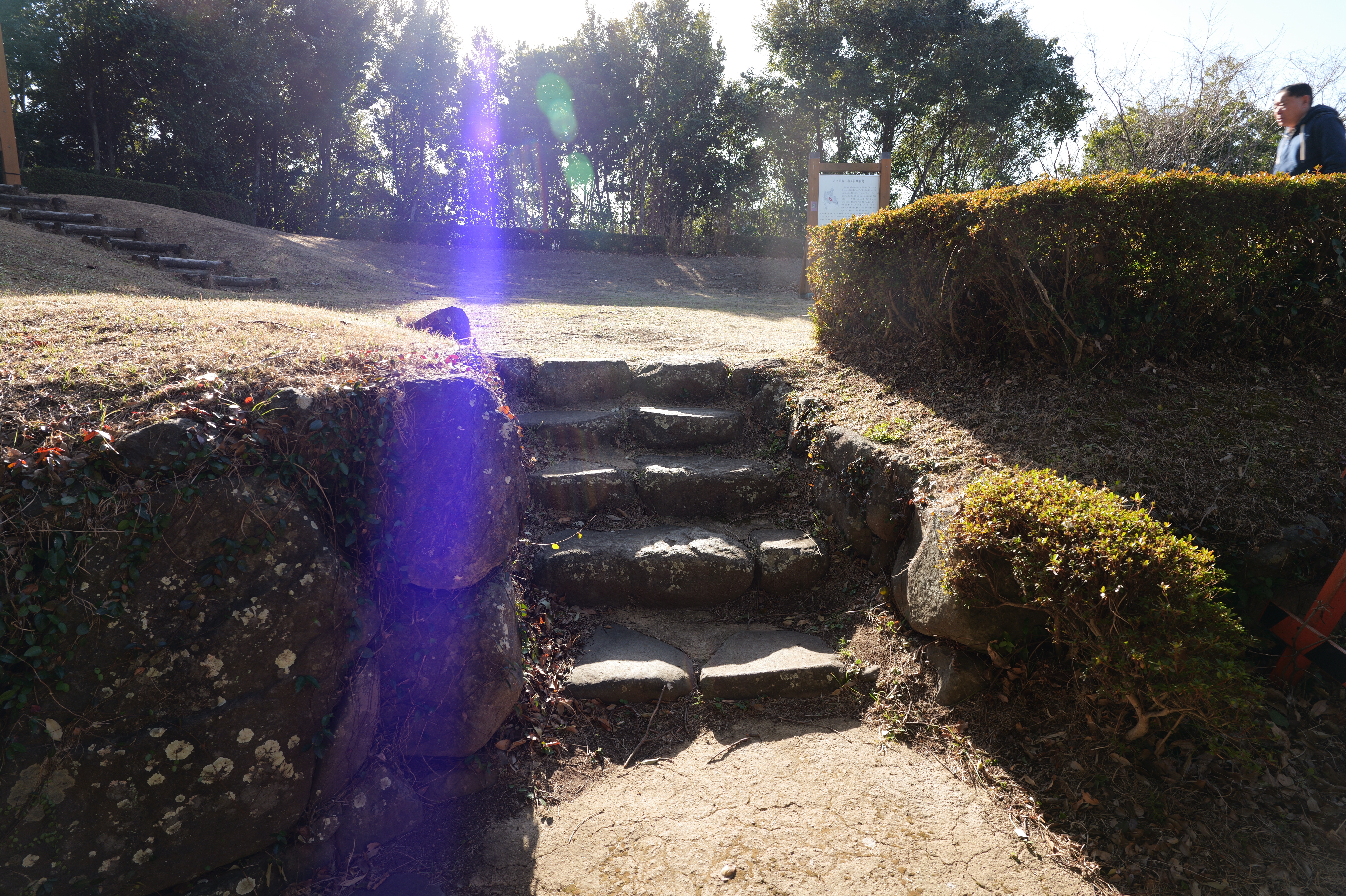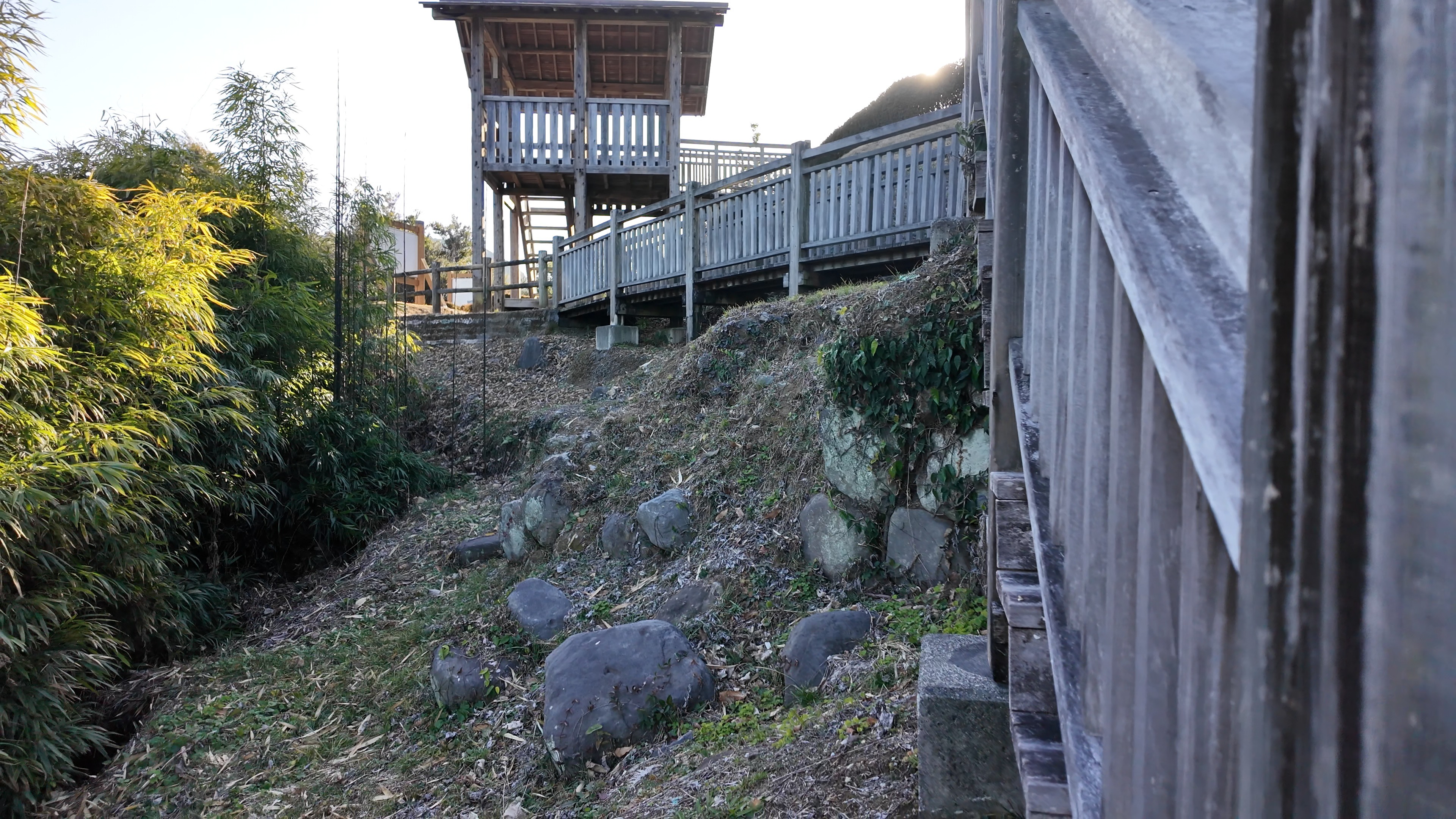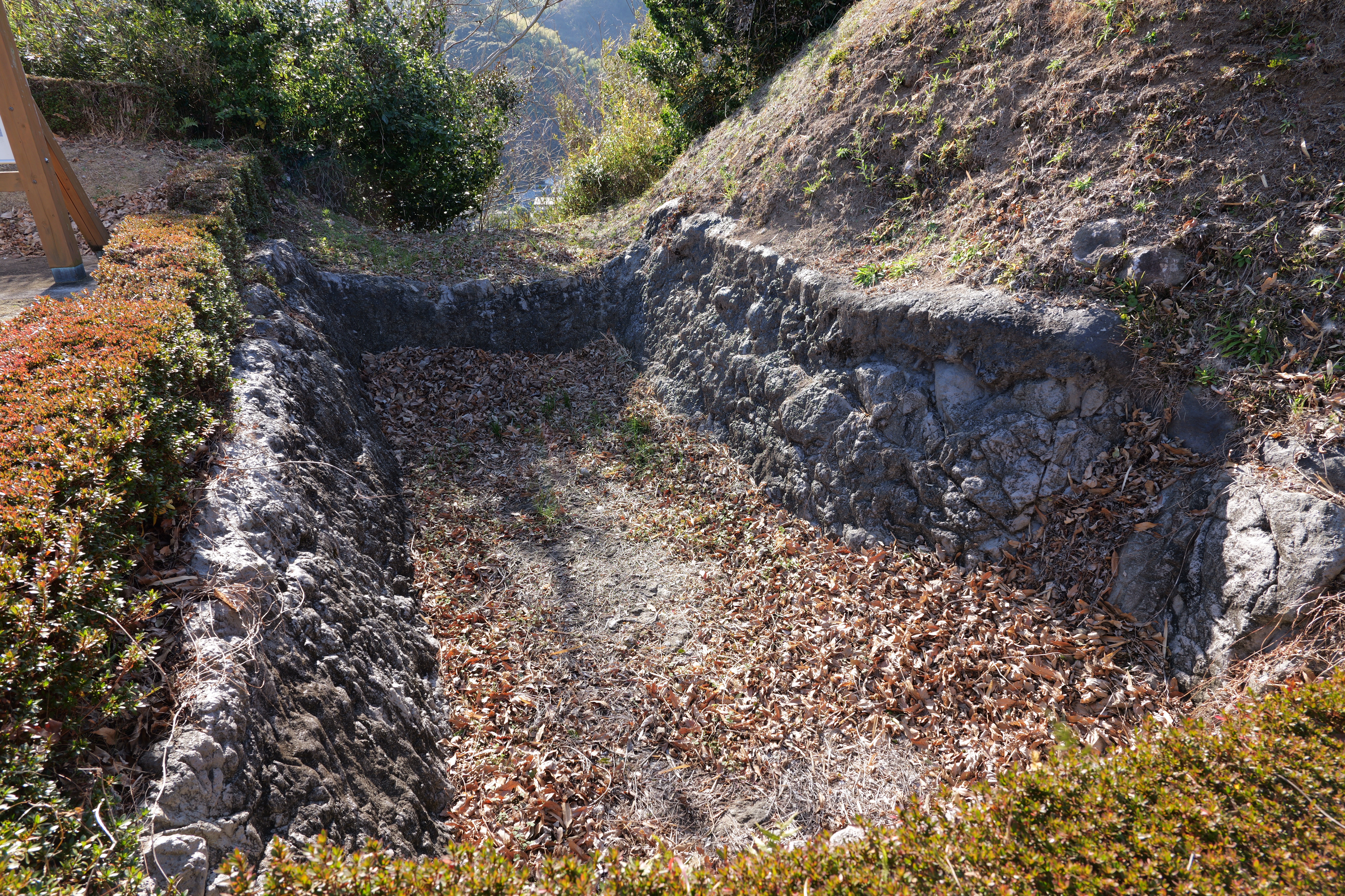 西の丸東側には二の丸へと通じる御橋廊下が西内堀に架かっています。御橋廊下は靴を脱いで渡ります。渡った先は二の丸の大奥跡で、御橋廊下を出てすぐ右側に穴蔵状遺構があり何かを収納する施設だったとのこと。二の丸は東へ大奥、中奥、表と続いていて二の丸広場として整備されていますが、みたところ普通の公園という感じ。