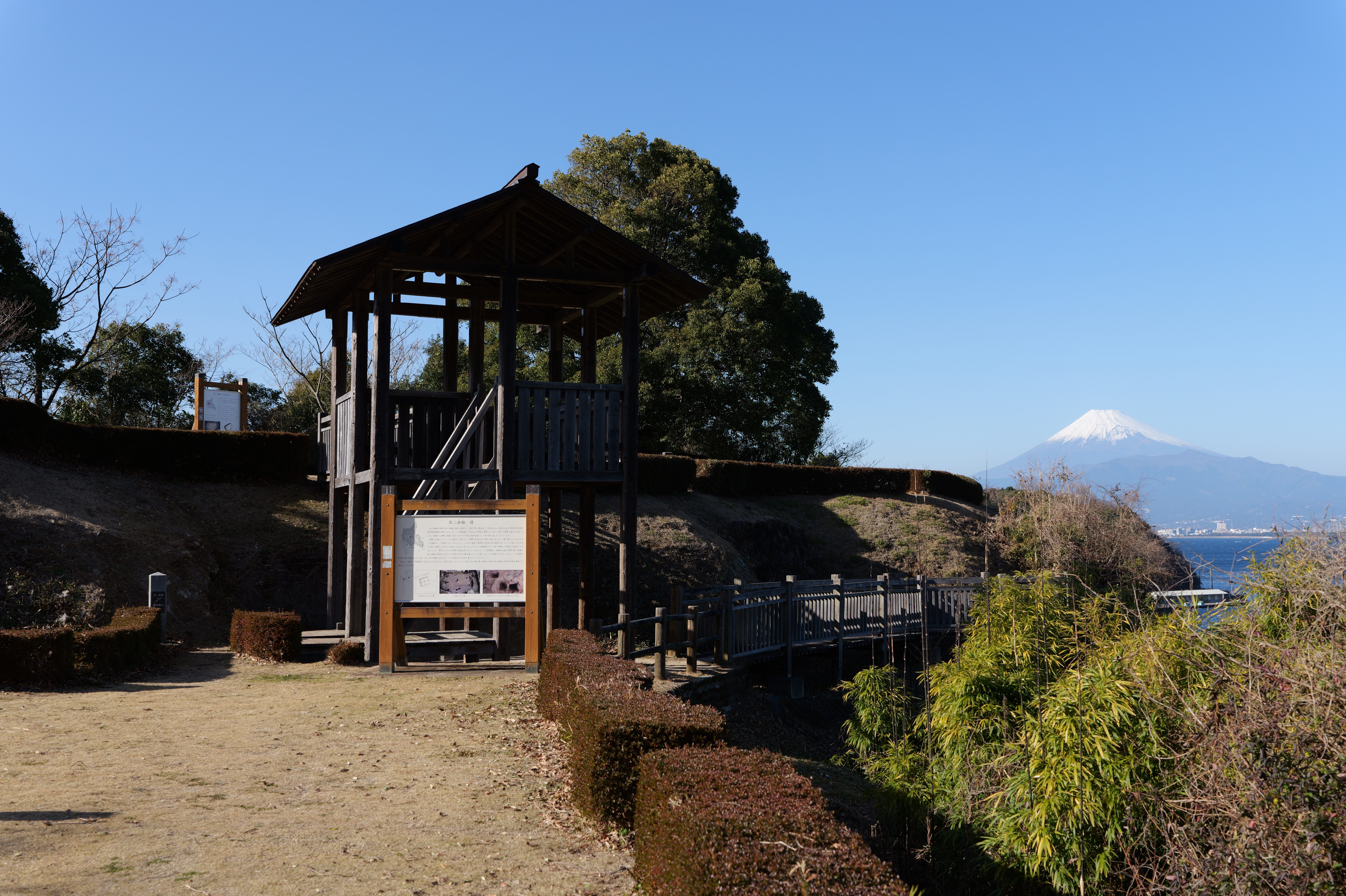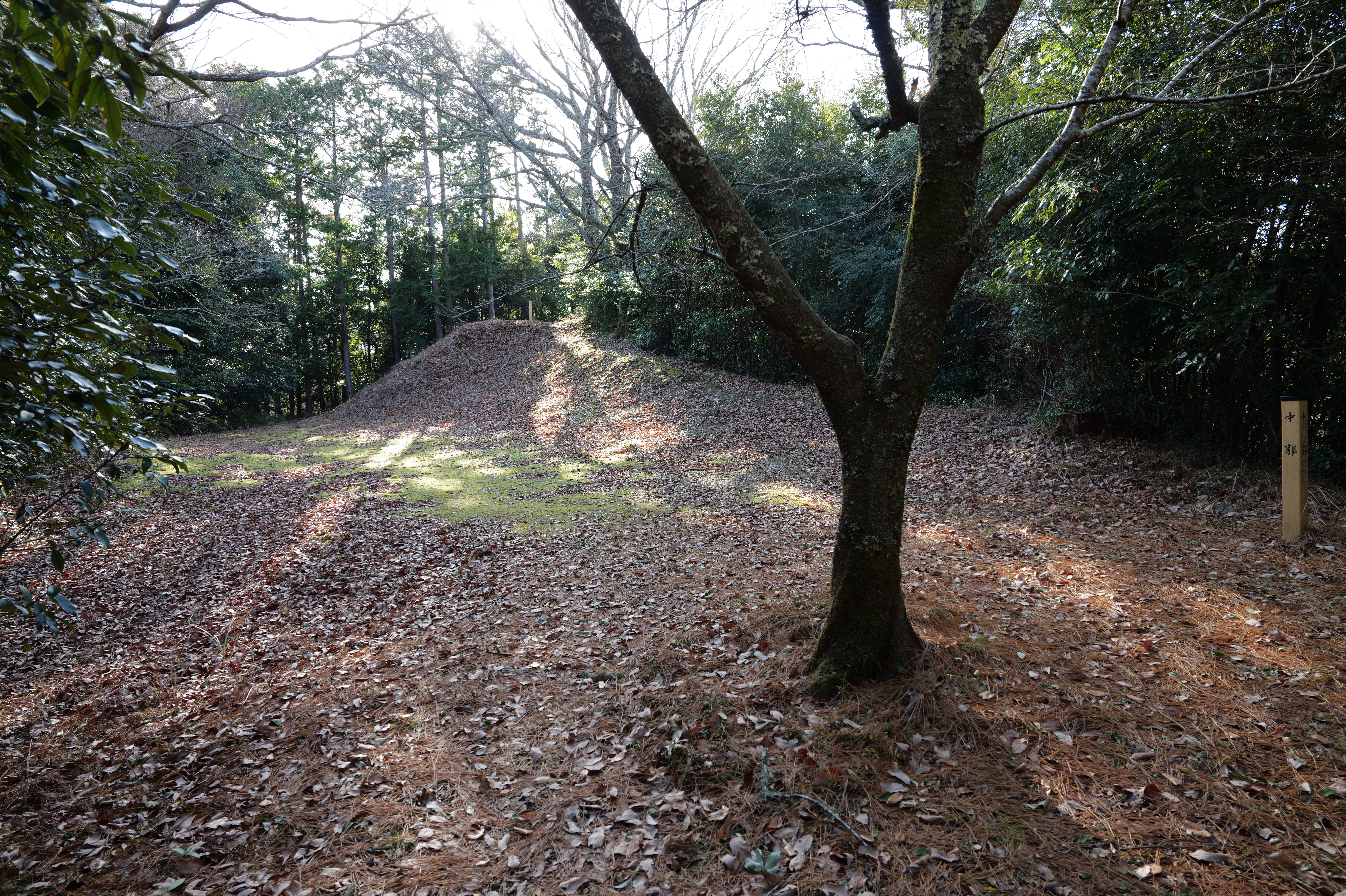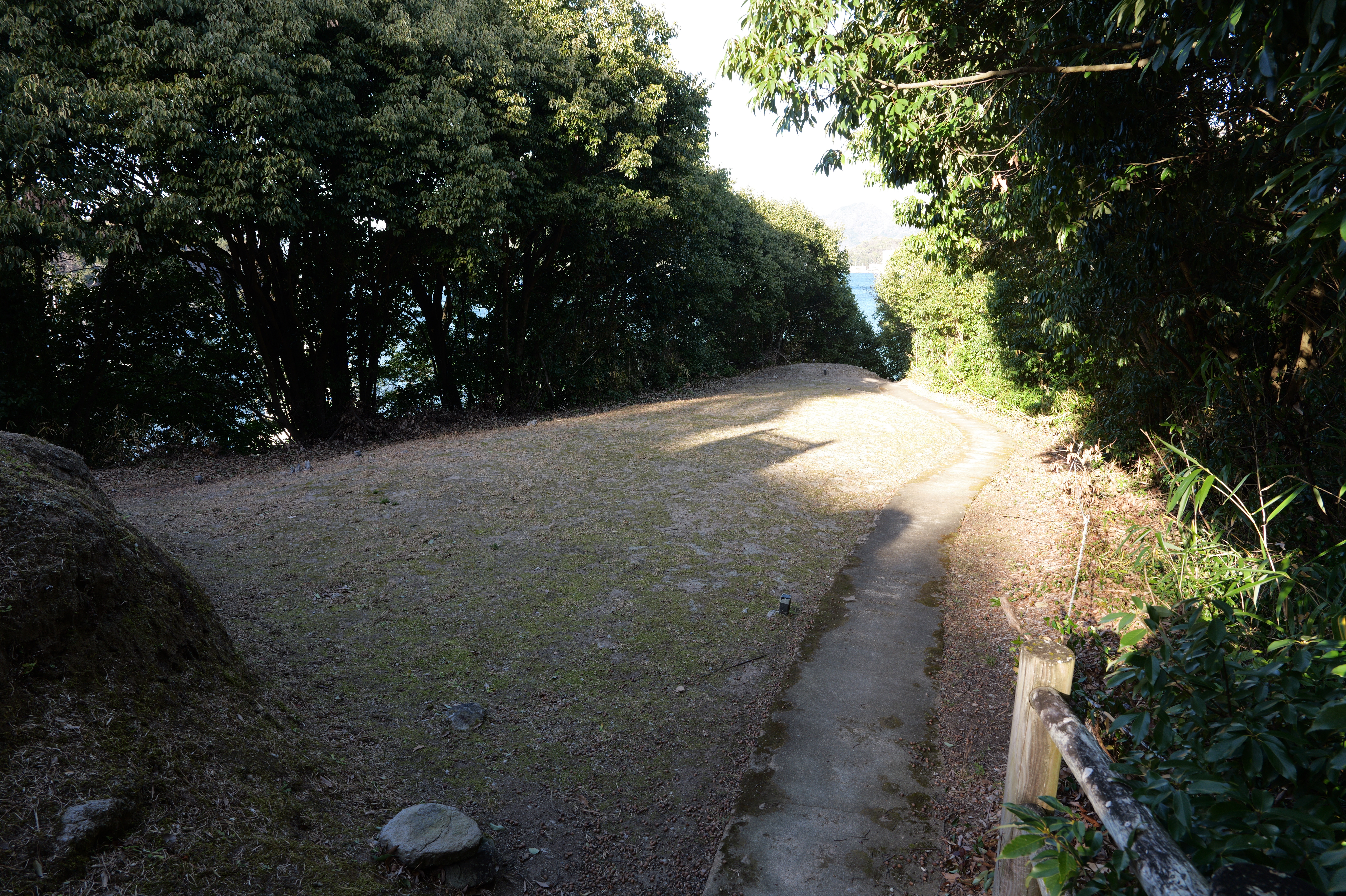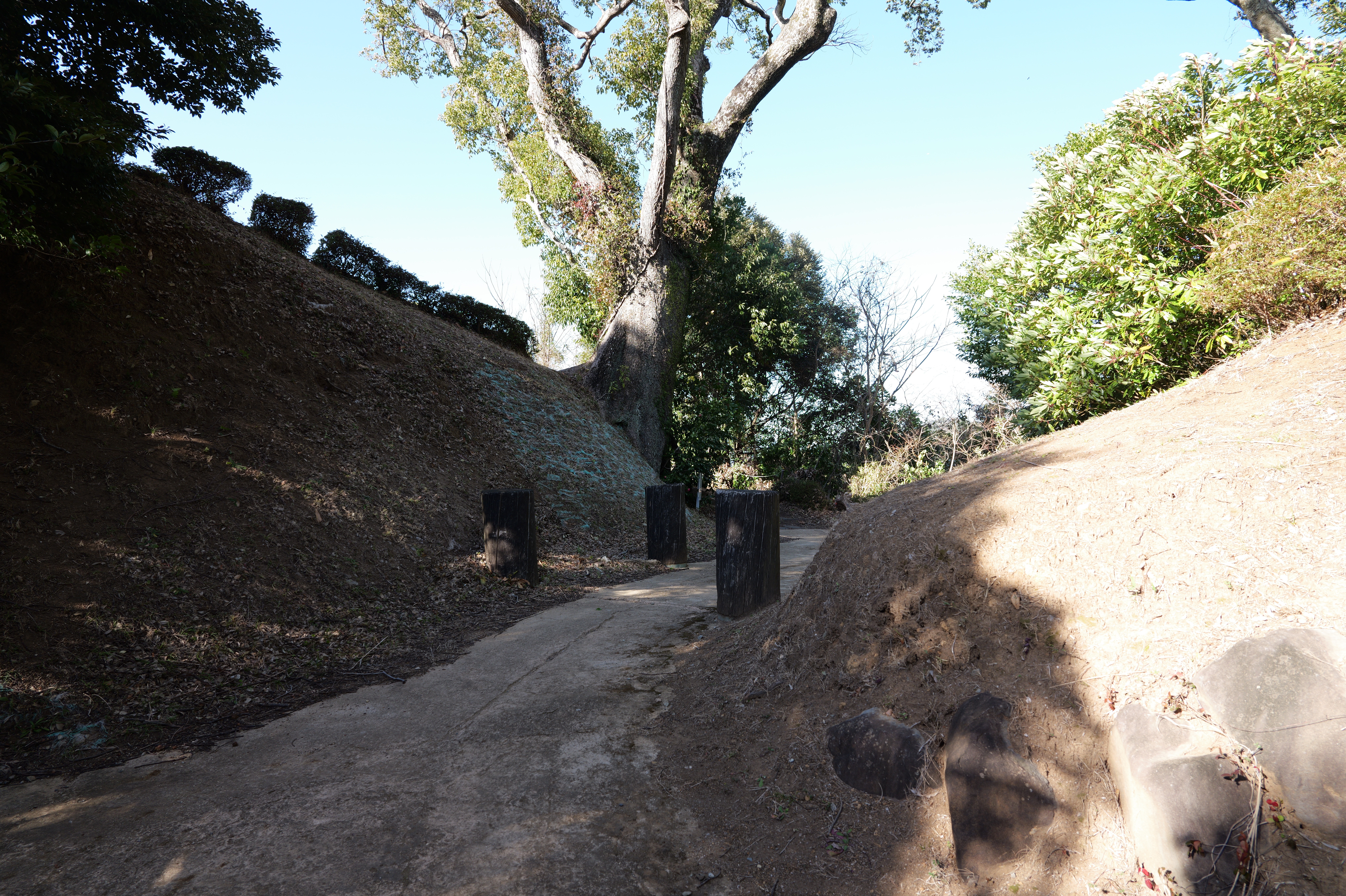西の丸東側には二の丸へと通じる御橋廊下が西内堀に架かっています。御橋廊下は靴を脱いで渡ります。渡った先は二の丸の大奥跡で、御橋廊下を出てすぐ右側に穴蔵状遺構があり何かを収納する施設だったとのこと。二の丸は東へ大奥、中奥、表と続いていて二の丸広場として整備されていますが、みたところ普通の公園という感じ。