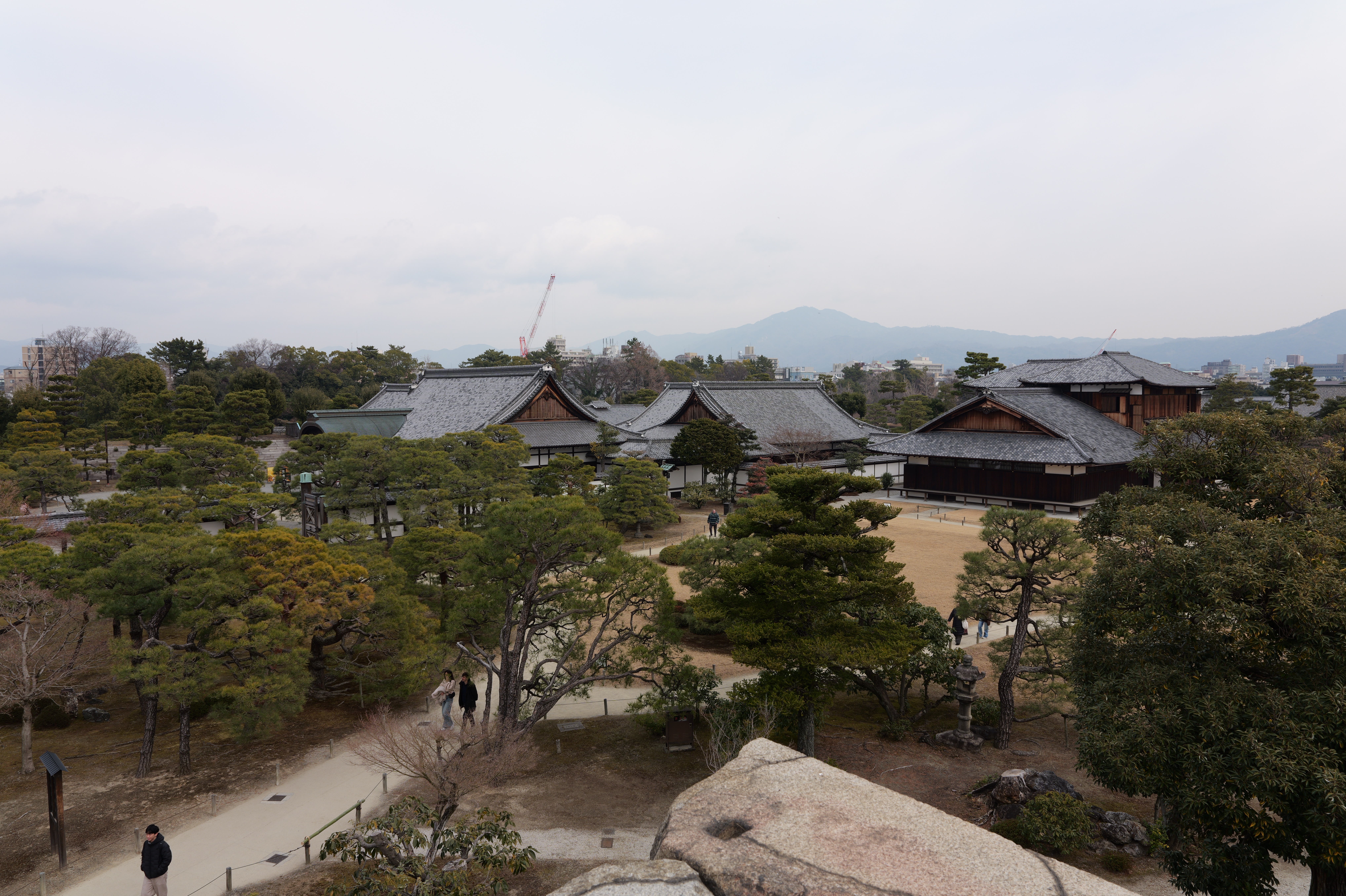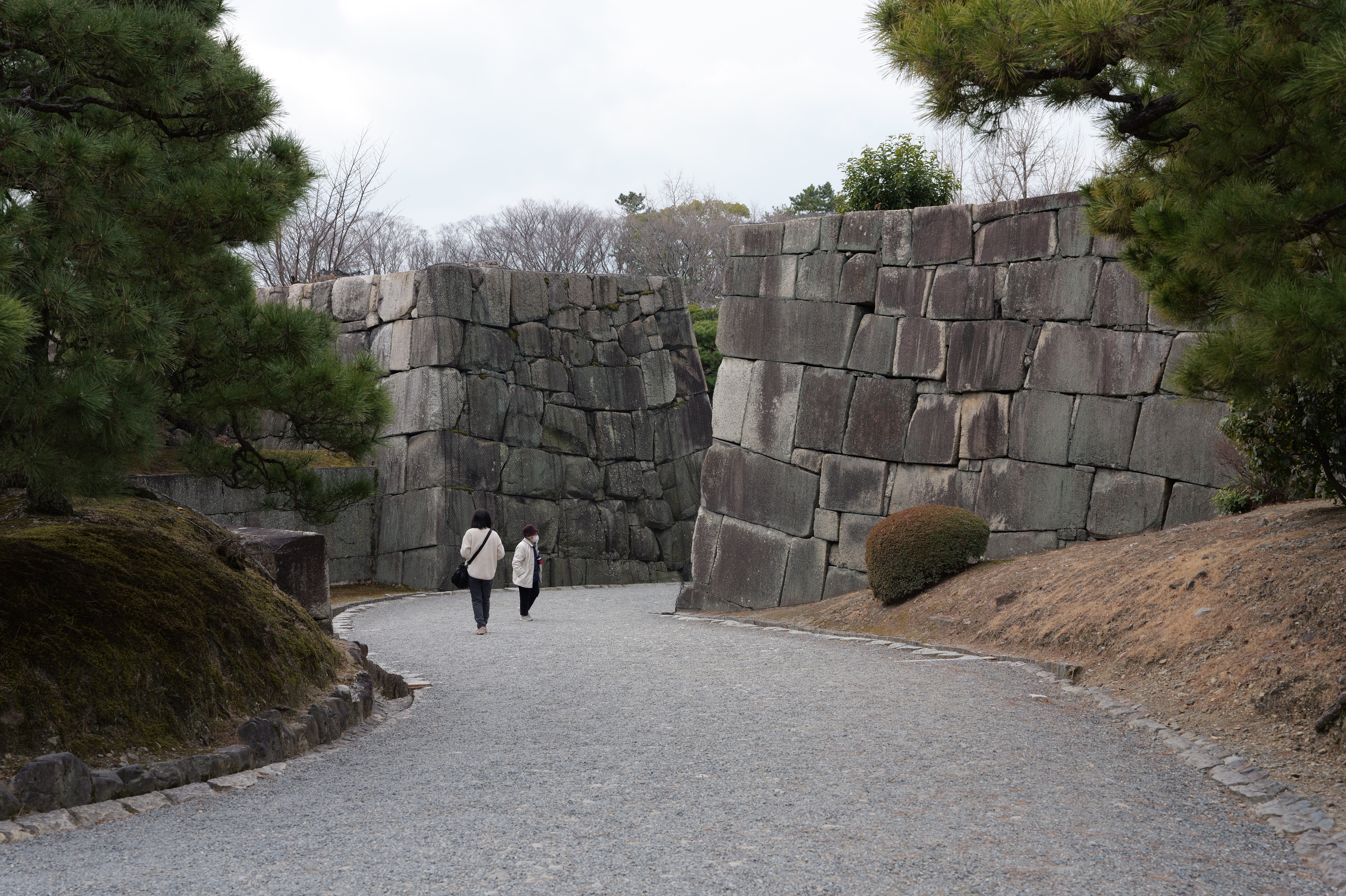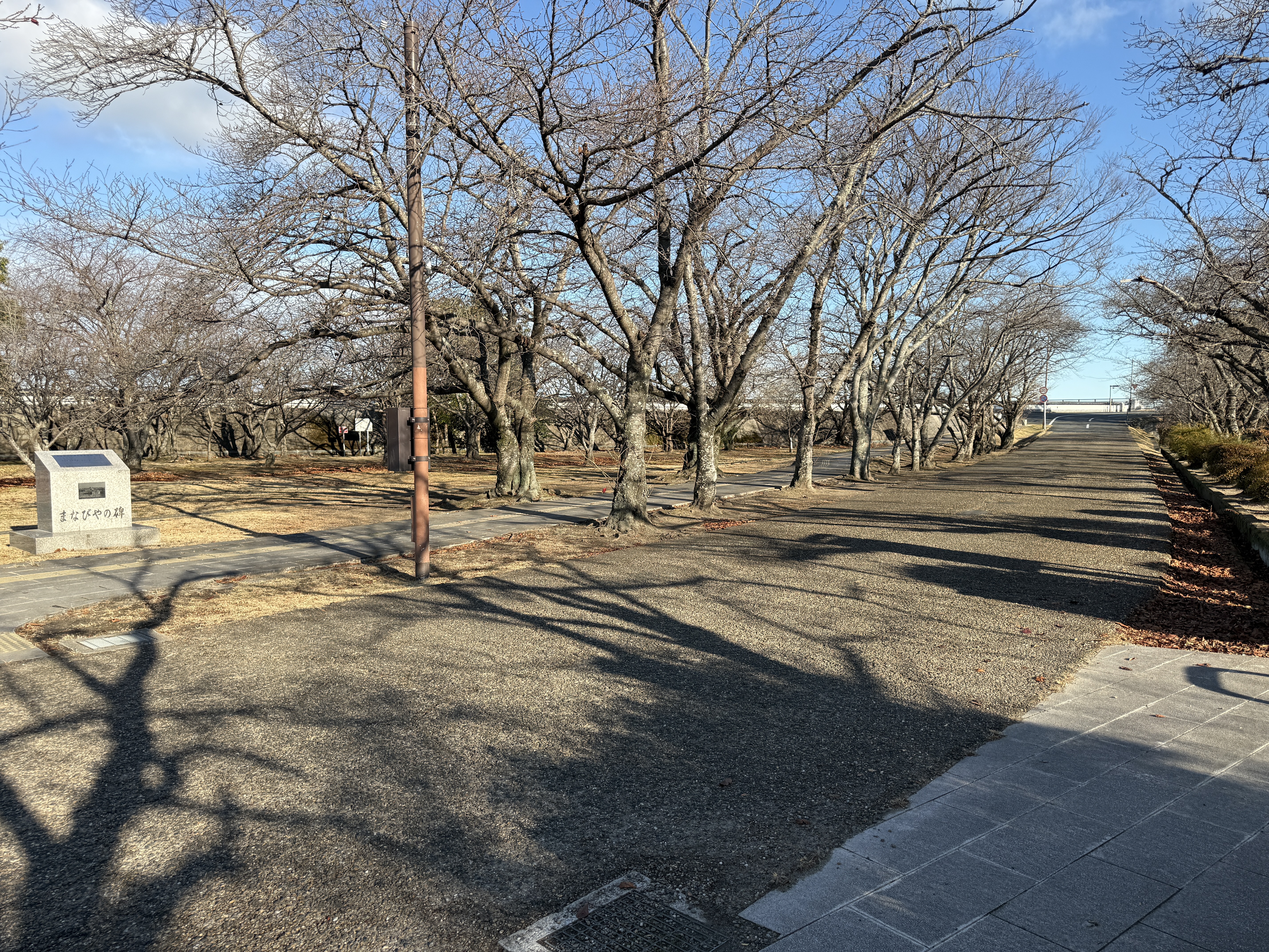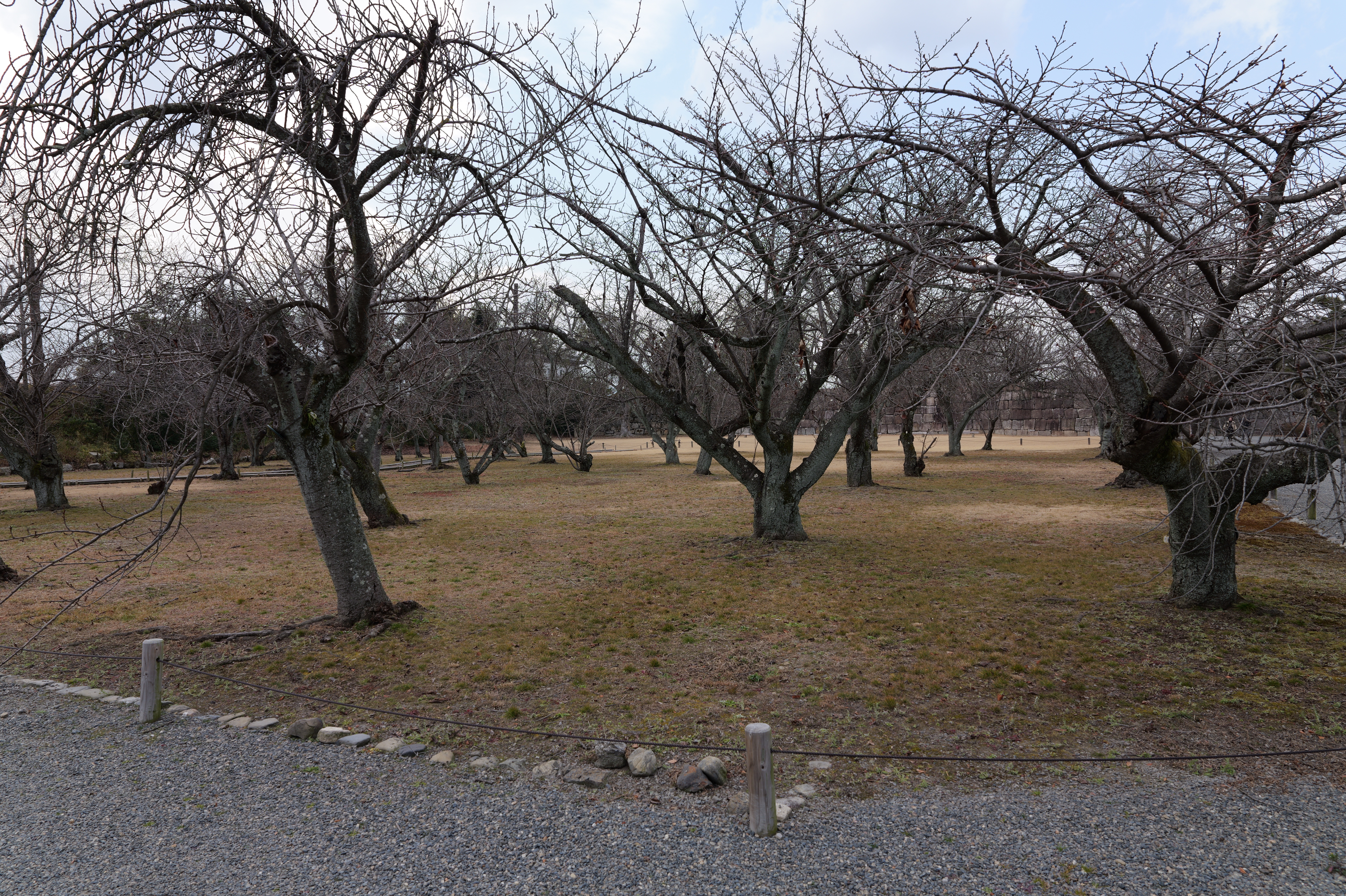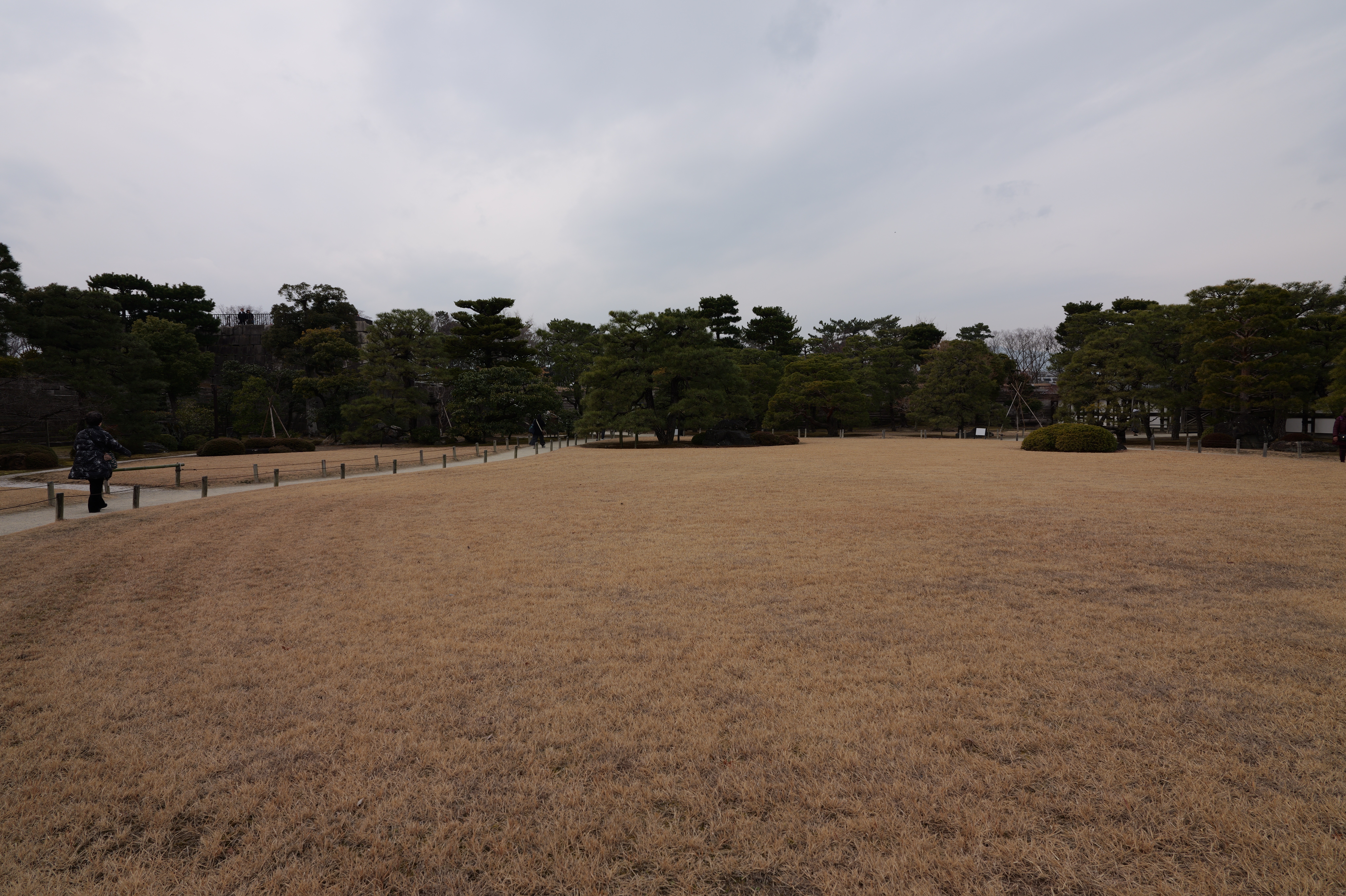 一中門跡に戻り、ここから岡中門までは蔵の丸で、東側の堀沿いに雁木が続いています。岡中門手前右側の表坂から天守方面へ向かいます。表坂を登ったところは松の丸で、ここからは動物園のある南の丸を見下ろせます。松の丸をずっと進み、石段を登った正面に本丸御殿跡、後ろ側は天守曲輪です。正面階段を登ると天守の写真スポットになっています。本丸御殿跡で入れるのはこのスポット付近のみで、中心部は塀で囲まれています。
