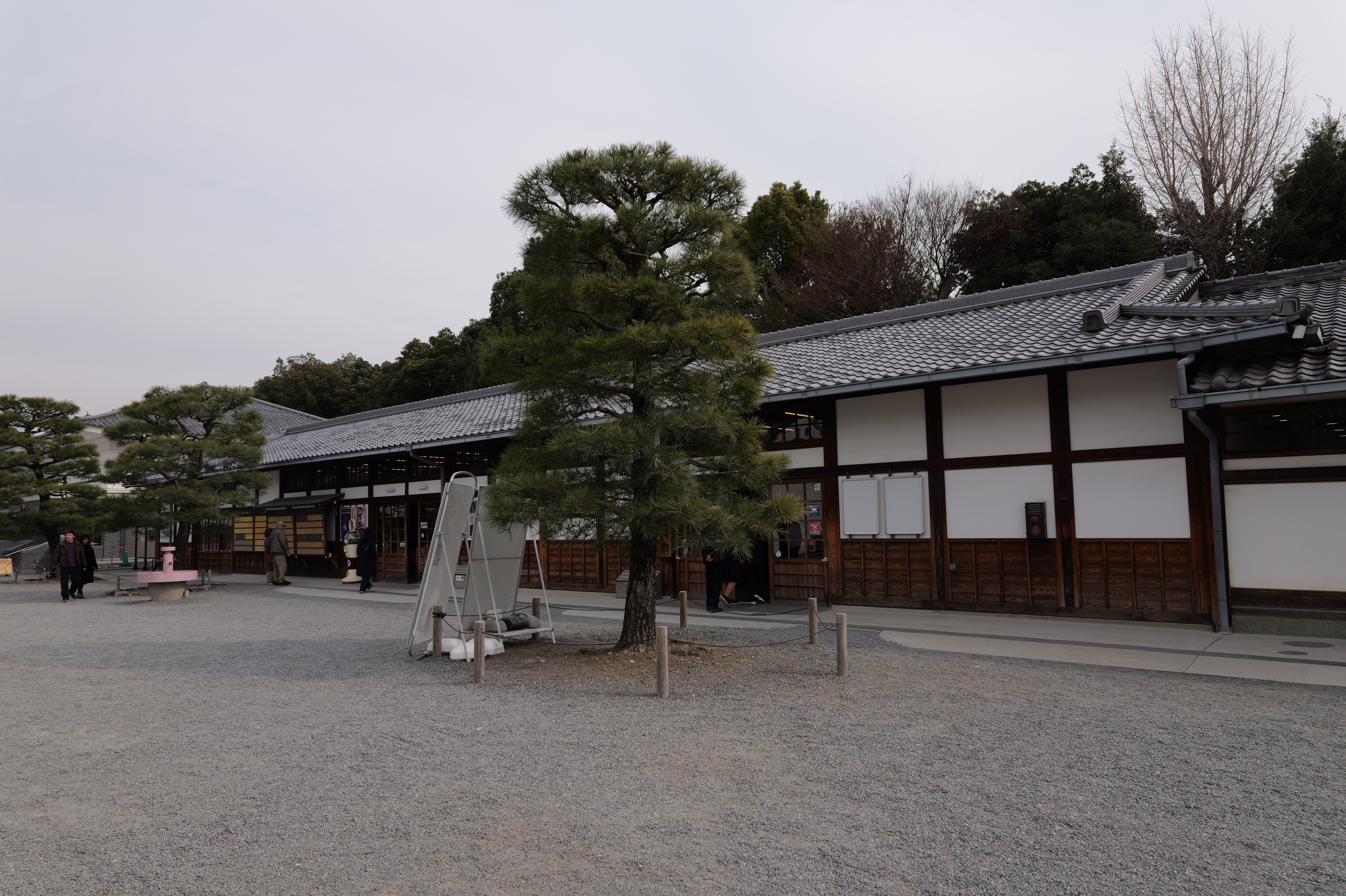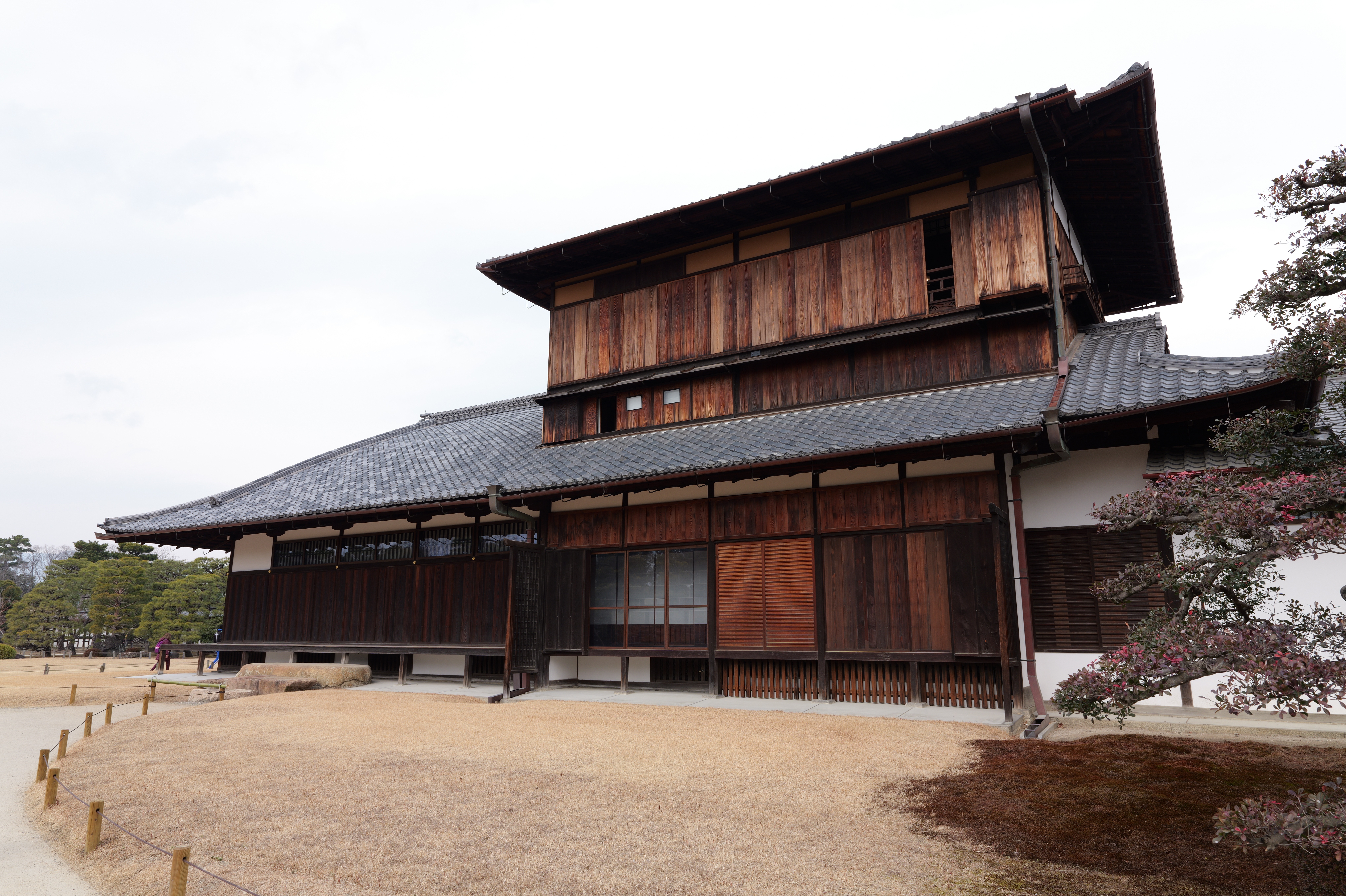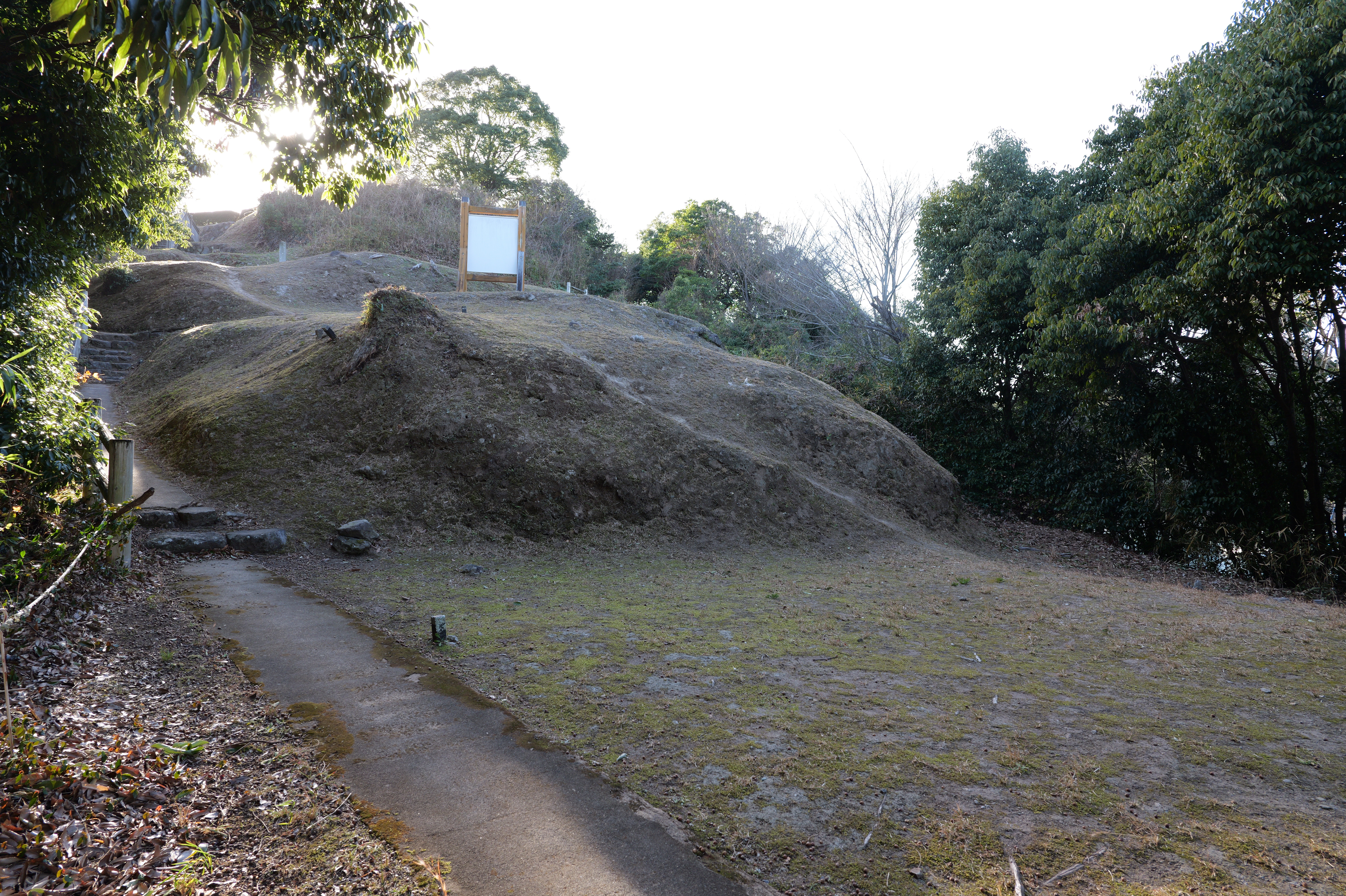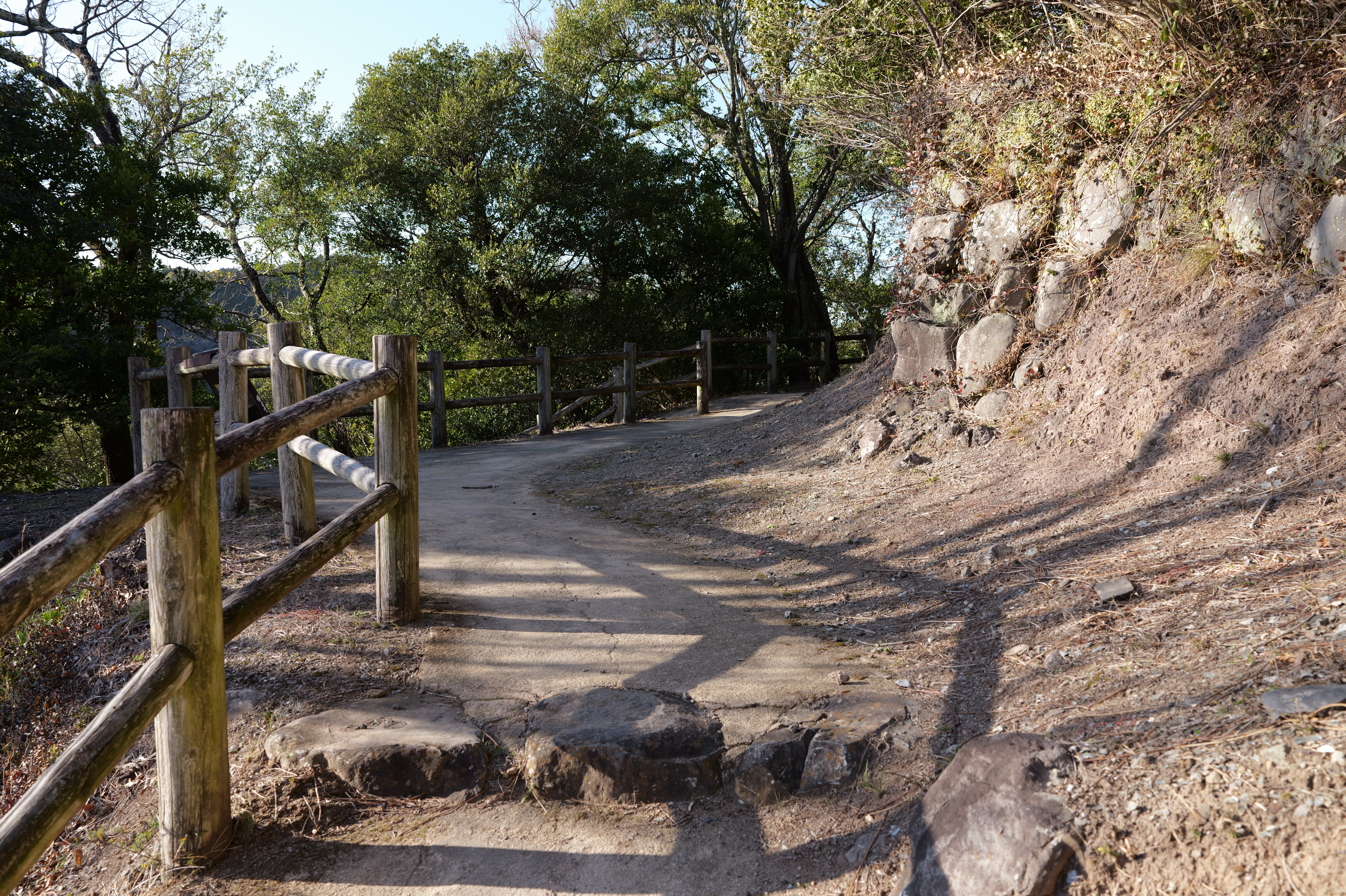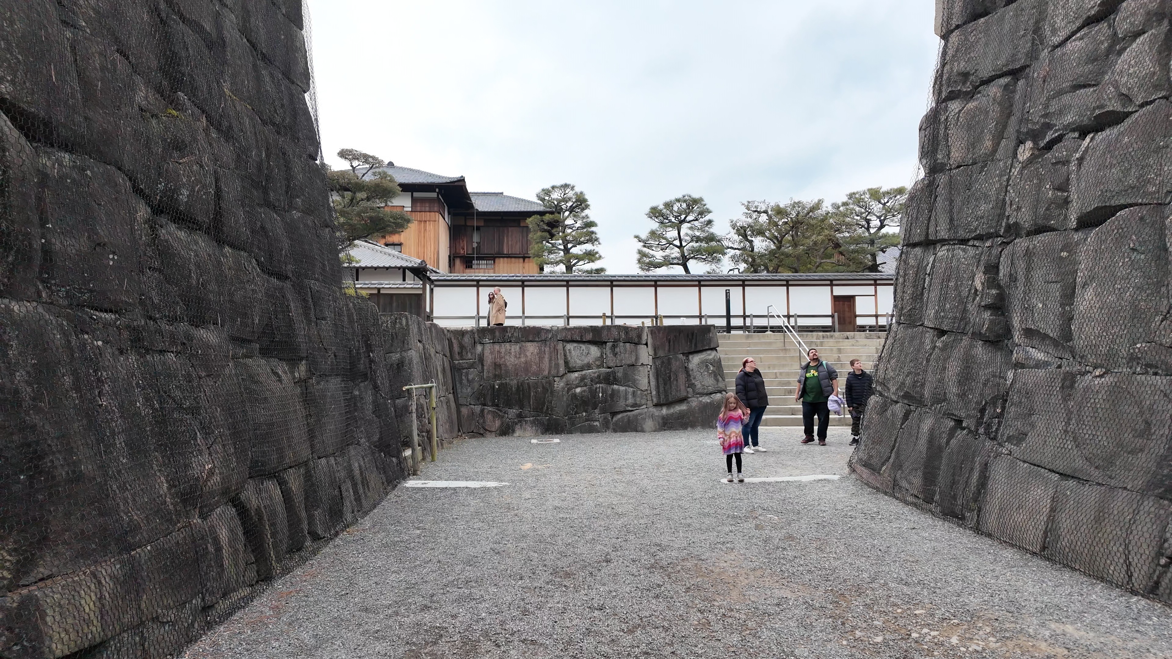 一中門跡に戻り、ここから岡中門までは蔵の丸で、東側の堀沿いに雁木が続いています。岡中門手前右側の表坂から天守方面へ向かいます。表坂を登ったところは松の丸で、ここからは動物園のある南の丸を見下ろせます。松の丸をずっと進み、石段を登った正面に本丸御殿跡、後ろ側は天守曲輪です。正面階段を登ると天守の写真スポットになっています。本丸御殿跡で入れるのはこのスポット付近のみで、中心部は塀で囲まれています。