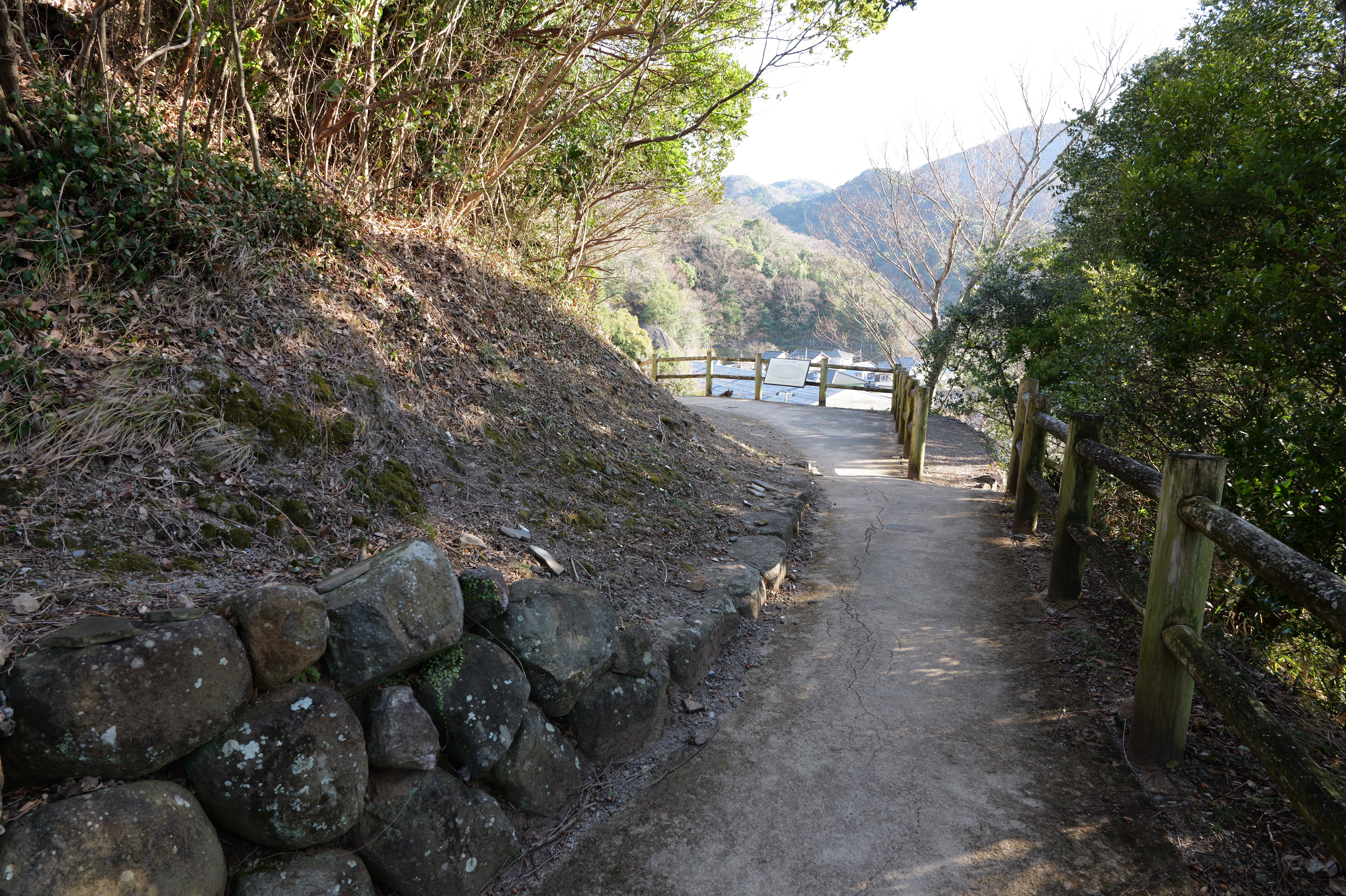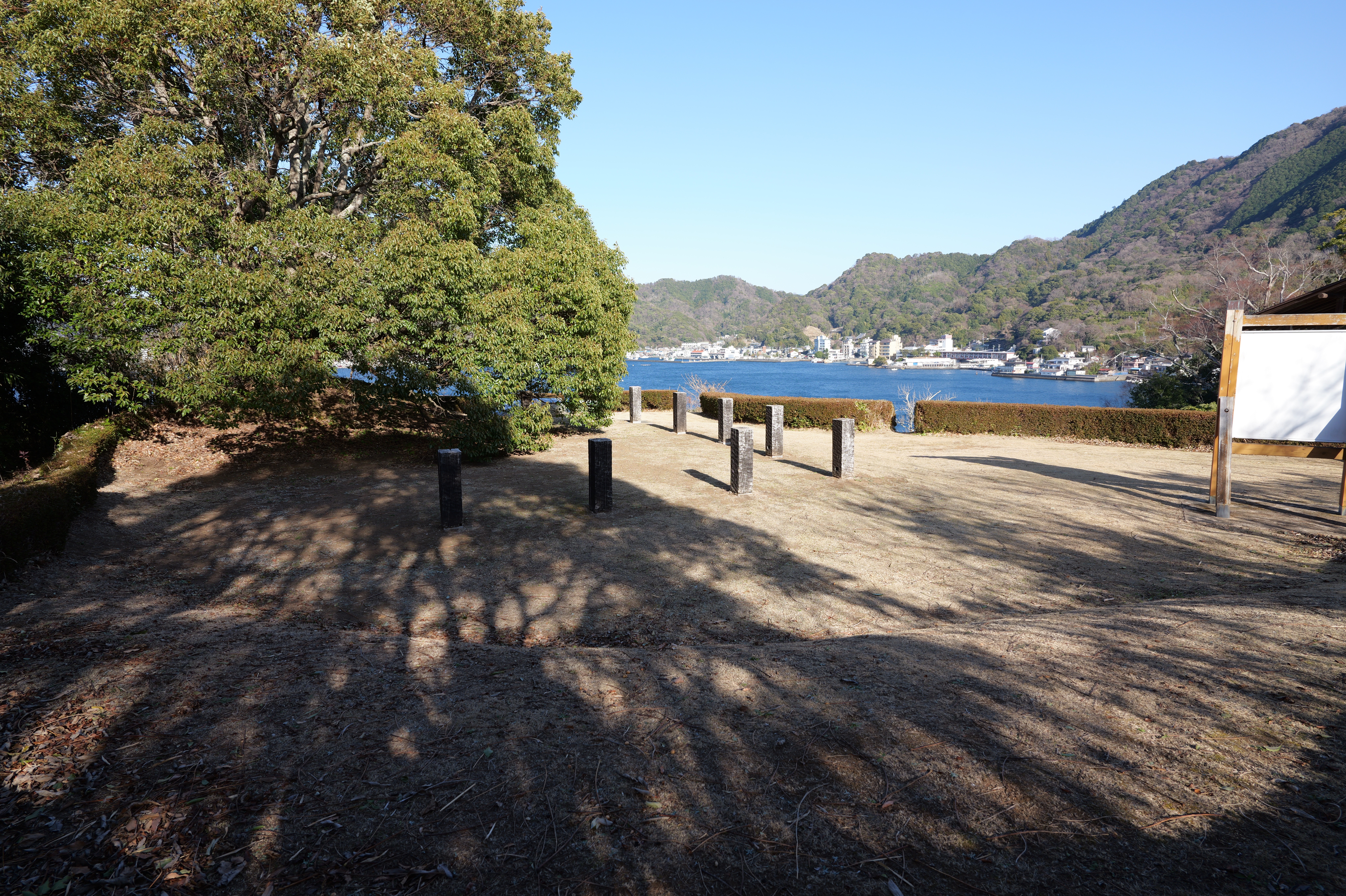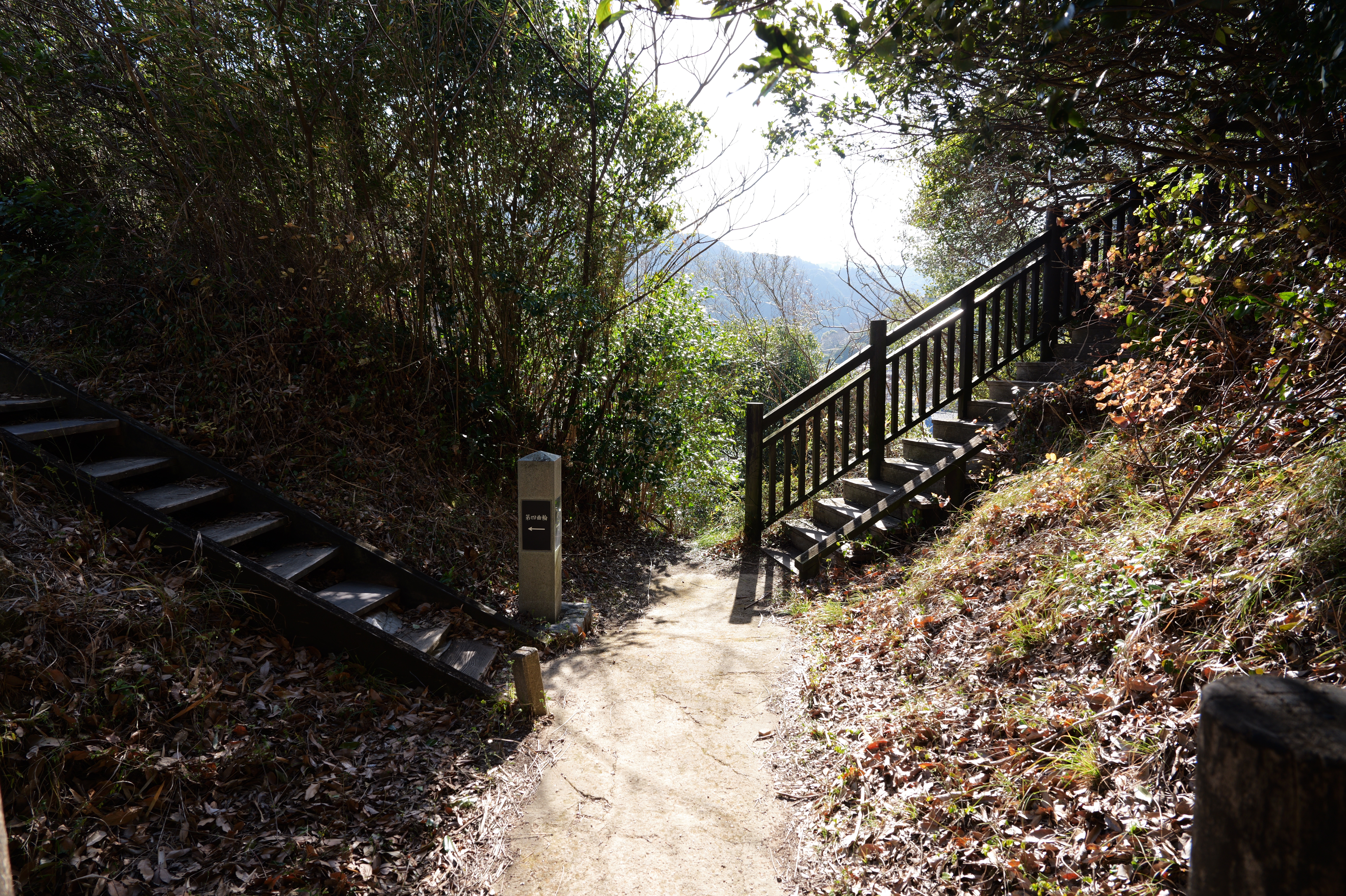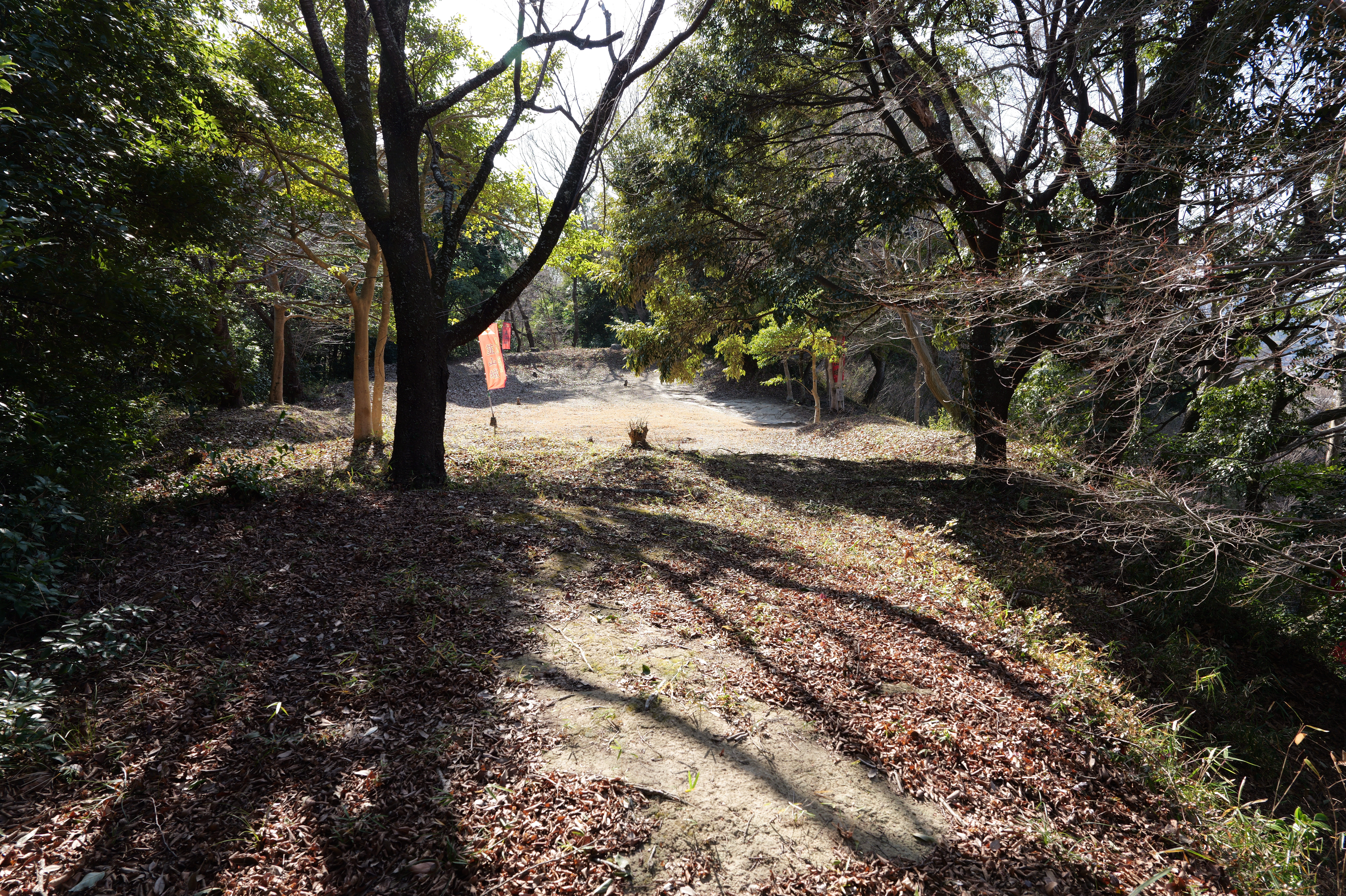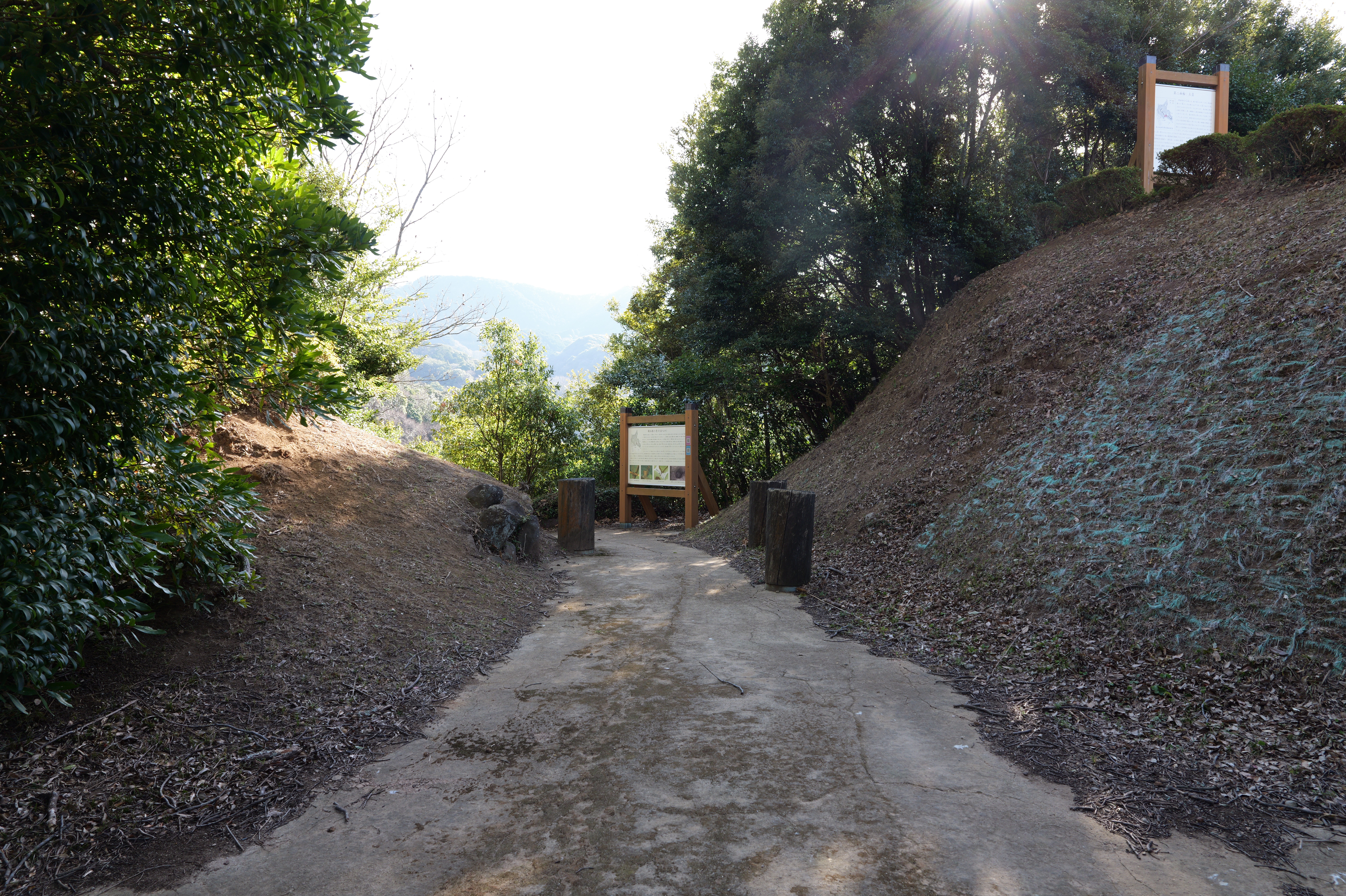 二の丸に下りて西方向。二の丸南西隅の切手門跡から山吹渓、西之丸庭園入口、鶴の渓と進み、奥階段を登ると砂の丸です。砂の丸は勘定御門から不明門まで続いています。砂の丸を南に進んでいくと途中右側に追廻門があります。西から和歌山城に入る高麗門形式の朱色に塗られた門です。戻って砂の丸をさらに南へ進むと現在は護国神社があり、新裏坂登り口、その先は駐車場となっていて、駐車場入口が不明門跡となっています。不明門跡を出て左側は南堀です。駐車場の北東奥部分から南の丸へ続きます。南の丸は和歌山城動物園になっています。