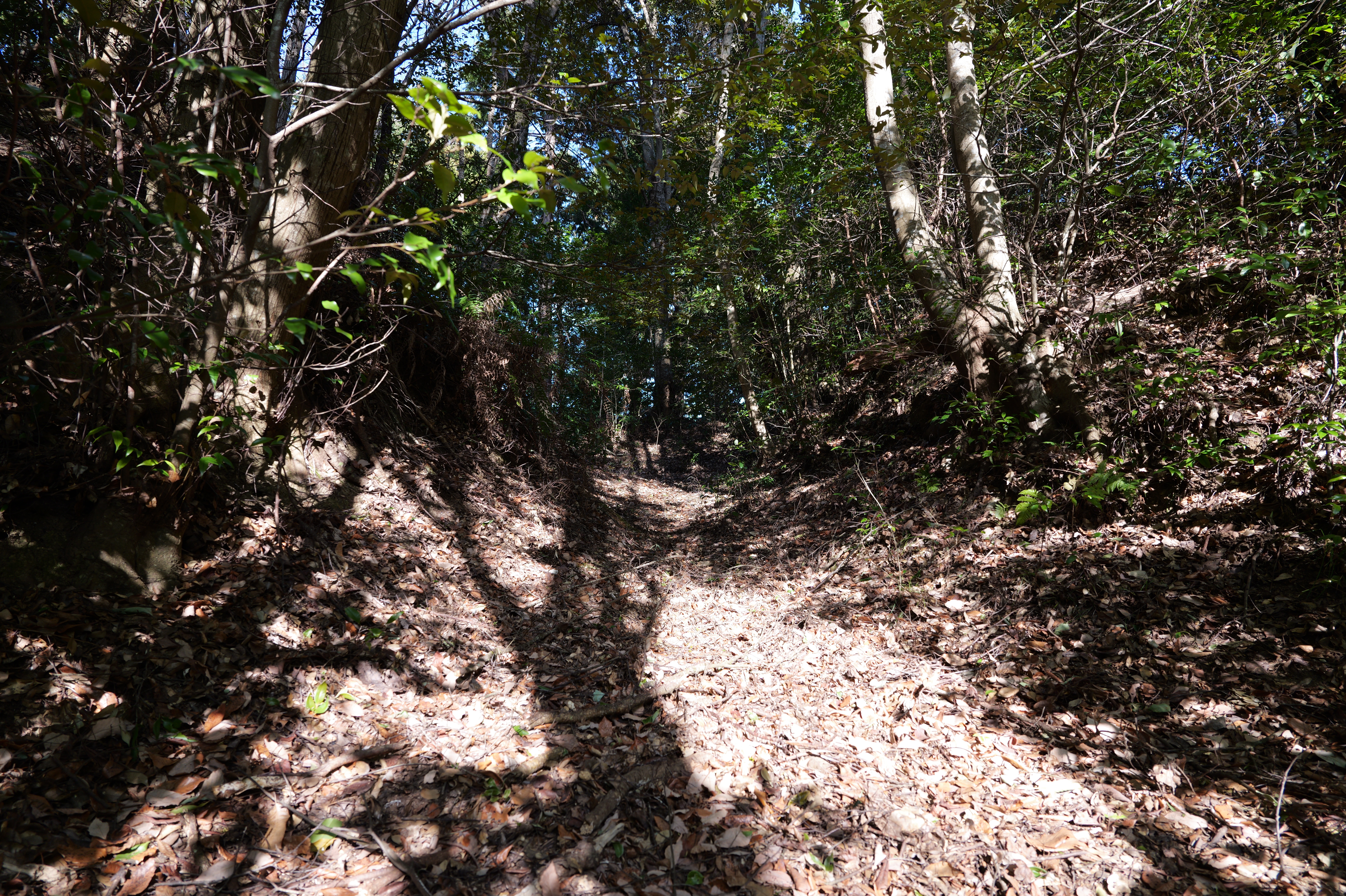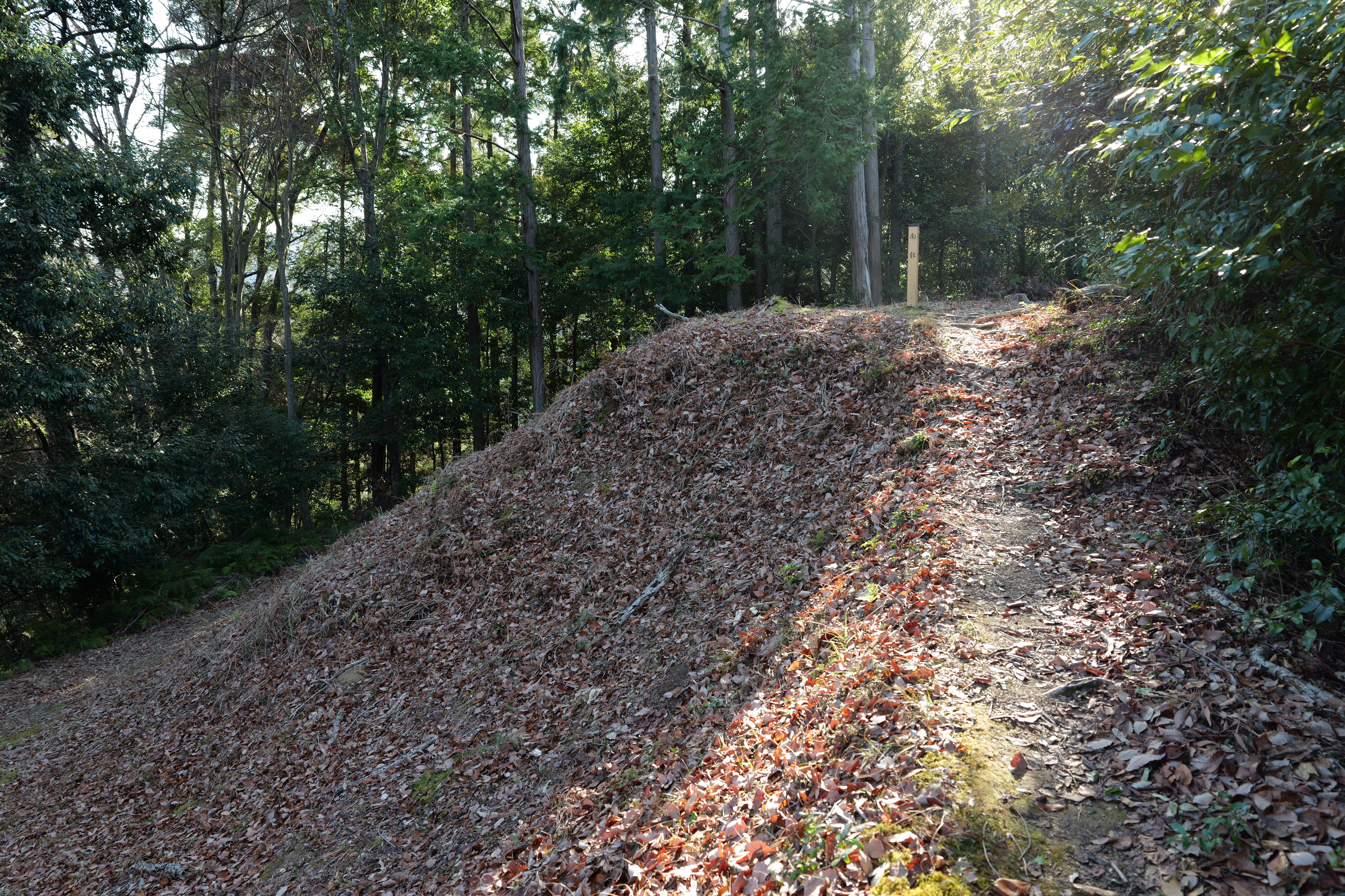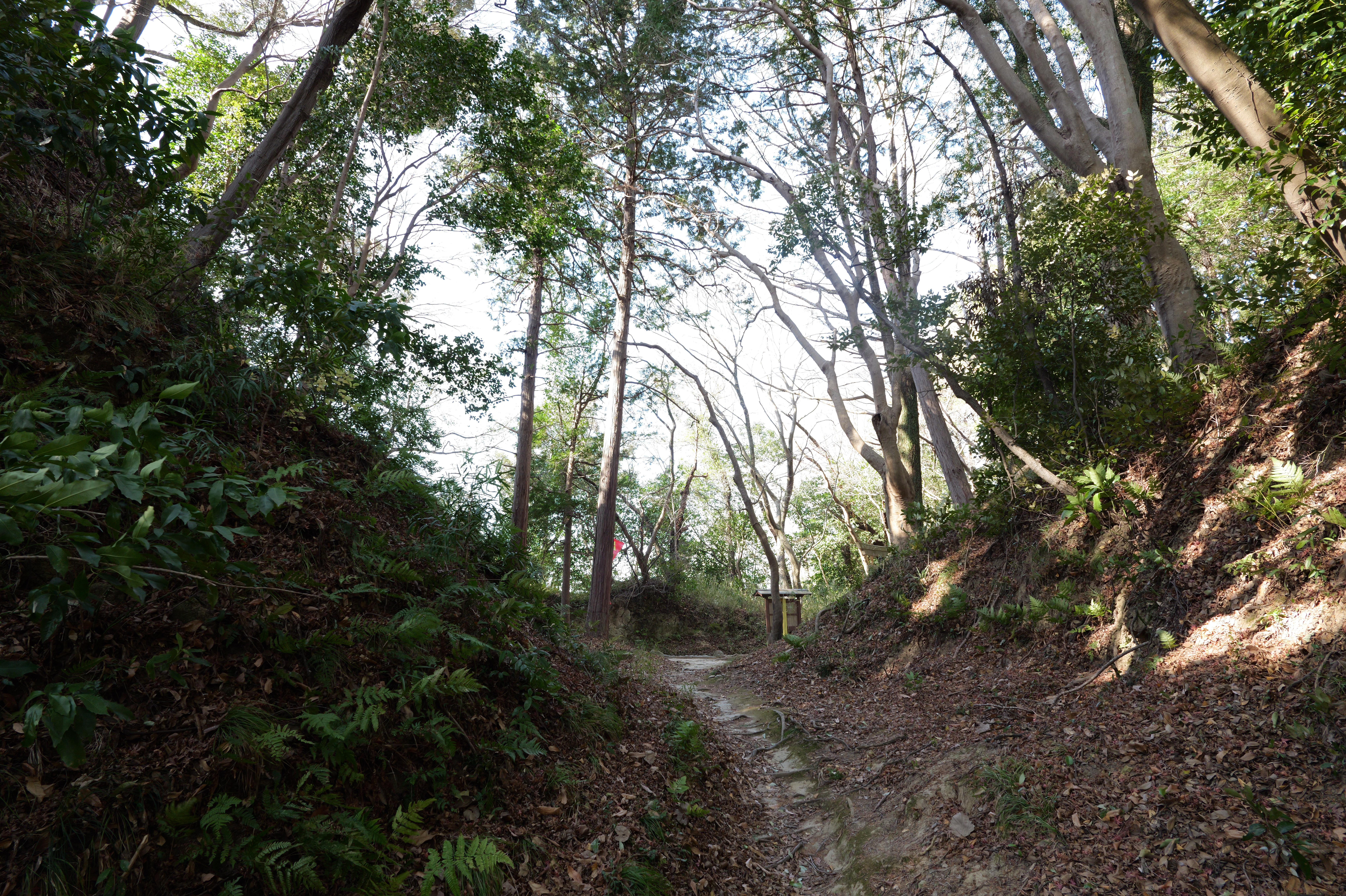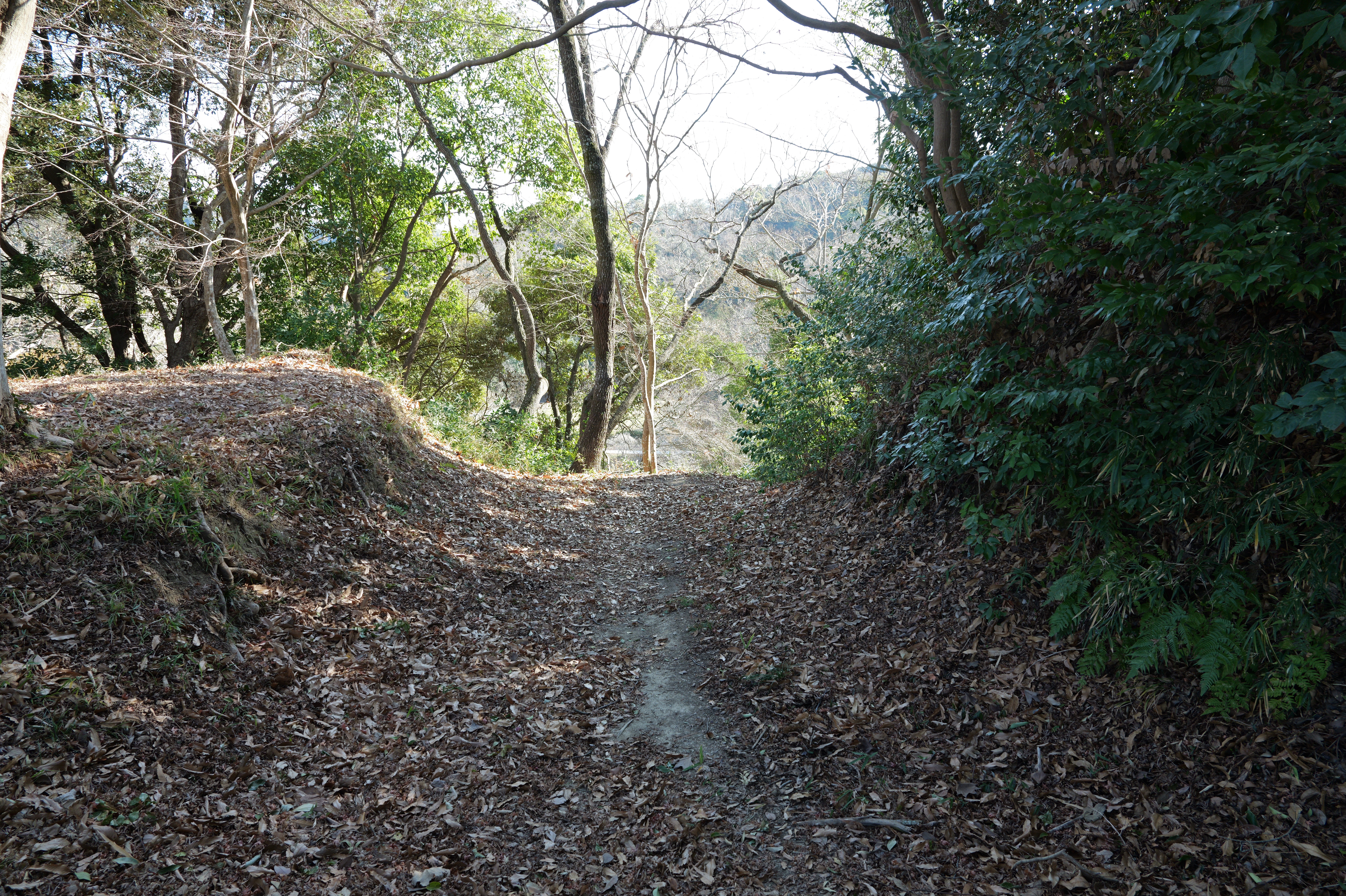 二の丸に下りて西方向。二の丸南西隅の切手門跡から山吹渓、西之丸庭園入口、鶴の渓と進み、奥階段を登ると砂の丸です。砂の丸は勘定御門から不明門まで続いています。砂の丸を南に進んでいくと途中右側に追廻門があります。西から和歌山城に入る高麗門形式の朱色に塗られた門です。戻って砂の丸をさらに南へ進むと現在は護国神社があり、新裏坂登り口、その先は駐車場となっていて、駐車場入口が不明門跡となっています。不明門跡を出て左側は南堀です。駐車場の北東奥部分から南の丸へ続きます。南の丸は和歌山城動物園になっています。