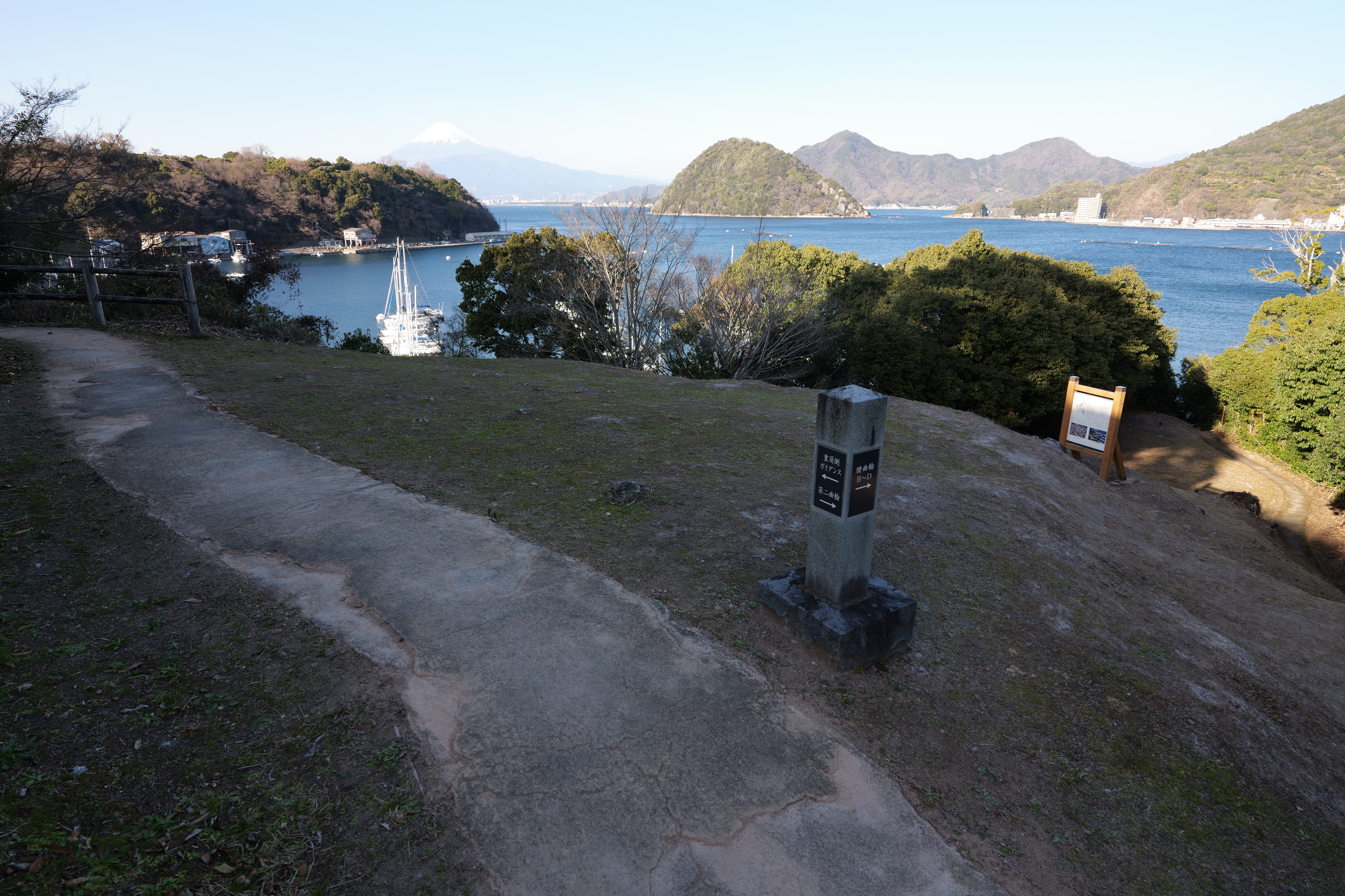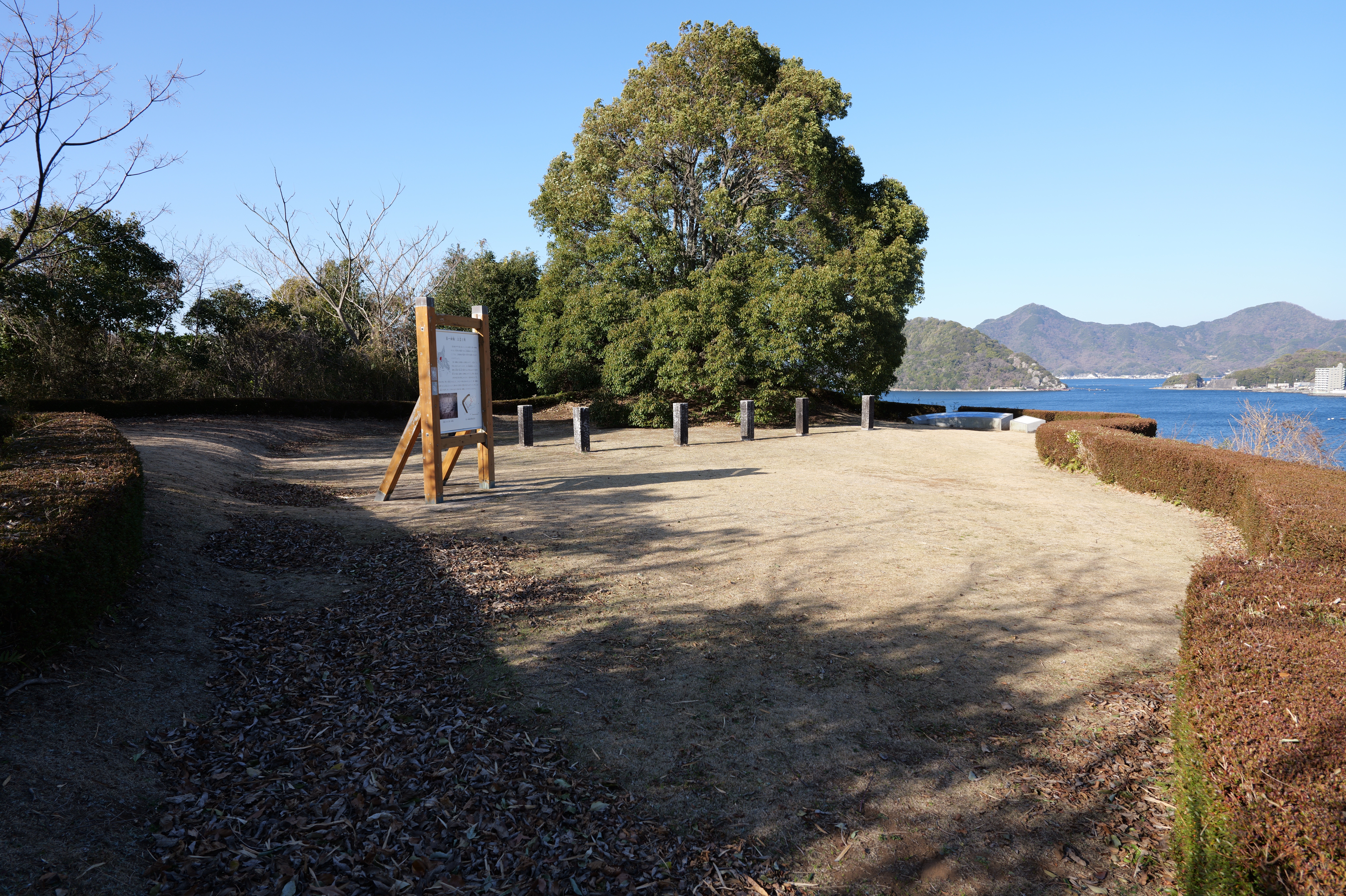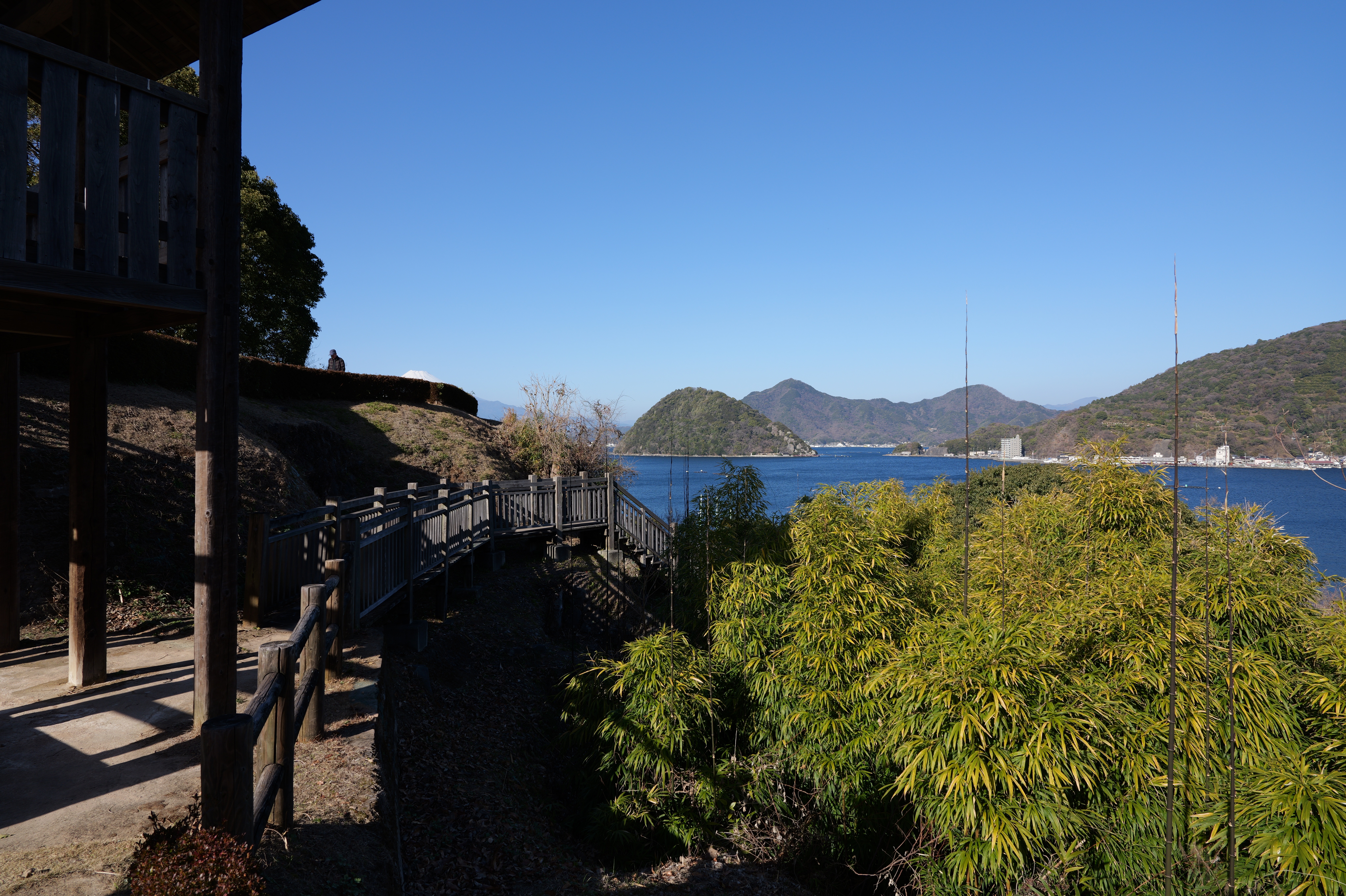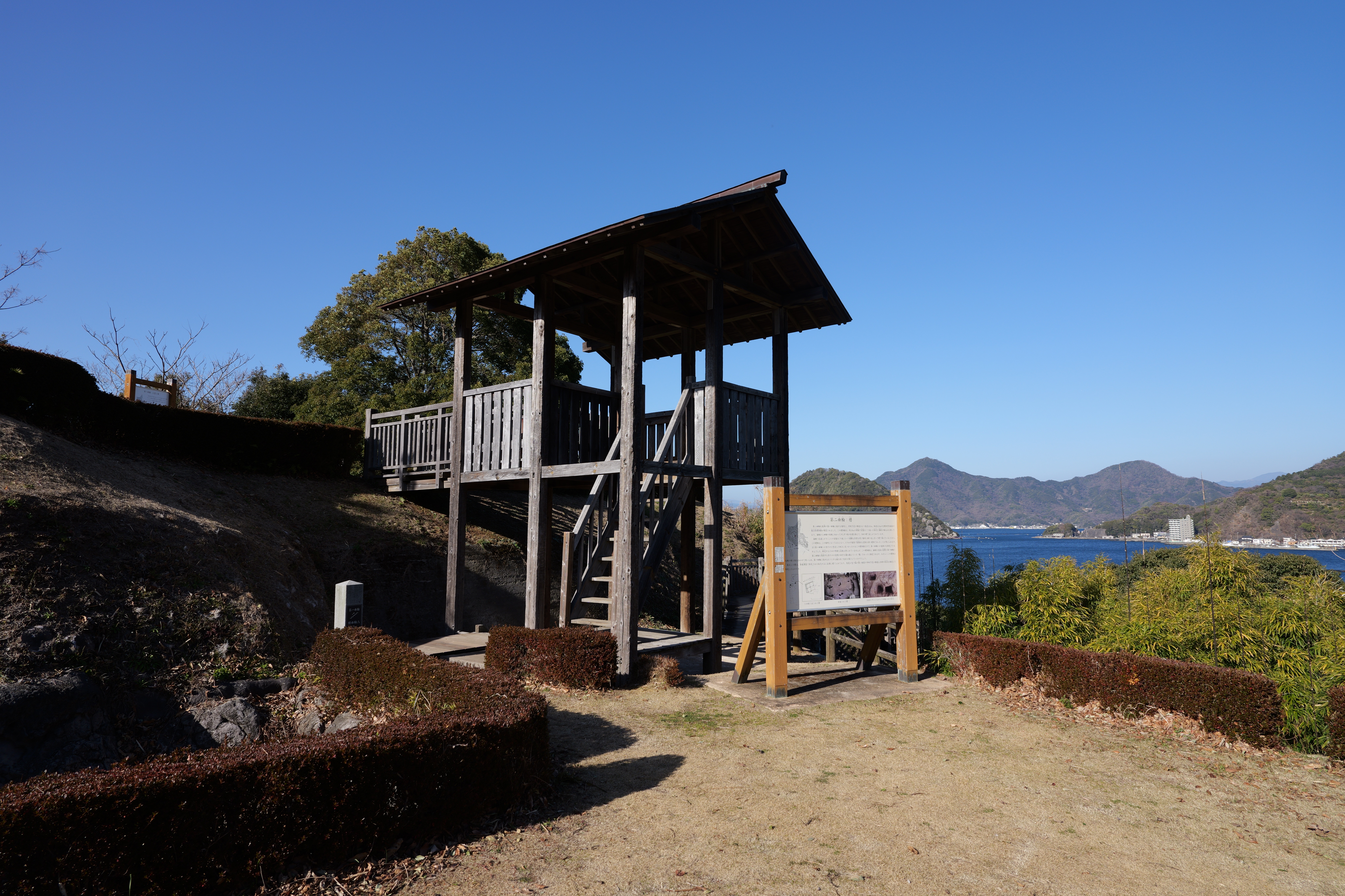さていよいよ天守へ。天守前券売所で御城印(2月限定版:300円)をゲット、入場料は410円です。天守二の門から入ります。天守は、大天守から時計回りに南多門、天守二の門、二の門櫓、西多門、乾櫓、北多門、御台所、小天守へと続く連立式で、小天守から入り、ぐるり一周して御台所が出口になっています。内部は史料館になっています。最上階は外に出られて、360度見渡せます。西側は淡路島や四国まで見渡せ、東側では先ほど見られなかった本丸御殿跡もよく見えます。