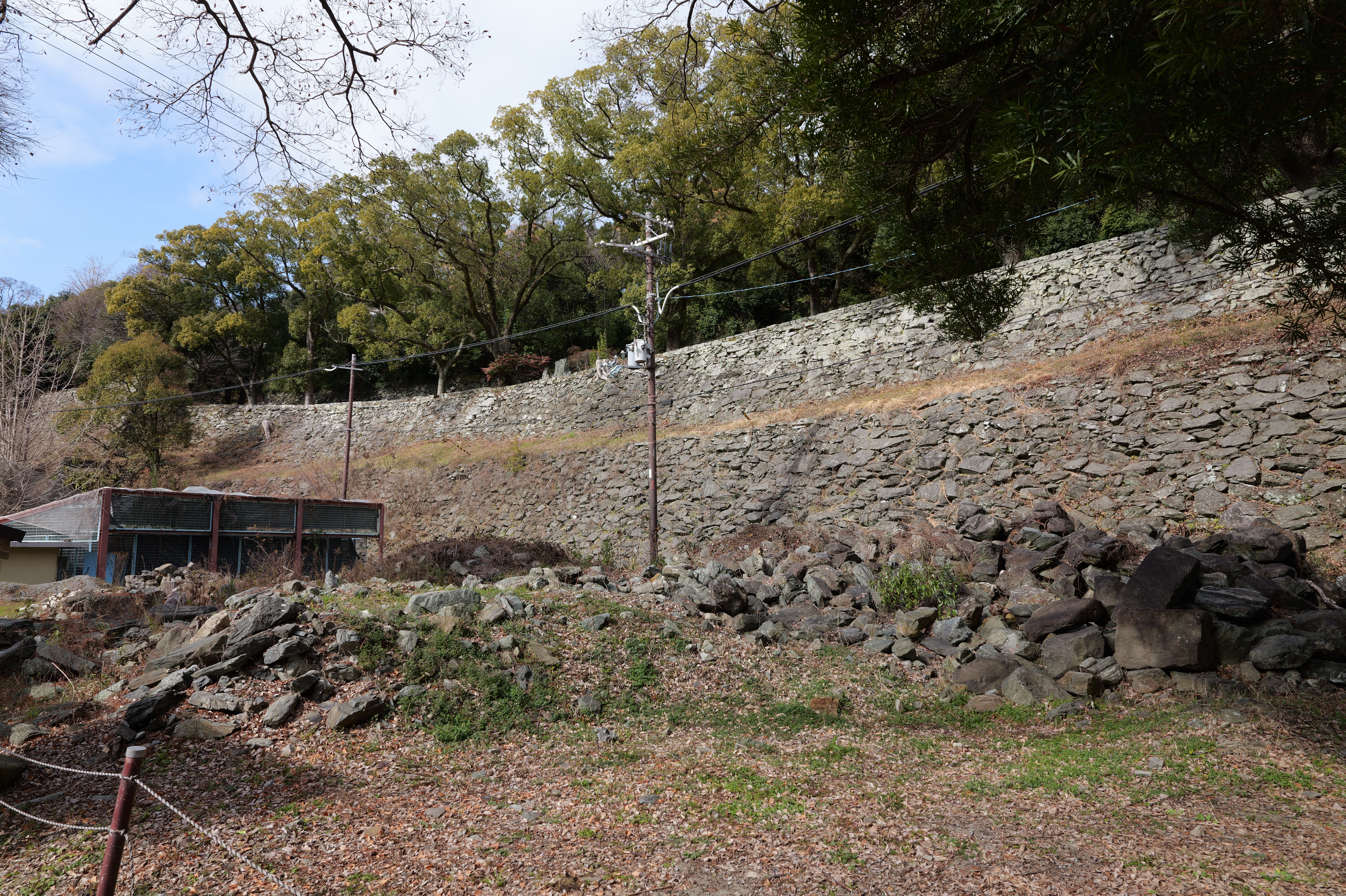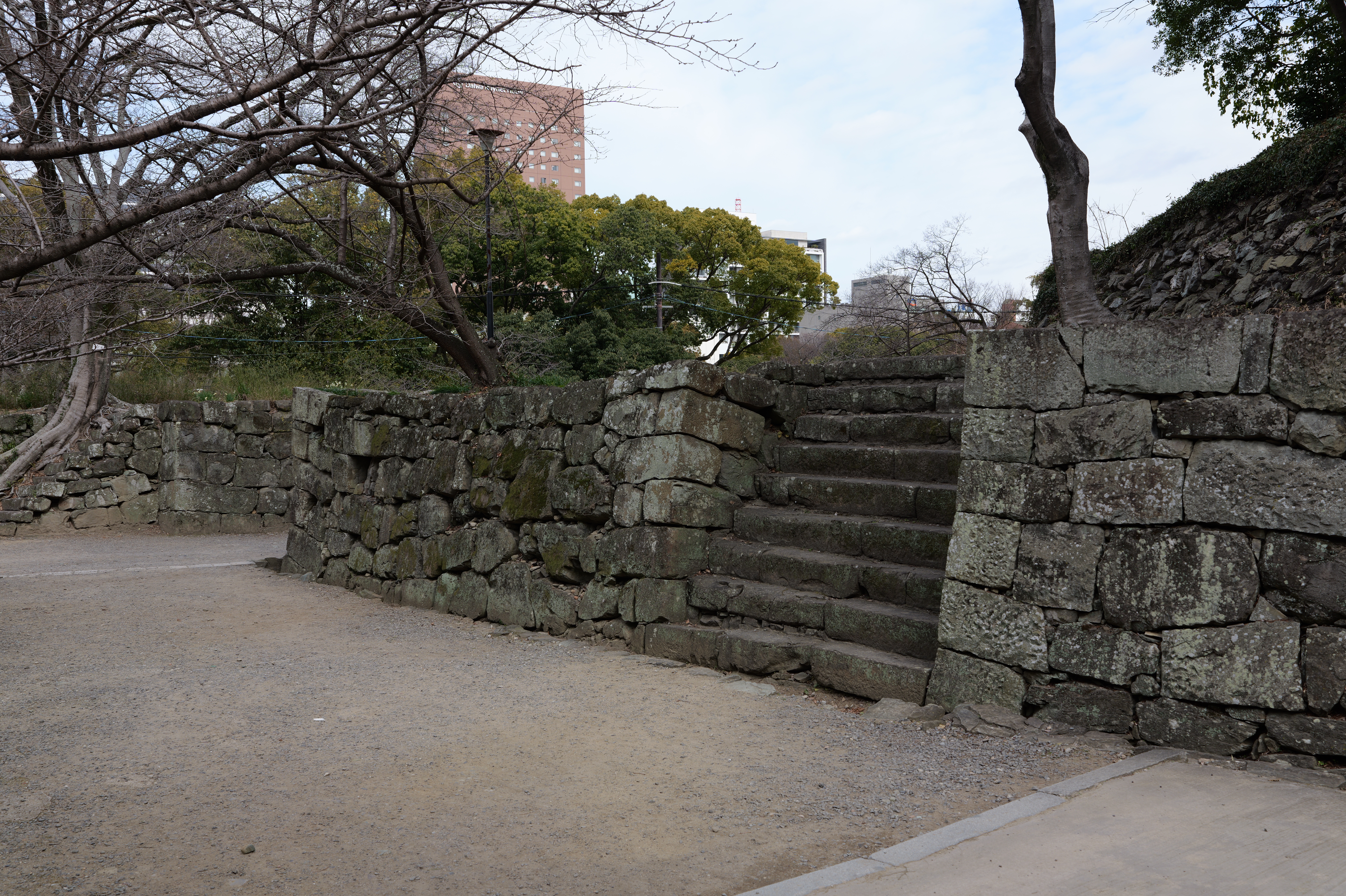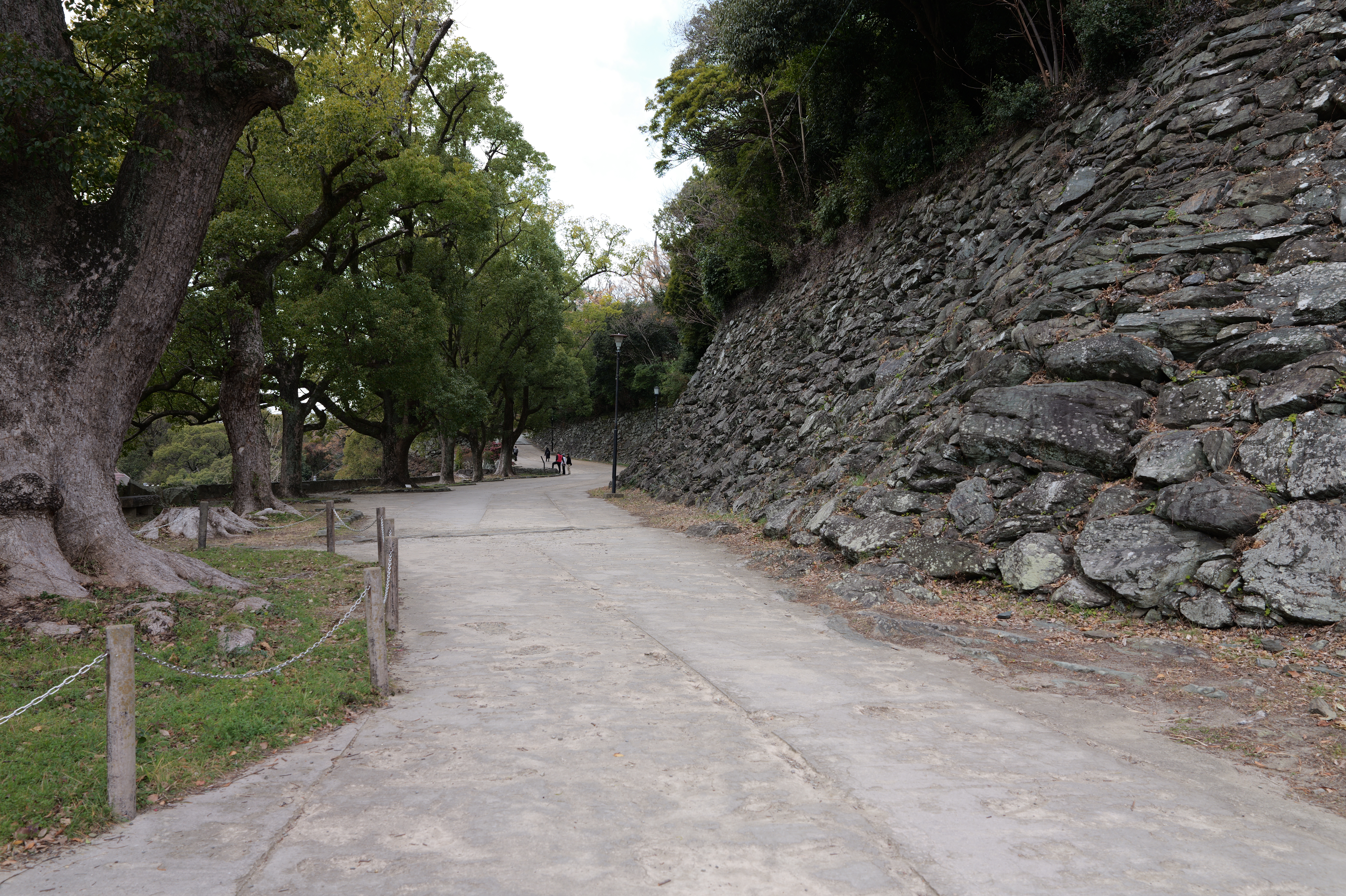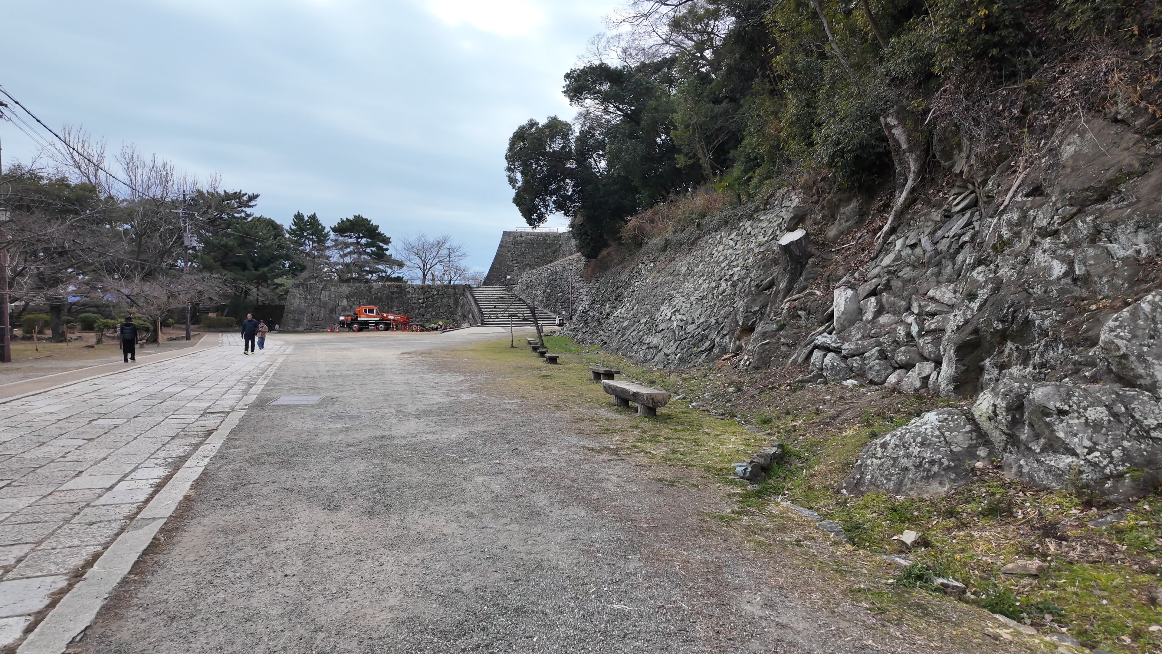 東の方へ戻ると右側に大鳥居があり三ノ丸へ道が続いていますが、本丸南側石垣のこの部分は道を作るために分断されました。東側の石垣は戦後撤去された上半分を復元したとのことで、上下で若干色が違っています。西側の堀に面した石垣は昔のままです。