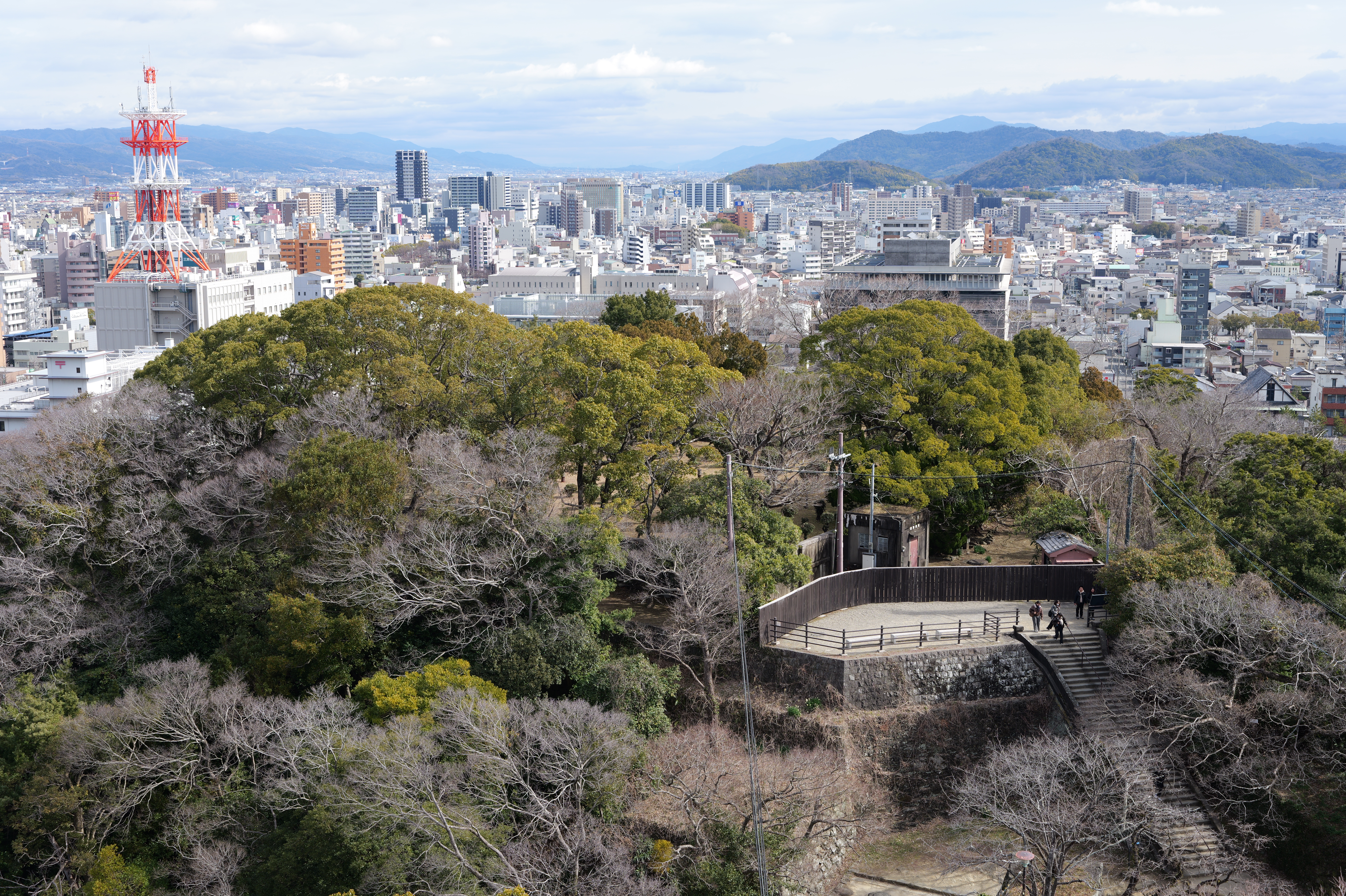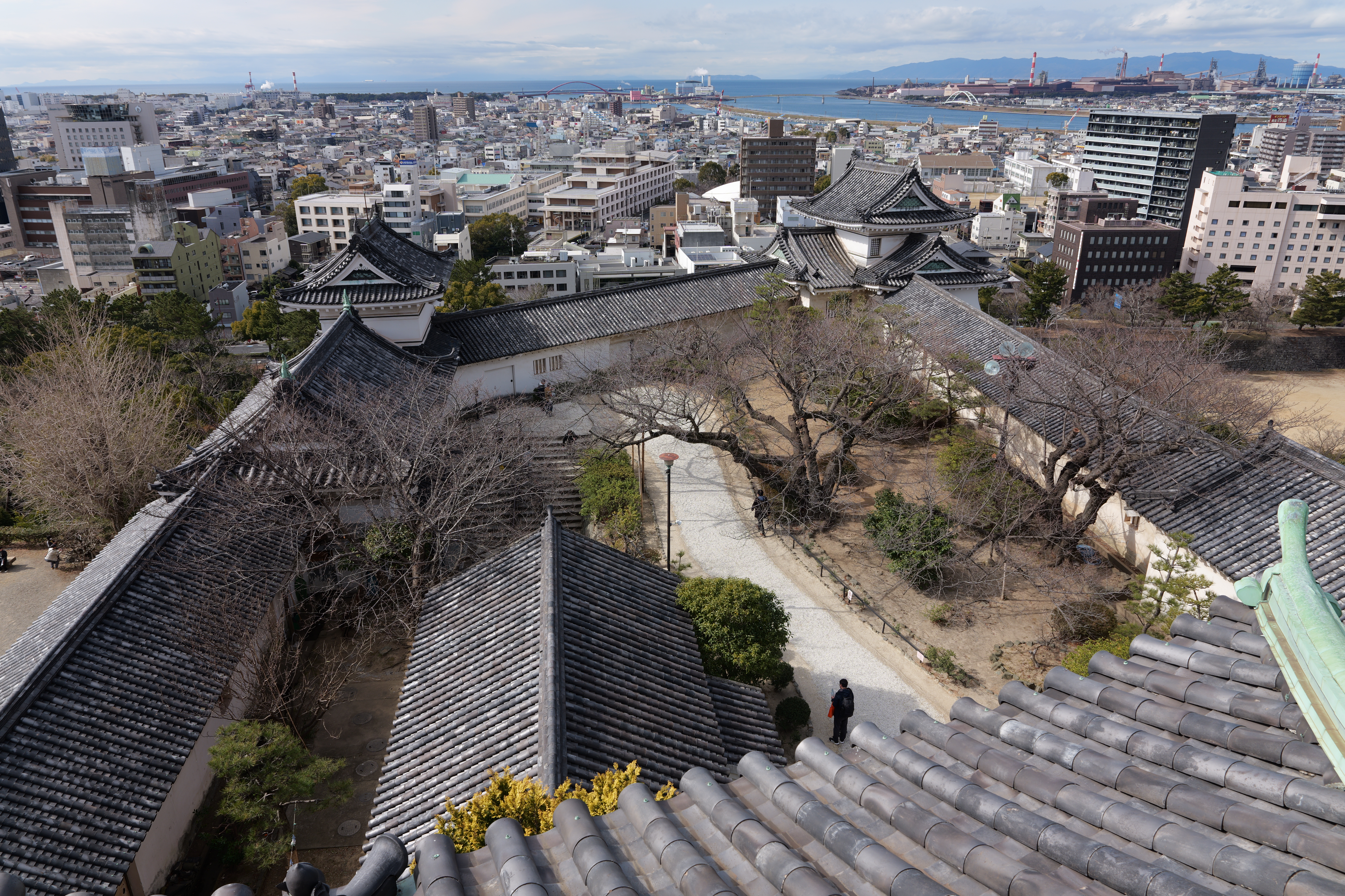 天守内部には小天守から入り、ぐるり一周して御台所が出口です。中に入るとは史料館になっていています。大天守最上階で外に出ると360度のすばらしい眺望で、西側は淡路島や四国まで見渡せ、東側では先ほど見られなかった本丸御殿跡もよく見えます。