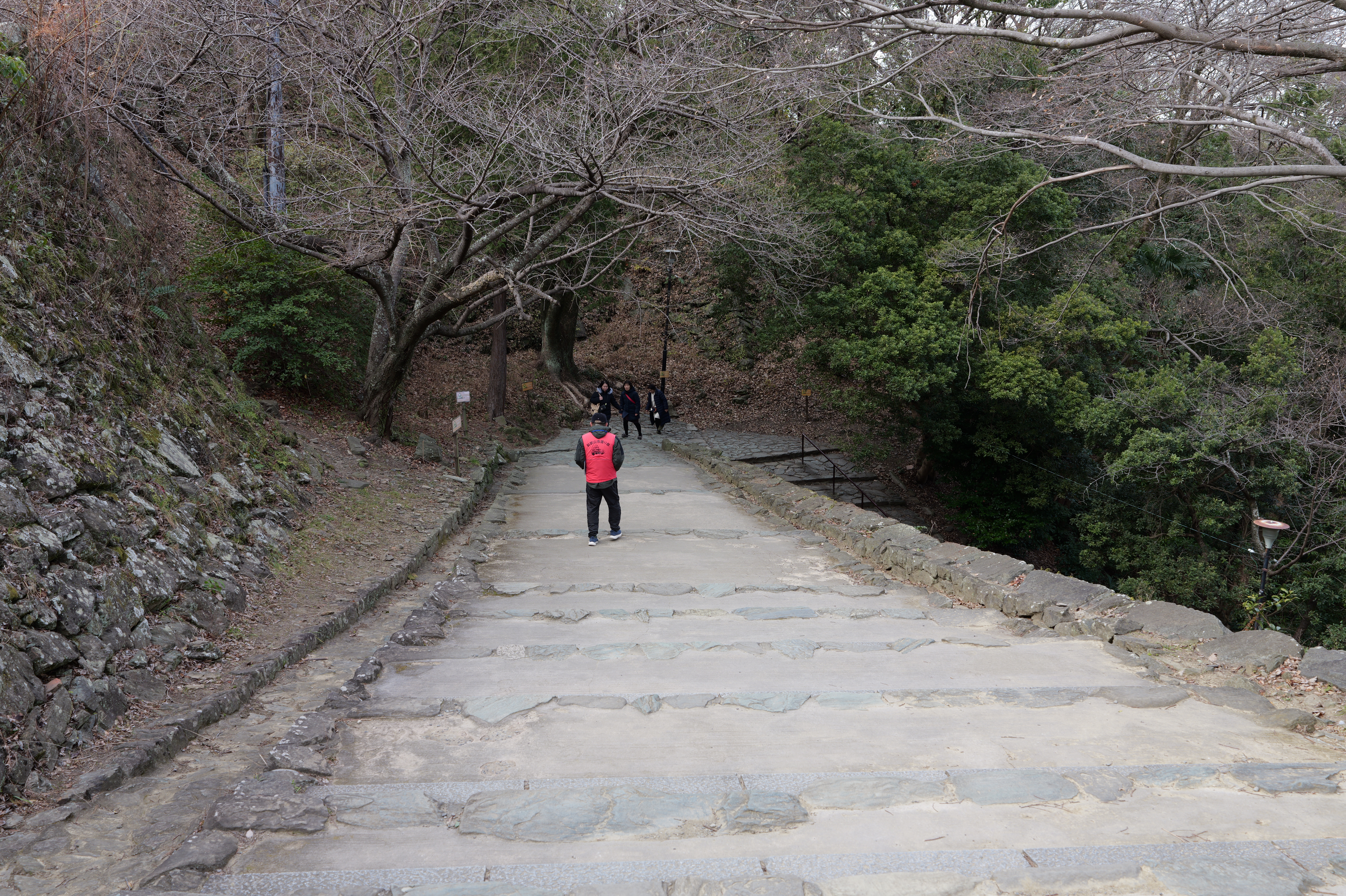 天守を出て西側の新裏坂から天守北側の埋門への小道があるようなので行ってみましたが通行禁止でした。続いて本丸裏門跡から裏坂で下りました。裏坂の途中には銀名水と呼ばれる井戸があります。その先の台所門跡付近にはナニコレ珍百景でMV珍に選ばれたという、階段をよじ登っている人型のように見える根っこを発見。確かに見えて面白いです。