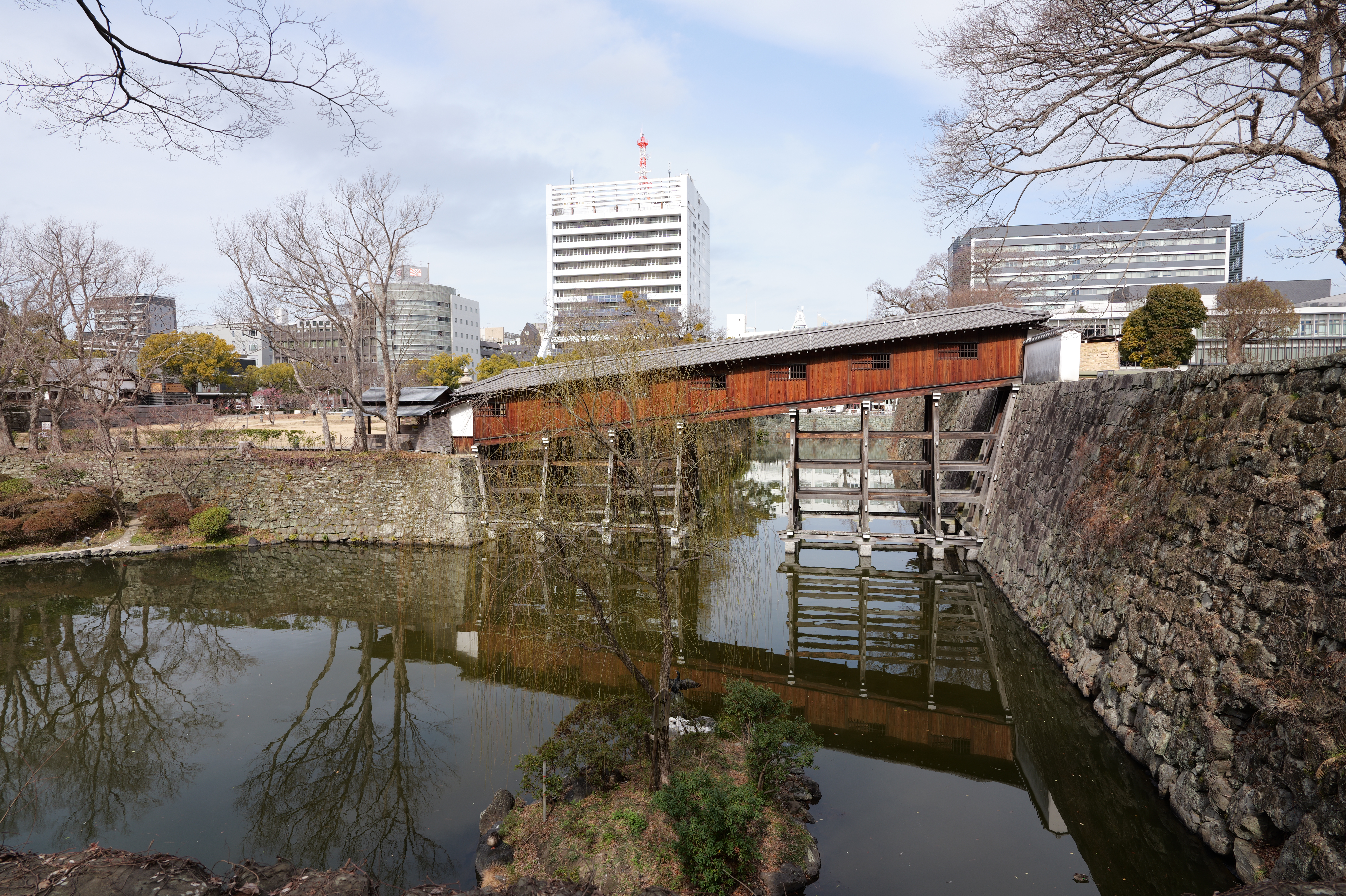 二の丸庭園から東側に出ると内堀、東橋と重要文化財の本丸櫓門があります。