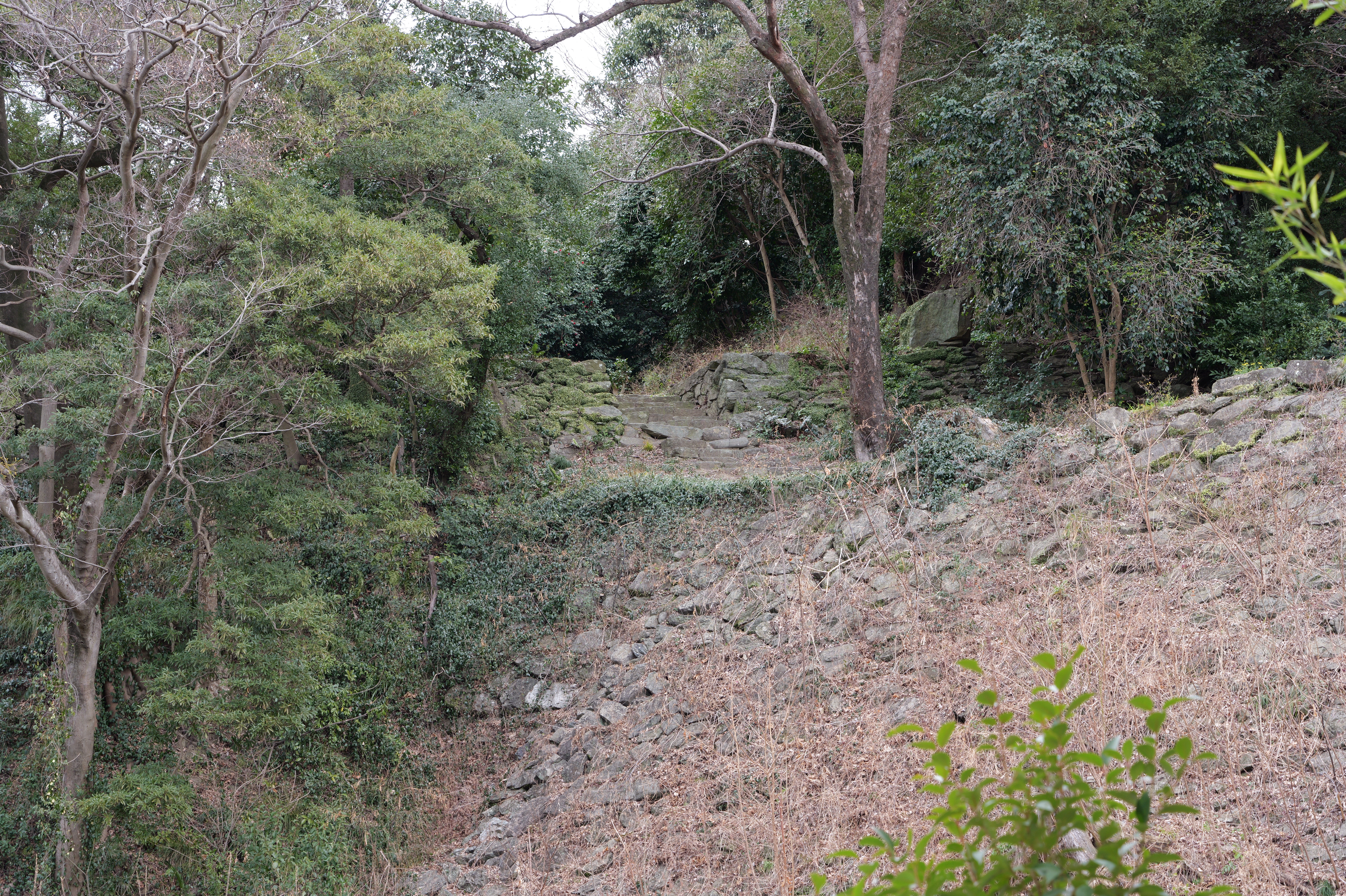 続いて第一曲輪の海に向かって北東へ伸びる尾根上にある曲輪に進みます。櫓の半地下部分から整備された散策路は曲輪Aに続いています。第一曲輪に近い方からAからDの便宜上の名称がついていて、腰曲輪と呼ばれます。