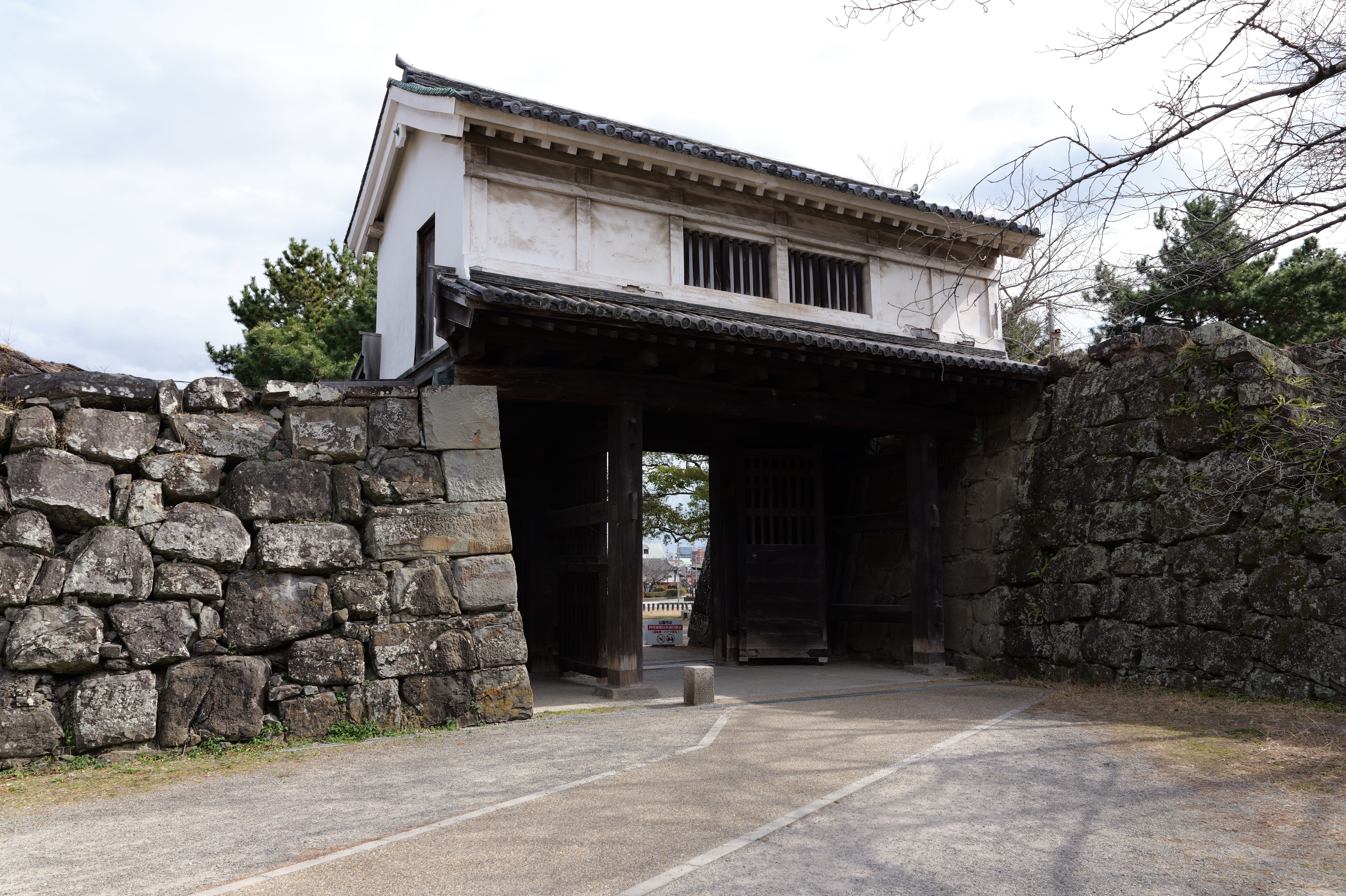内堀の北西隅に重要文化財の西北土蔵(米蔵)があります。土蔵の西側奥には重要文化財の西門があるのですが、そこまでは立ち入りできず、遠くから眺めるのみです。土蔵を過ぎて内堀沿いに東へ進むと重要文化財の北中仕切門。