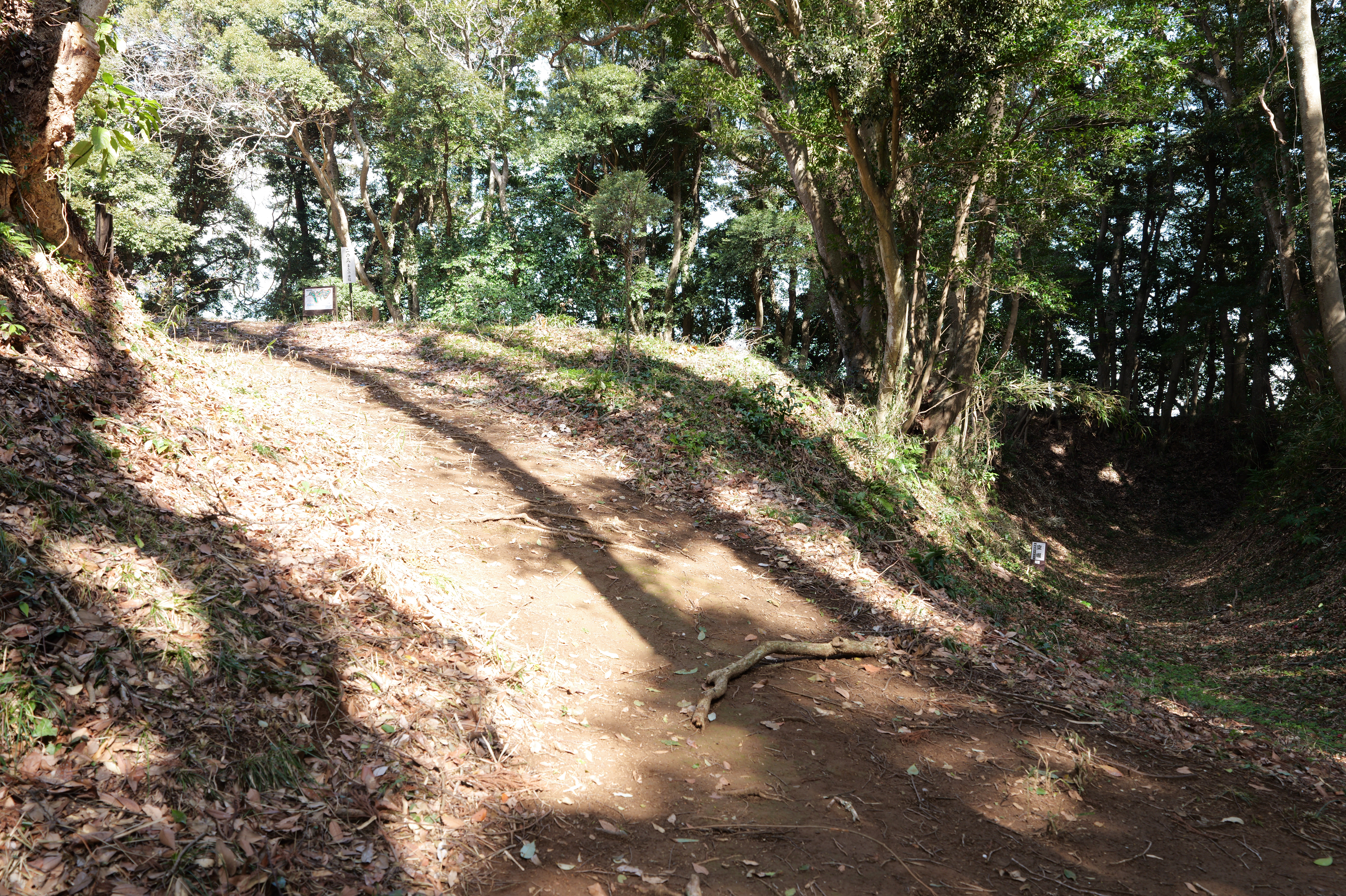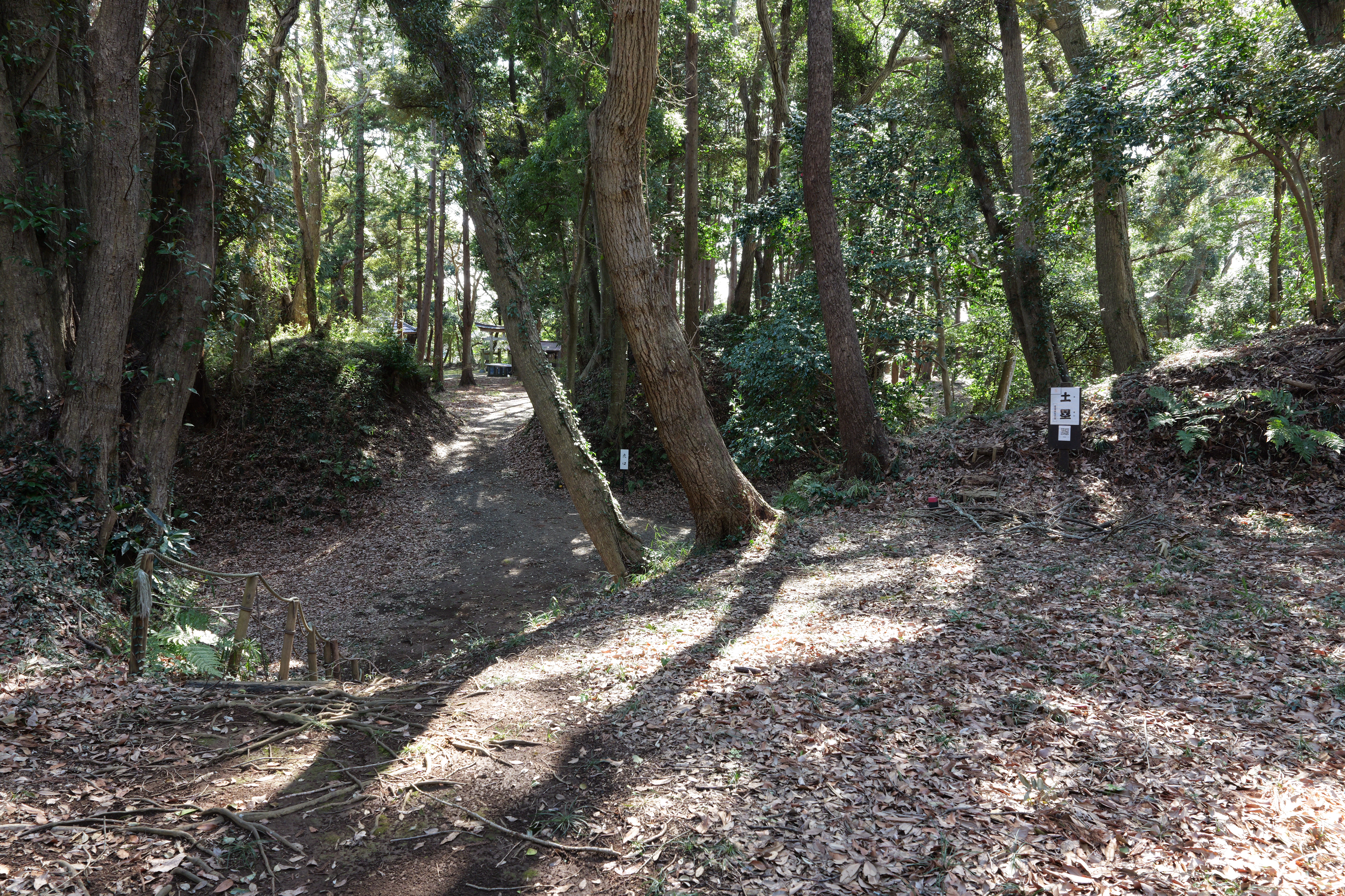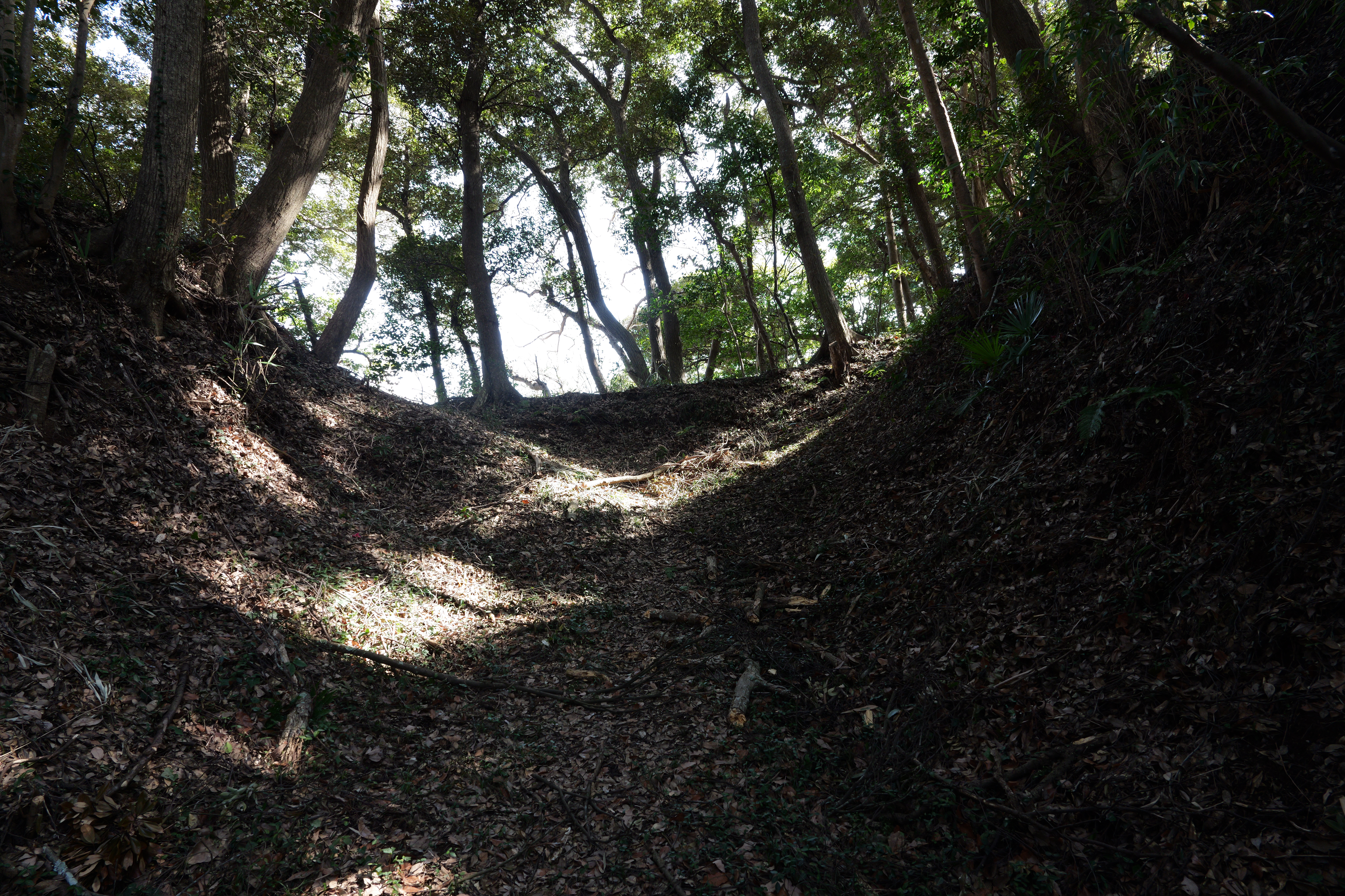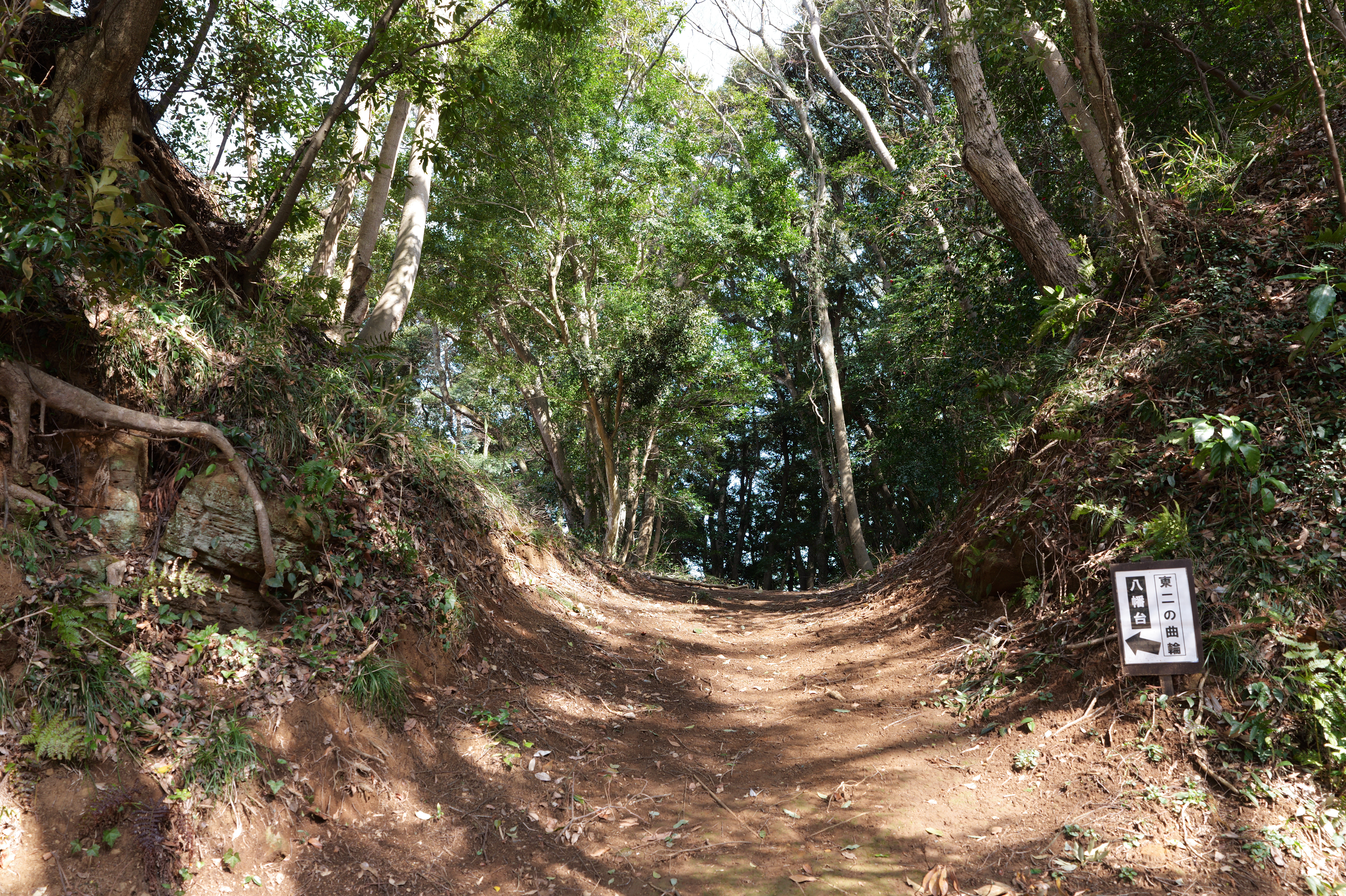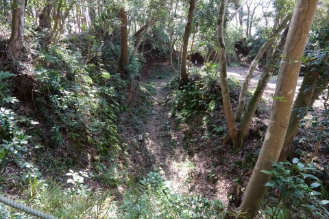 一の曲輪はのちほど行くことにして、右方向へ降りていきました。左手に空堀(一の曲輪-水の手曲輪)が見え、その先の水の手曲輪へ。