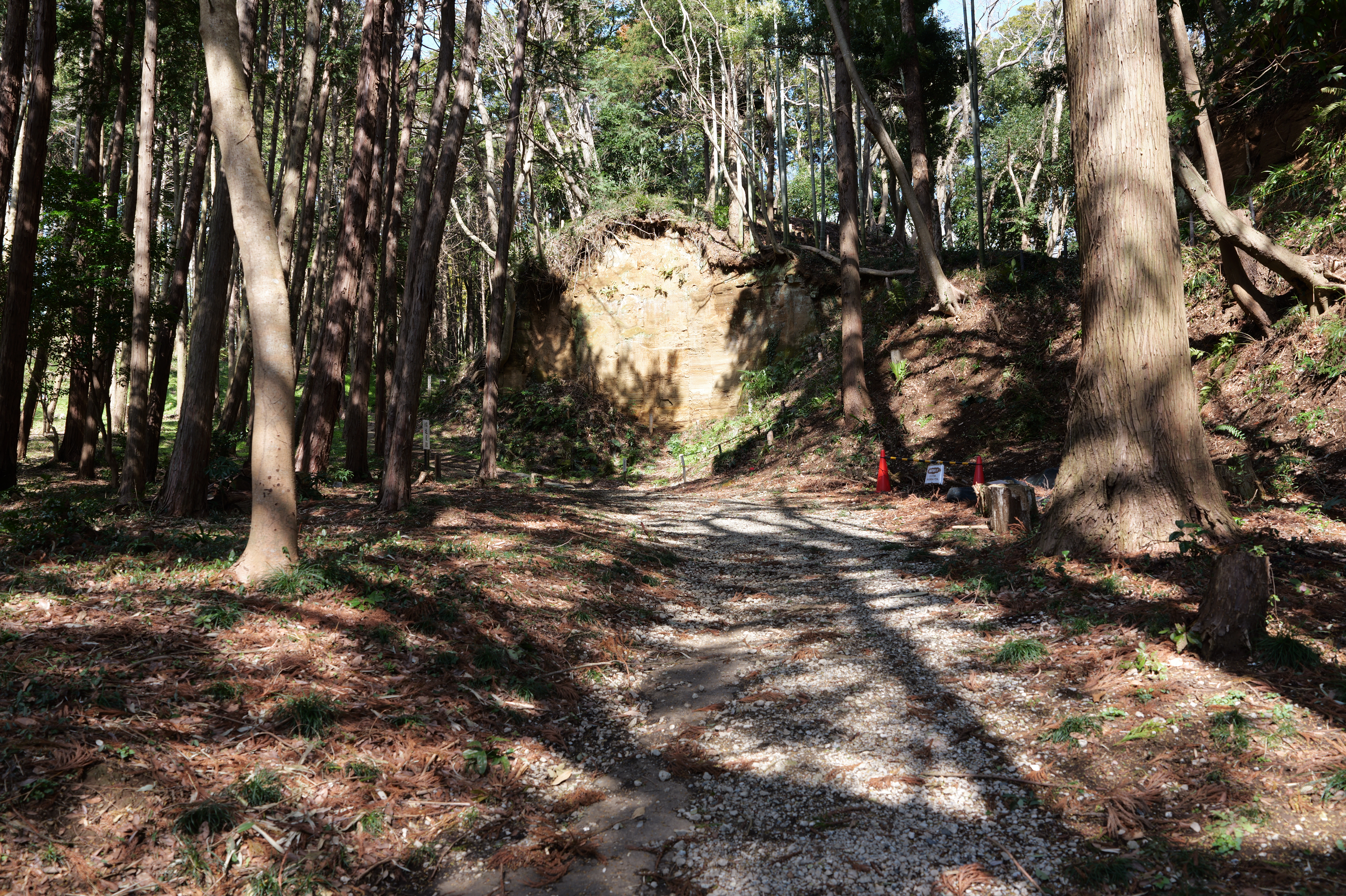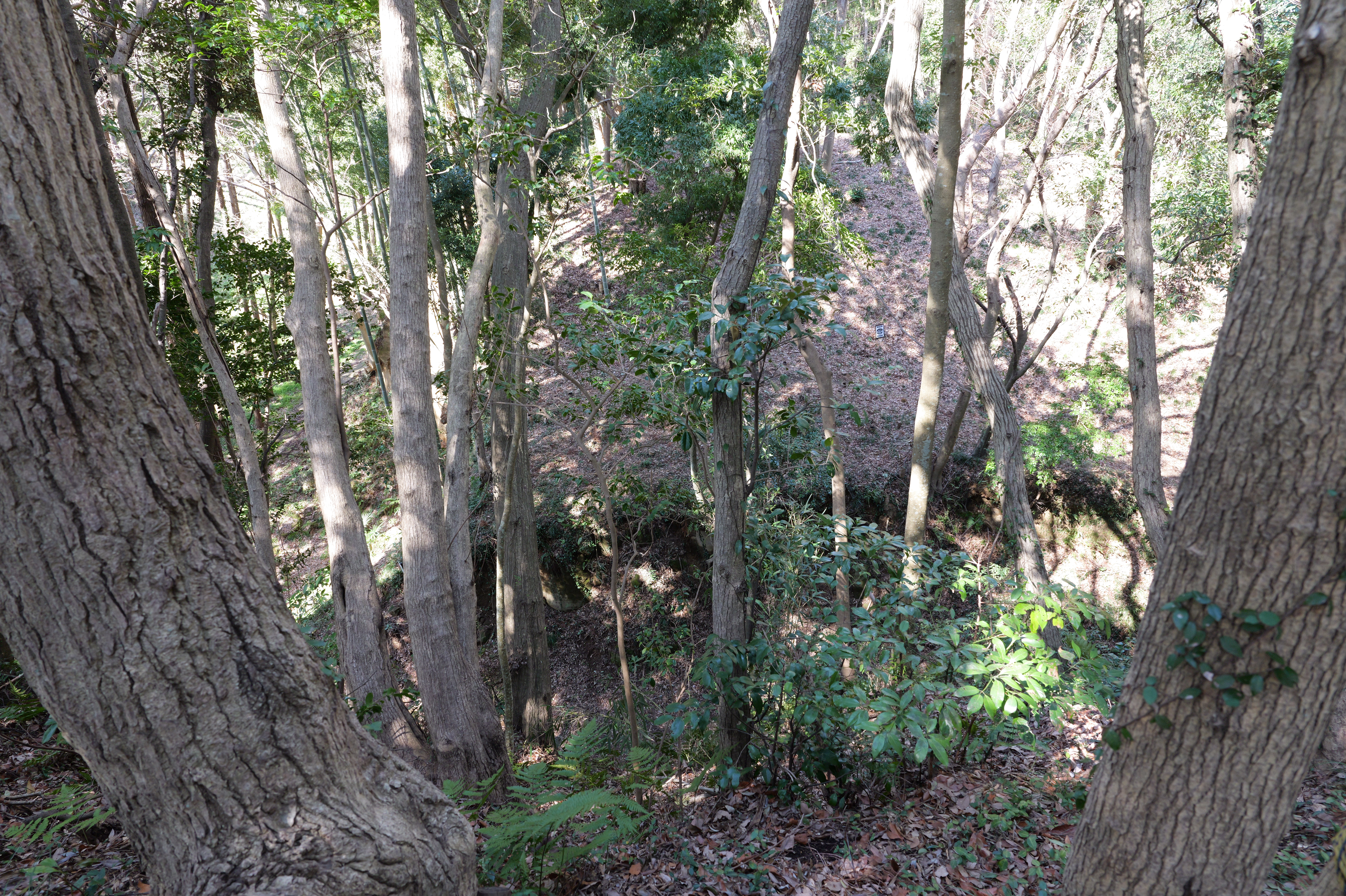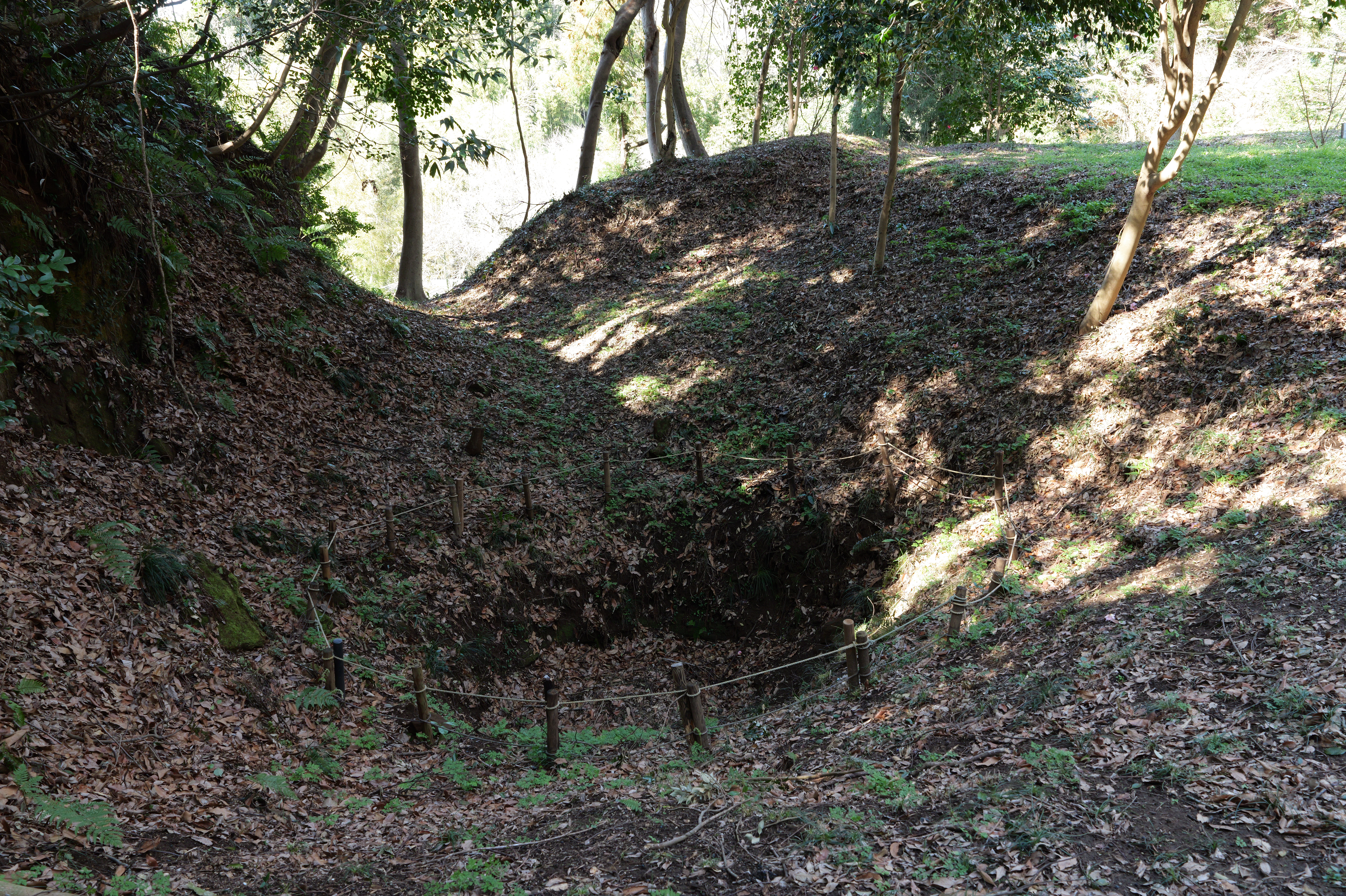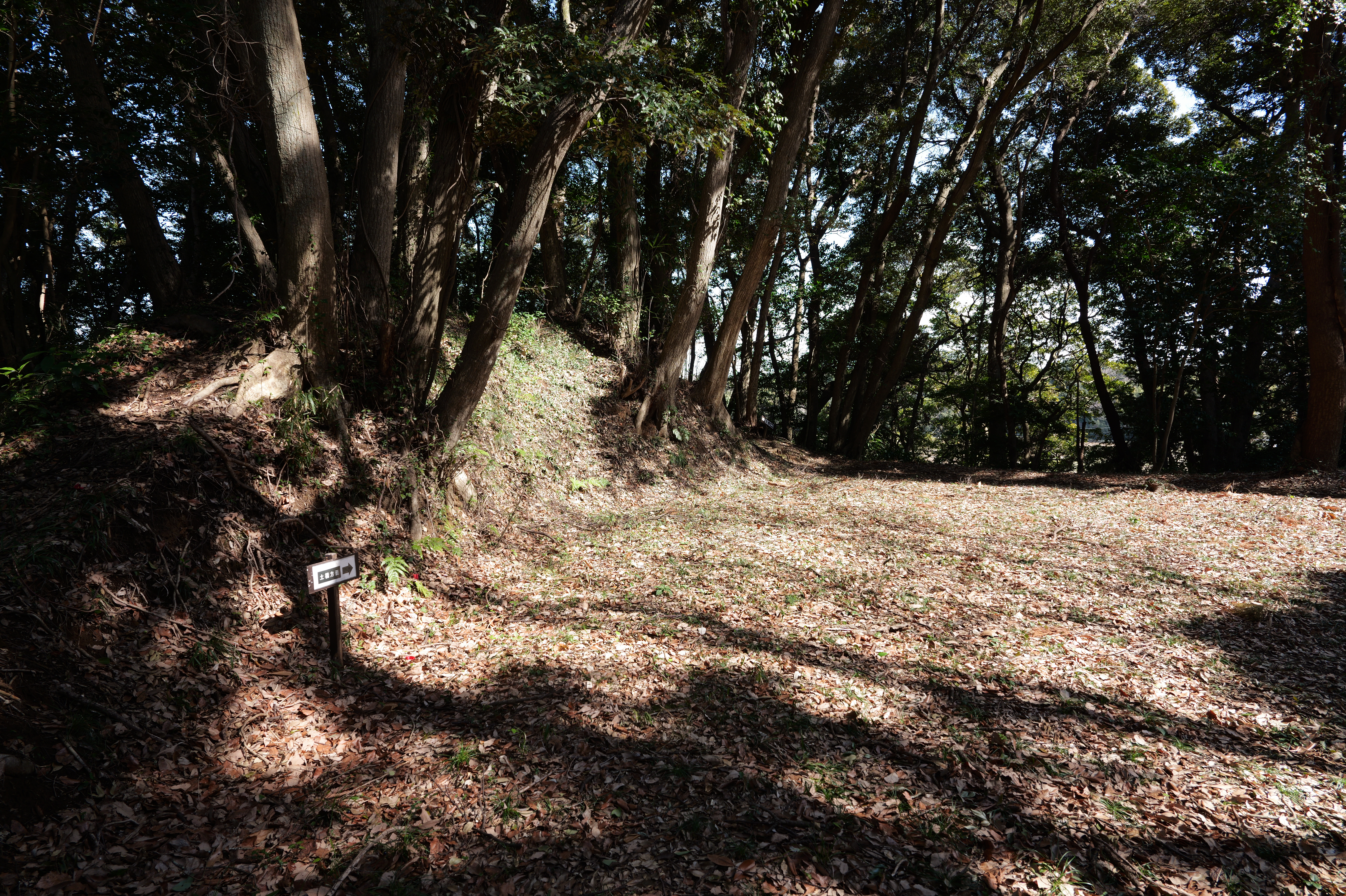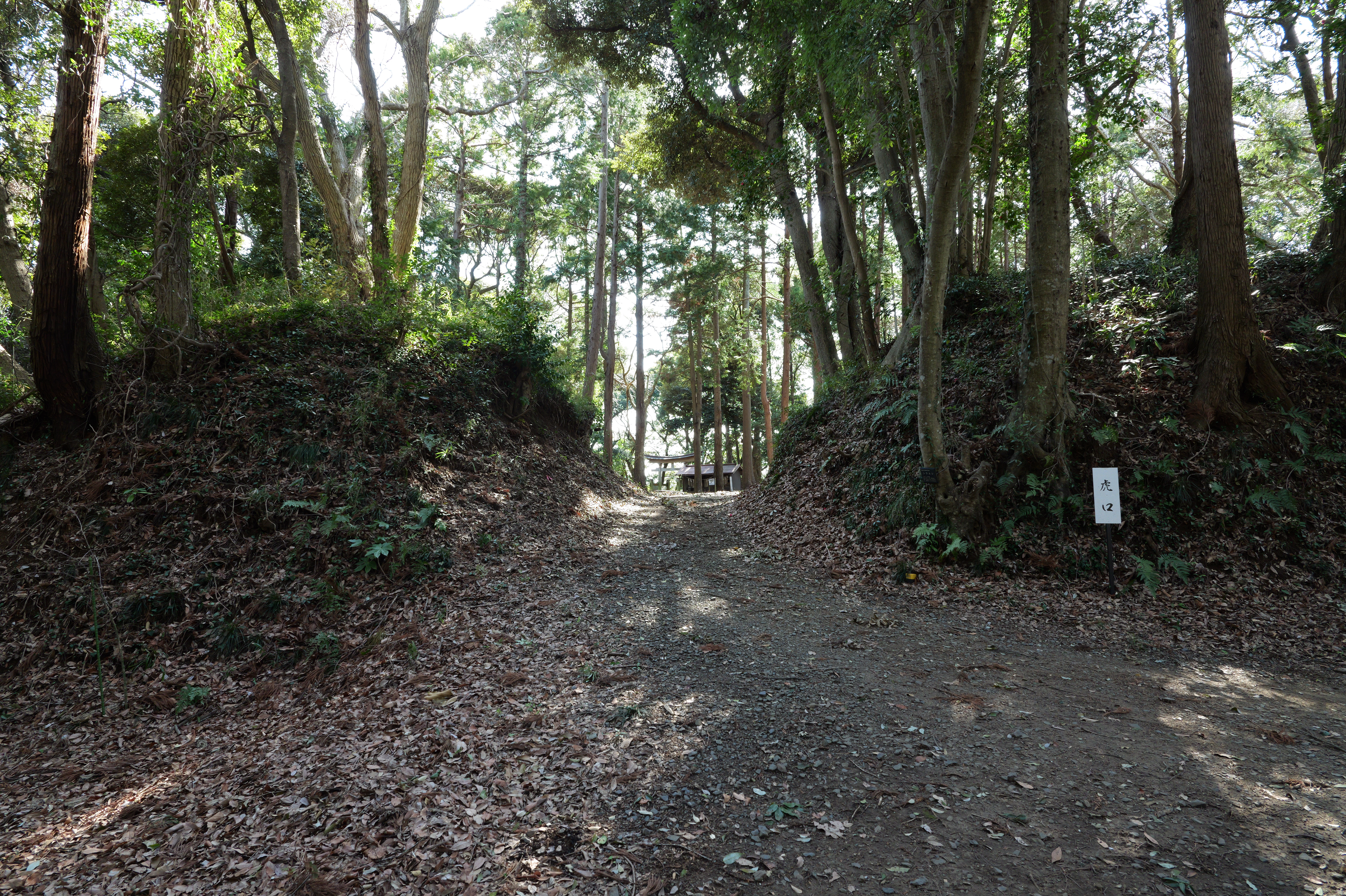 一の曲輪はのちほど行くことにして、右方向へ降りていきました。左手に空堀(一の曲輪-水の手曲輪)が見え、その先の水の手曲輪へ。