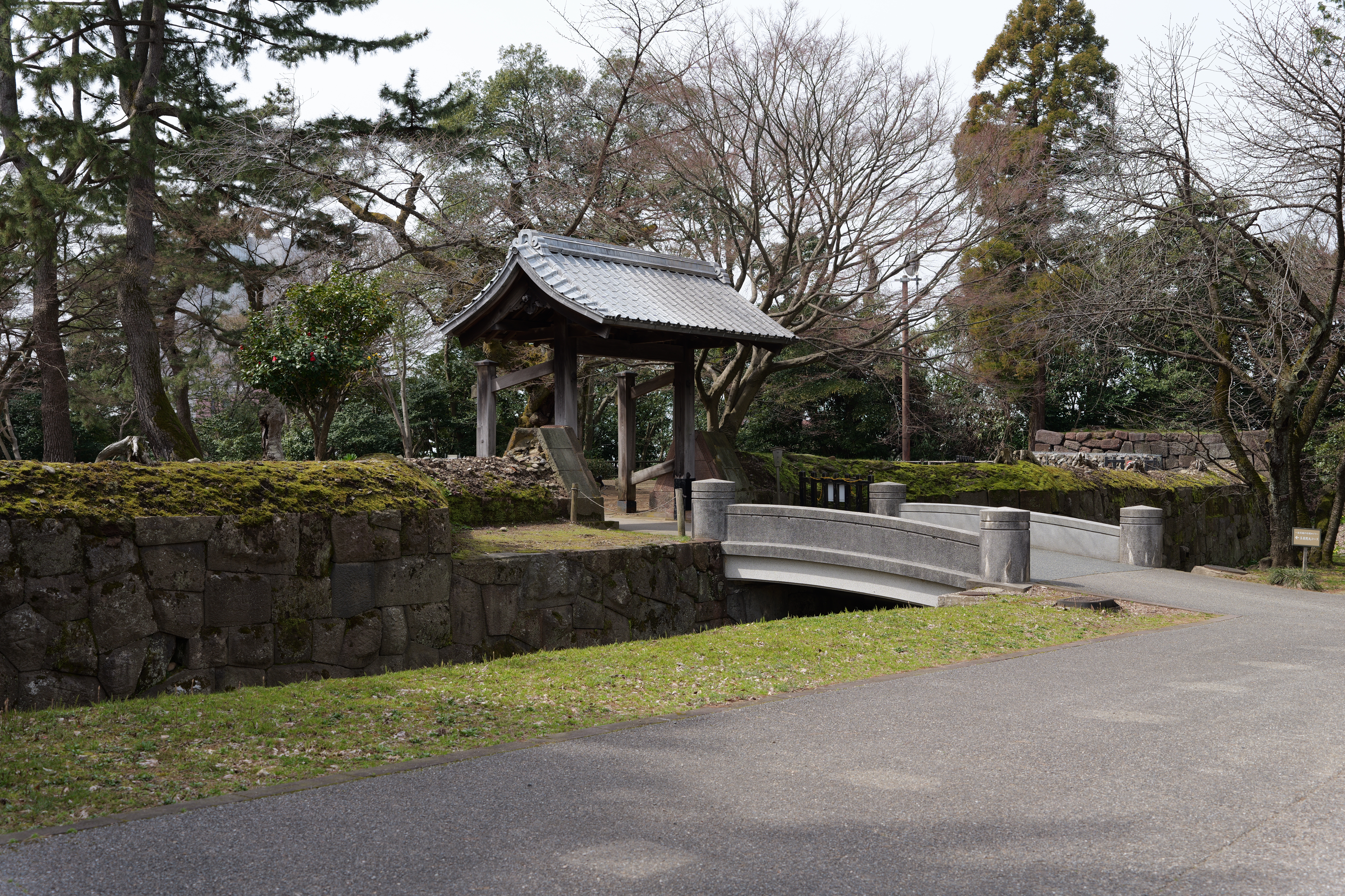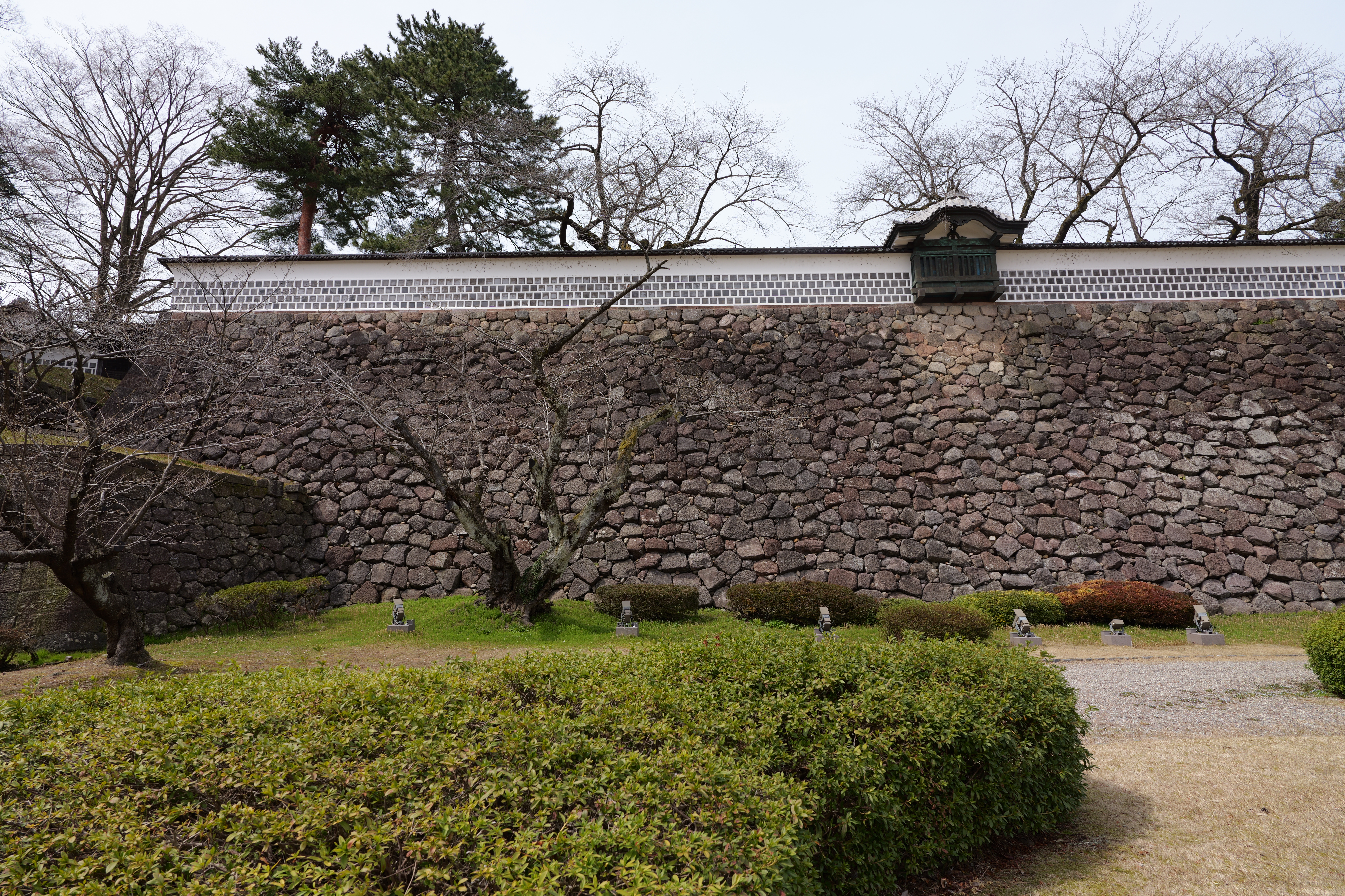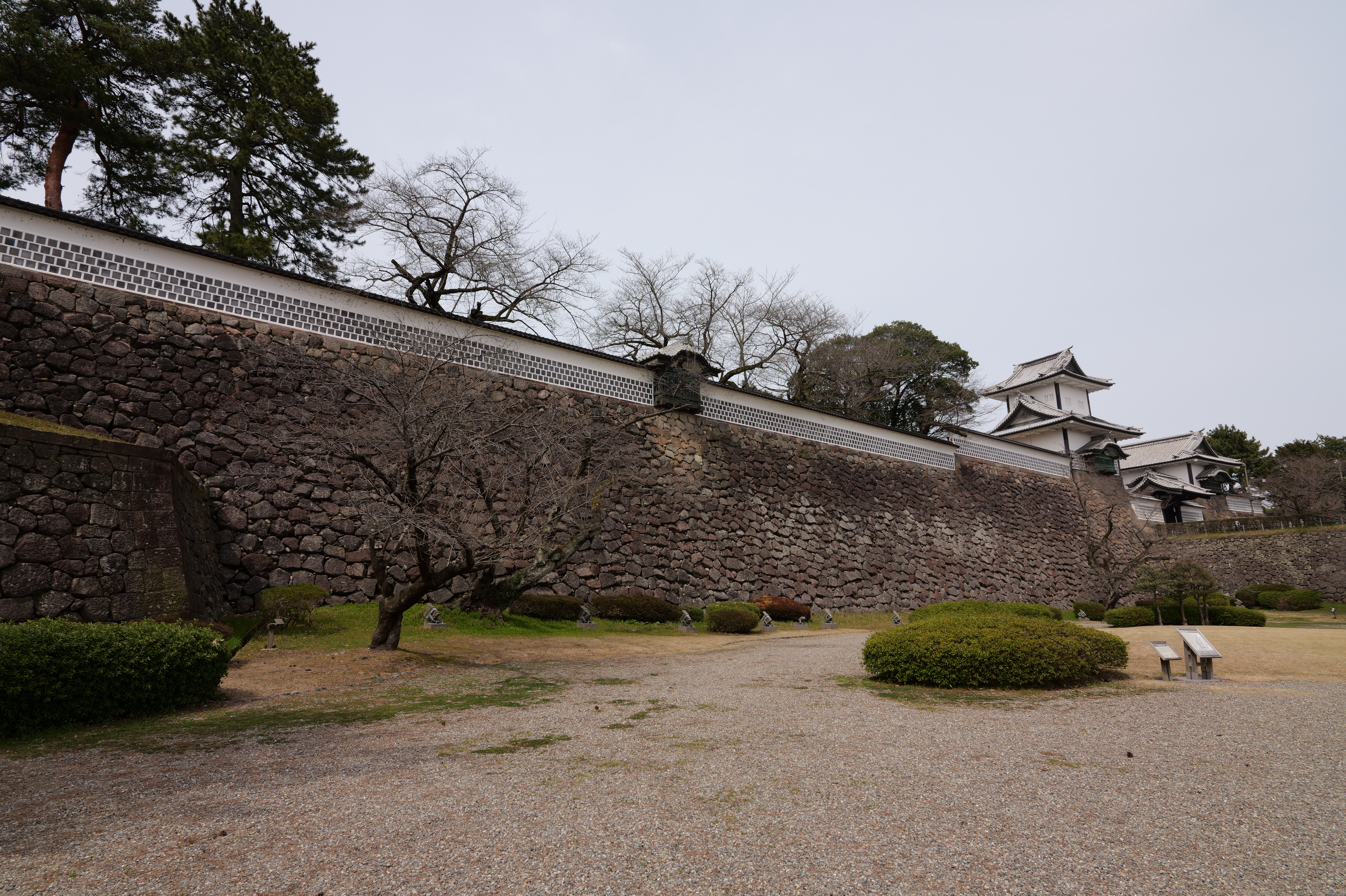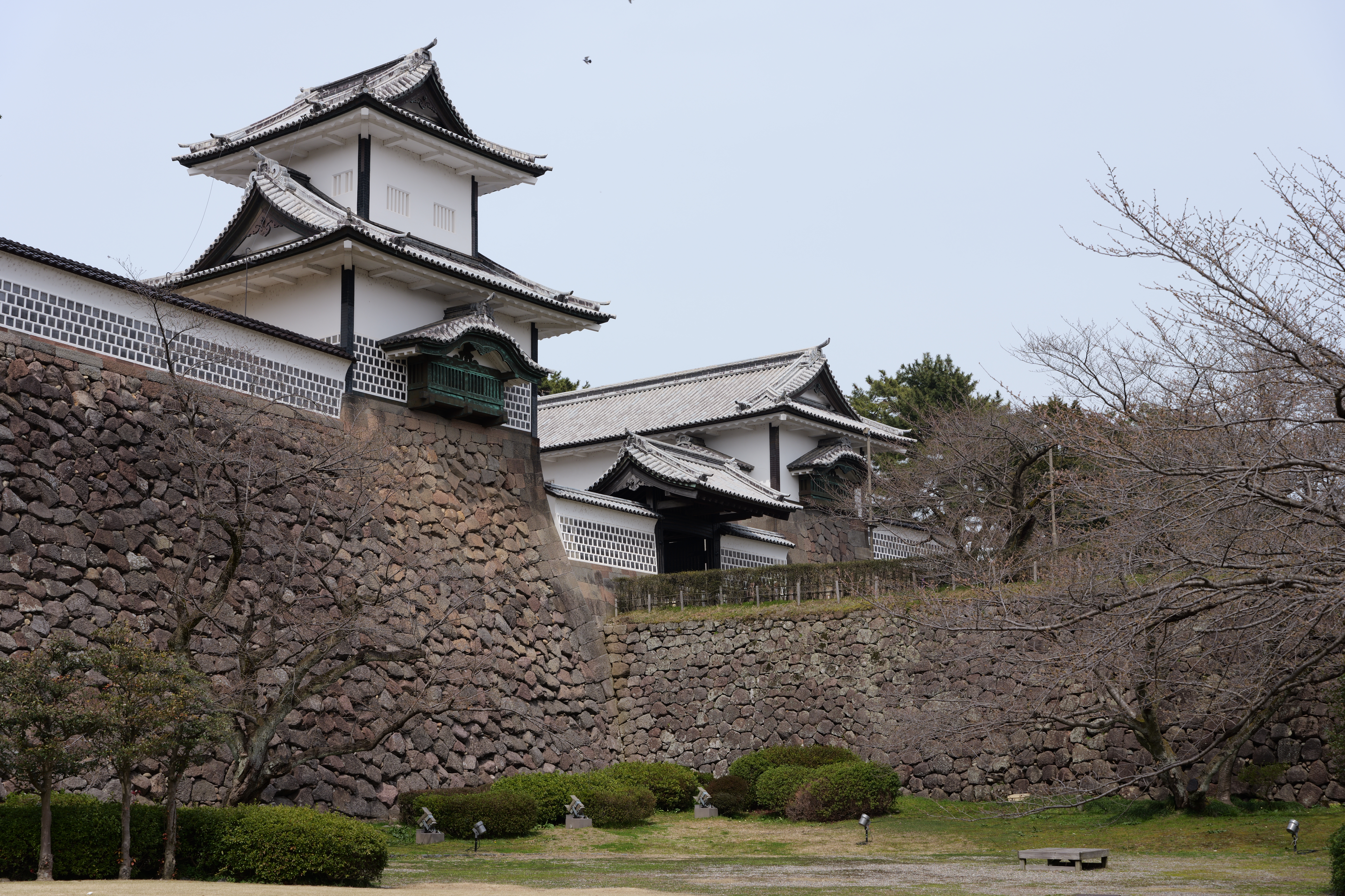庭園の北側は松坂から紅葉橋、鼠多門へと道が続いています。鼠多門は、鼠多門橋でつながる金谷出丸(現在の尾山神社境内)からの出入口です。他の白い海鼠壁とは異なり黒い海鼠漆喰が特徴で、2020年7月復元完成しました。