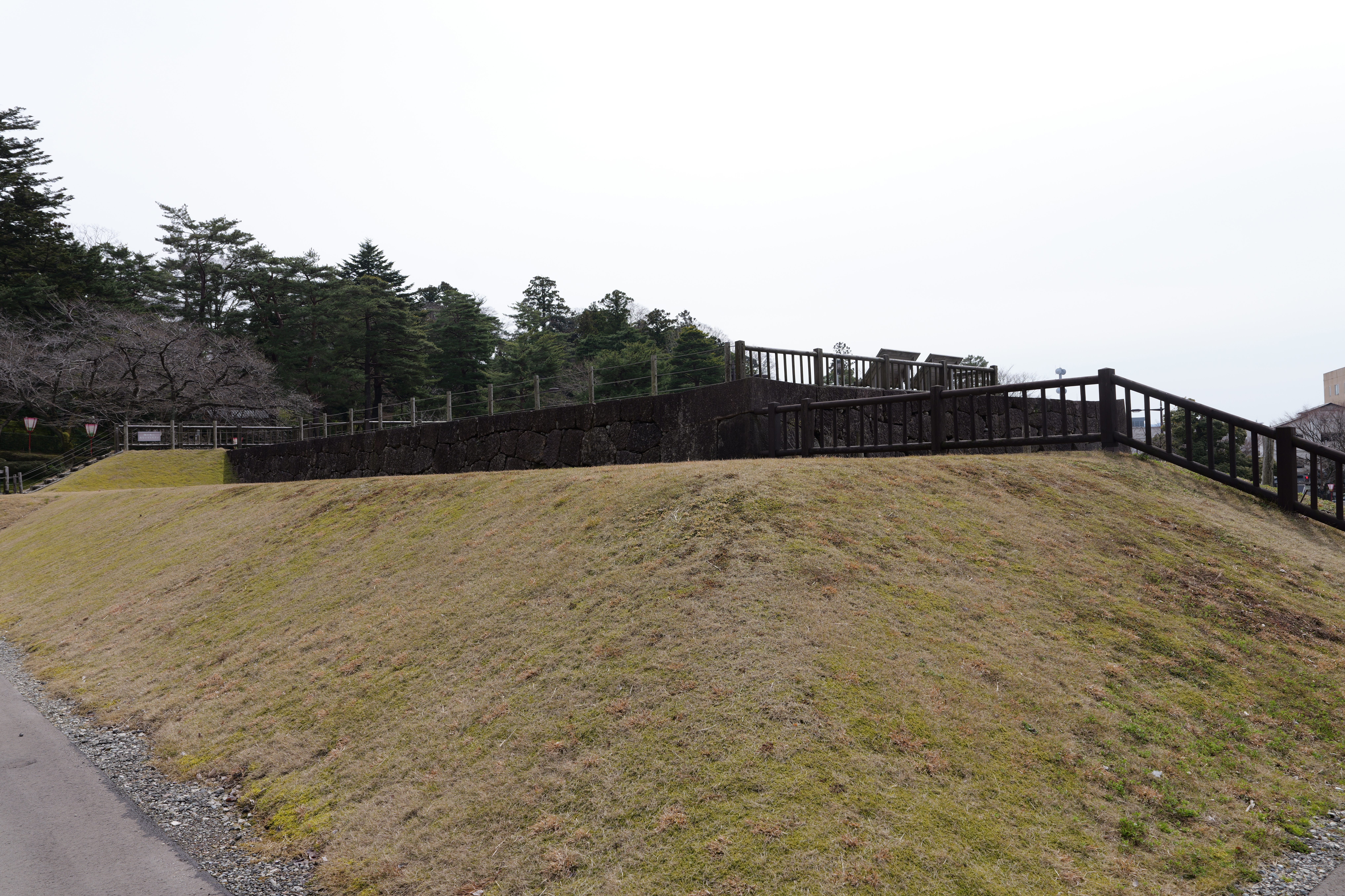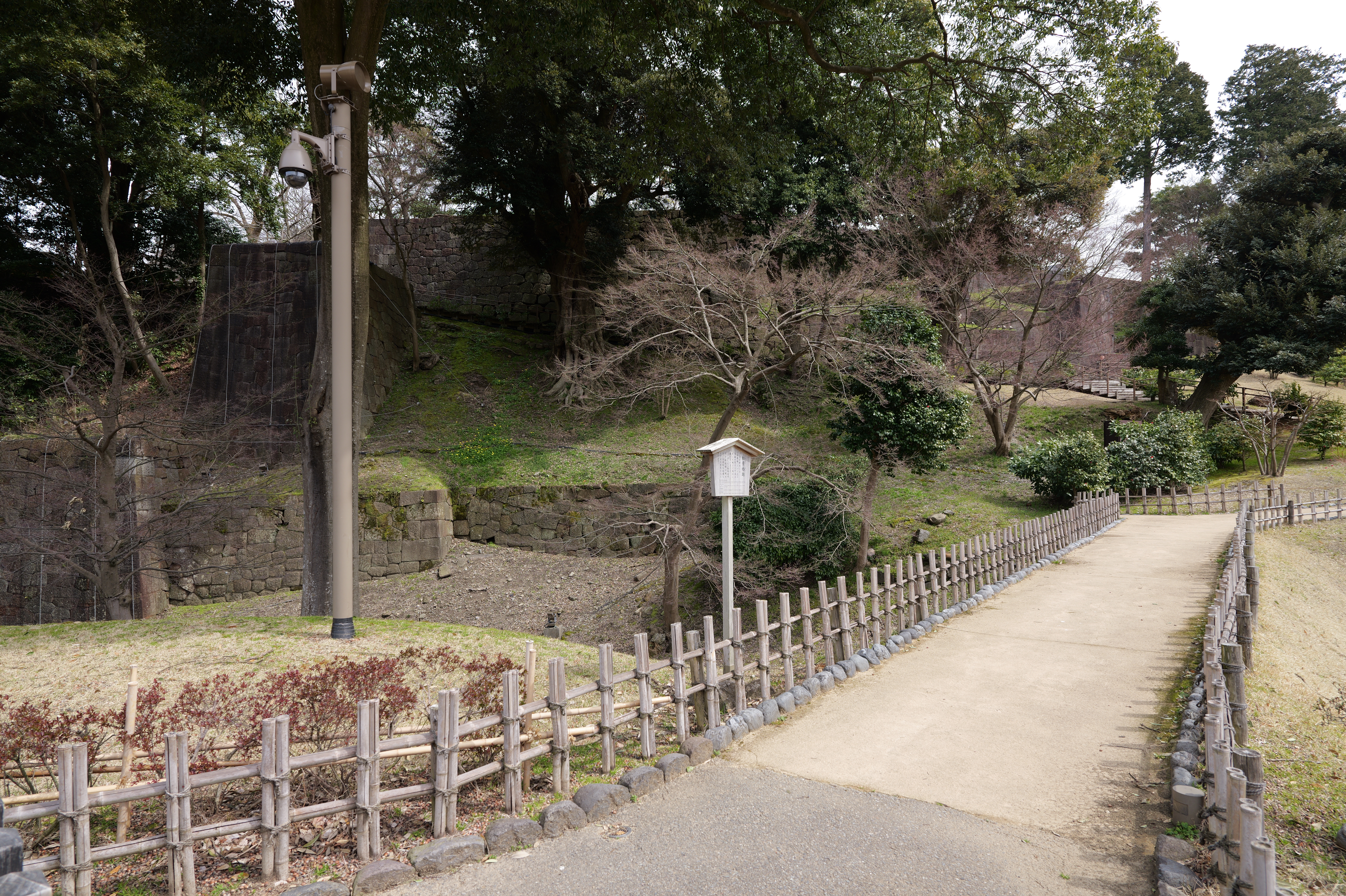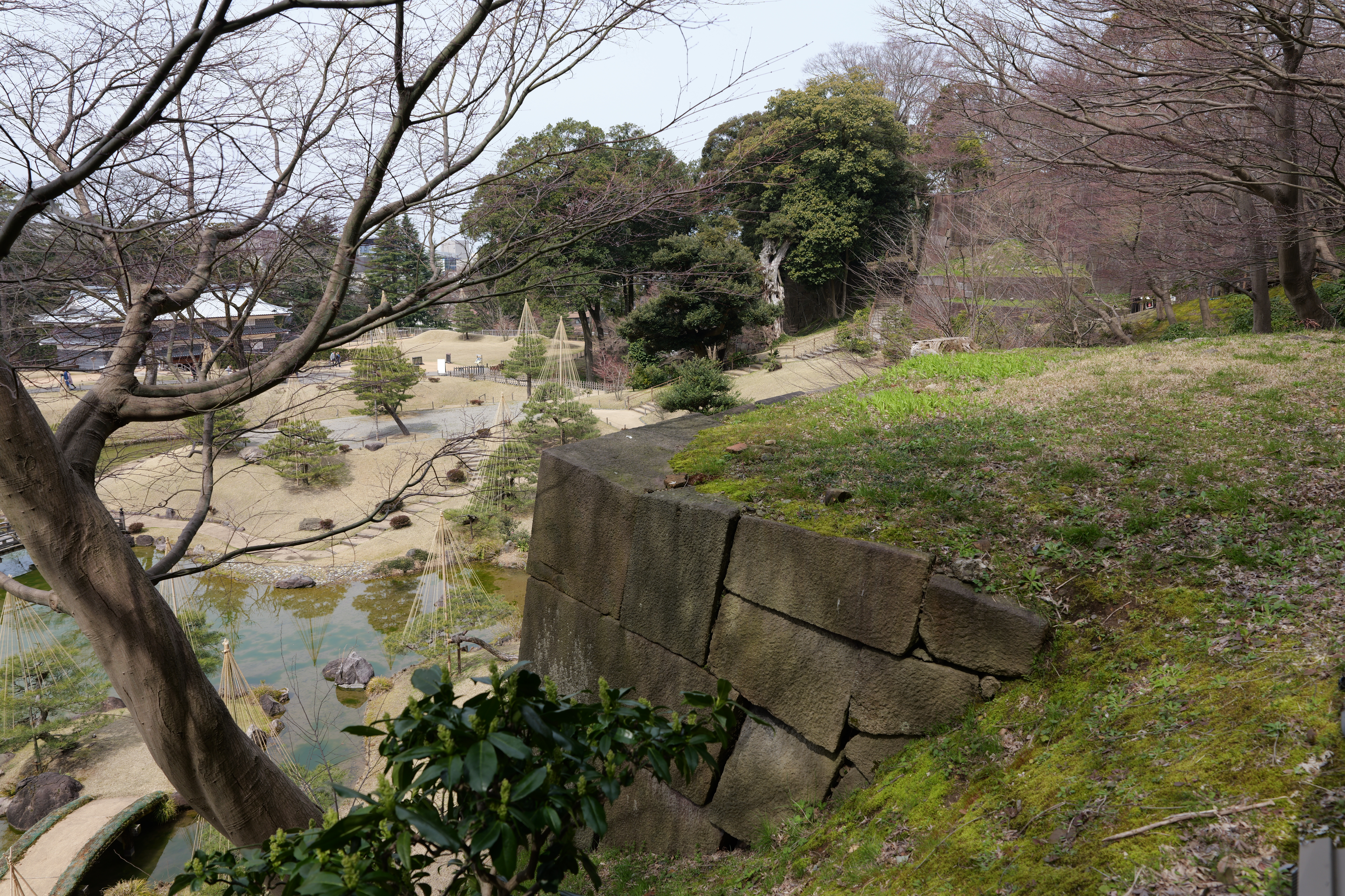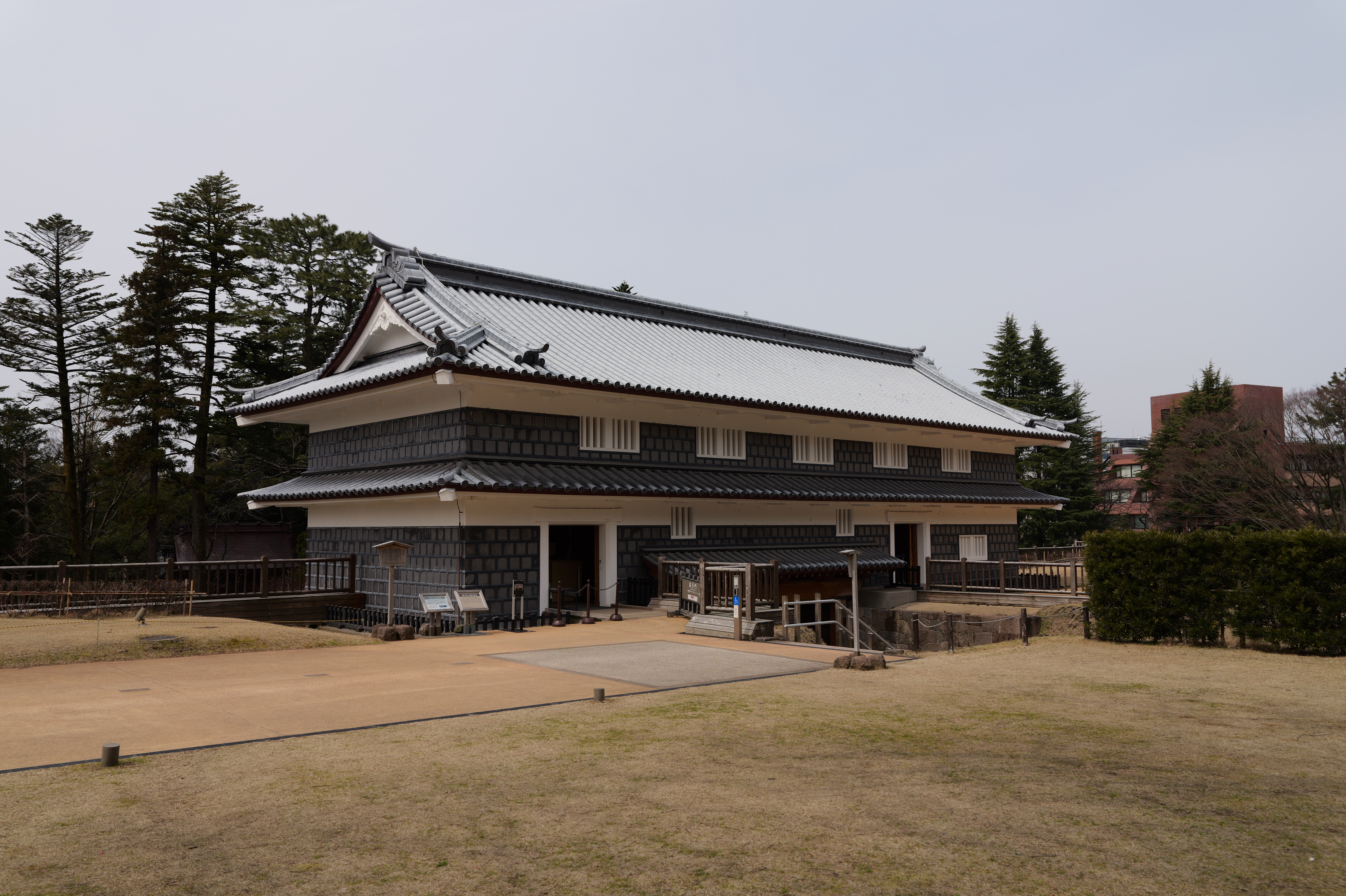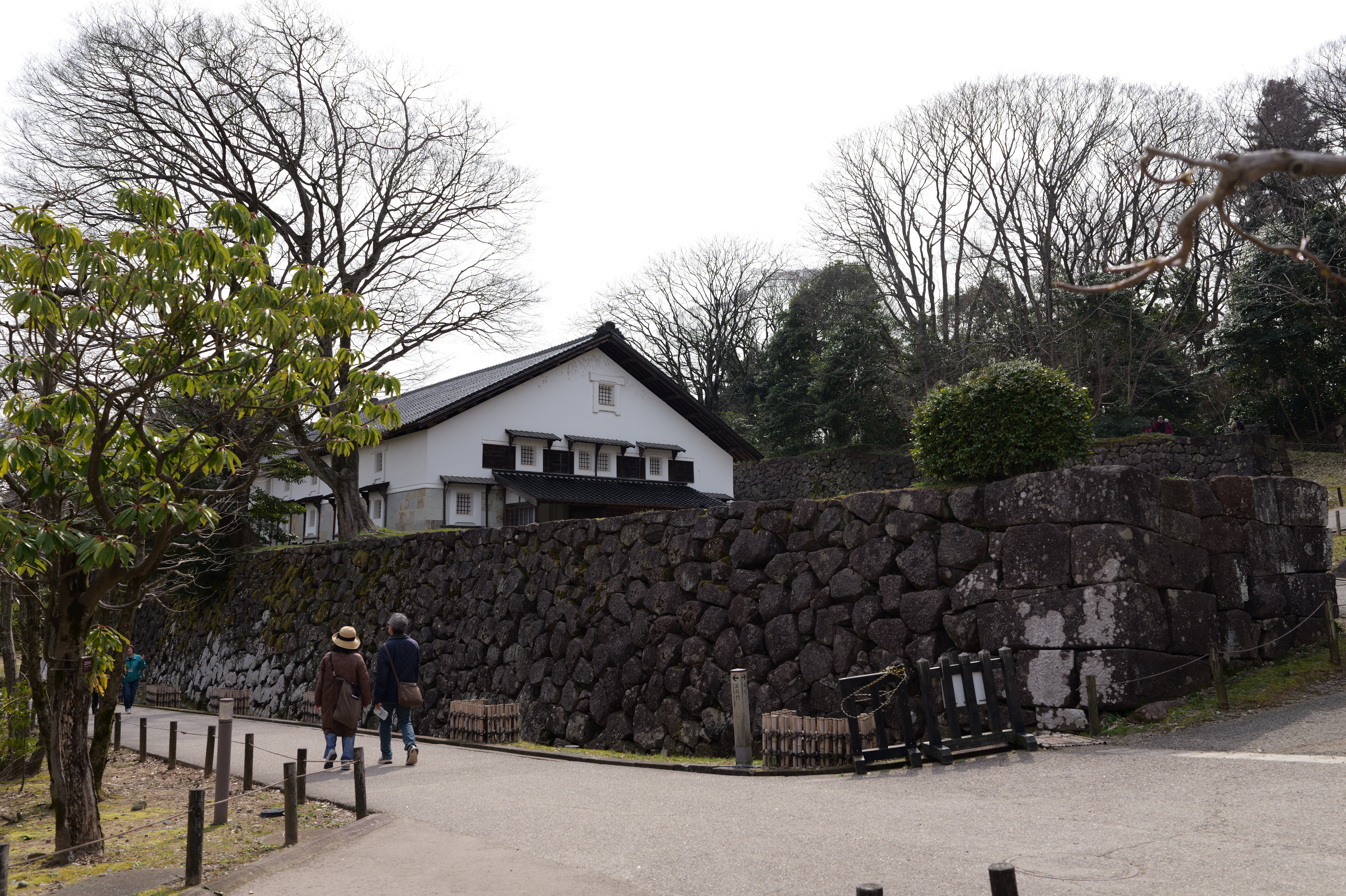 庭園の北側は松坂から紅葉橋、鼠多門へと道が続いています。鼠多門は、鼠多門橋でつながる金谷出丸(現在の尾山神社境内)からの出入口です。他の白い海鼠壁とは異なり黒い海鼠漆喰が特徴で、2020年7月復元完成しました。