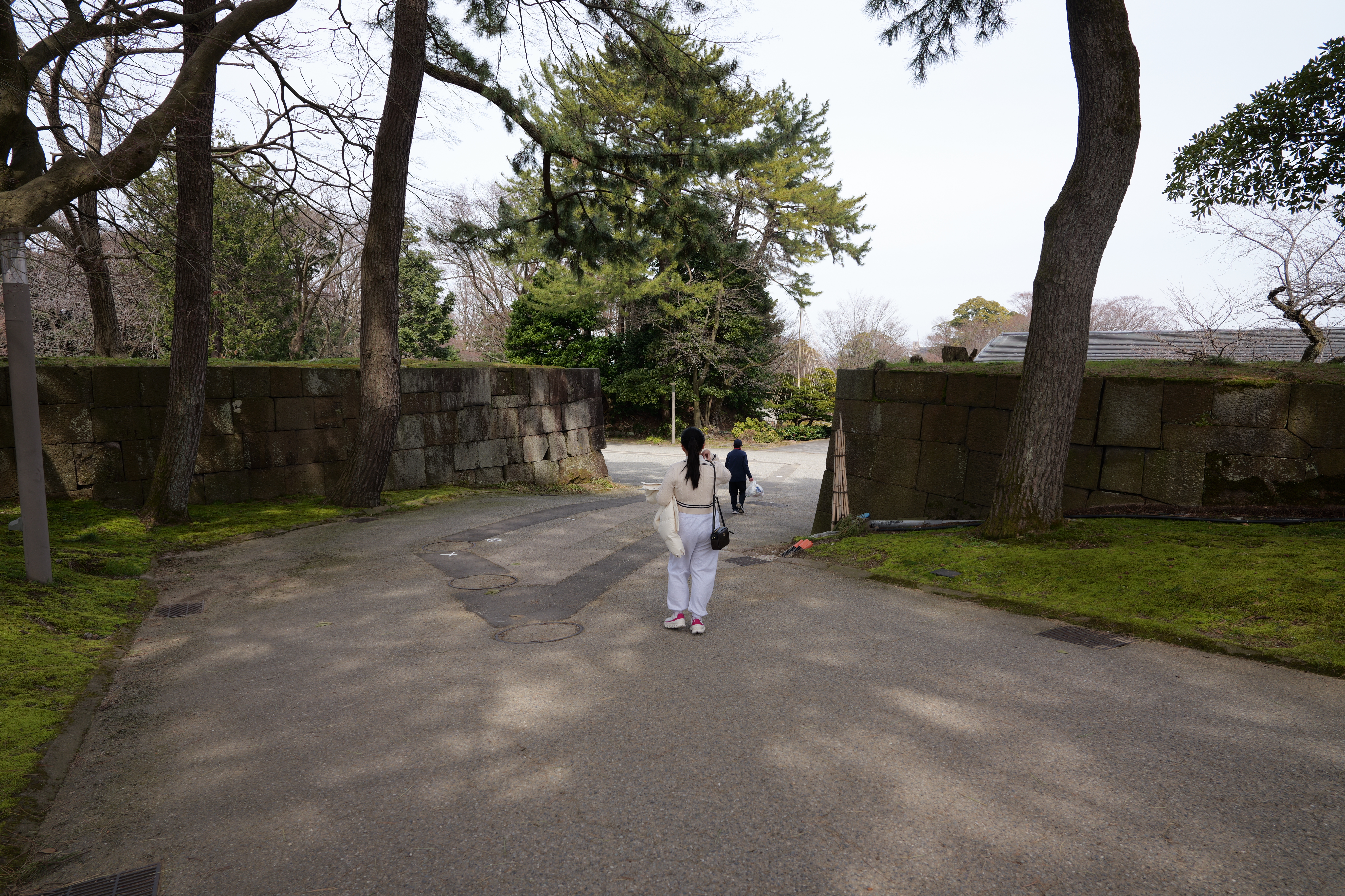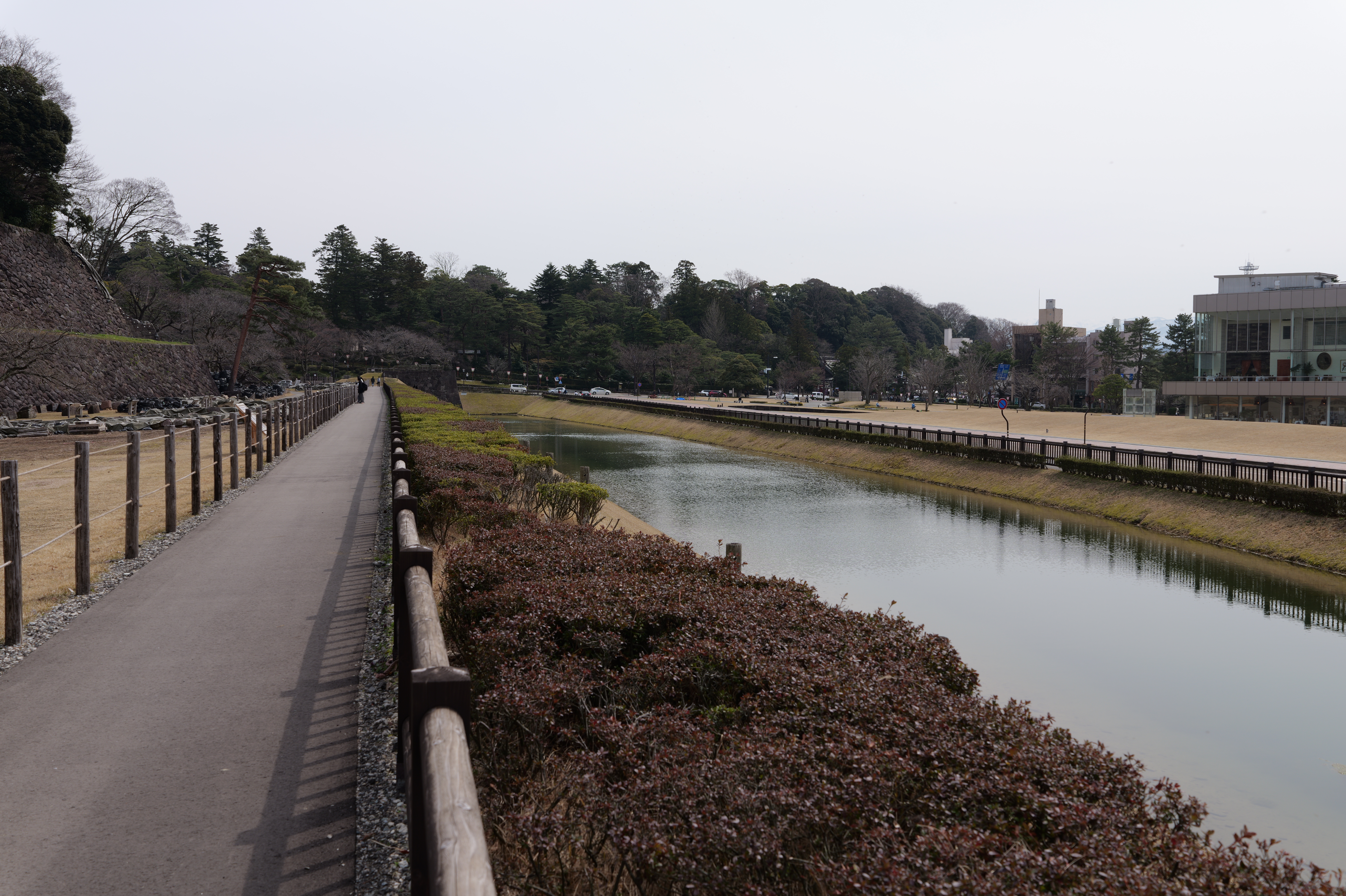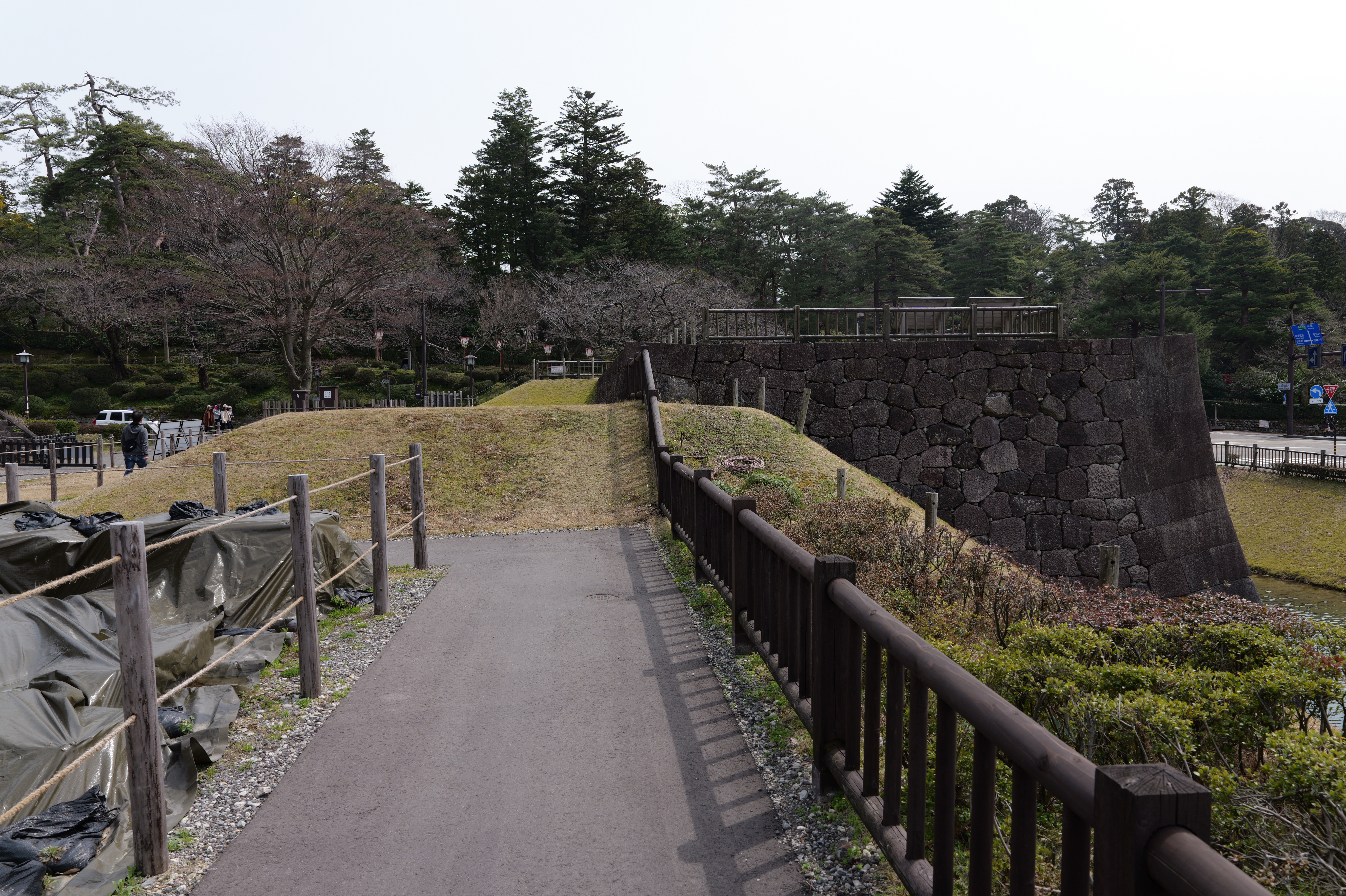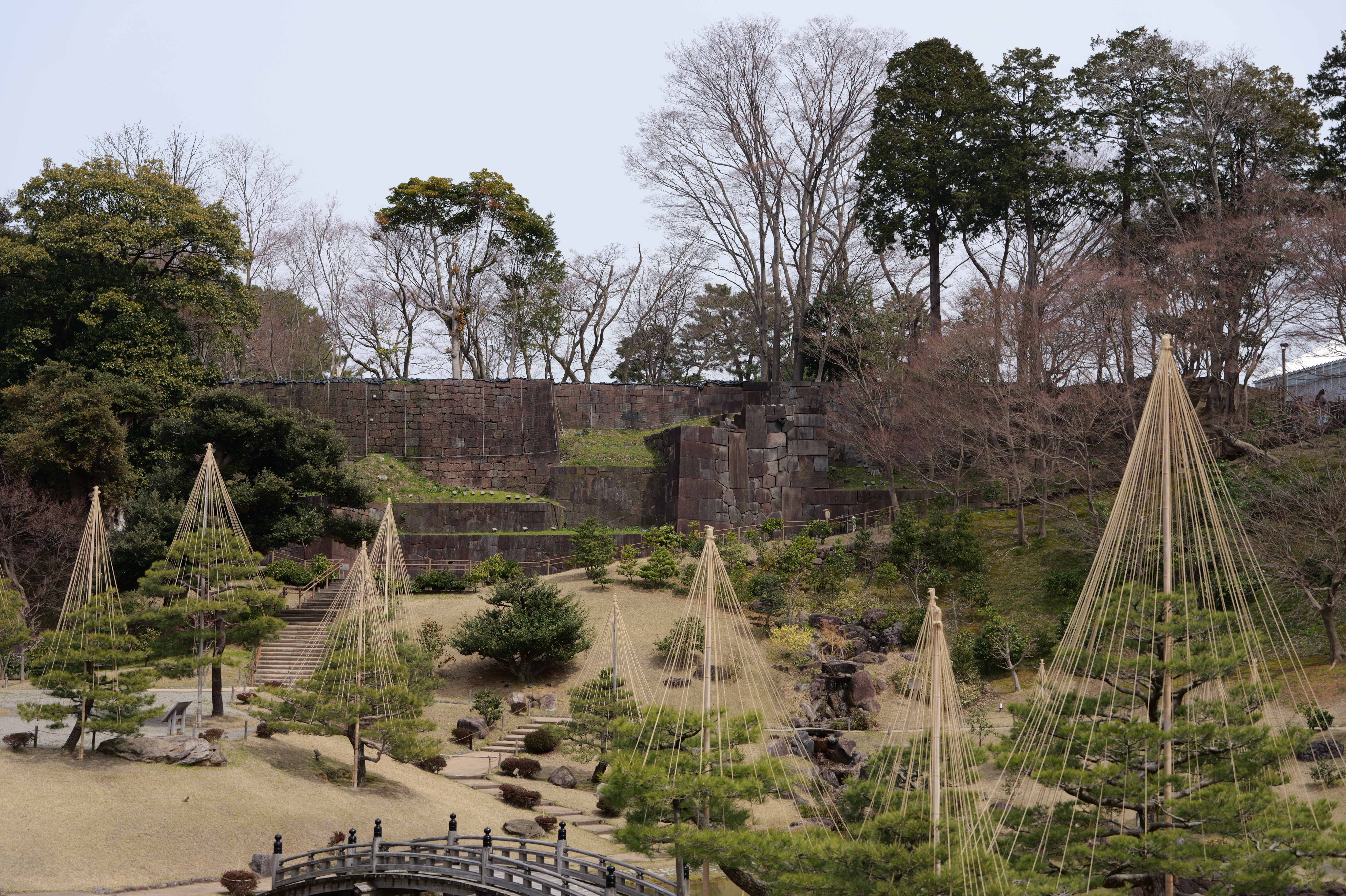 庭園の北側は松坂から紅葉橋、鼠多門へと道が続いています。鼠多門は、鼠多門橋でつながる金谷出丸(現在の尾山神社境内)からの出入口です。他の白い海鼠壁とは異なり黒い海鼠漆喰が特徴で、2020年7月復元完成しました。