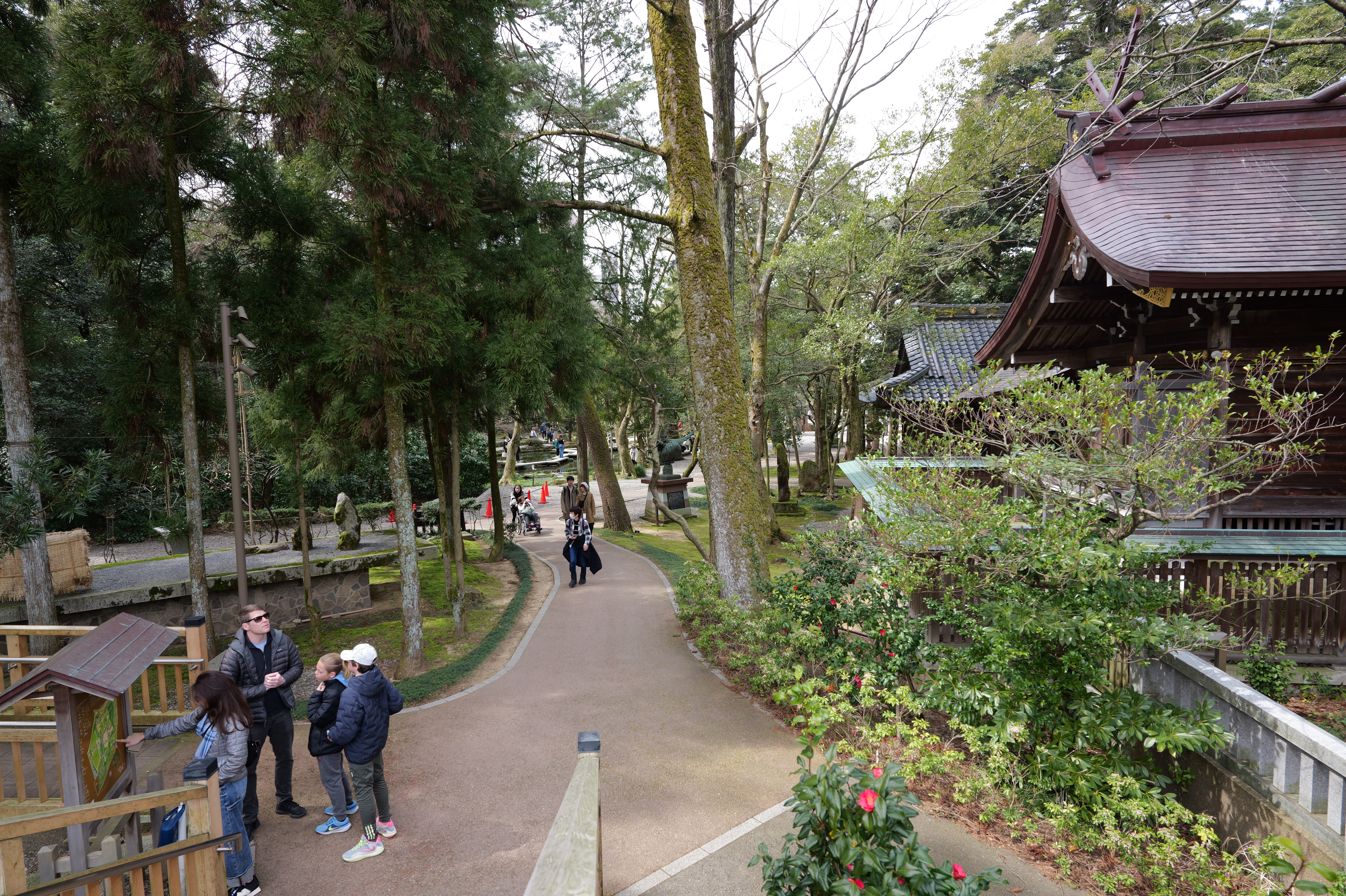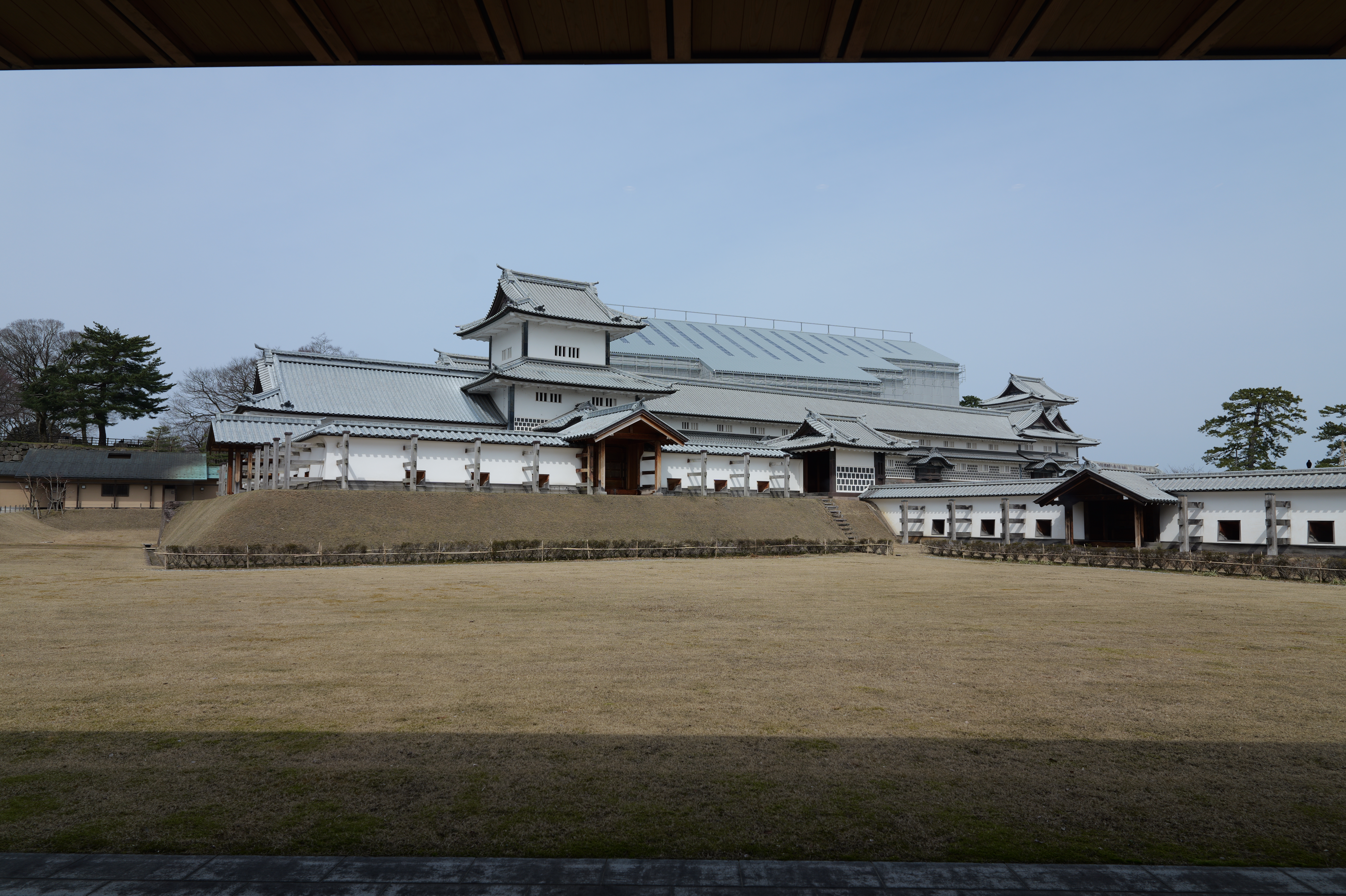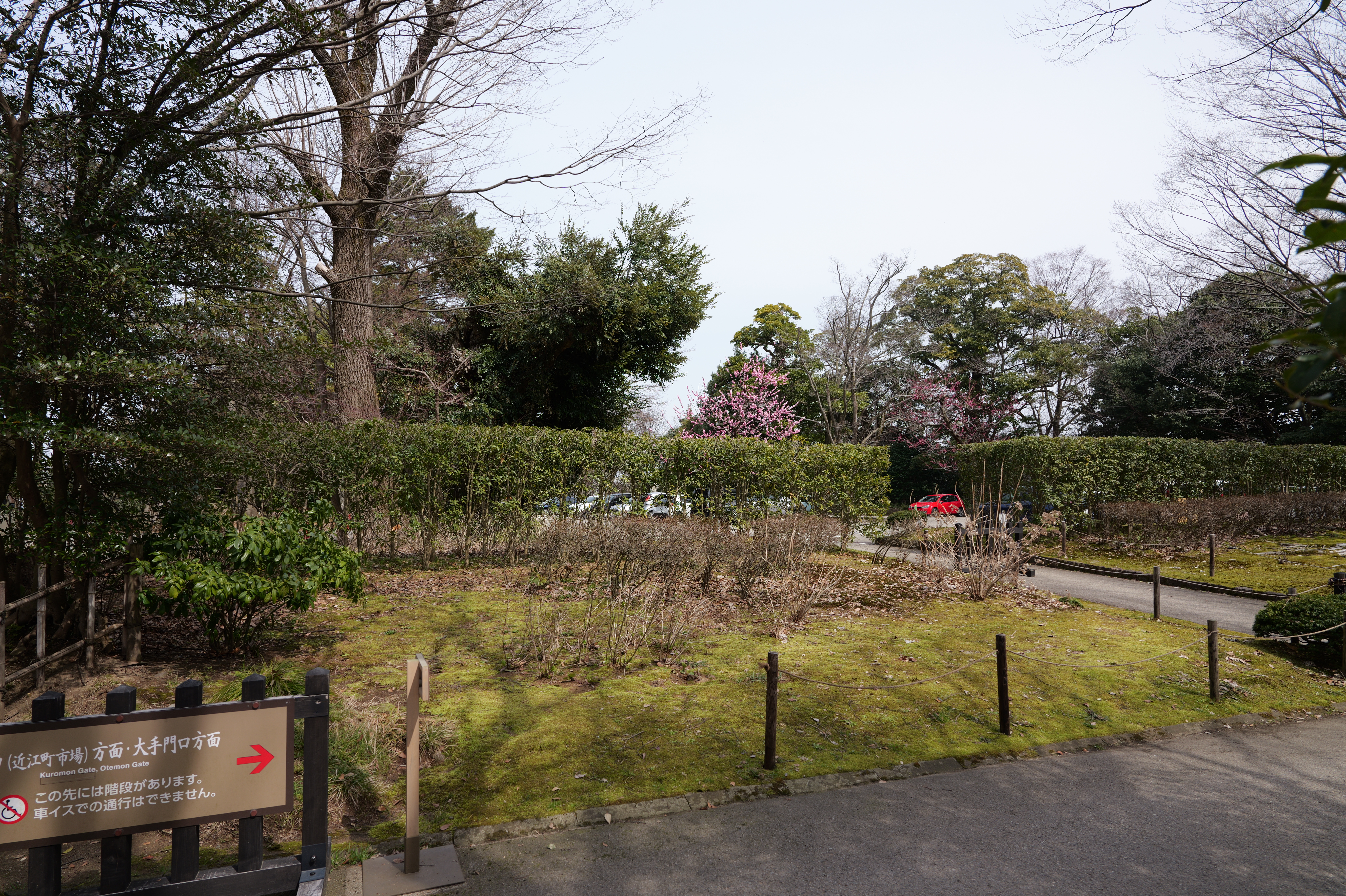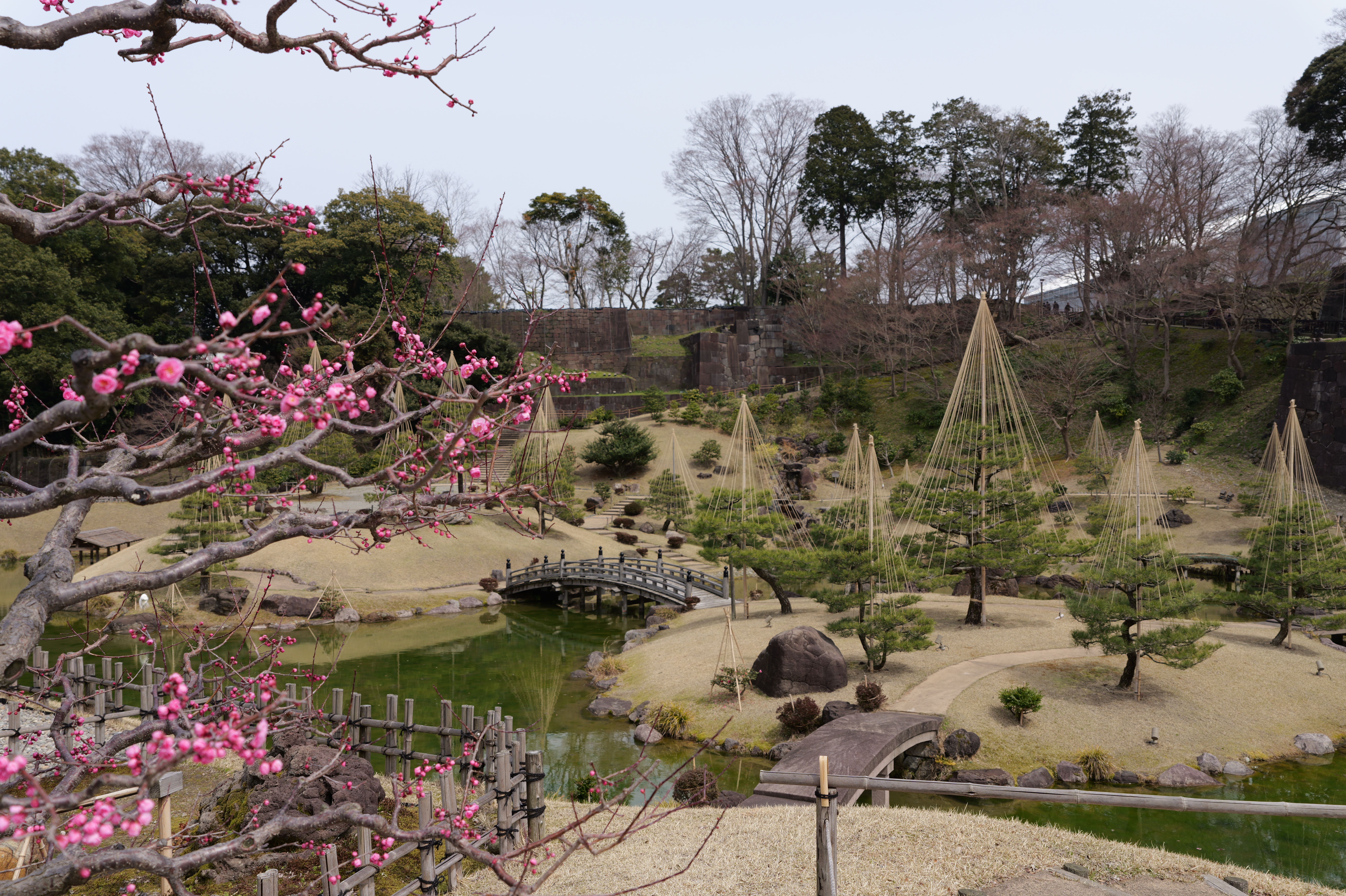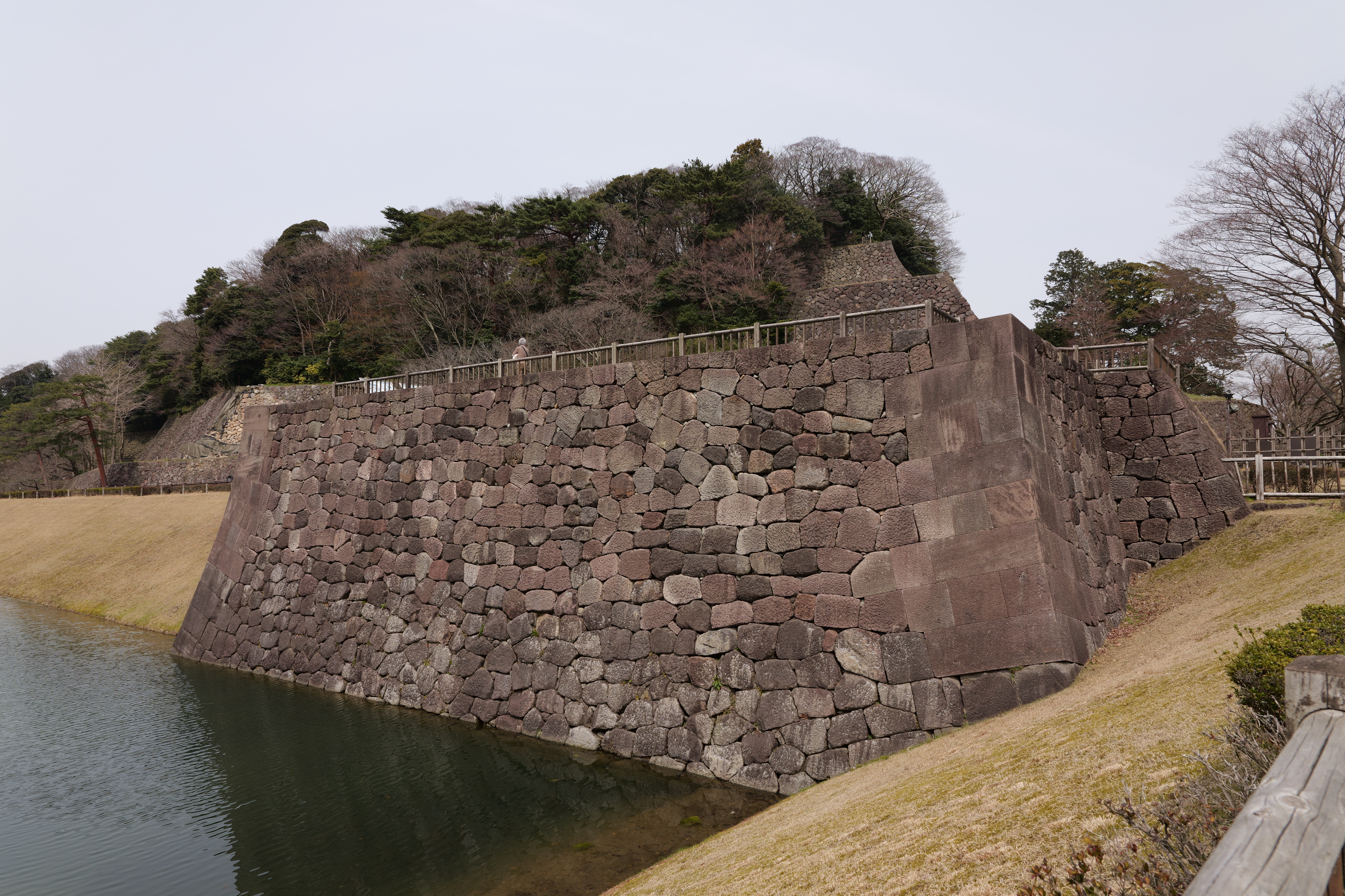 庭園の北側は松坂から紅葉橋、鼠多門へと道が続いています。鼠多門は、鼠多門橋でつながる金谷出丸(現在の尾山神社境内)からの出入口です。他の白い海鼠壁とは異なり黒い海鼠漆喰が特徴で、2020年7月復元完成しました。