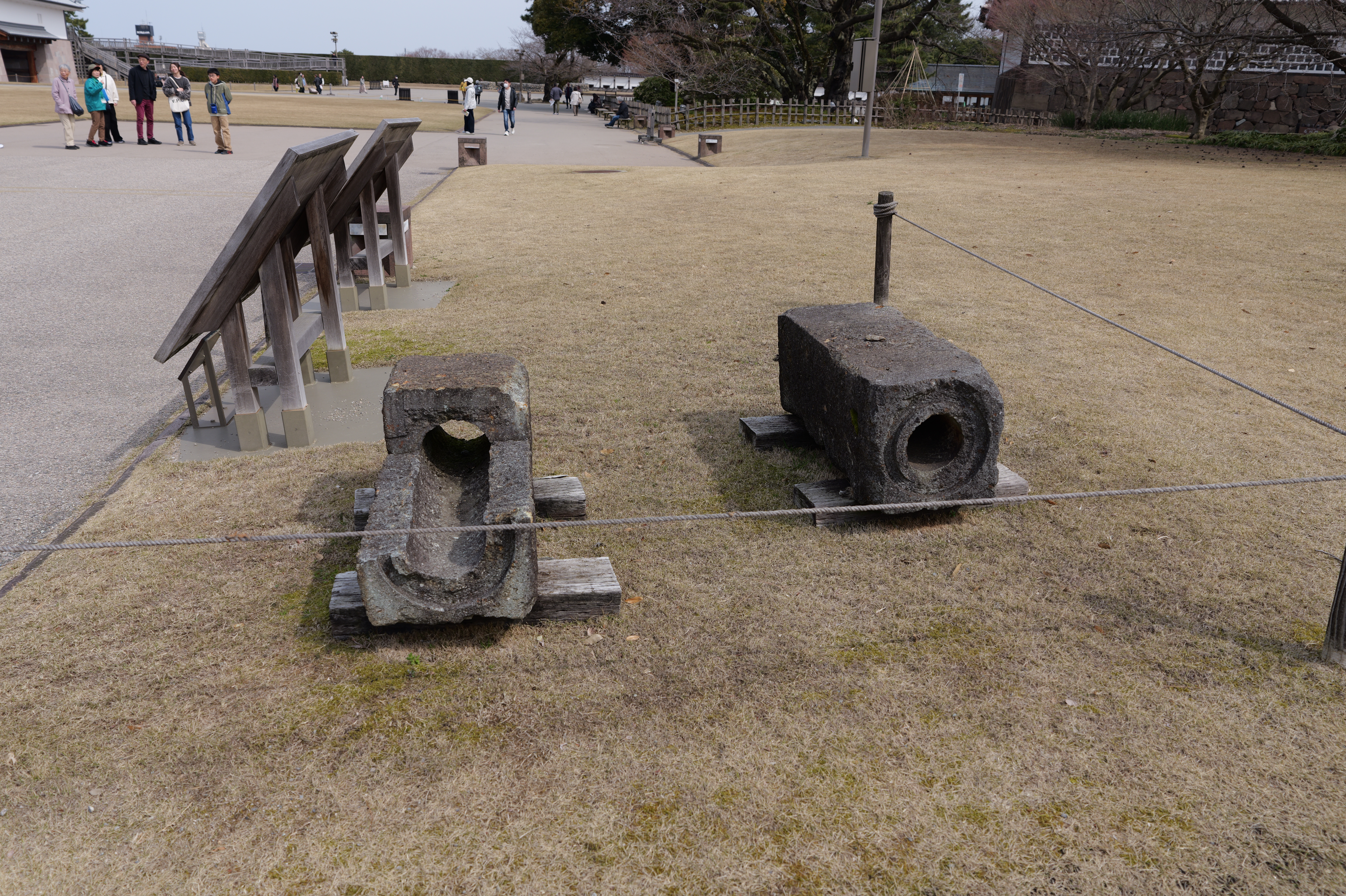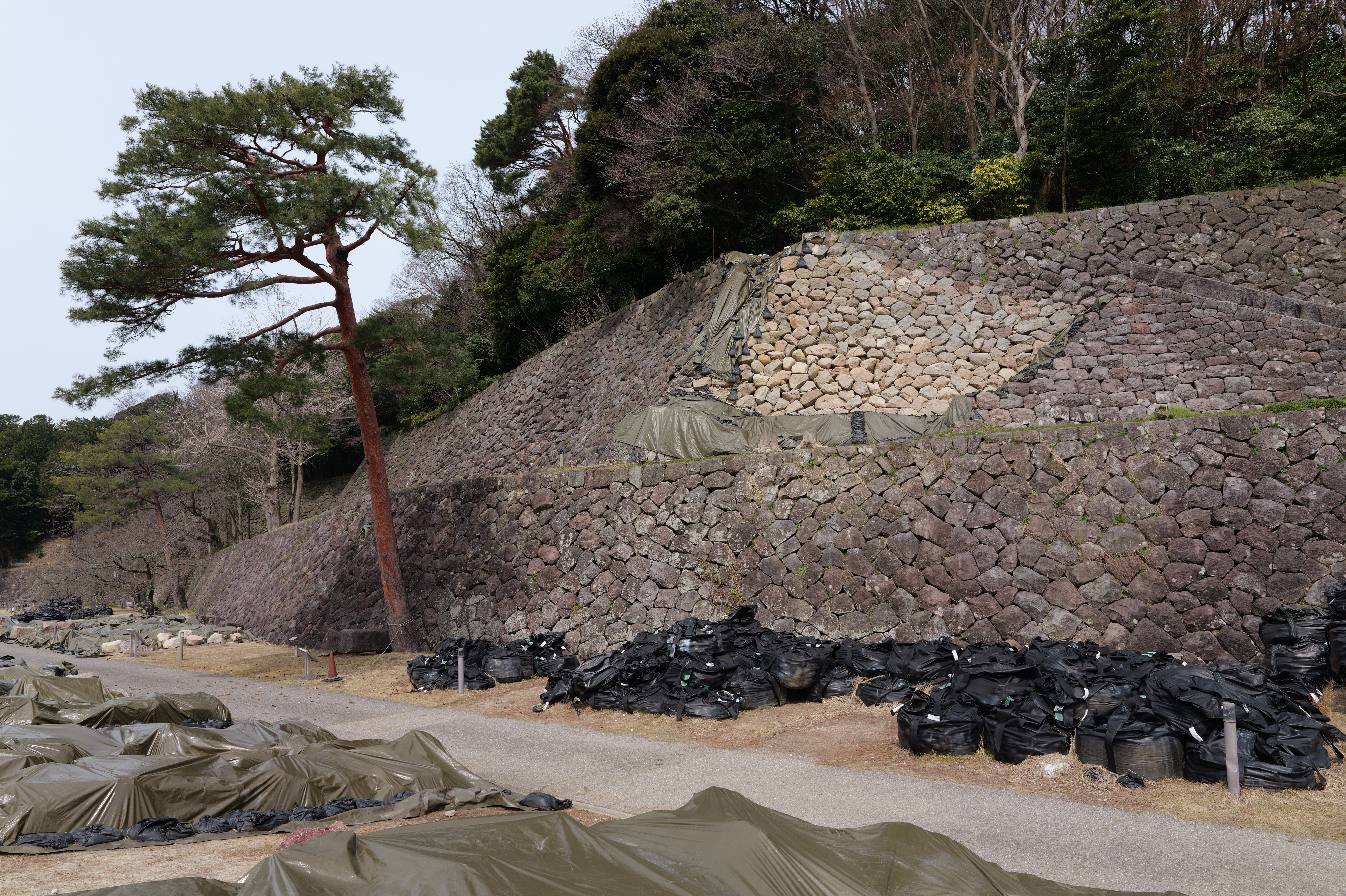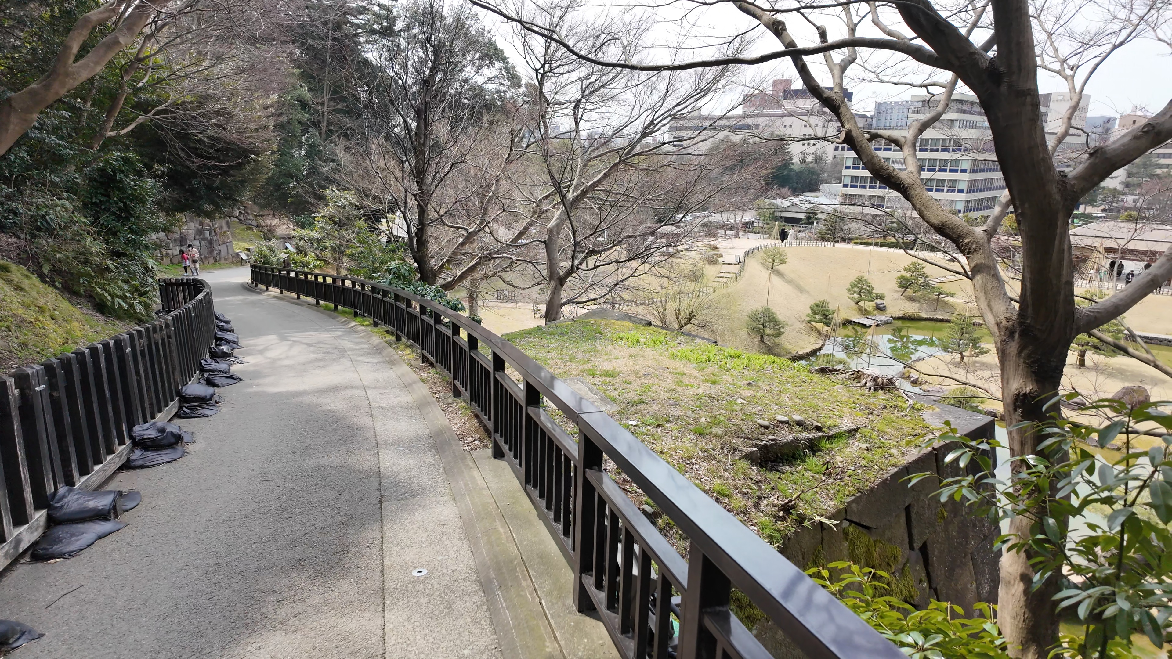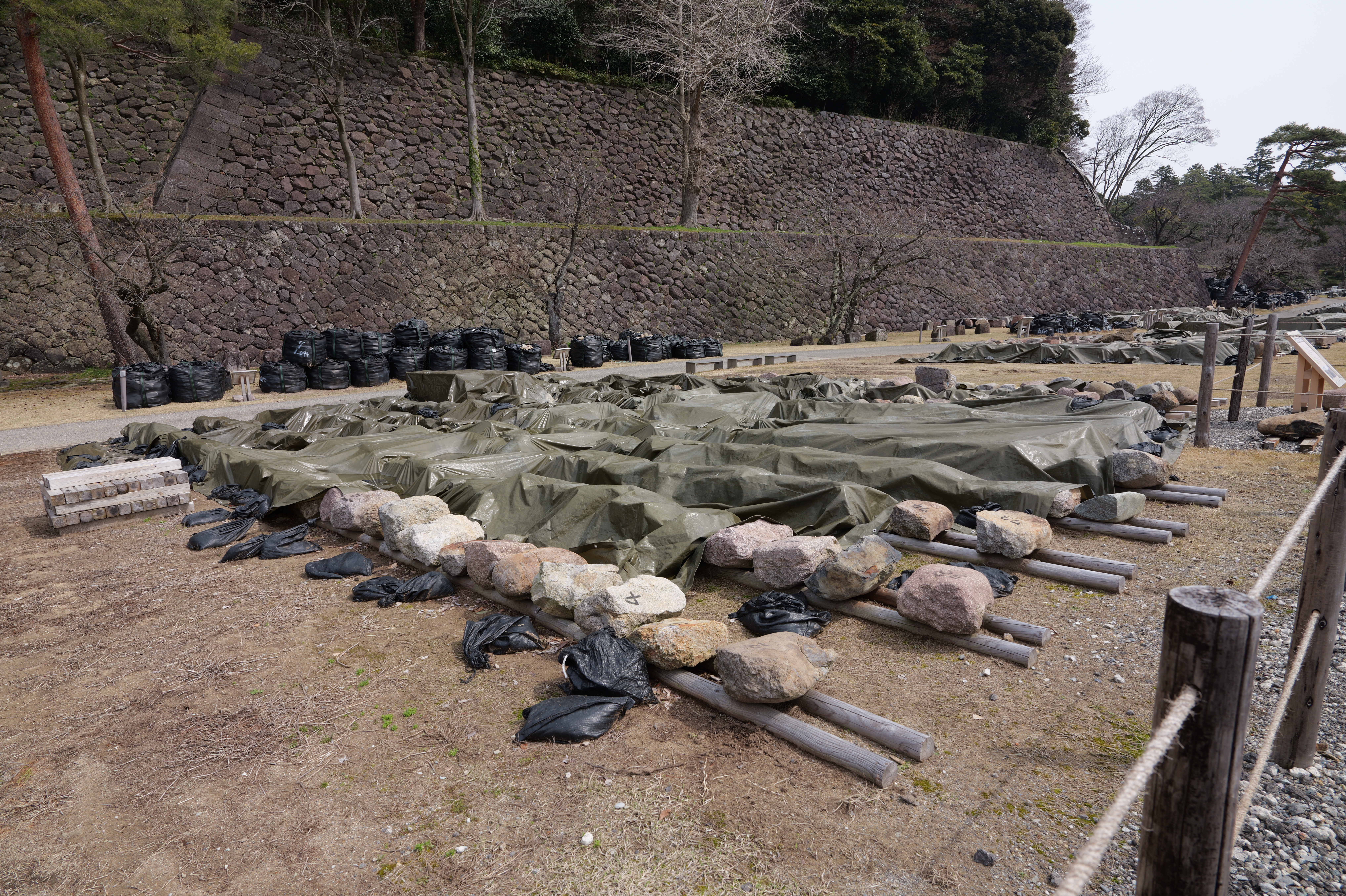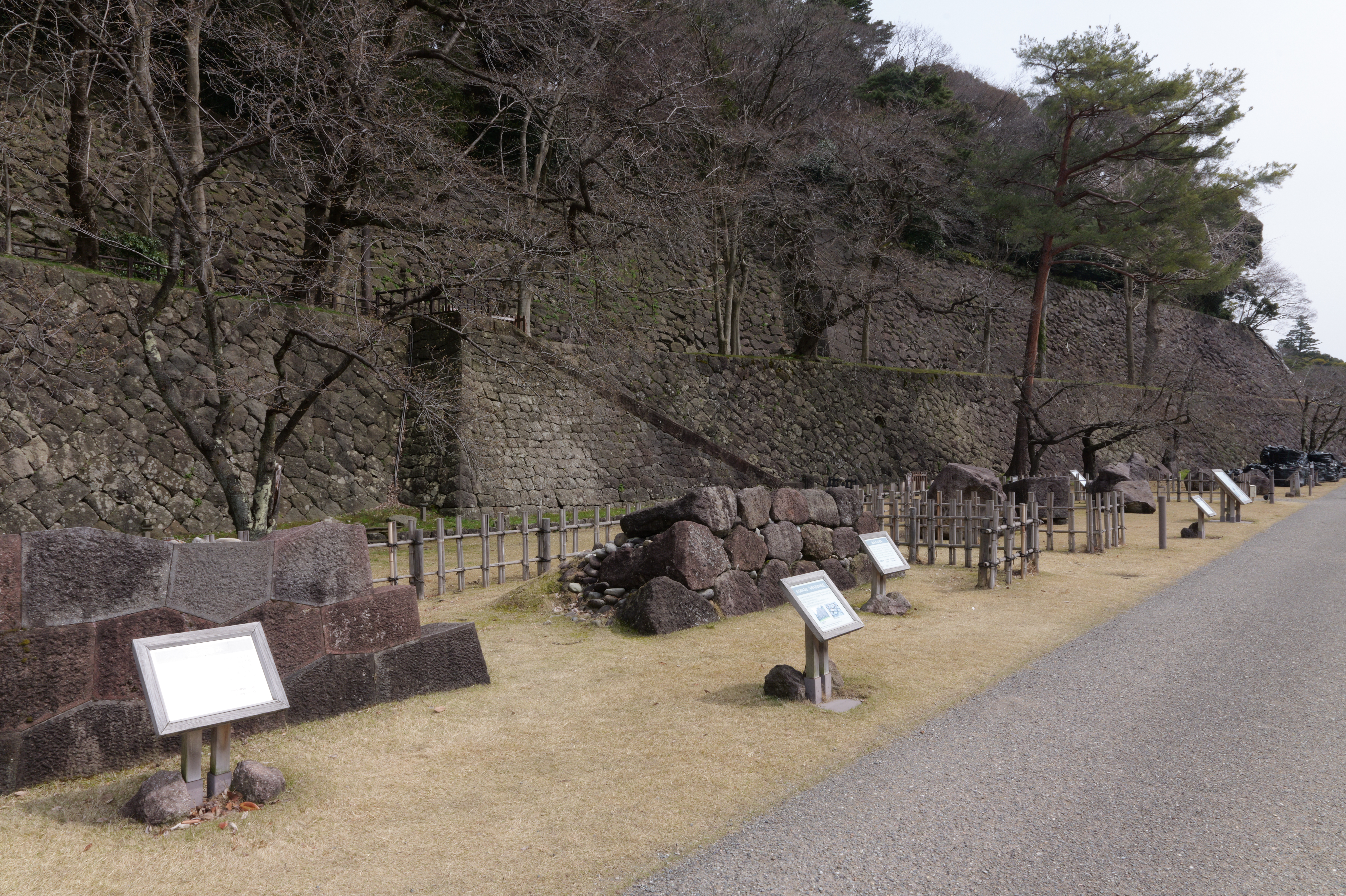 玉泉院丸を出て道なりに南東へ進むと稲荷屋敷跡、御花畑跡と続きます。御花畑跡はいもり堀園地として整備され、いもり堀が鯉喉櫓台まで続いています。また能登半島地震で被災した石垣の石材が展示されていて、ここからは実際に被災した本丸南石垣が見えます。