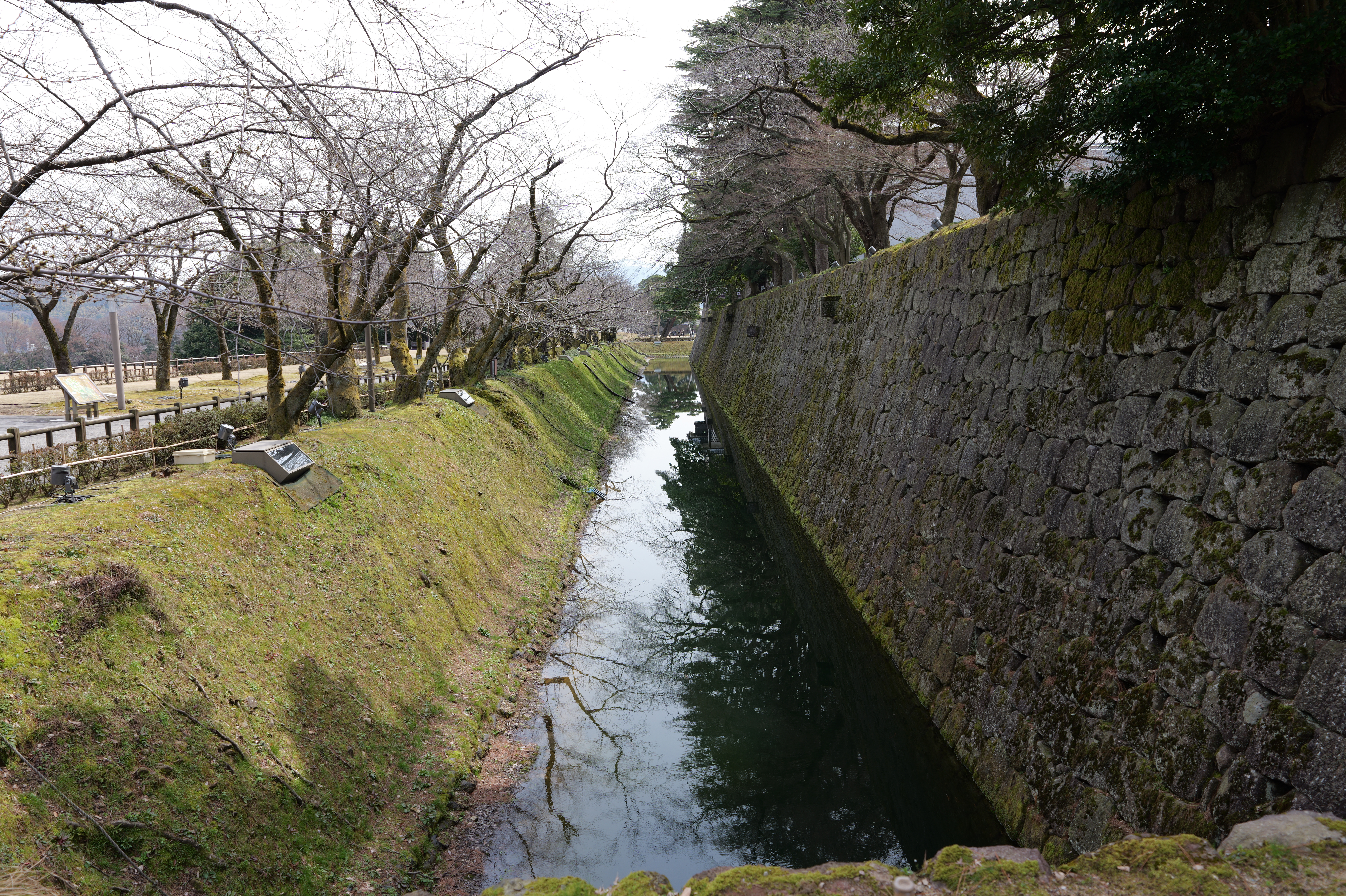 大手堀に沿って歩いていくと黒門跡で、金沢御堂、佐久間時代の大手です。ここから再度新丸に入ります。湿生園の護岸は往時の新丸南堀の外郭を再現しています。