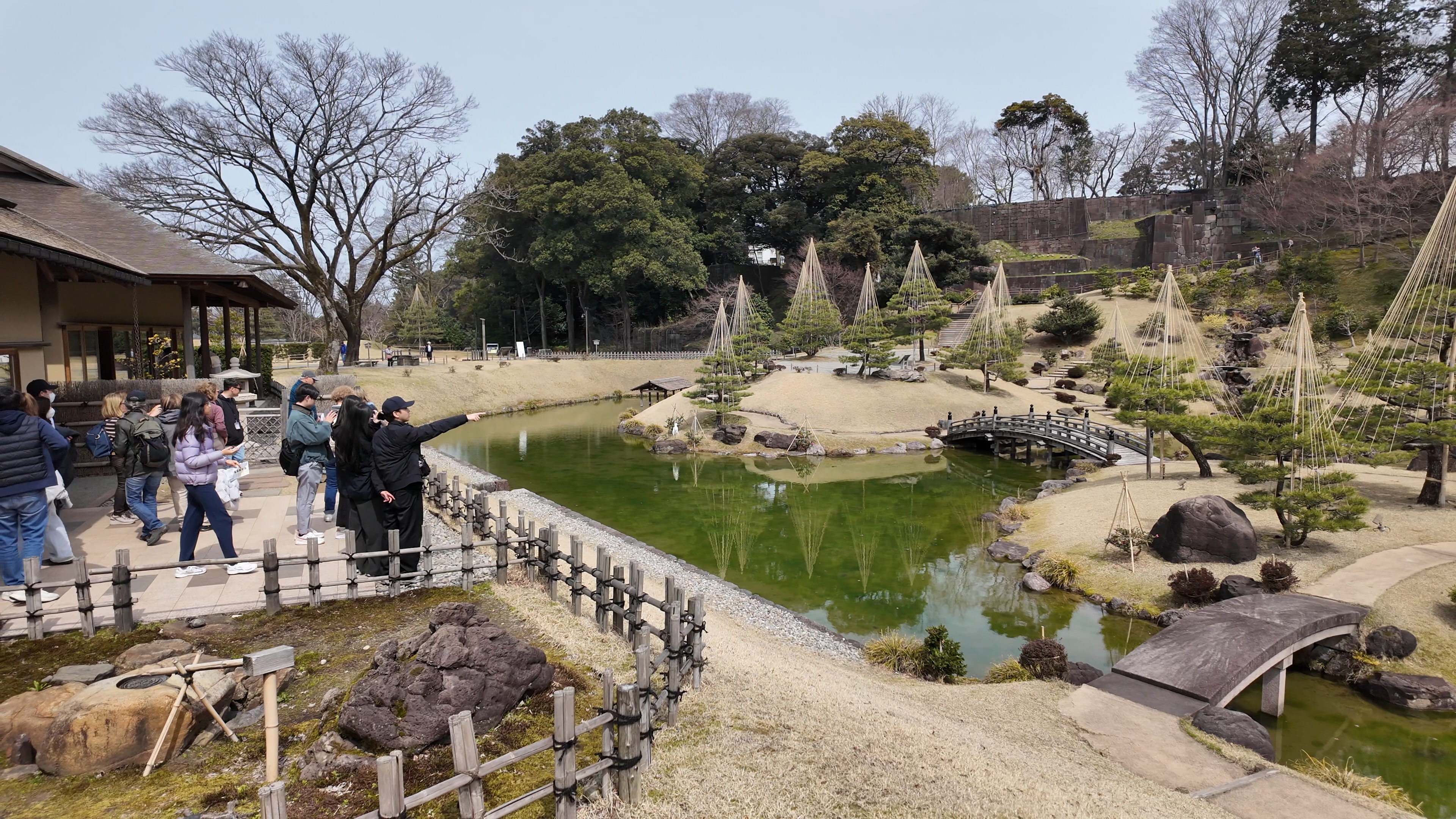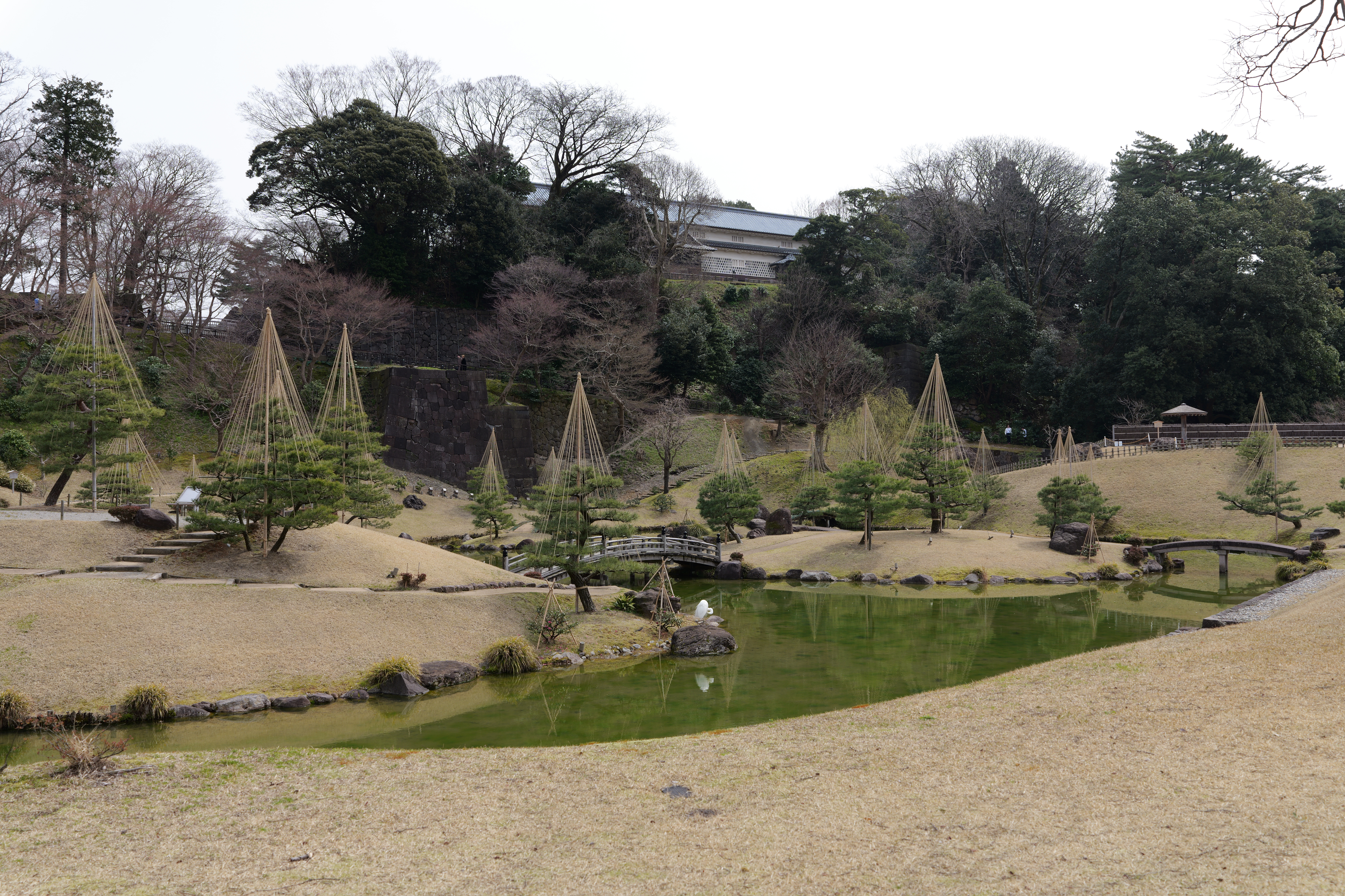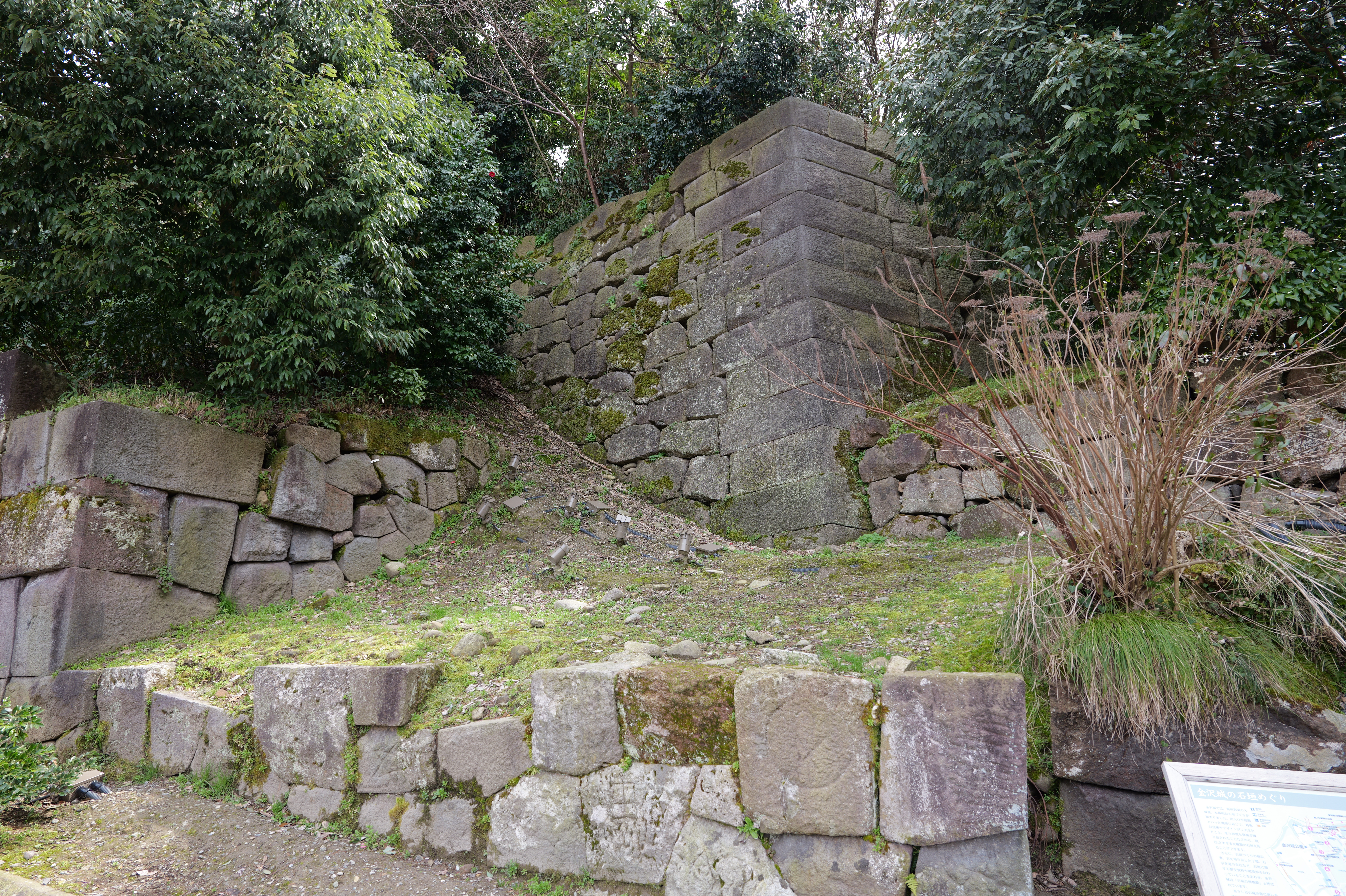 いもり坂を下りて右に折れると玉泉院丸で、玉泉院丸庭園があります。利長の正室玉泉院(永姫)が屋敷を構えたことがその名の由来です。庭園は三代目藩主利常が庭作を始め廃藩時まであった池泉回遊式の大名庭園で、2015年3月、江戸時代末期の姿をもとに再現されました。滝と一体となった色紙短冊積石垣など、石垣群が庭園の特徴となっています。