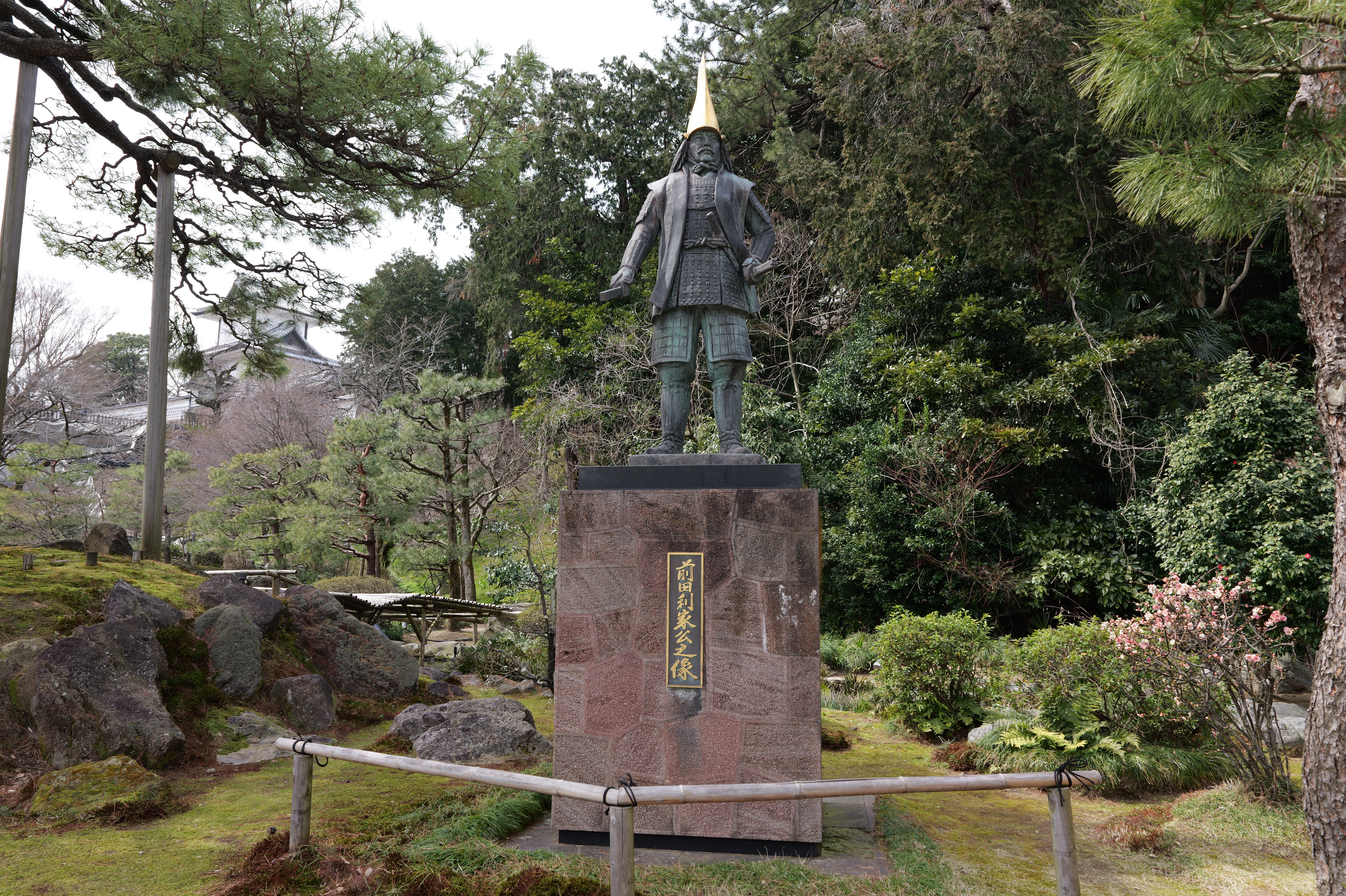 さてここから百間堀跡を石川門の方へ戻っていきます。すぐに車橋門跡の説明板がありますが、なんとなくこの辺?程度にしか分かりませんでした。東の丸東面石垣をすぎ、三の丸東面石垣、その先が石川門です。石川橋をくぐってすぐ左側に前田利家像がありました。このルートで帰ってこないと見逃すところでした。