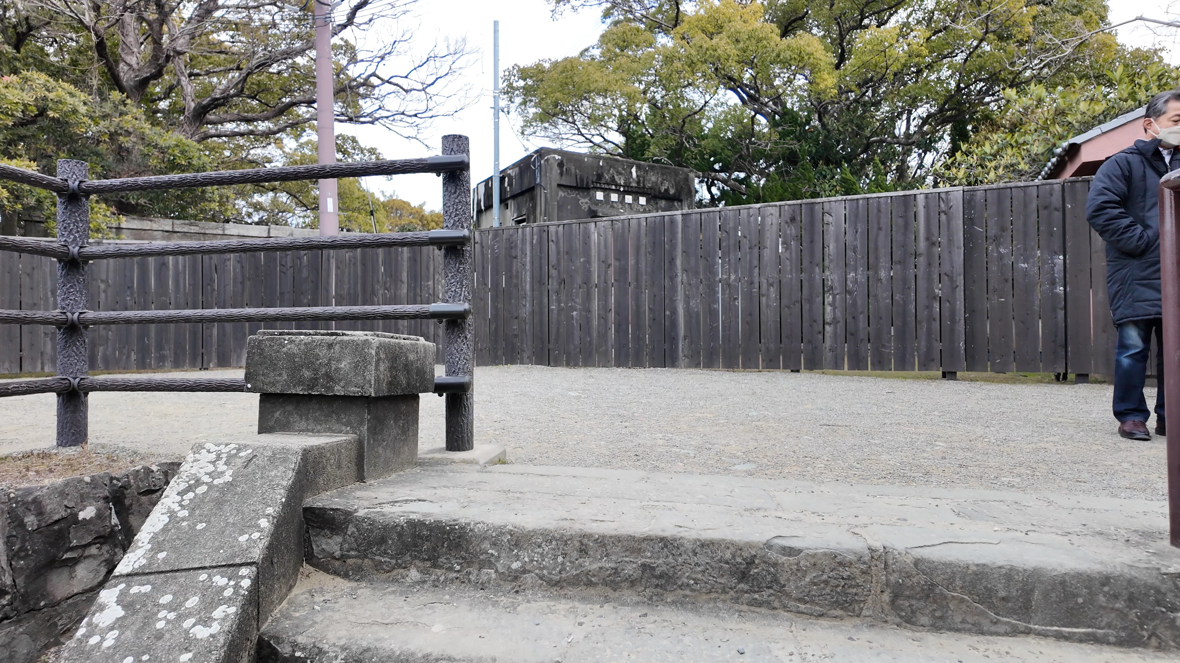 石段のところに中門跡、石段を登った正面に本丸御殿跡、後ろ側は天守曲輪でその入口は天守一の門跡です。正面階段を登ると本丸御殿跡で天守の写真スポット。本丸御殿跡で入れるのはこのスポット付近のみで、中心部は塀で囲まれています。