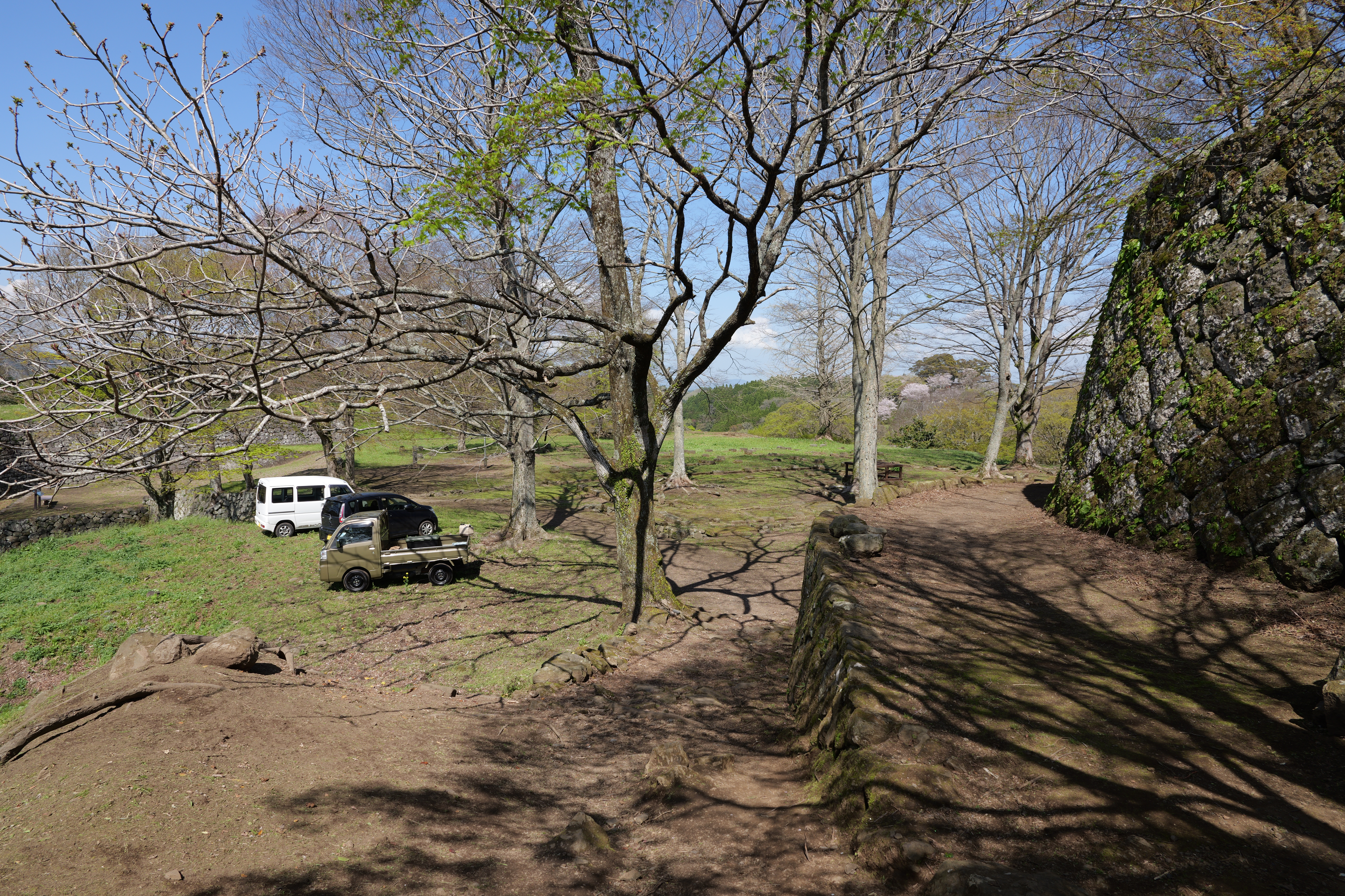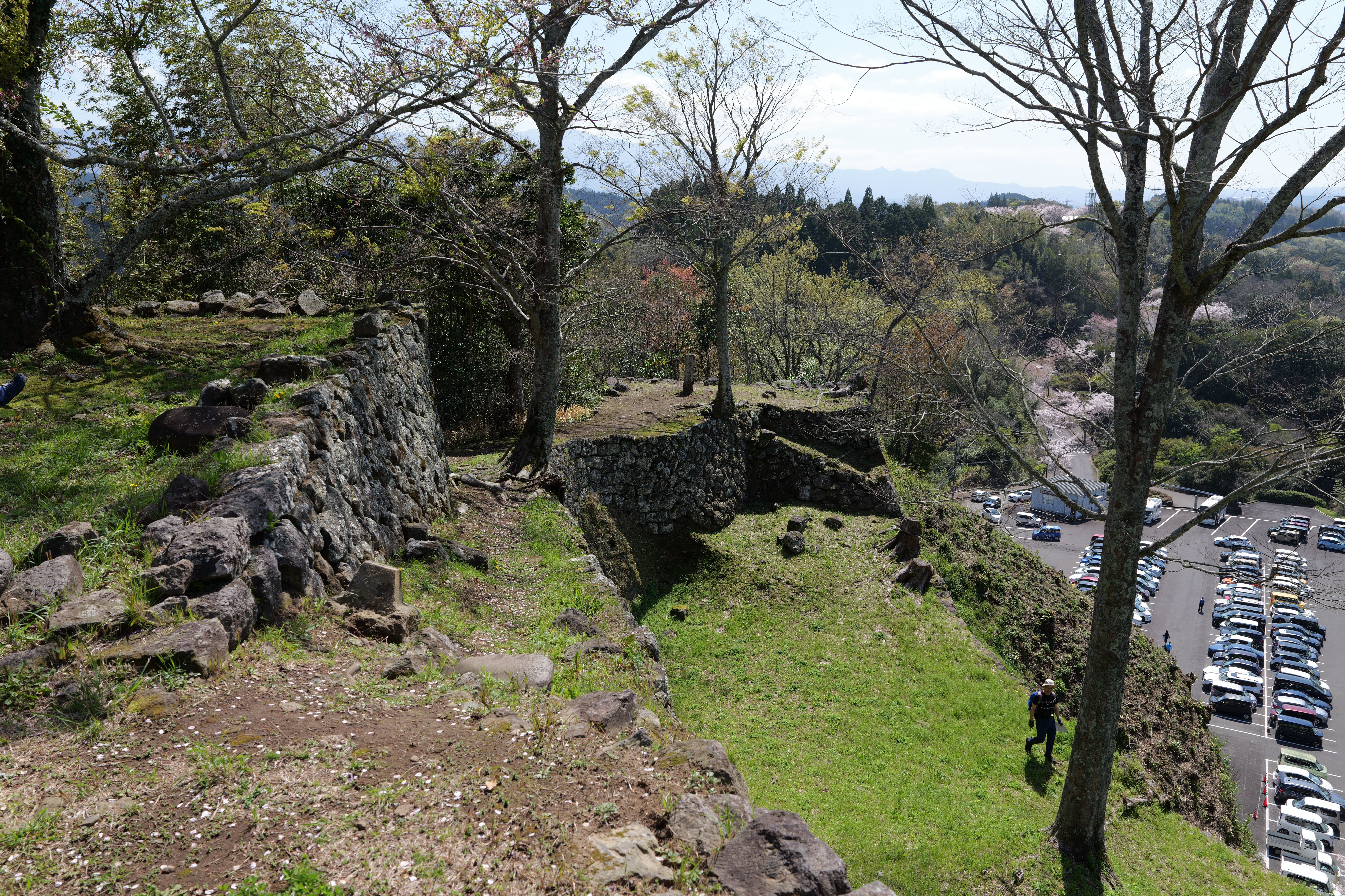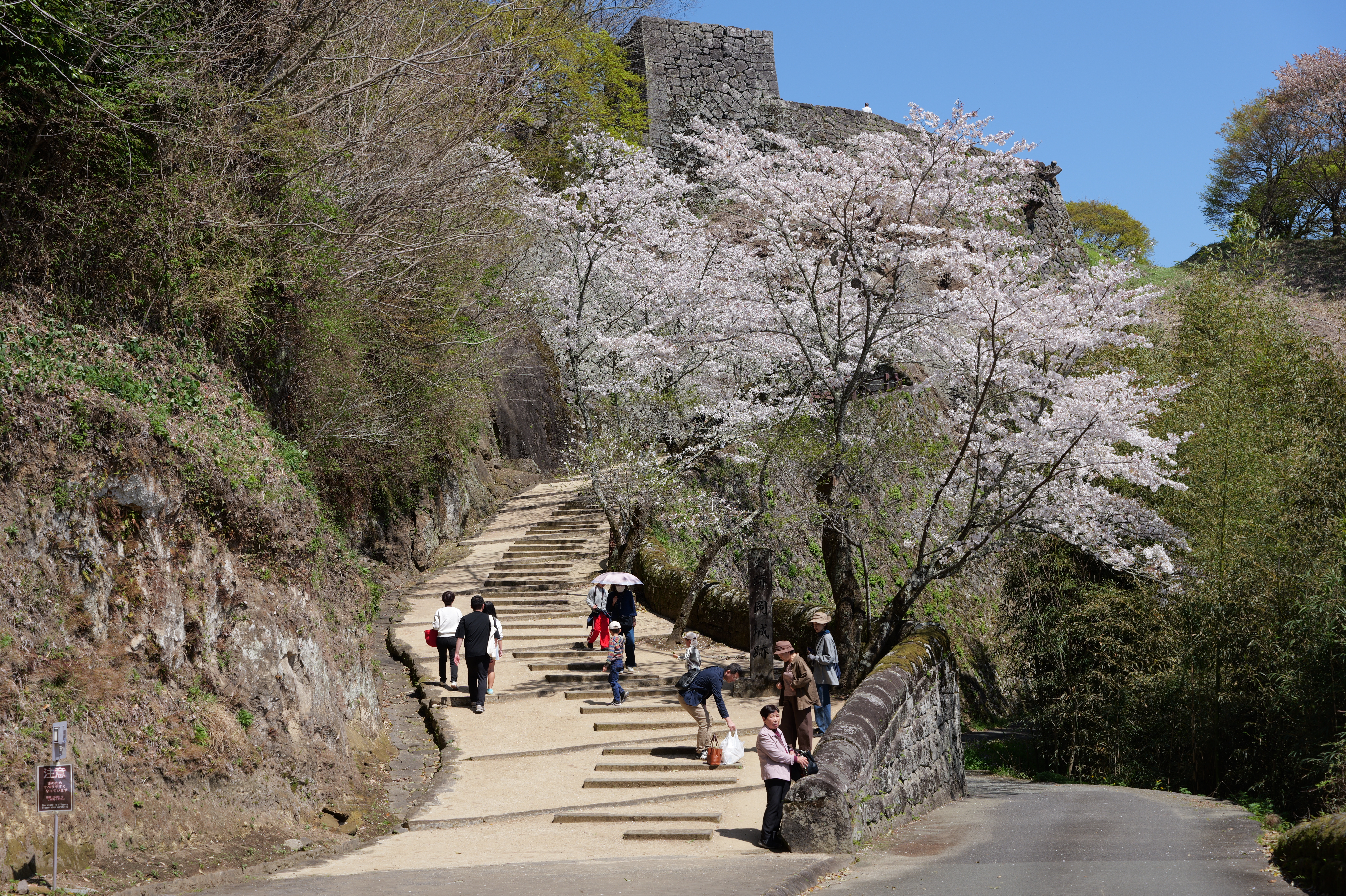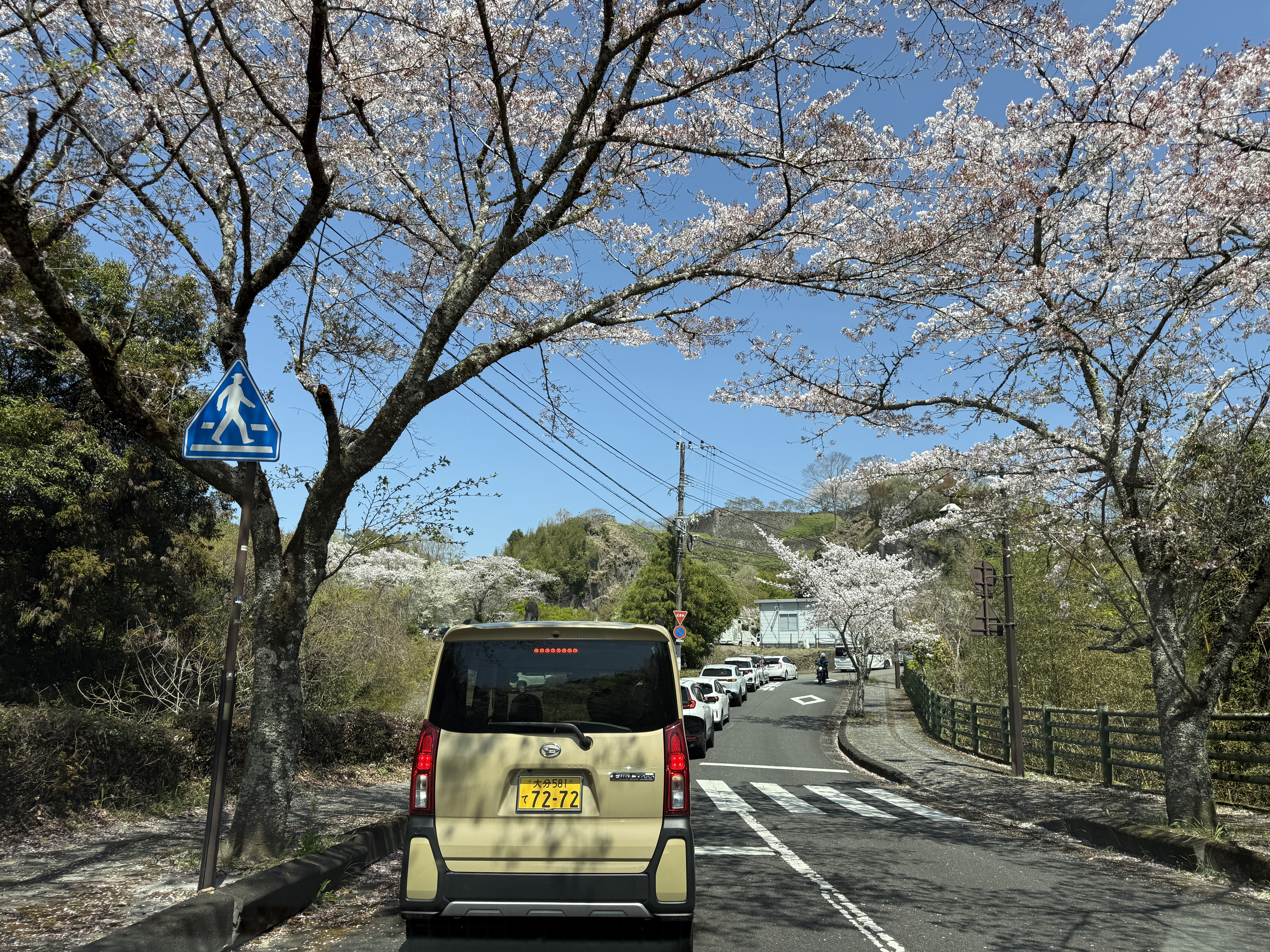 佐土原城の次は岡城です。2時間以上のドライブ後、史跡岡城跡駐車場の直前で駐車待ちの渋滞が。。。そっか、みんな桜を見に来てるのか、仕方ありません。10分くらい待って駐車できたのは13:04ごろでした。