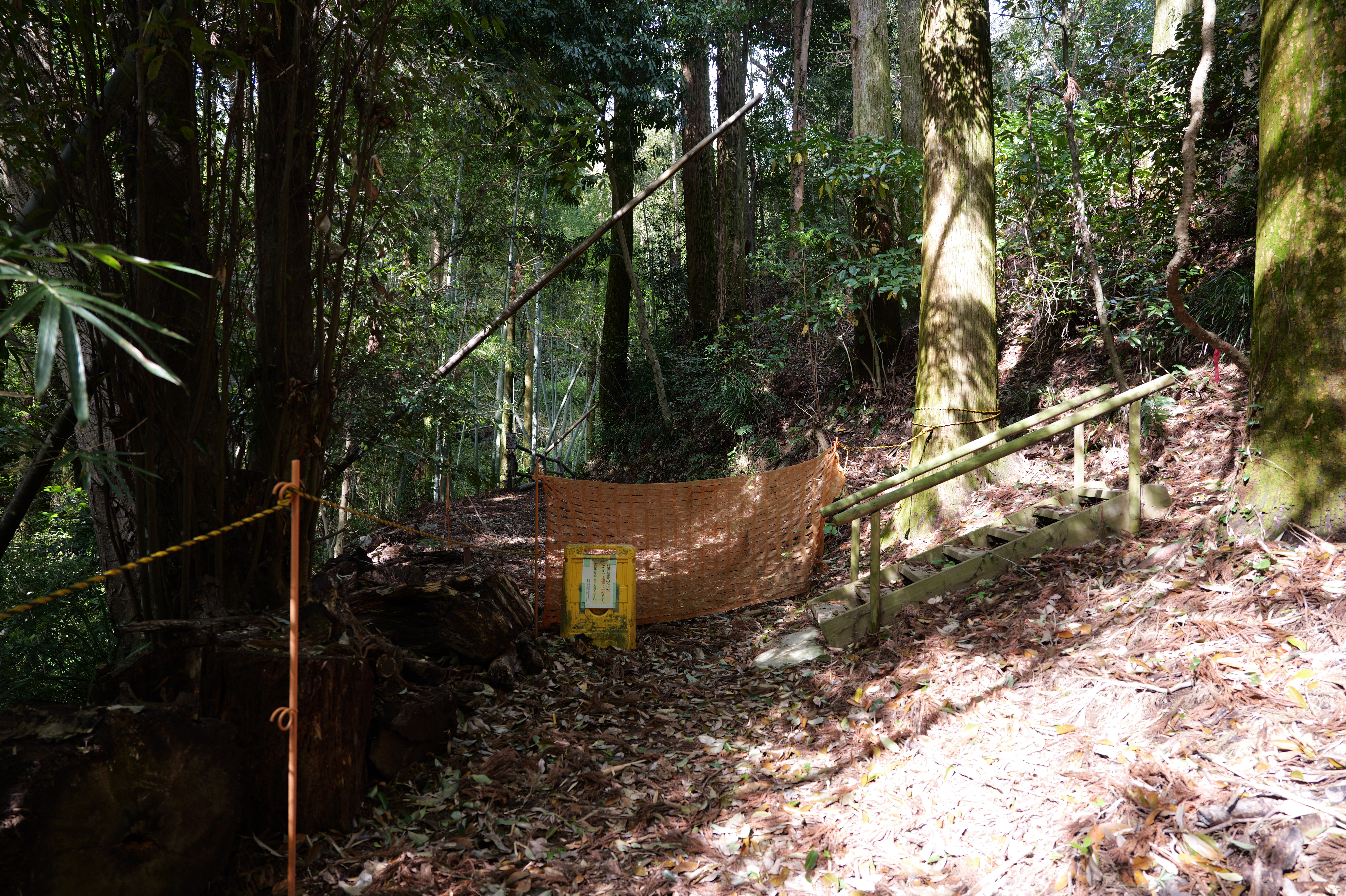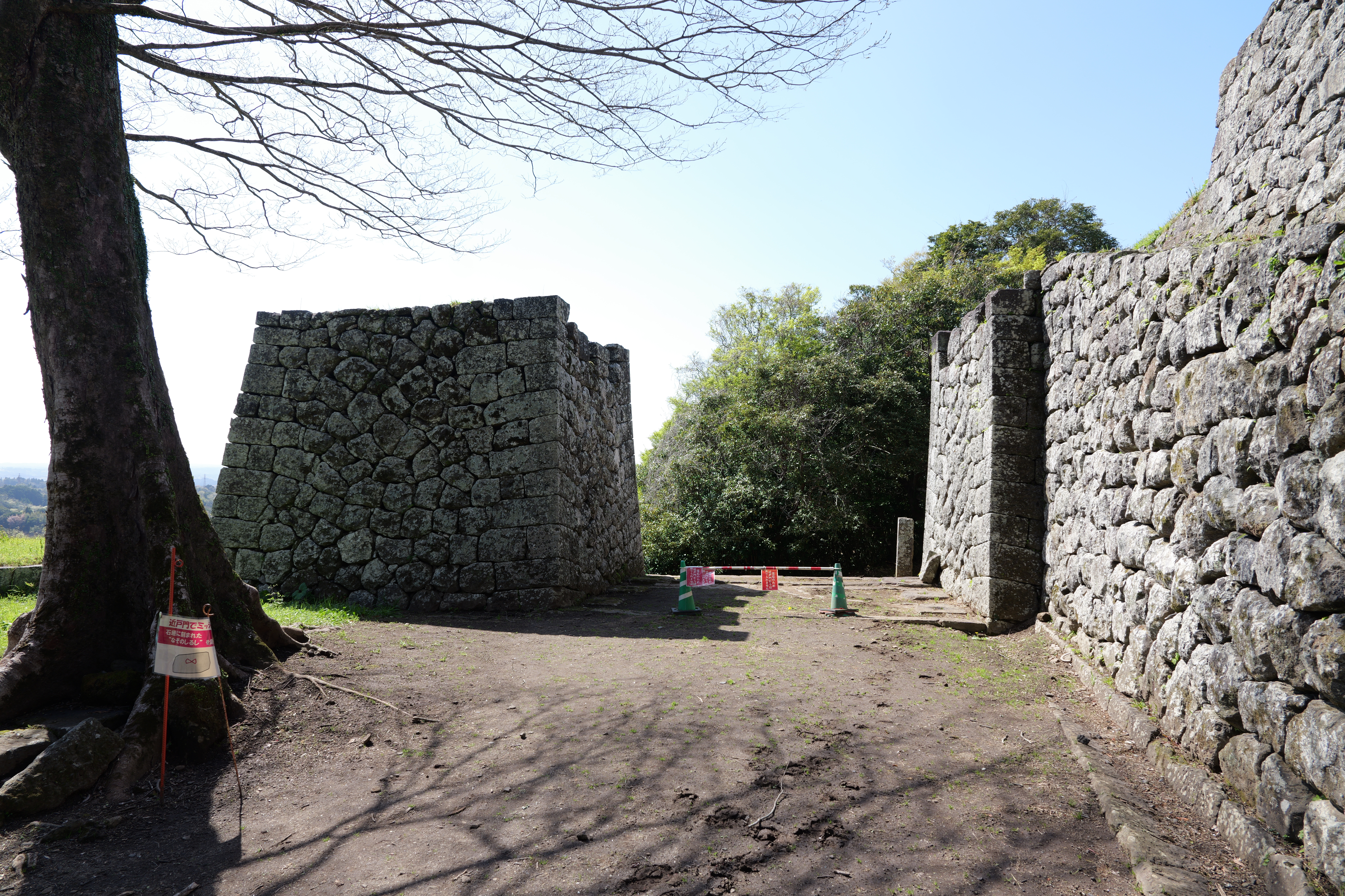 西の丸へは大階段の左、南側の坂道を進んでいくのがルートですが、左側に下りていく道も見えたのでそちらに行ってみました。一番奥の石段を登れば西の丸?と思いきや、石垣でふさがれていました。戻って坂を登ったところが新屋敷門跡です。先ほど石垣でふさがれていたところは新屋敷門の当初の虎口だったようです。