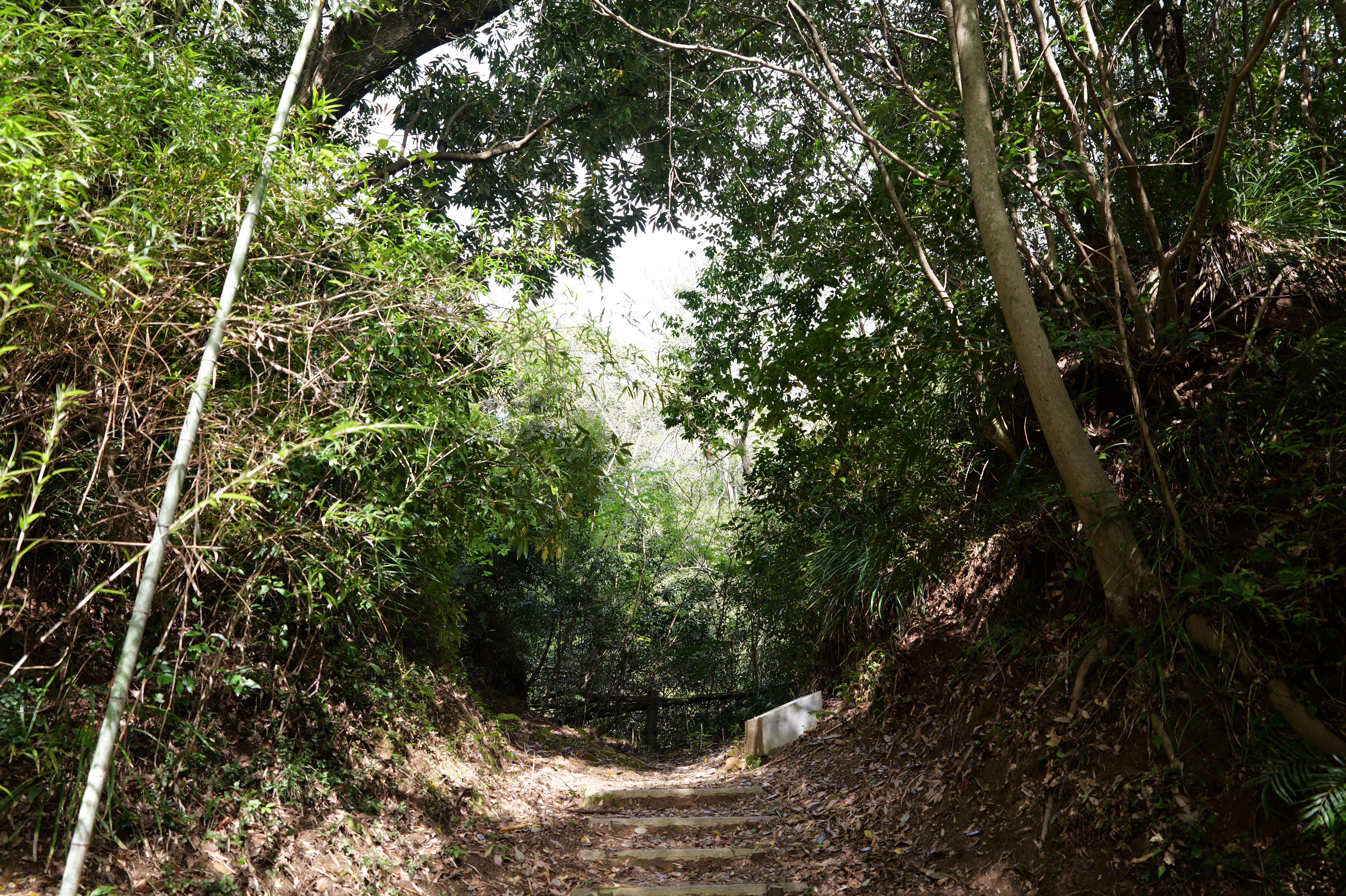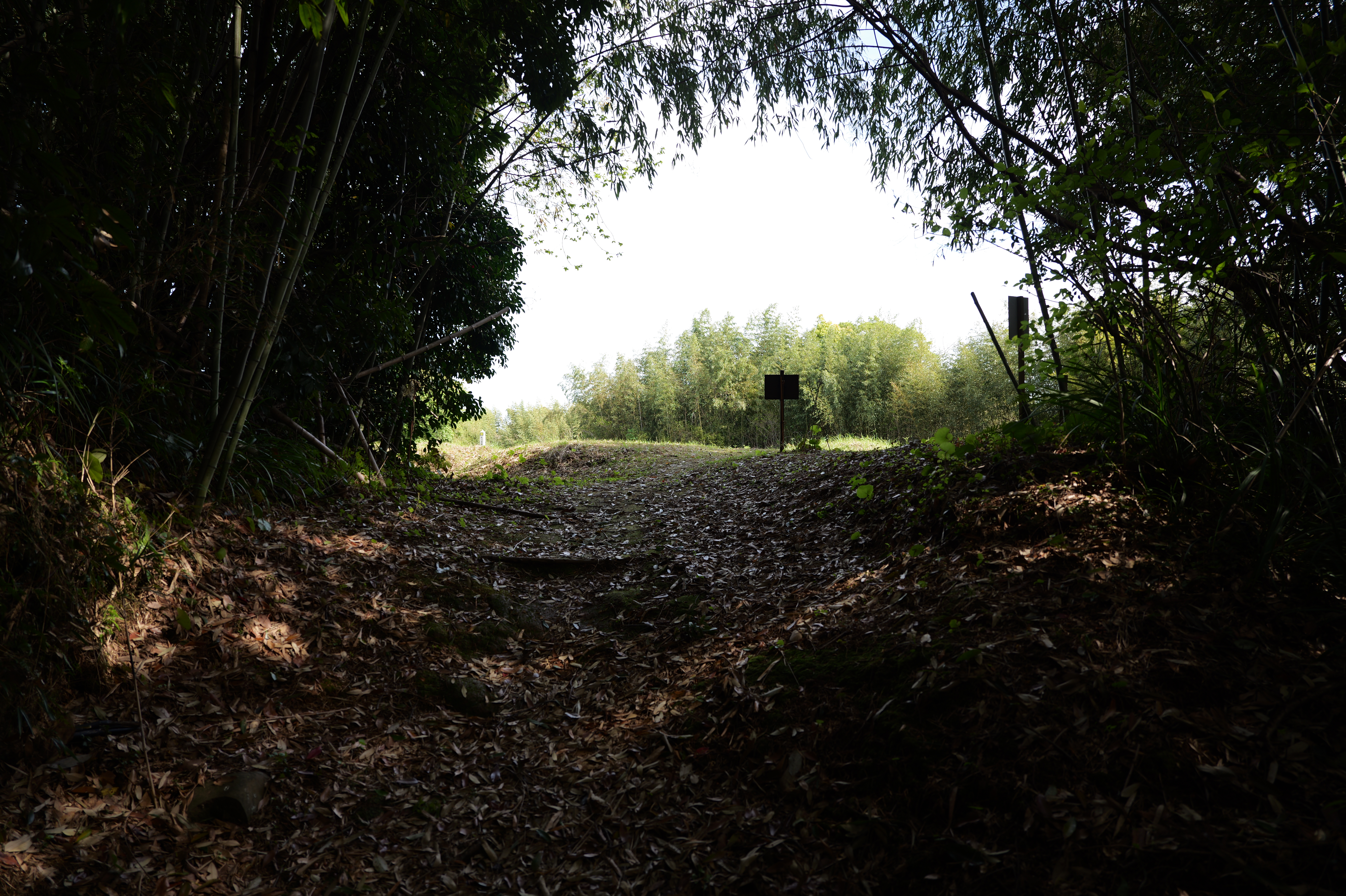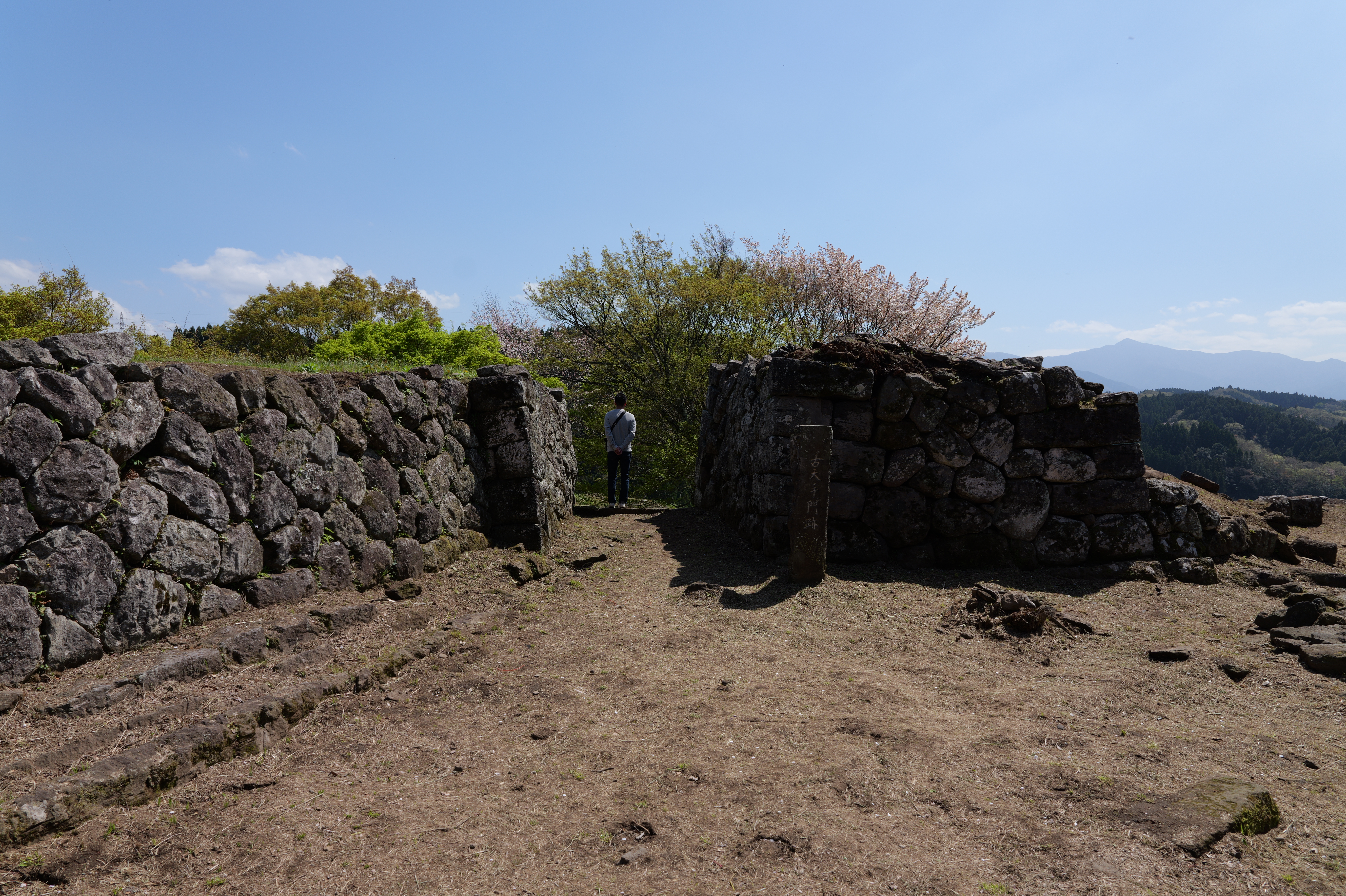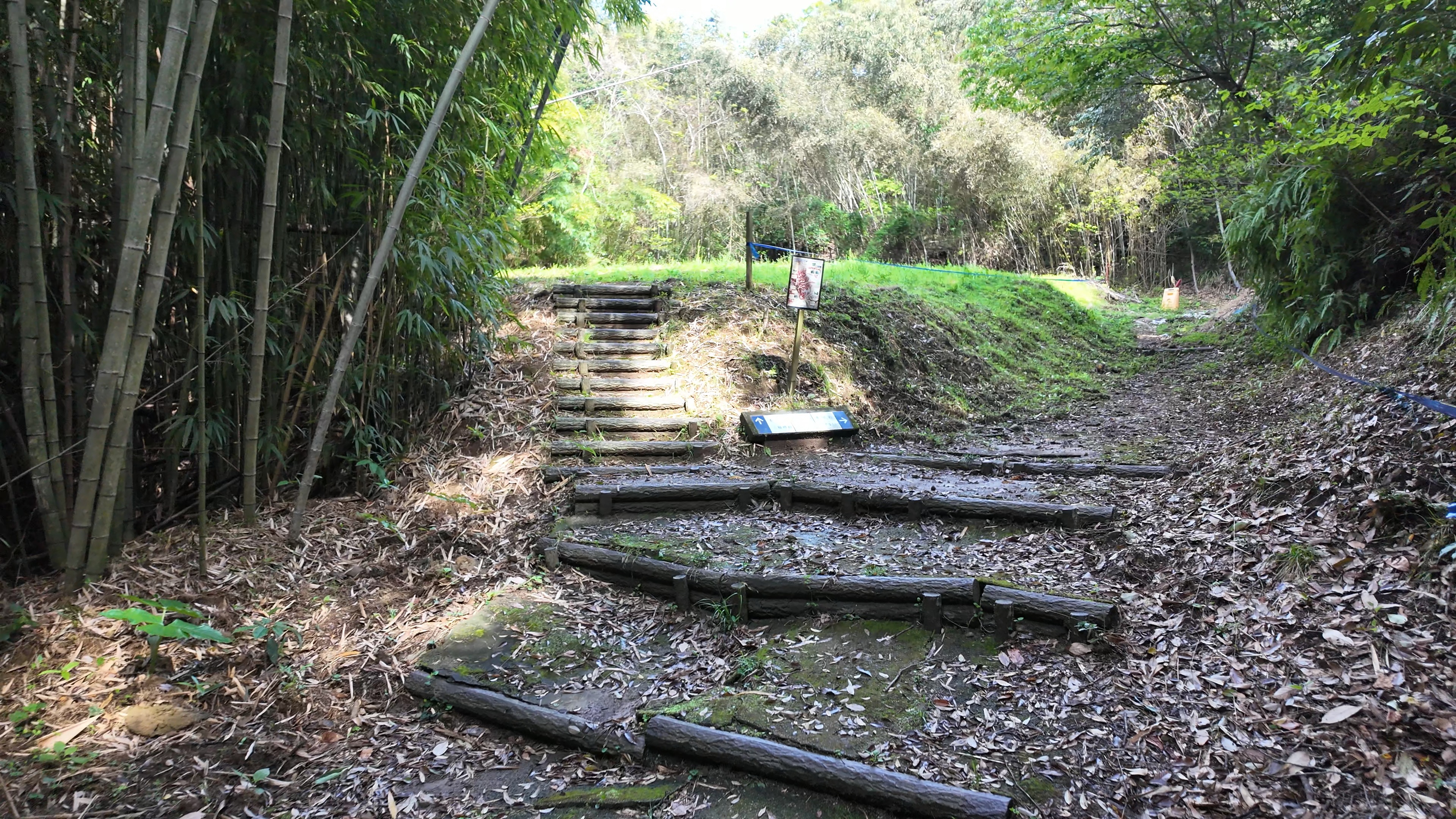 石段を登っていくと大手門跡です。当時は櫓門が構えられていました。右側にある通路みたいなところは、古大手門跡ですが、外側には堀切と小さな曲輪が先にありました。行けないことはないけれど、やめました。