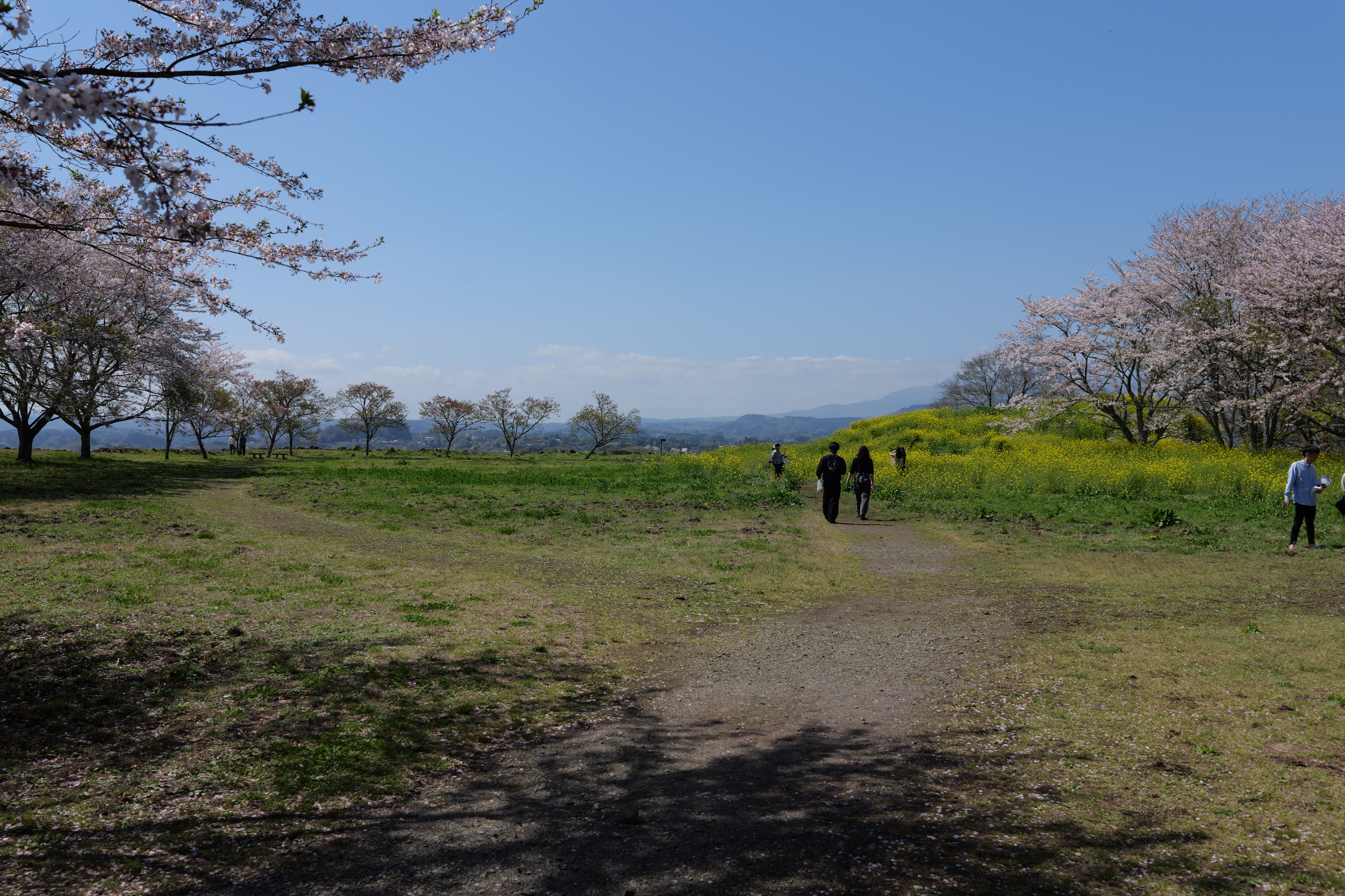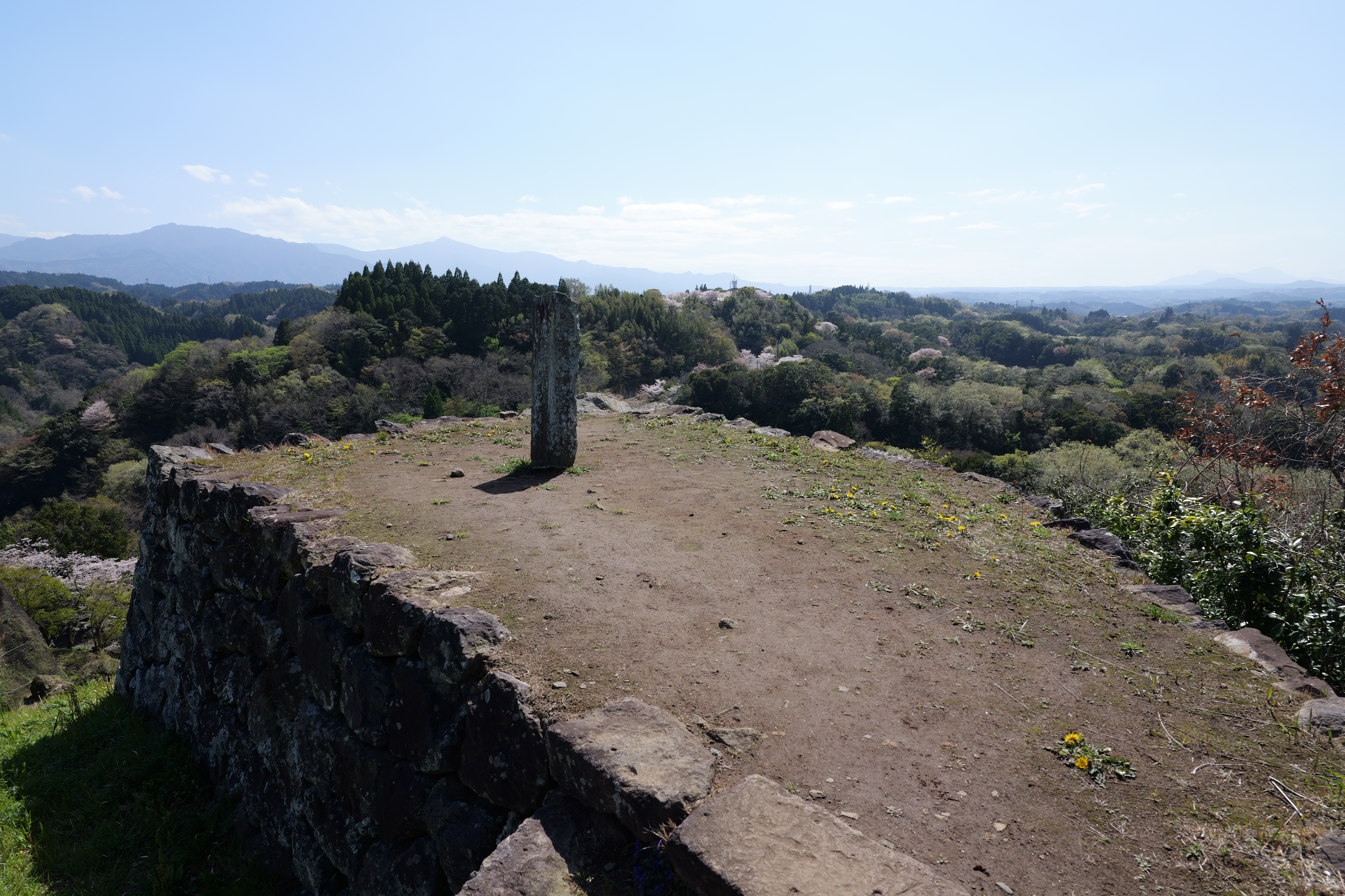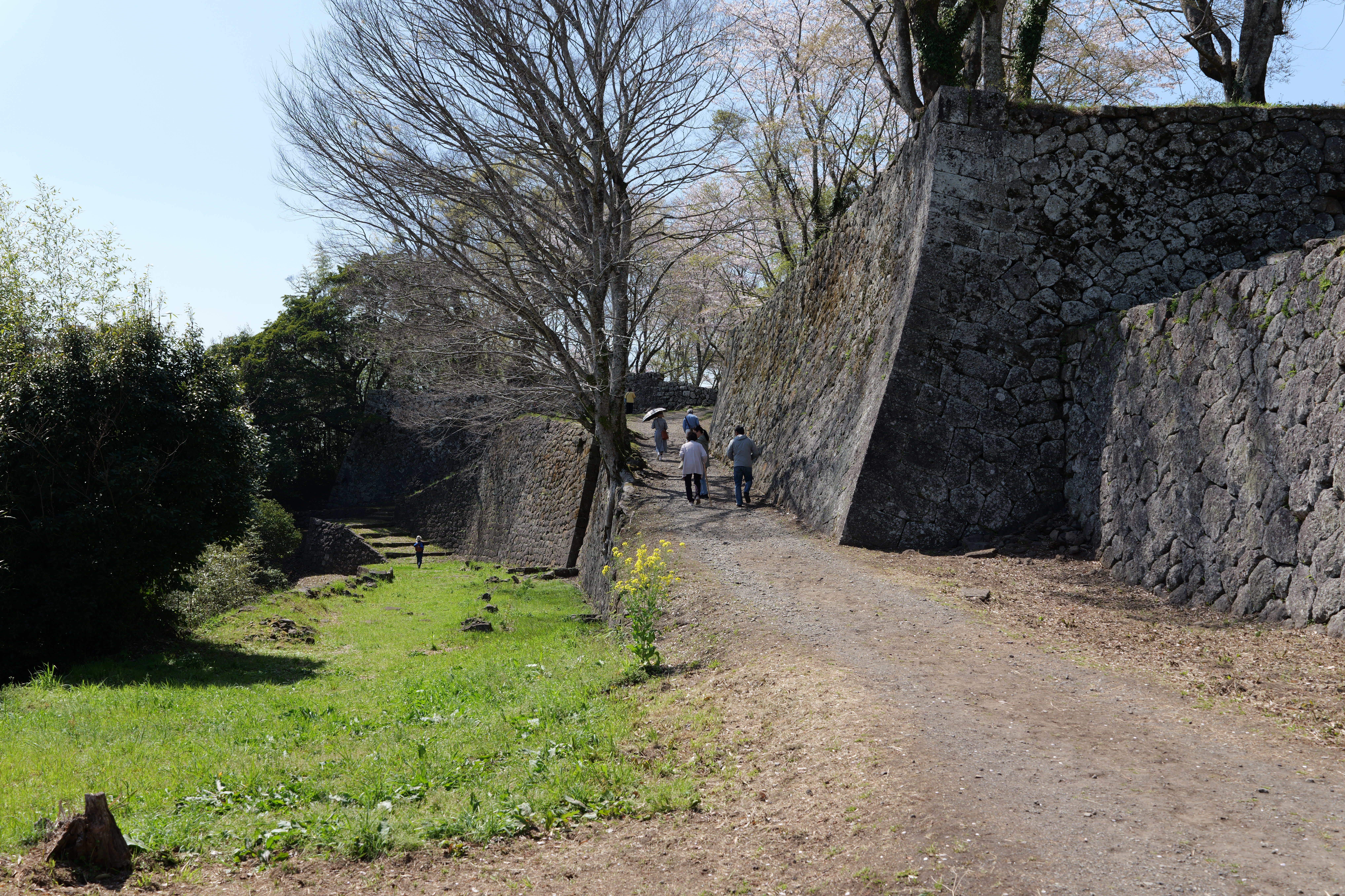 そこを抜けると西の丸で、正面に桜と菜の花が咲き誇っていて天国のようとはいいすぎでしょうか。西の丸は西の丸御殿跡で、城内で一番広い曲輪だそうです。一番西側に行ってみると一段下の左側に物見台跡、右側に角櫓跡、眼下には駐車場が見渡せます。駐車場から見えていた石垣はここですね。物見台跡に下りました。