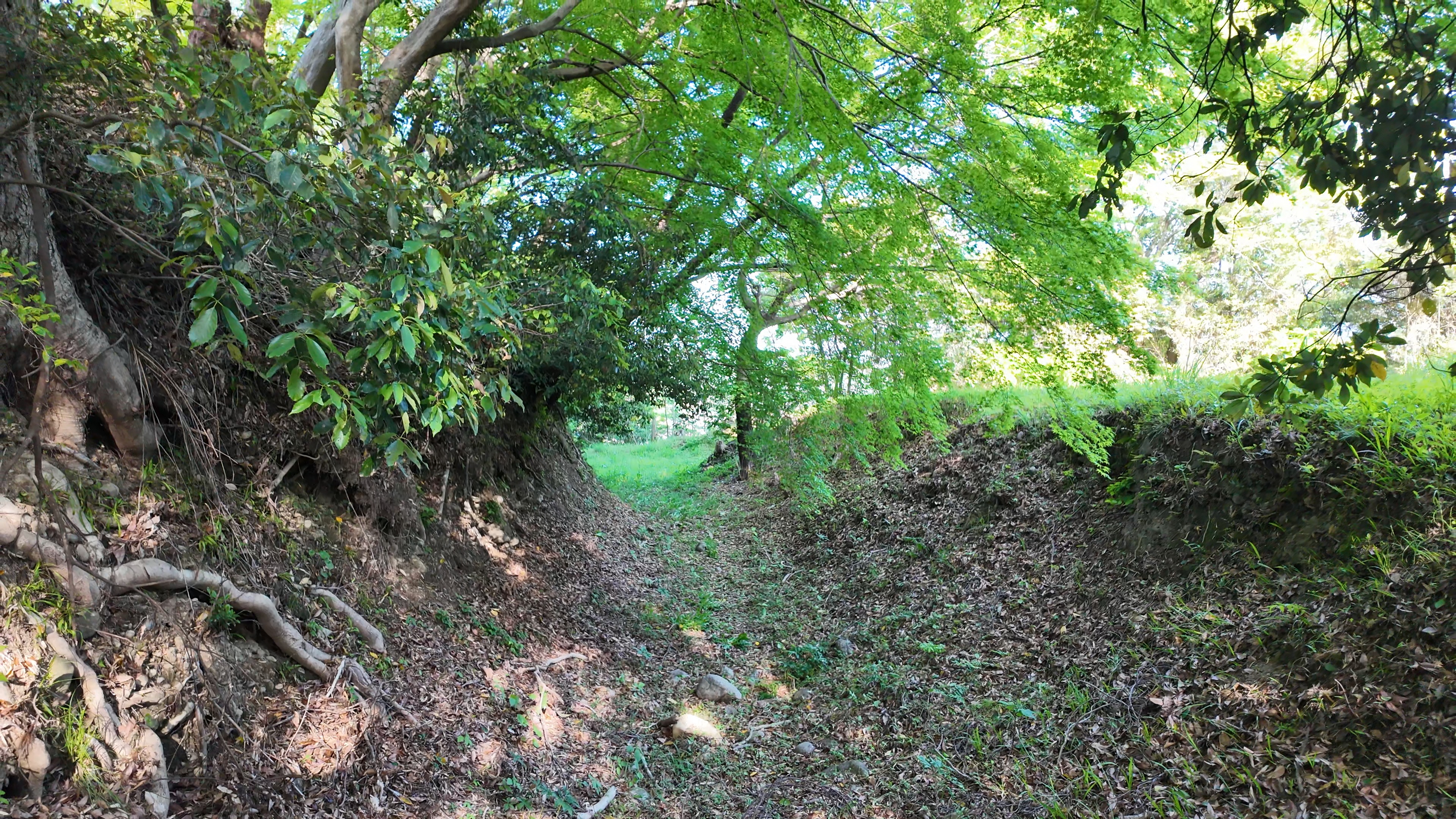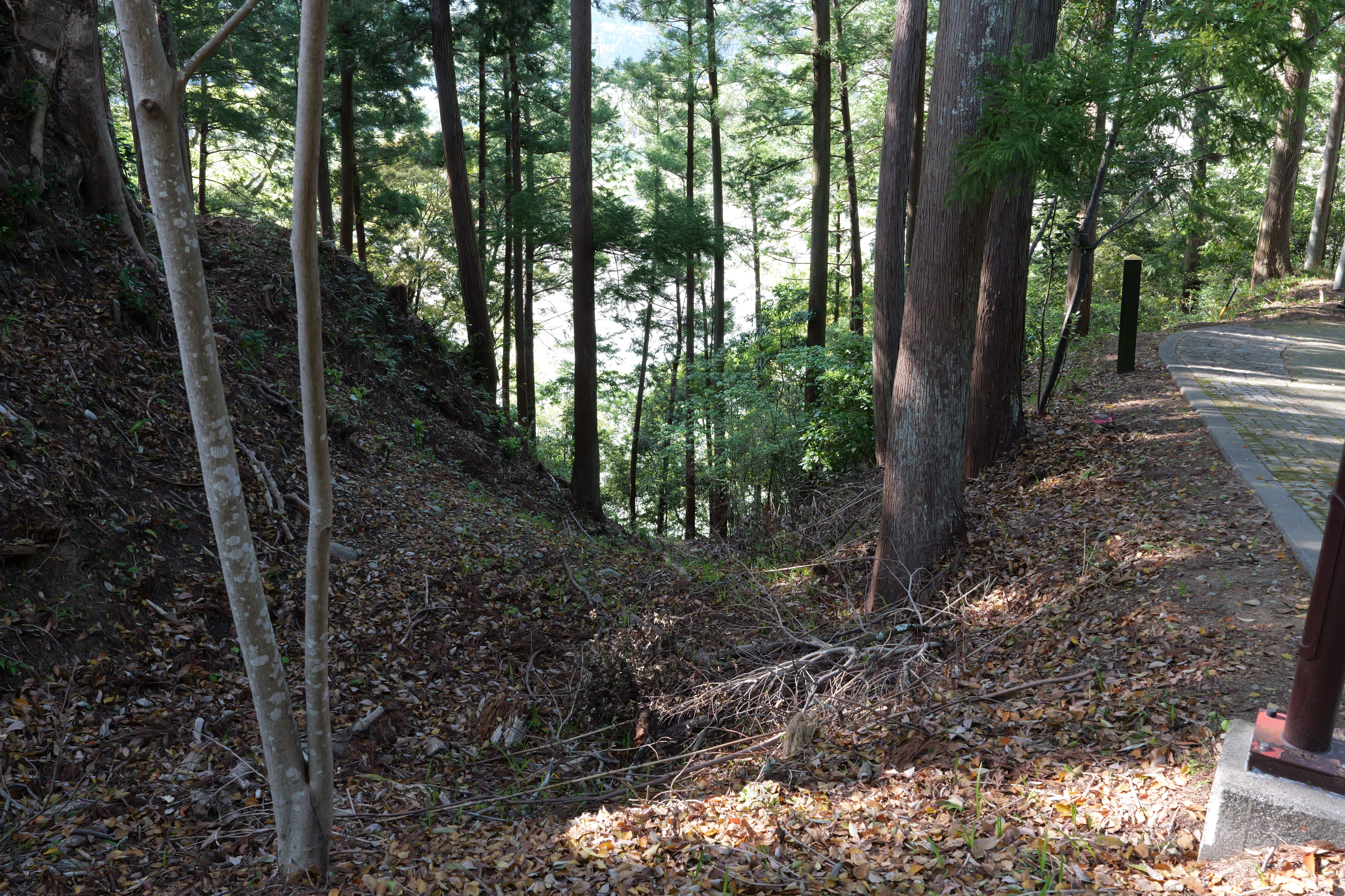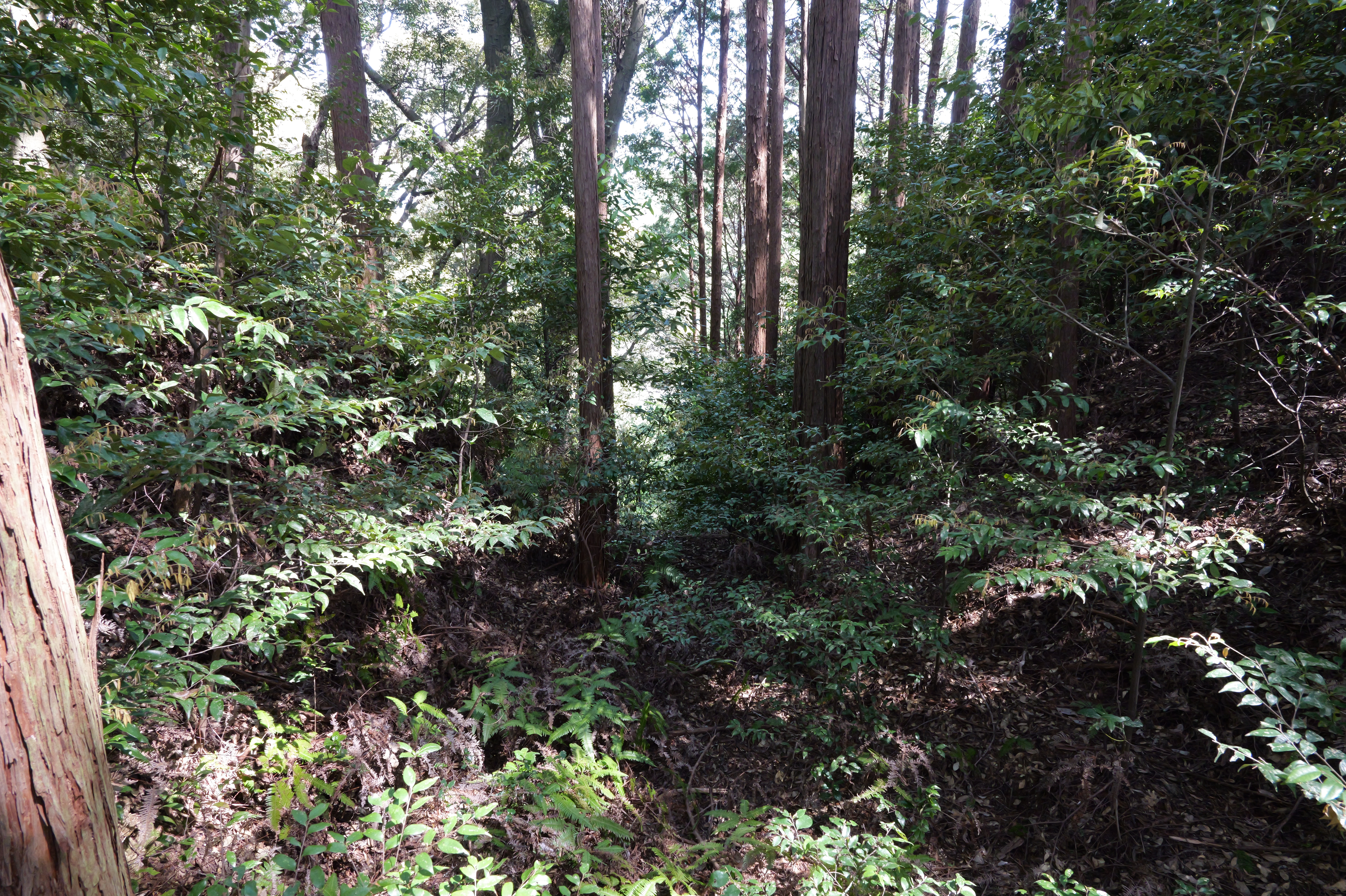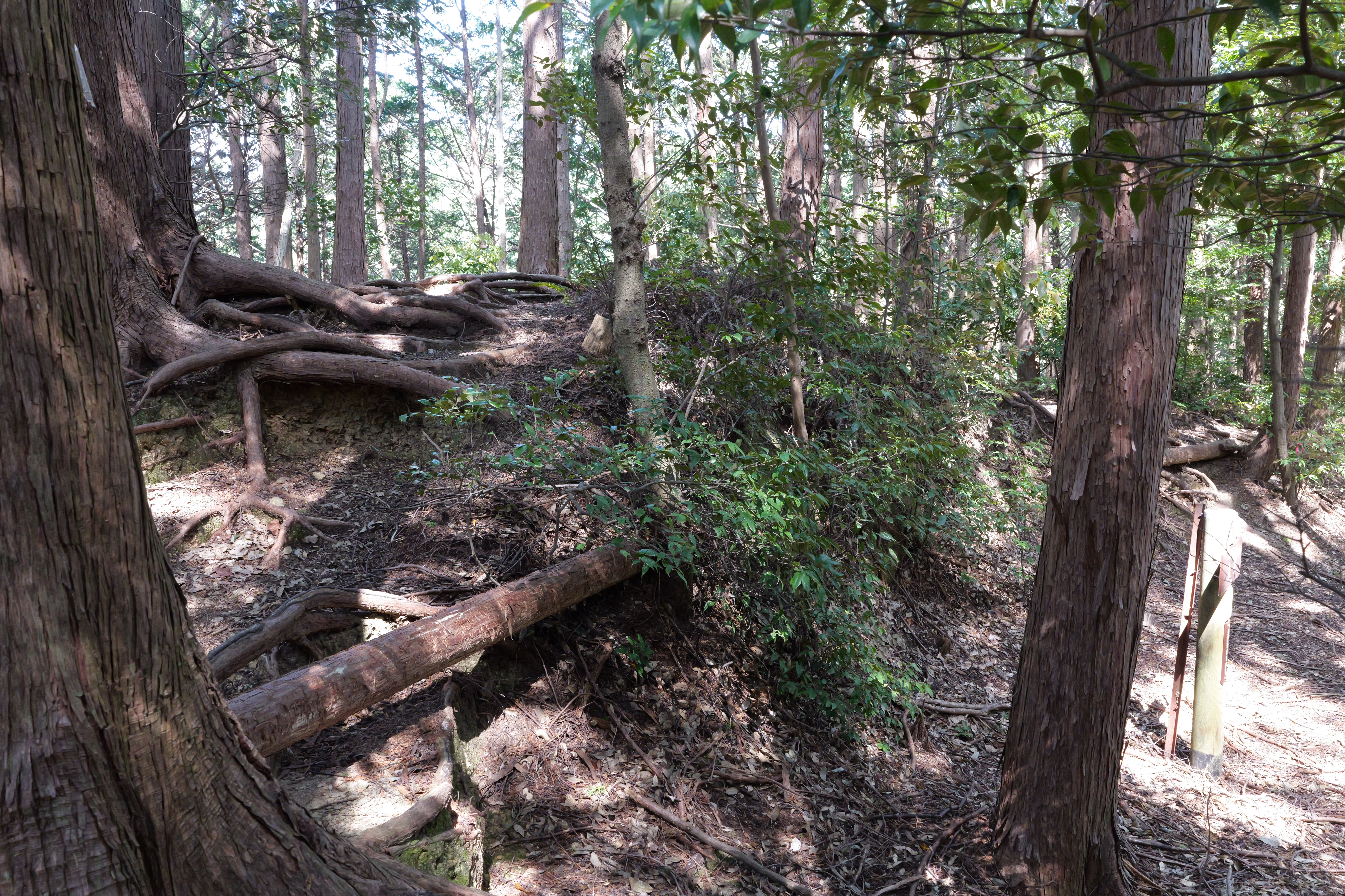 駐車場前の登城口を少し登ると、右下から正面に伸びる本丸と北曲輪を分断する堀切があります。右側が本丸、左側が北曲輪です。