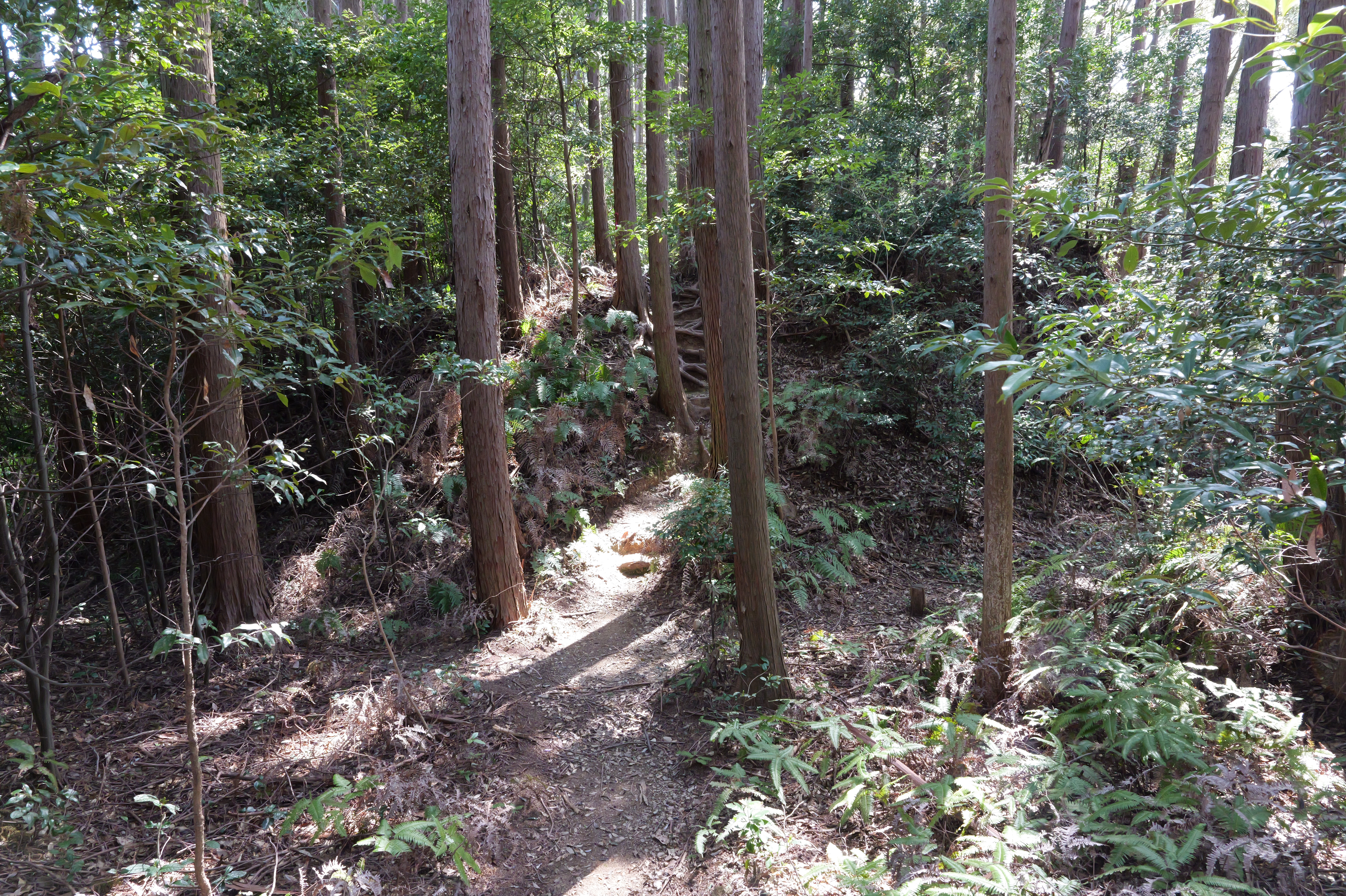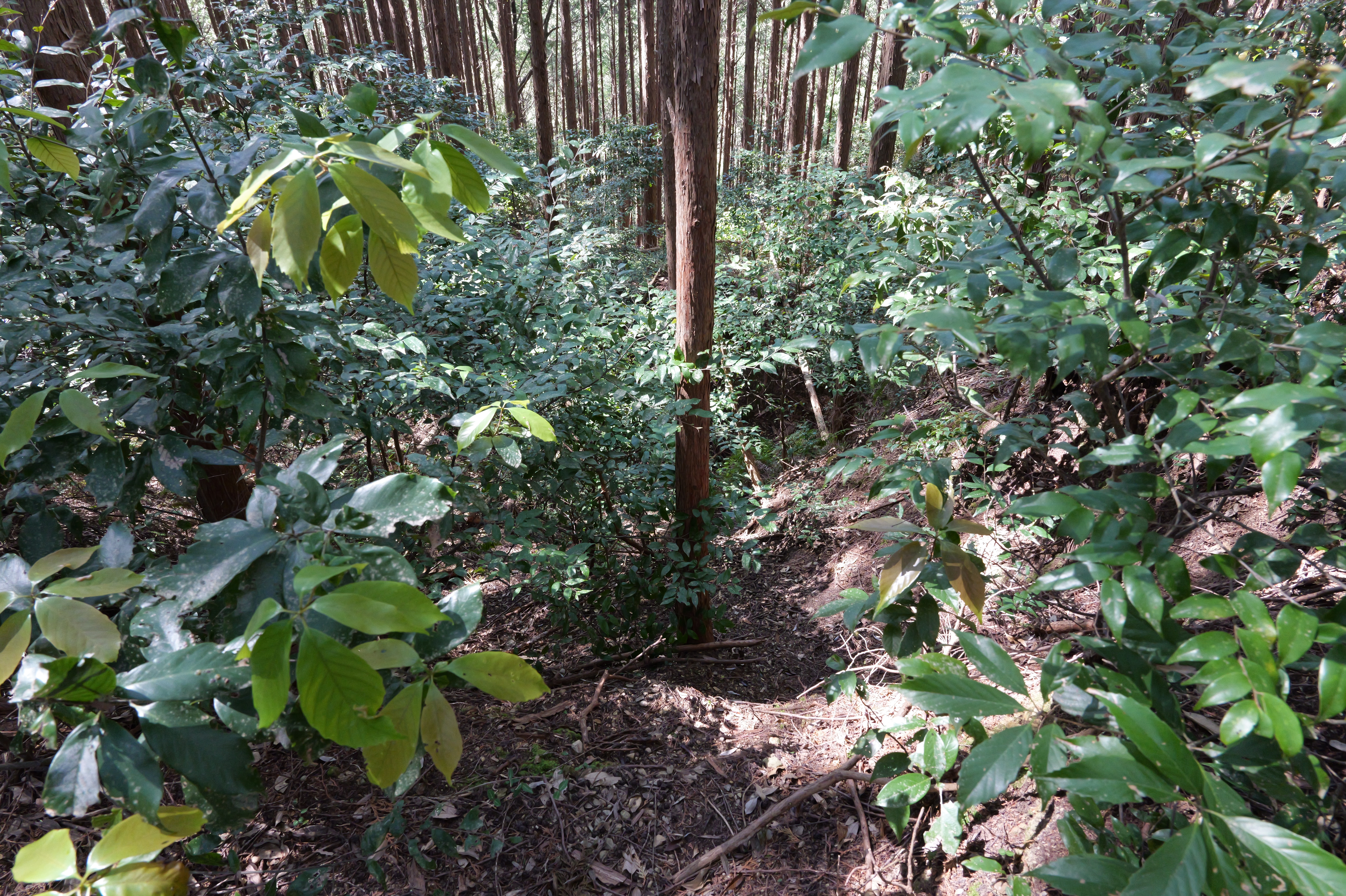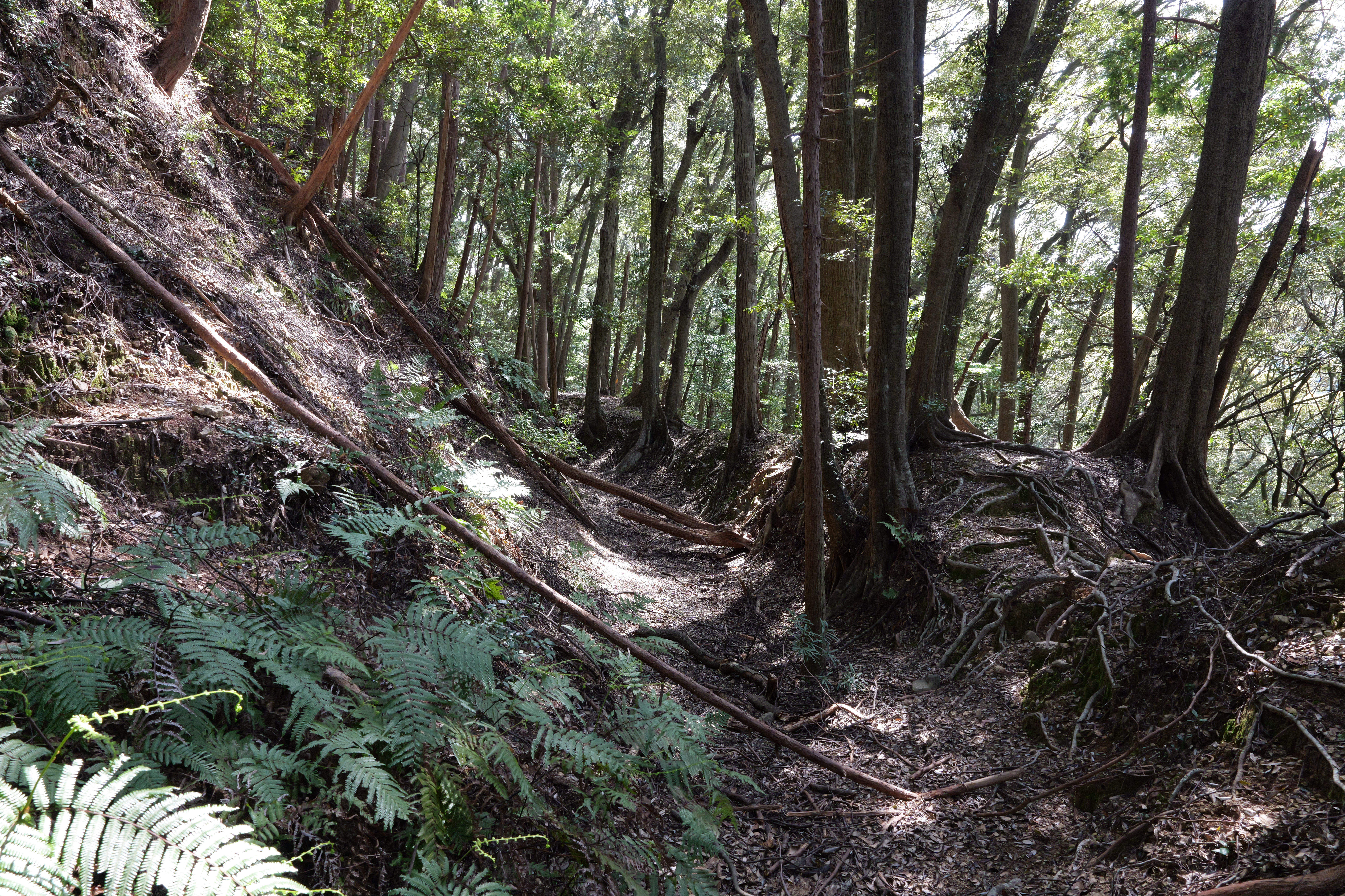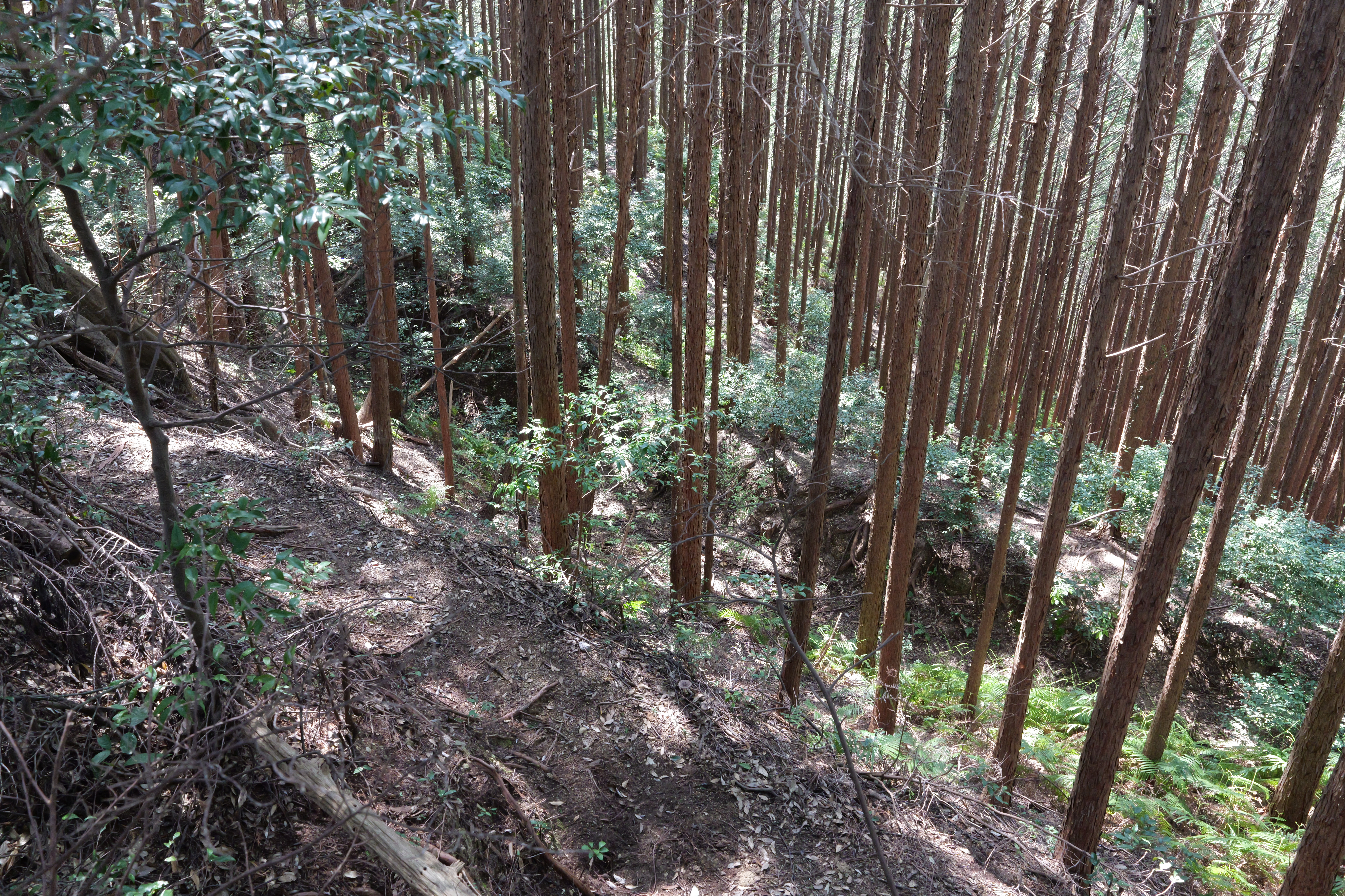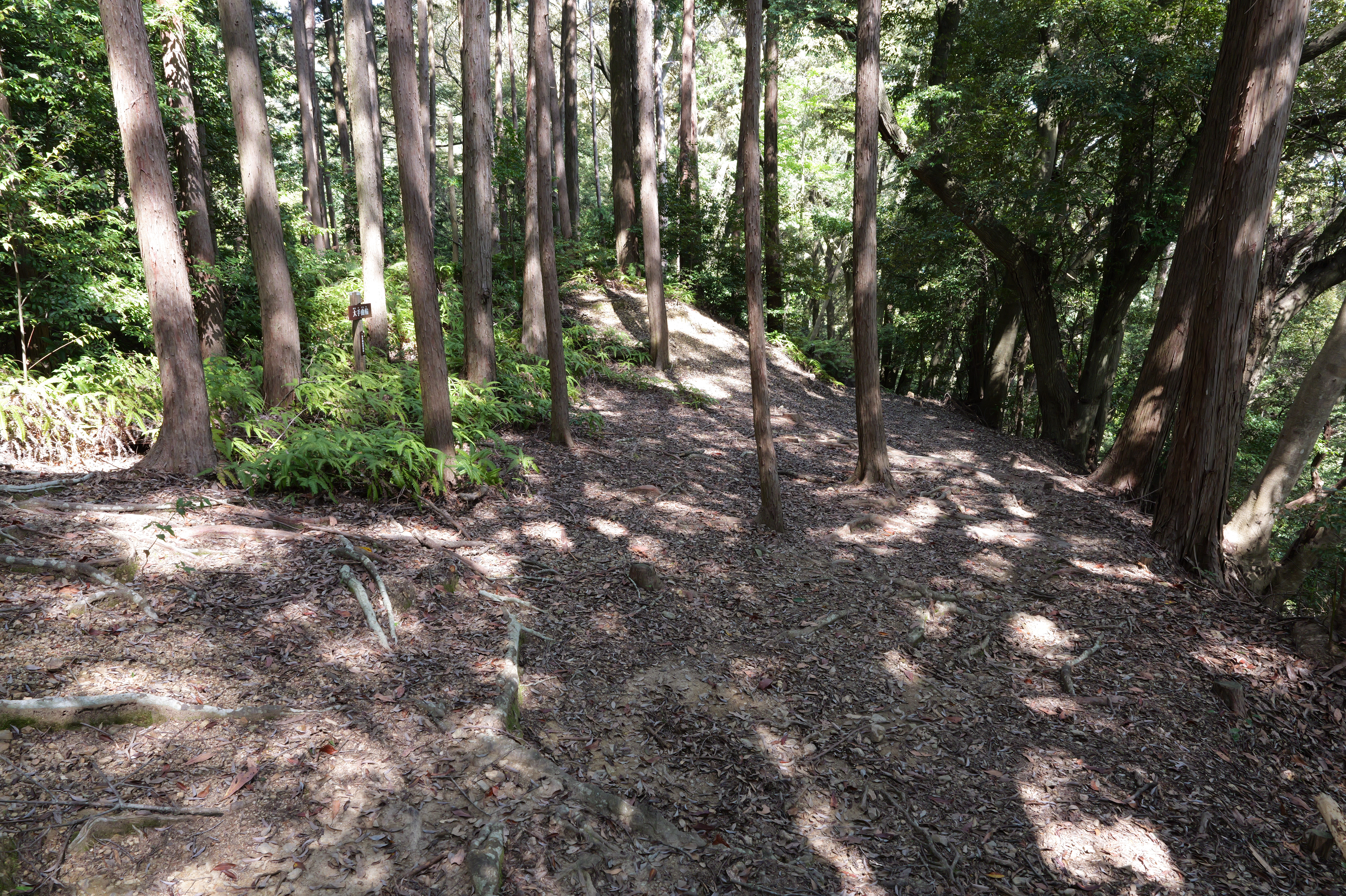 駐車場前の登城口を少し登ると、右下から正面に伸びる本丸と北曲輪を分断する堀切があります。右側が本丸、左側が北曲輪です。