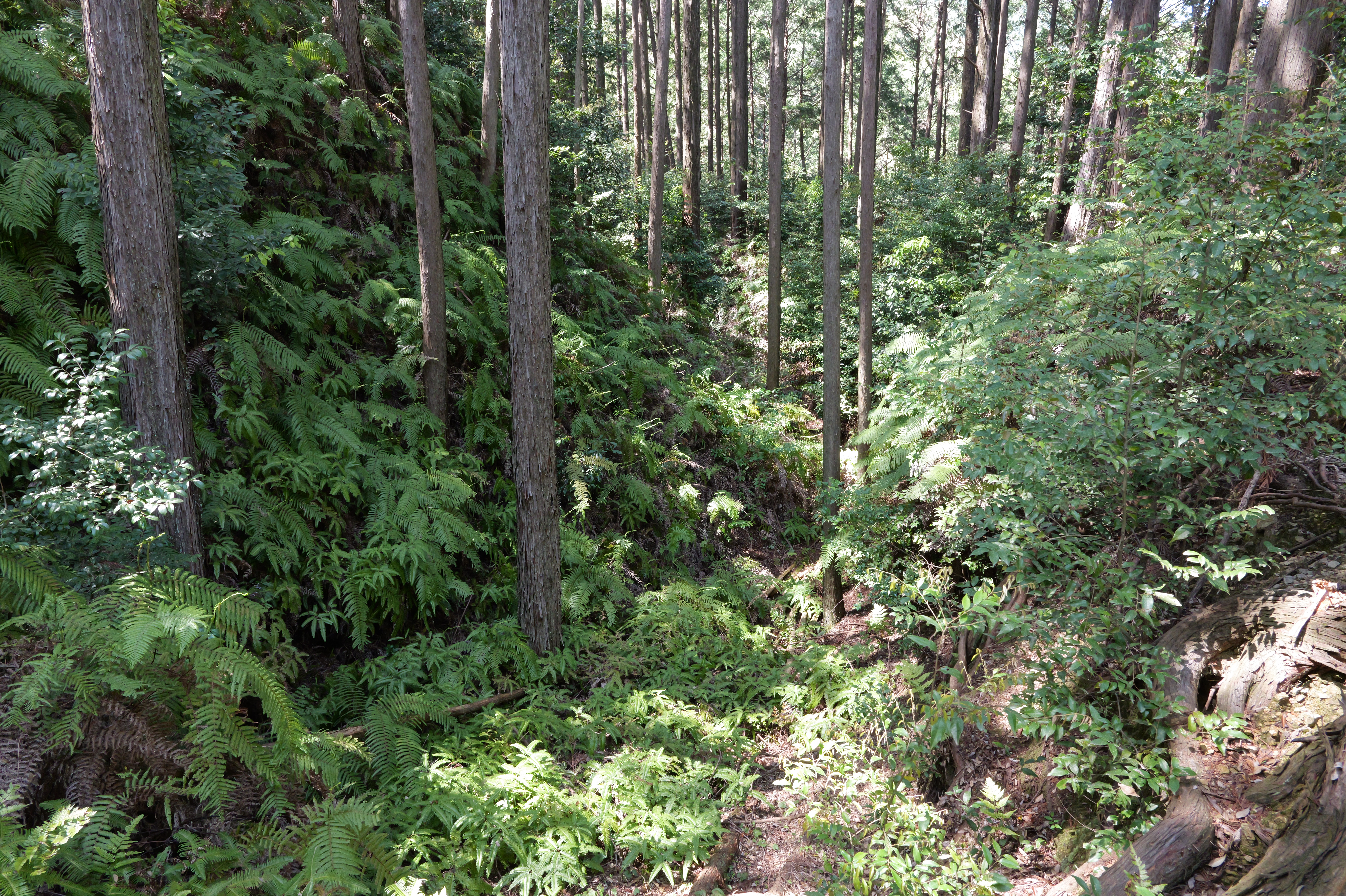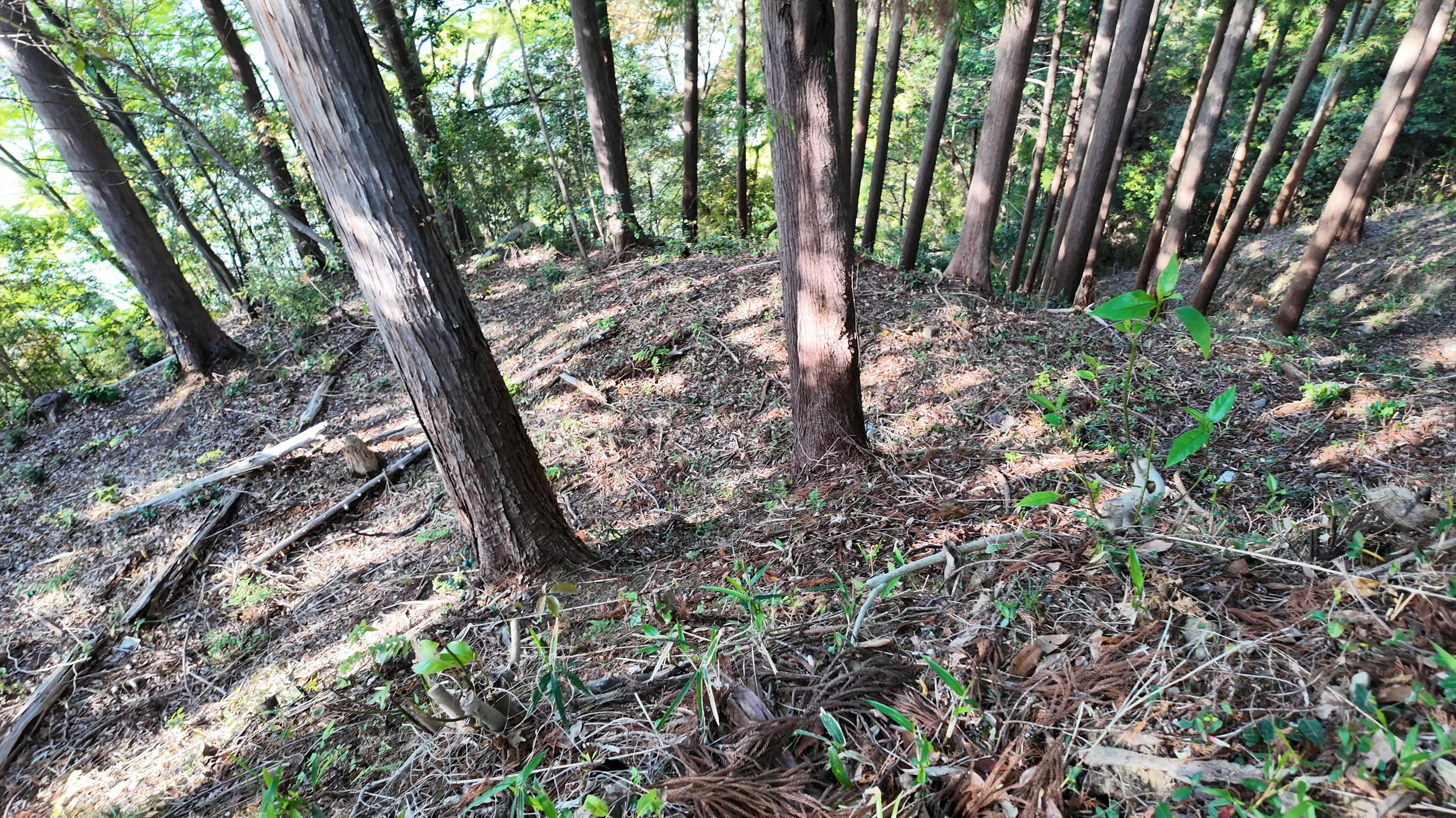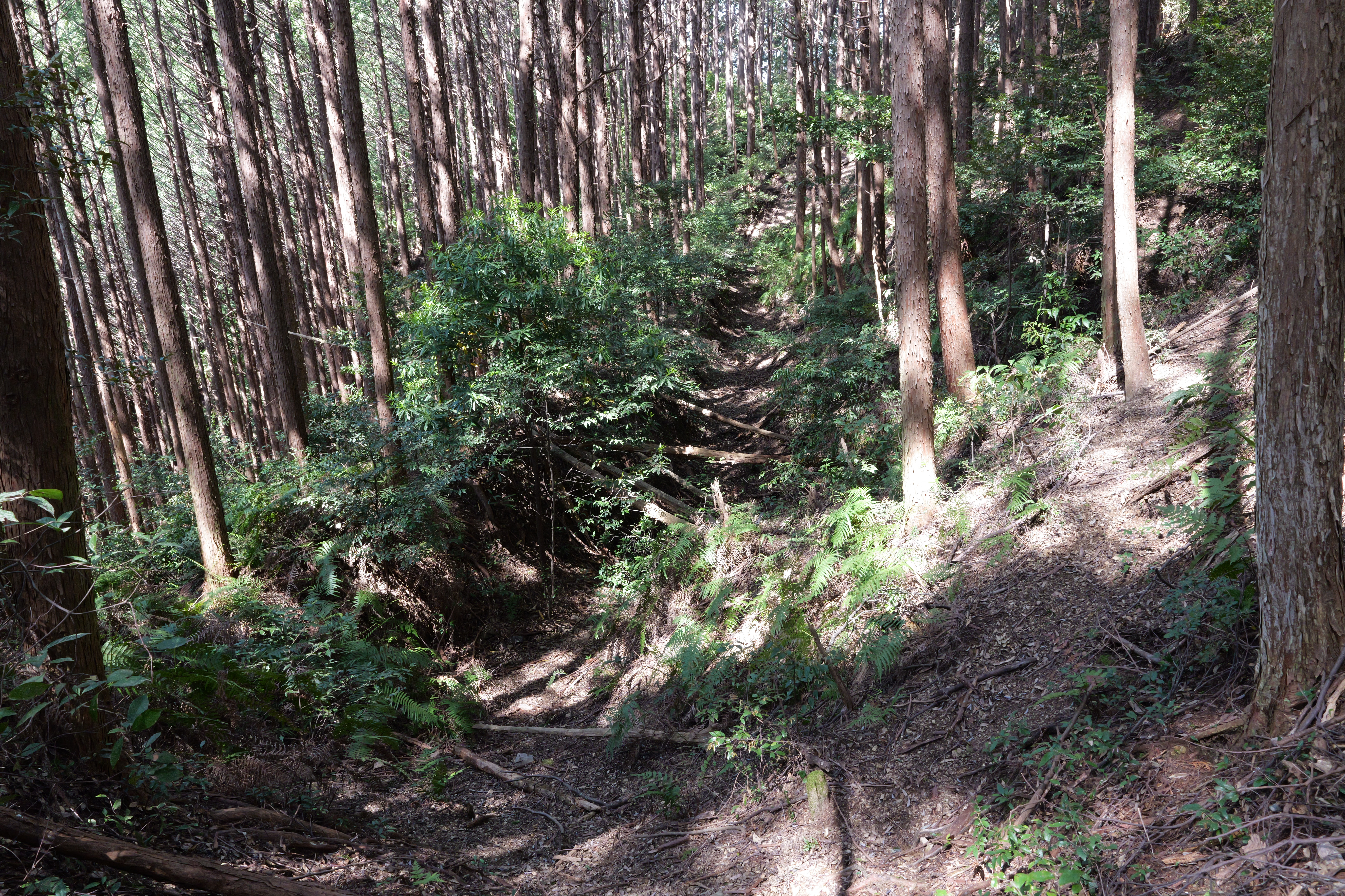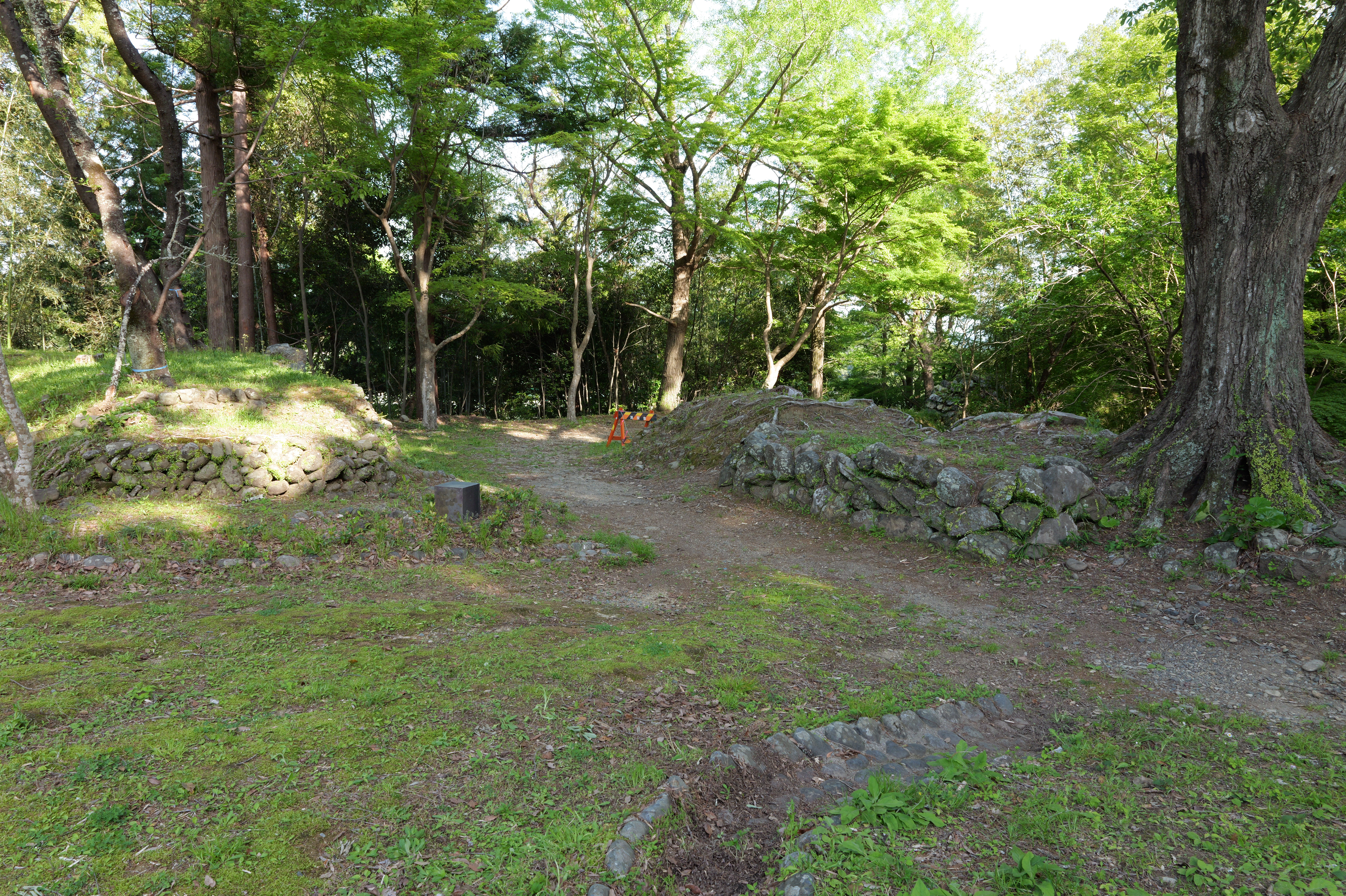 駐車場前の登城口を少し登ると、右下から正面に伸びる本丸と北曲輪を分断する堀切があります。右側が本丸、左側が北曲輪です。