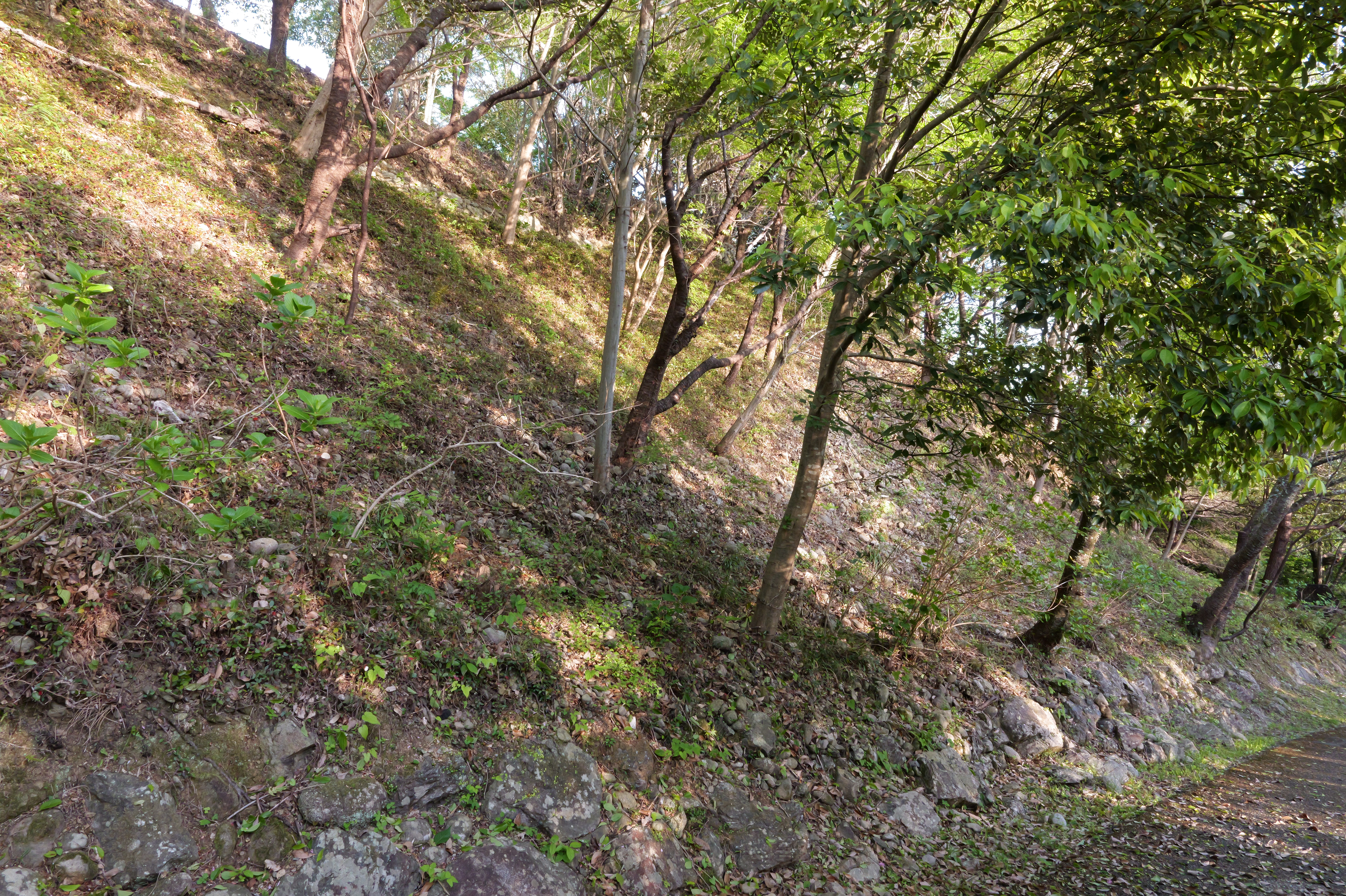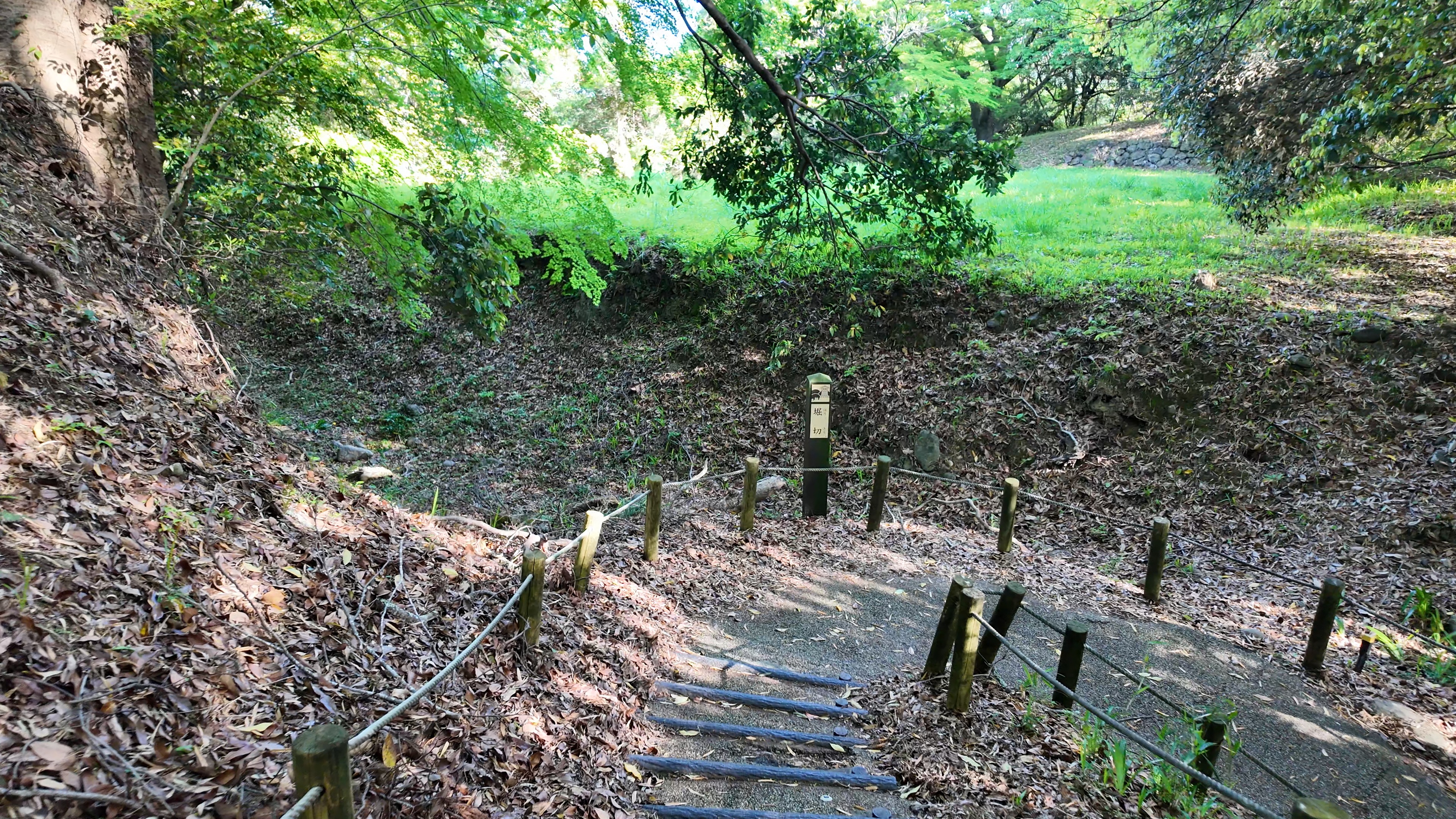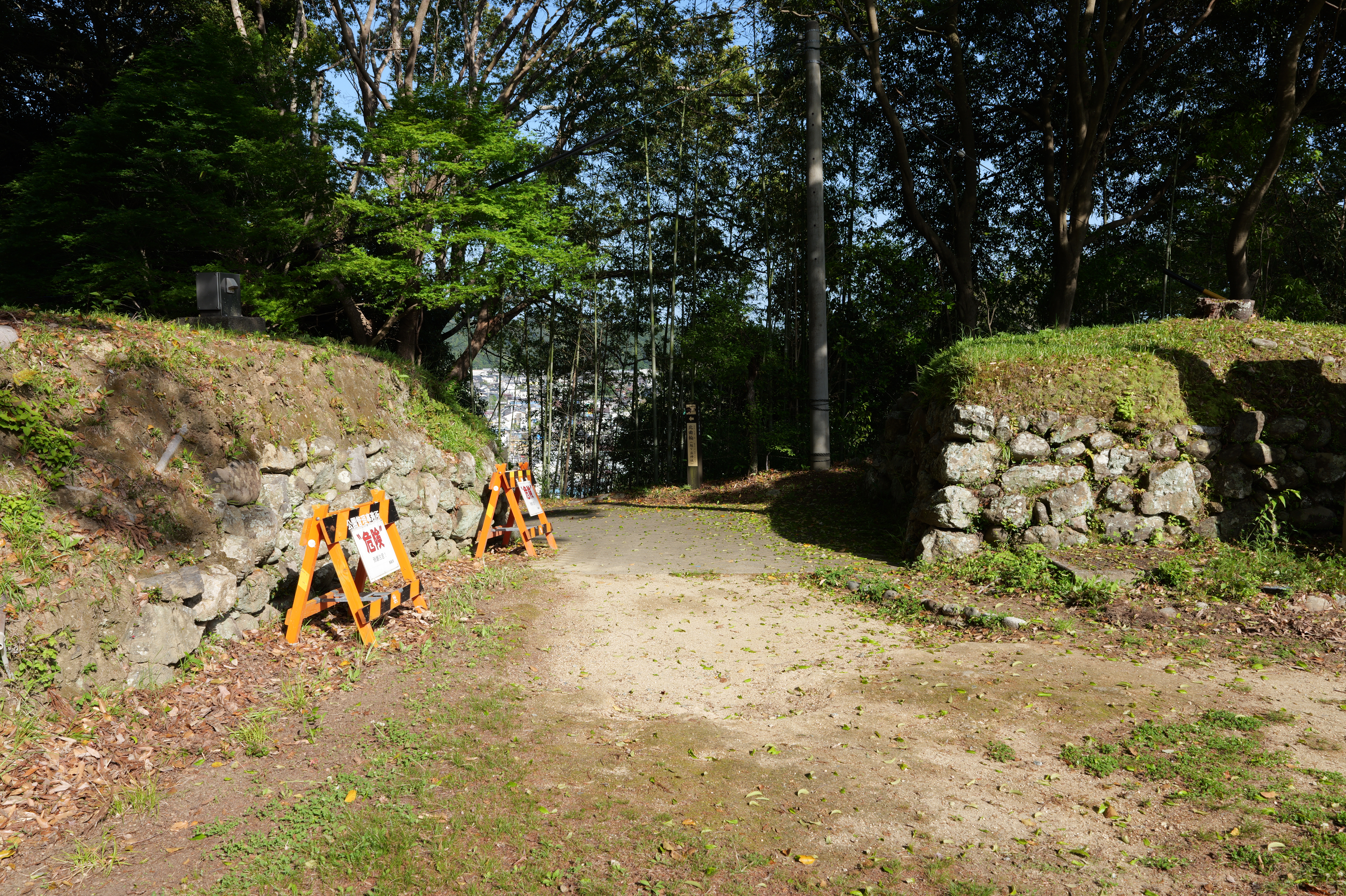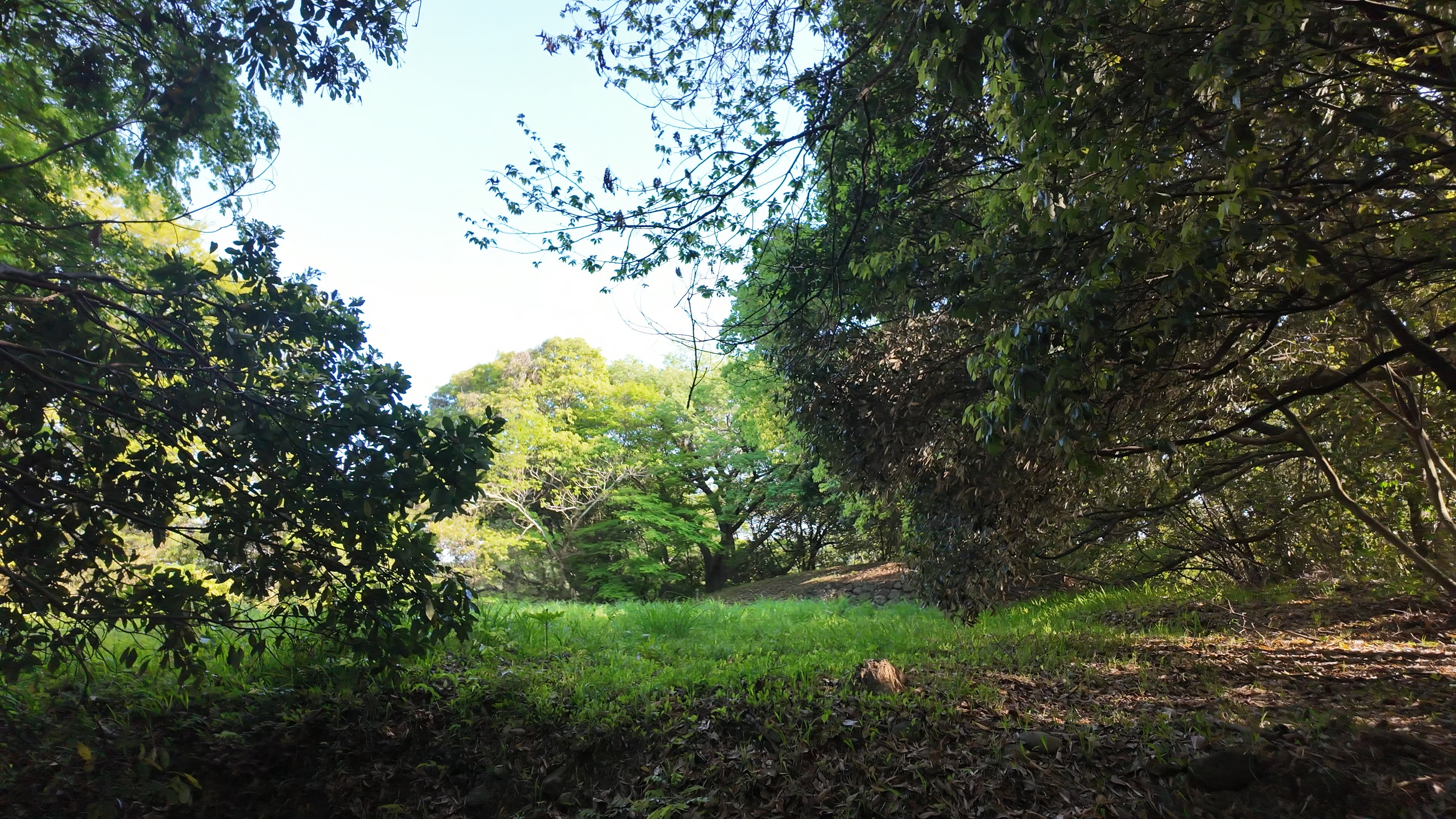 大手門跡の南側は土塁になっていて、その下は蔵屋敷との間にある二の丸南側堀切です。土塁上を進み蔵屋敷に行こうとしましたが、ロープが張られているので立ち入りできないと判断しました。