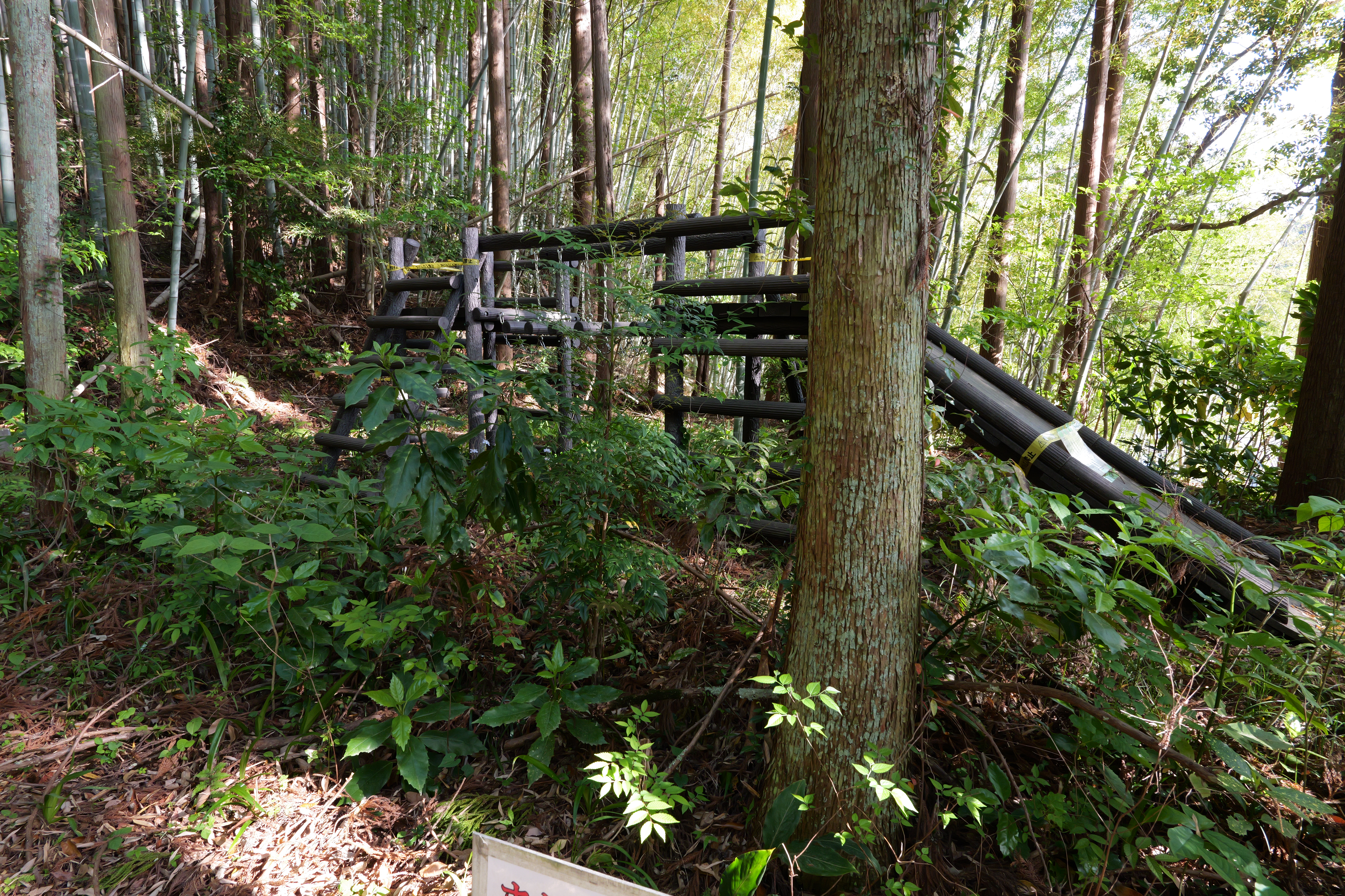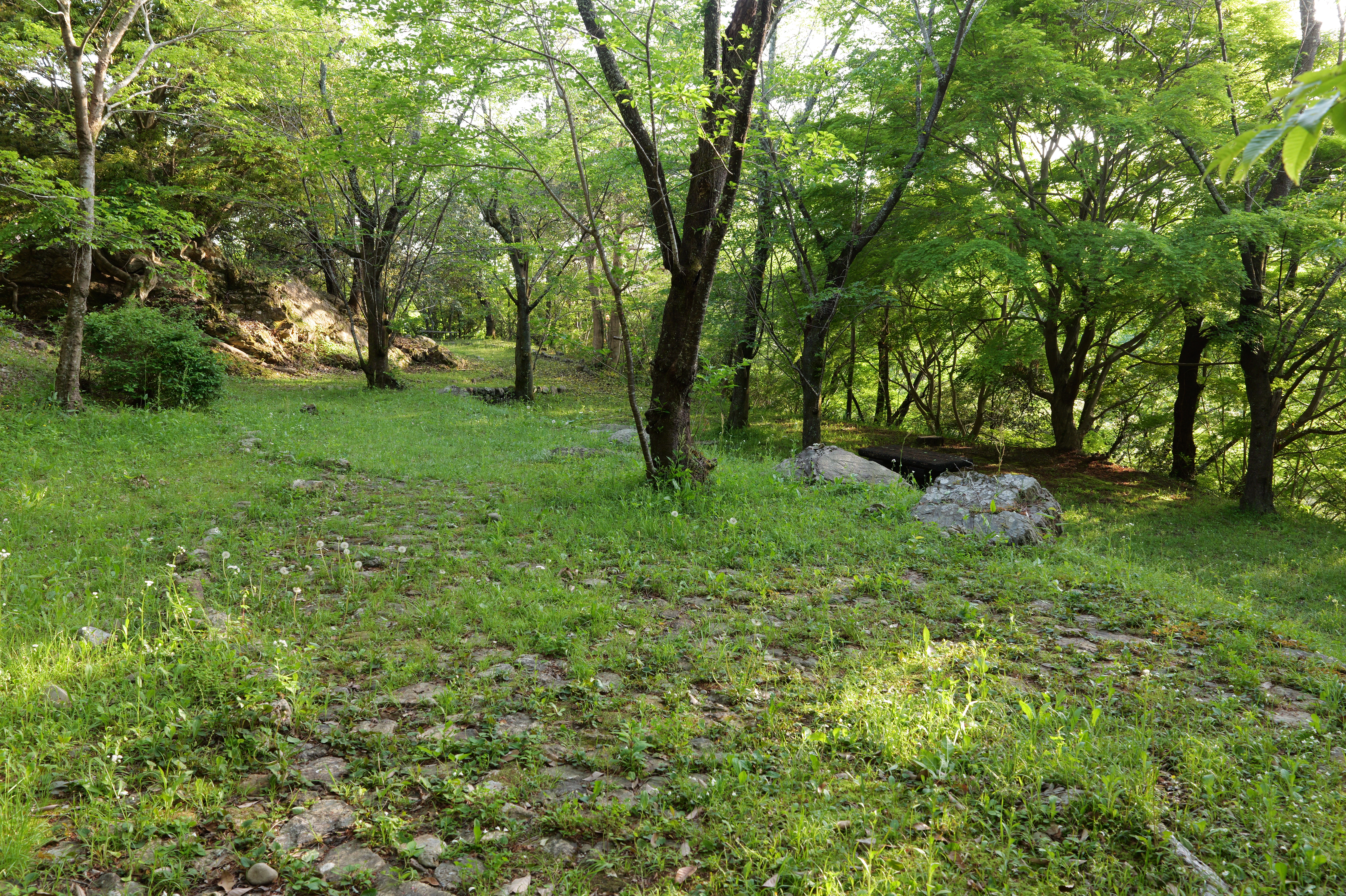 そのまま北西に伸びる下り坂を進むと、左側は西曲輪の段曲輪がずっと続きます。そのまま進んで行くと天竜川の土手上の道になり鳥羽山城に行けるようですが、ここは一旦戻って、クルマで移動することにします。本丸に戻って、本丸下の腰曲輪など確認していると、なんとカモシカさんが散歩していました。