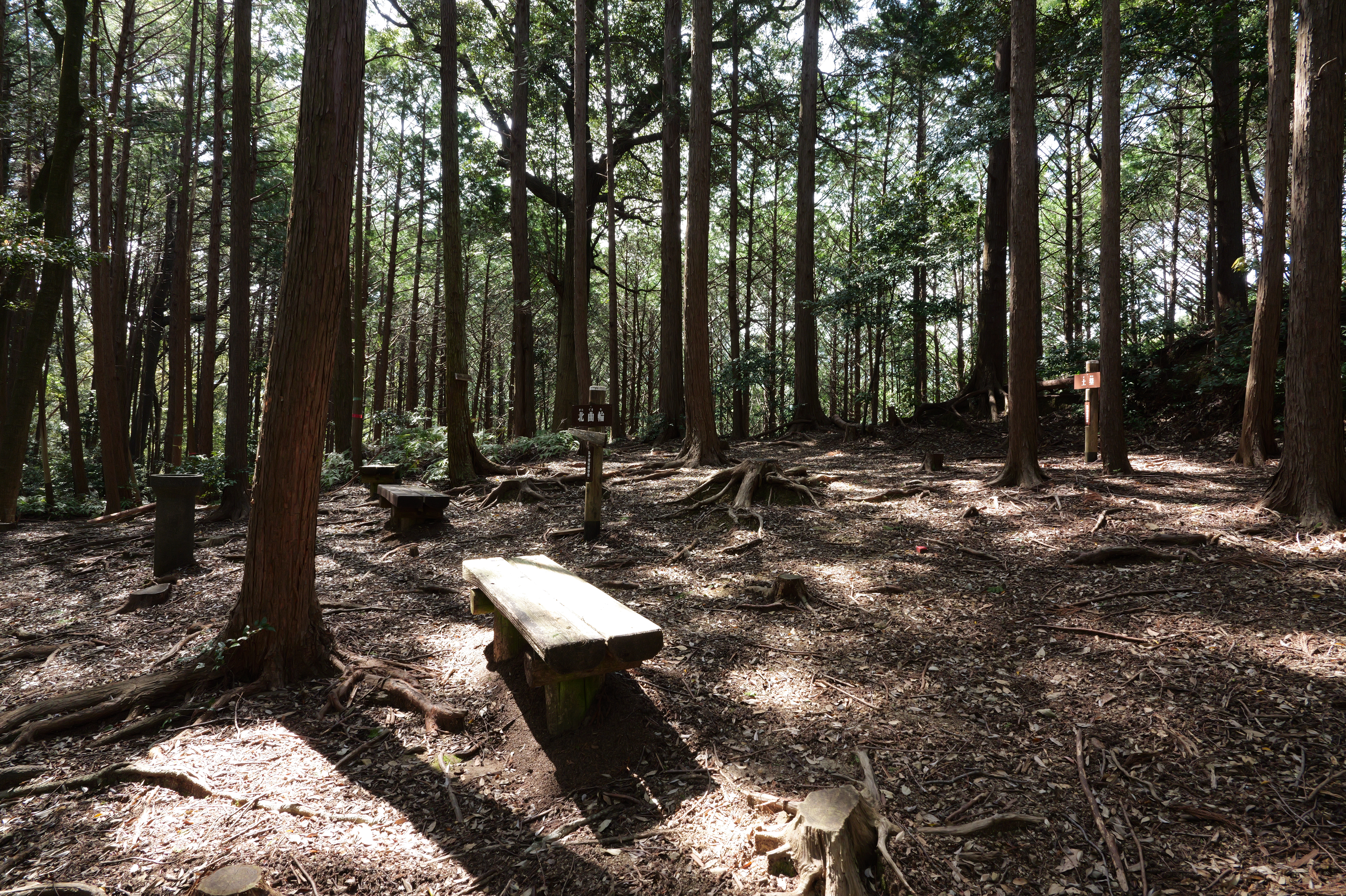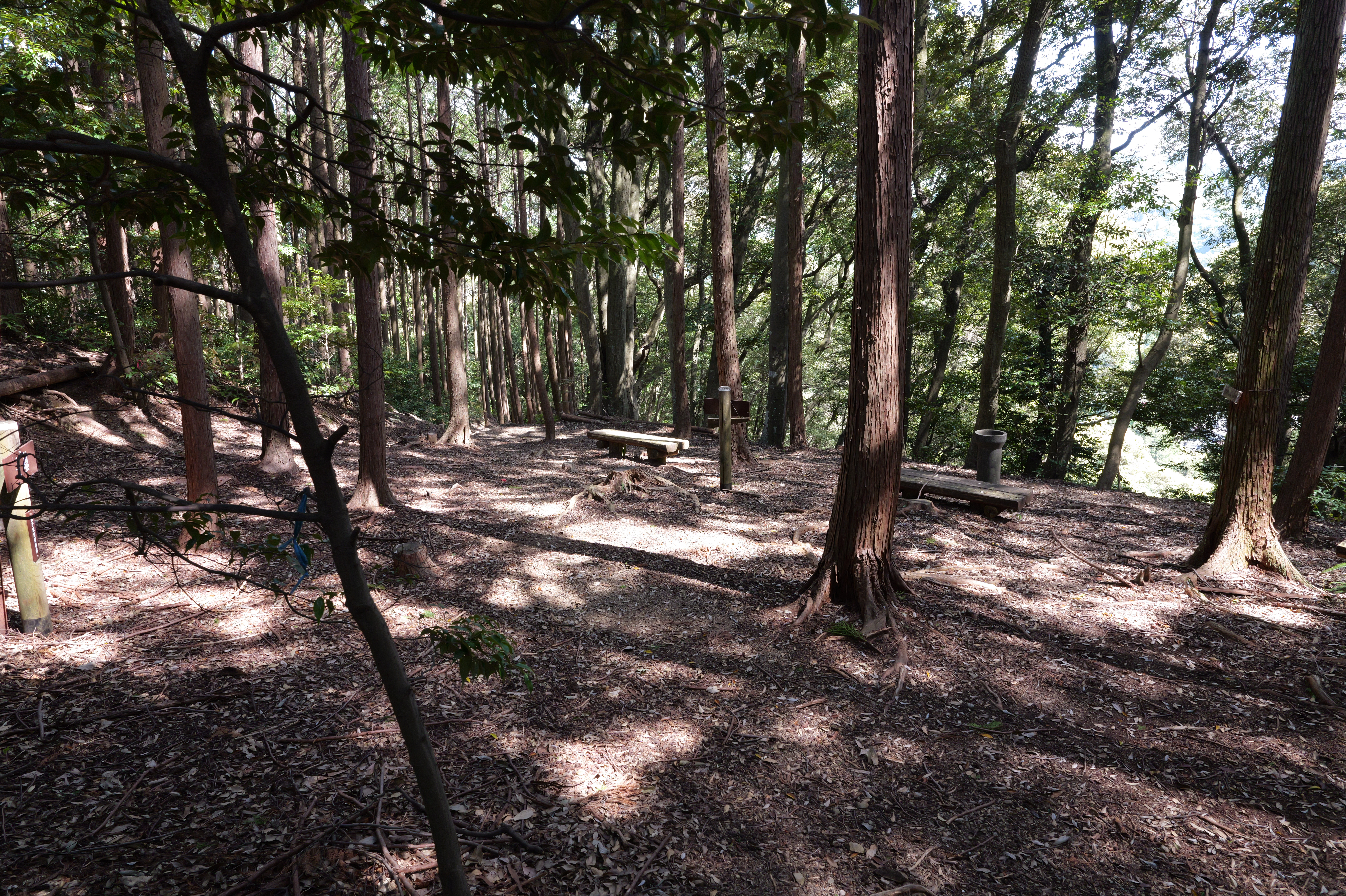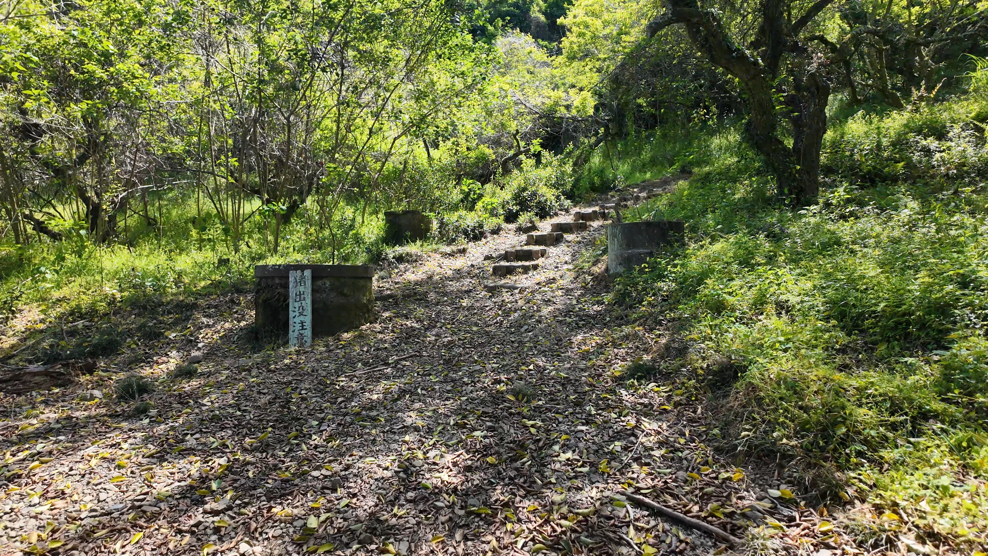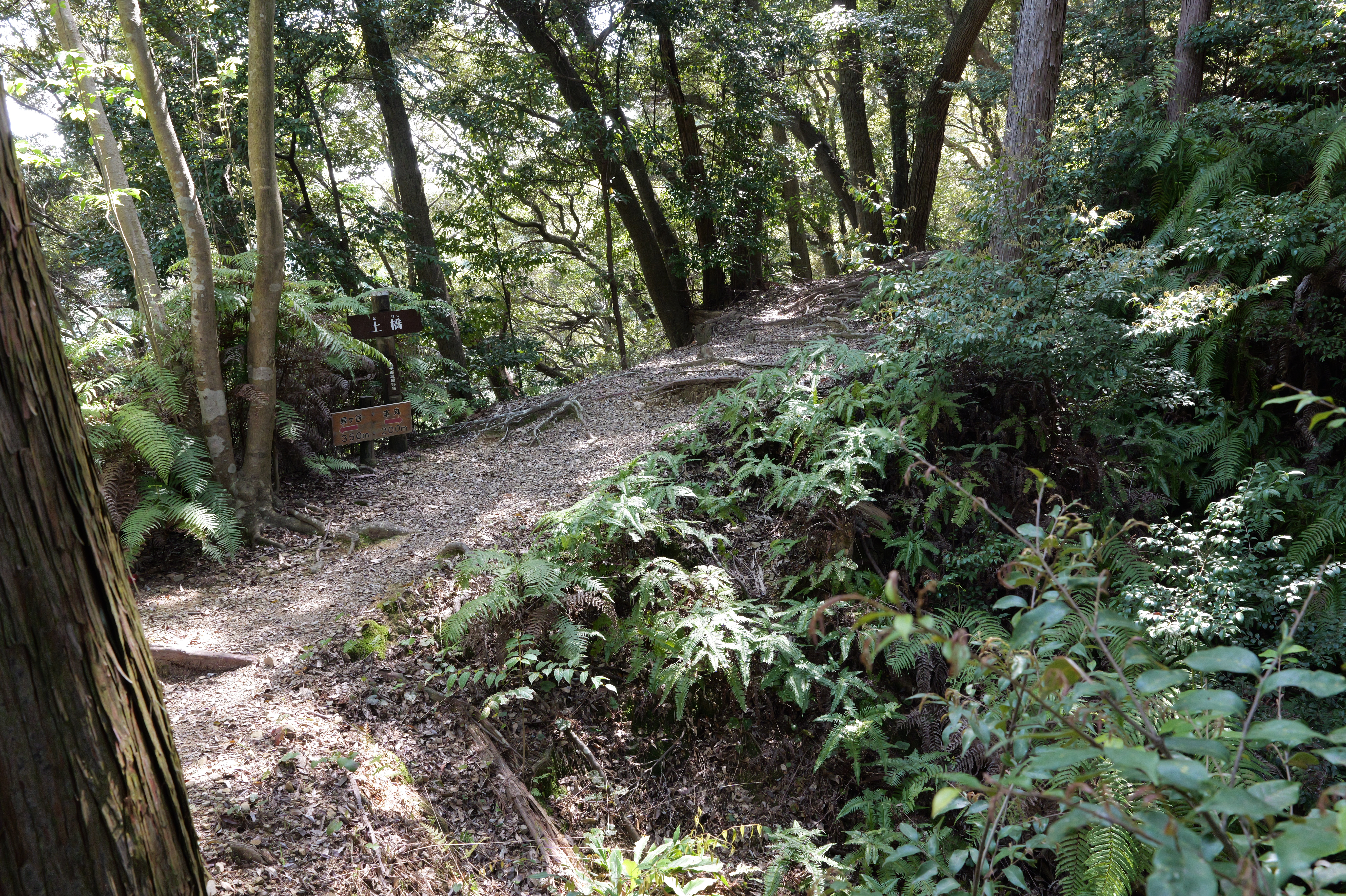 頂上まで200メートルを切った先の左に戻る感じで折れる場所に雛壇状石垣の案内板がありますが、ここまで独歩碑の道の開始地点から約14分ほどでした。まっすぐ進むと4段になった雛壇状石垣を下から見ることができます。