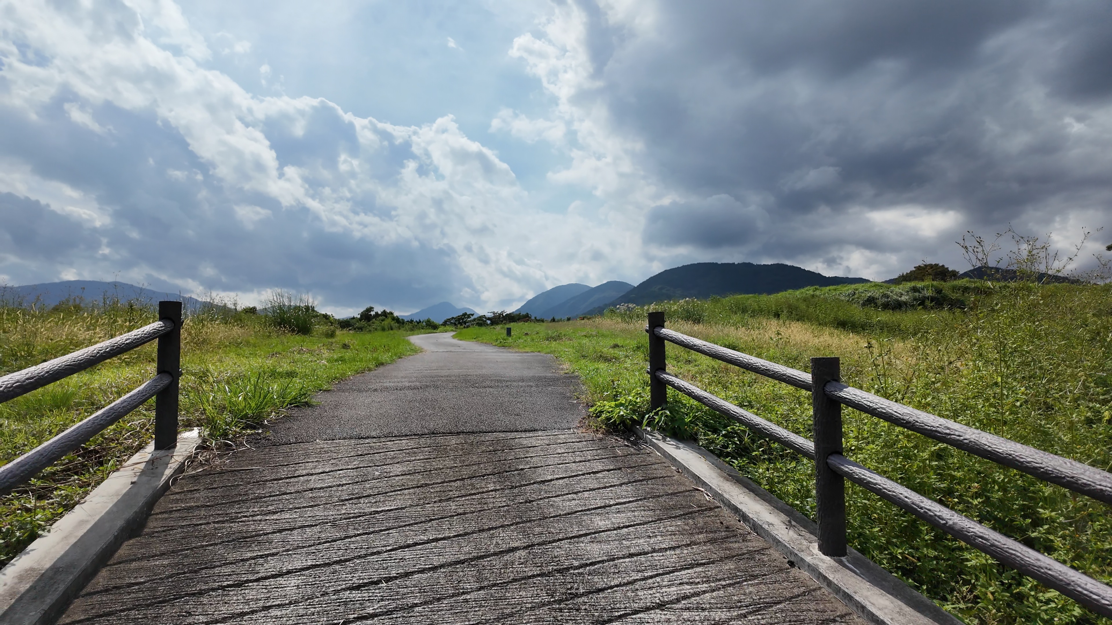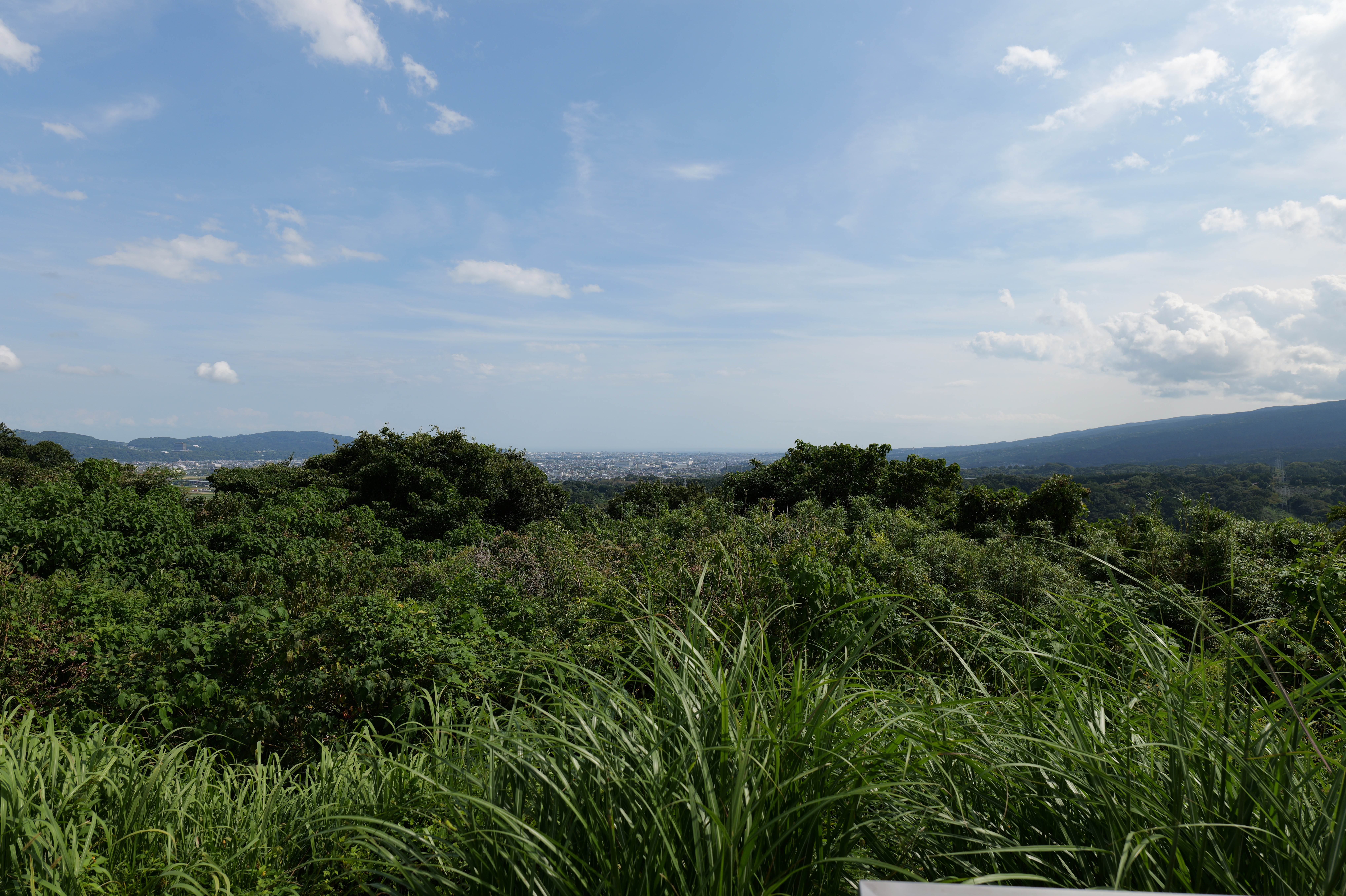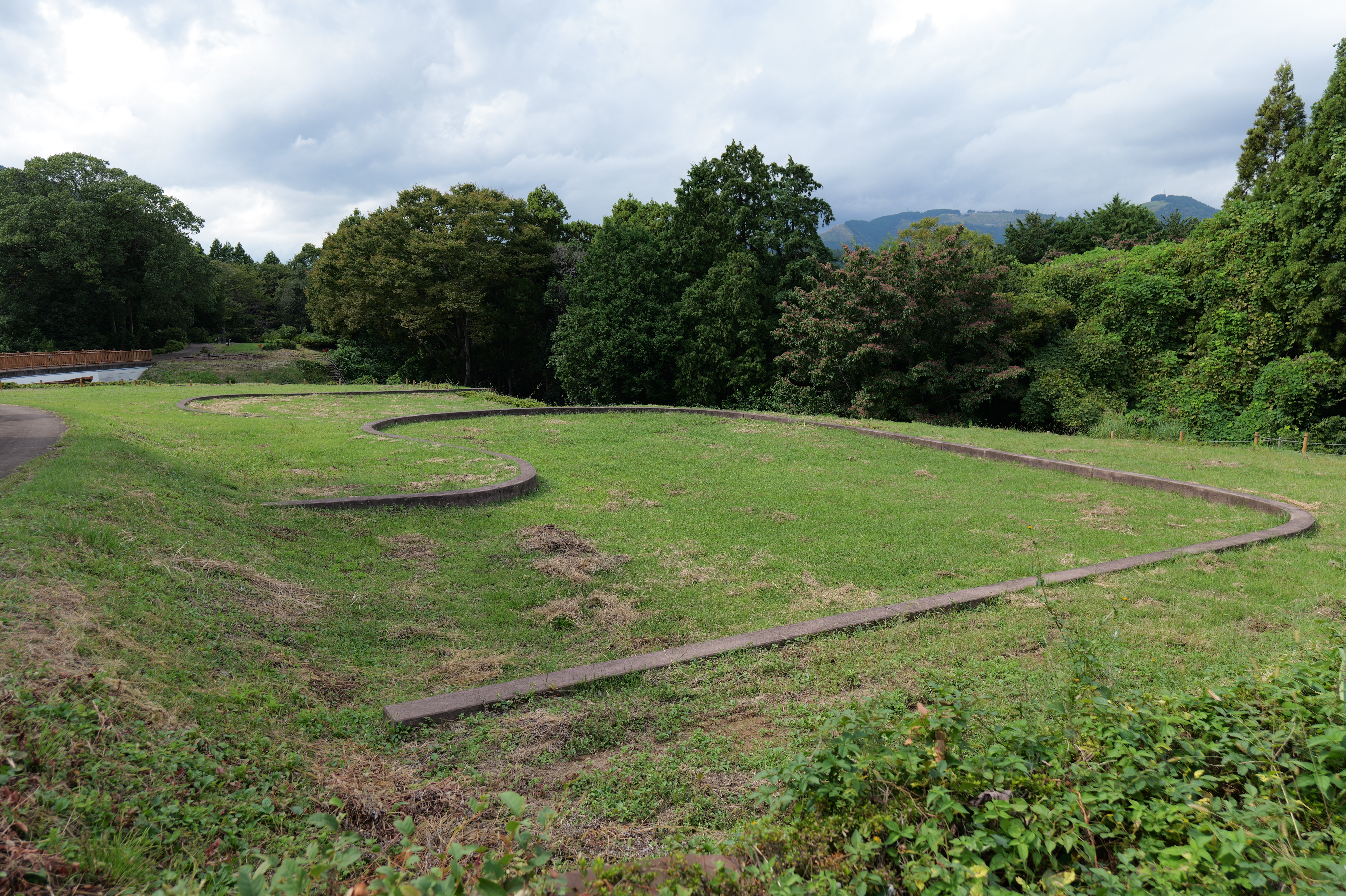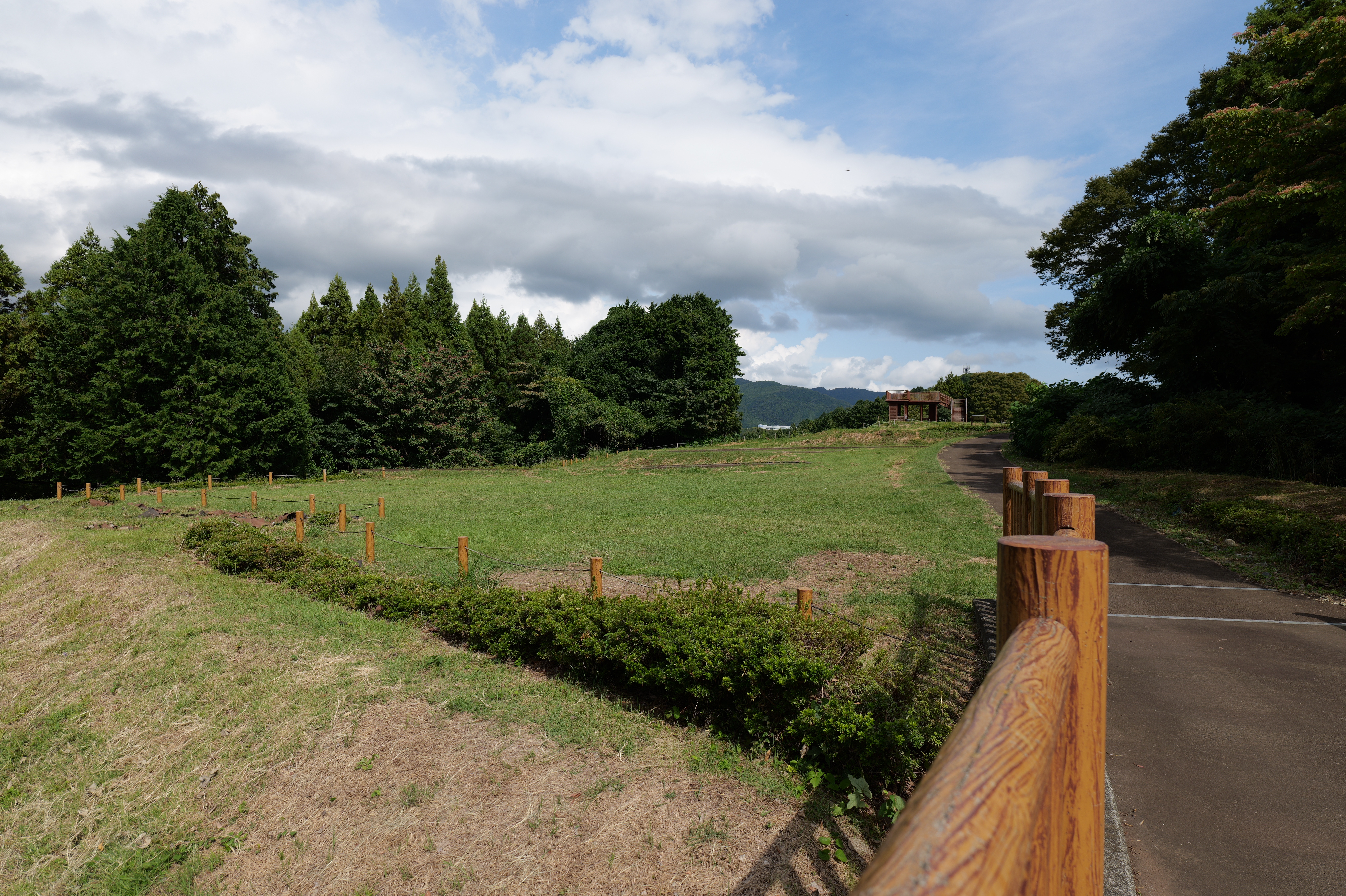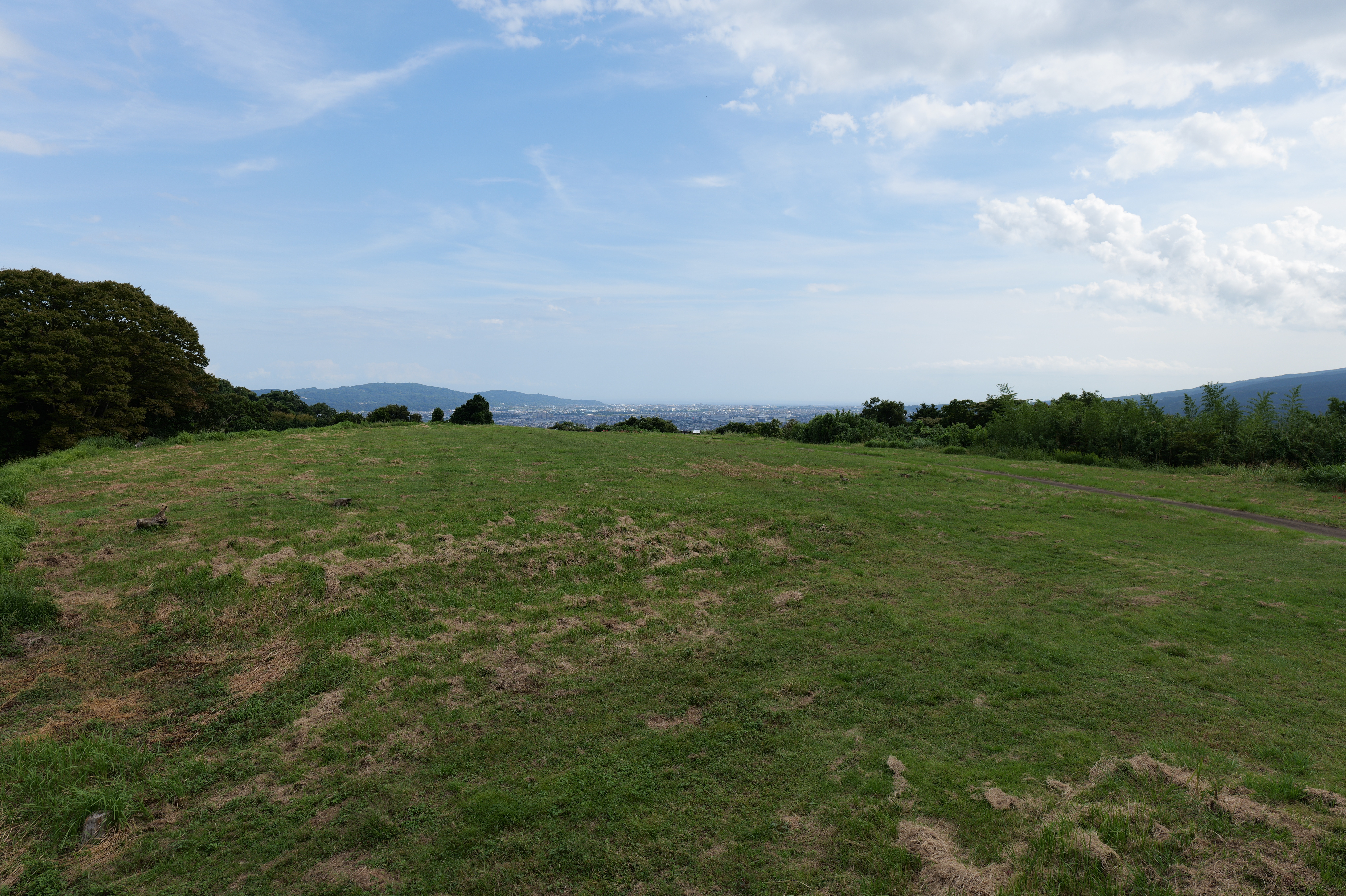 駐車場近くの登城口からだと、階段を登ったところは一の郭(本丸)です。東側には足柄明神姫玉手姫から名付けられた玉手ヶ池があります。底知らずの池または雨乞いの池と呼ばれ、底は小田原に通じている、池の水をかきまわし雨乞いをすれば必ず雨が降ったと言われます。本丸井戸とも言われます。一の郭は芝生で整備されていて、石碑の立つ西側隅には櫓があったと考えられています。石碑は生田蝶介の歌碑で「全貌を 裾野まで見せてあますなし 不二は悠然と 天ささげ立つ」。隣の石碑は「足柄公園」碑でした。一の郭北西隅に遊歩道入口。二の郭に続きます。