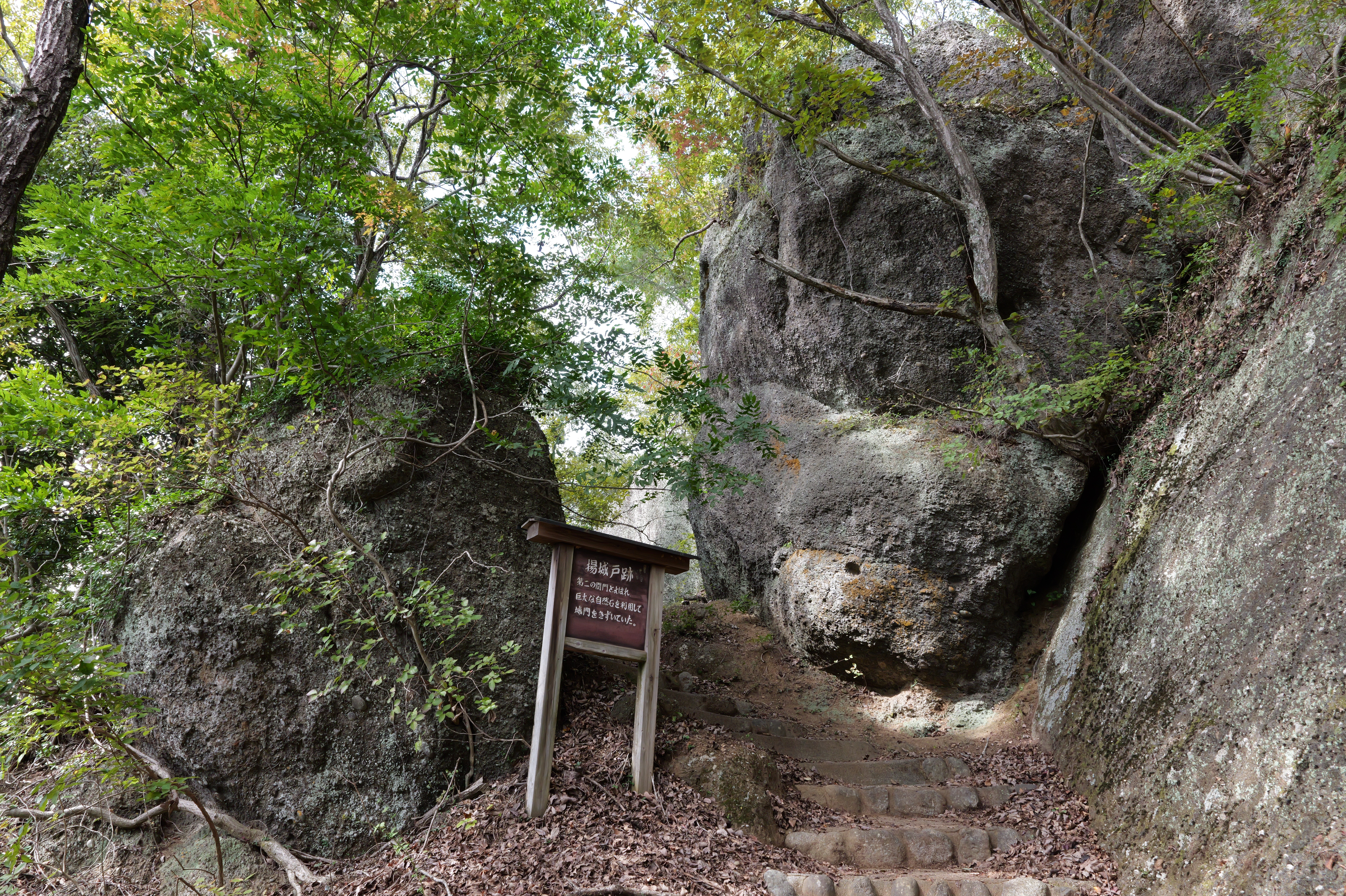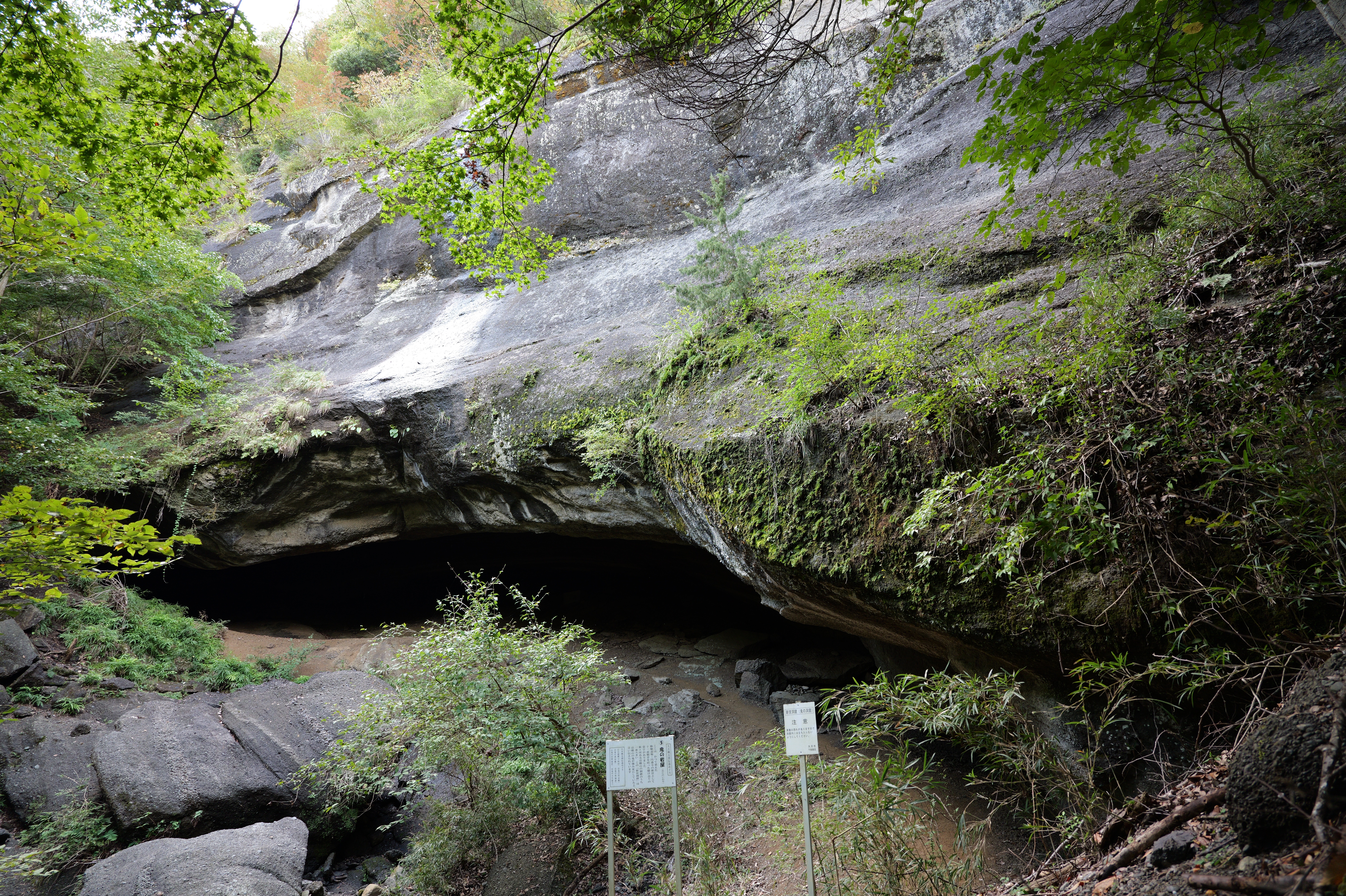 登り始めて5-6分の分岐点で、まずは左側へ進んで鬼の岩屋へ。鬼の岩屋(新宮洞窟)は修験道場・円通寺の新宮として十一面観音を祀った懸け造りの堂宇があったそうです。
