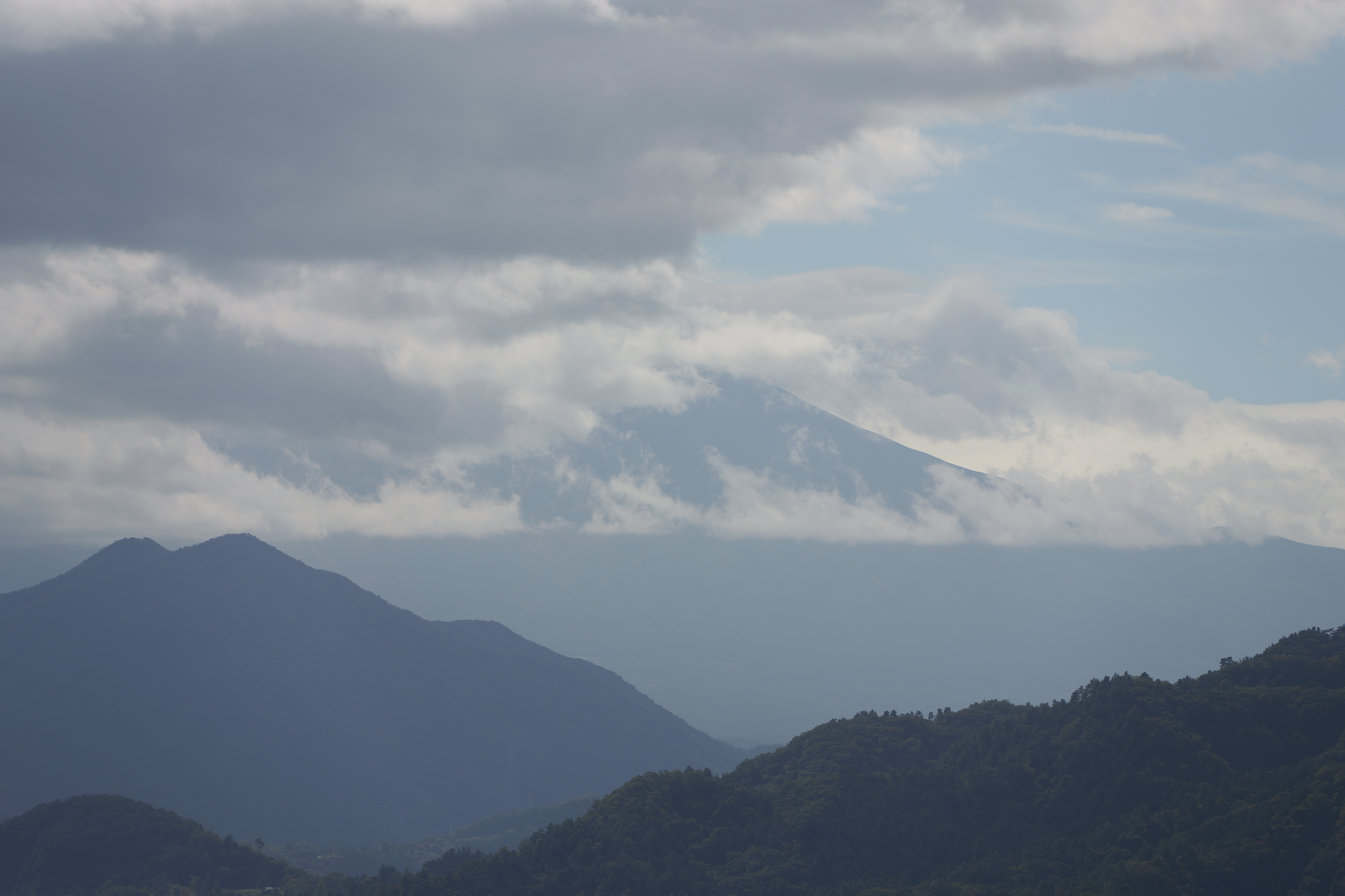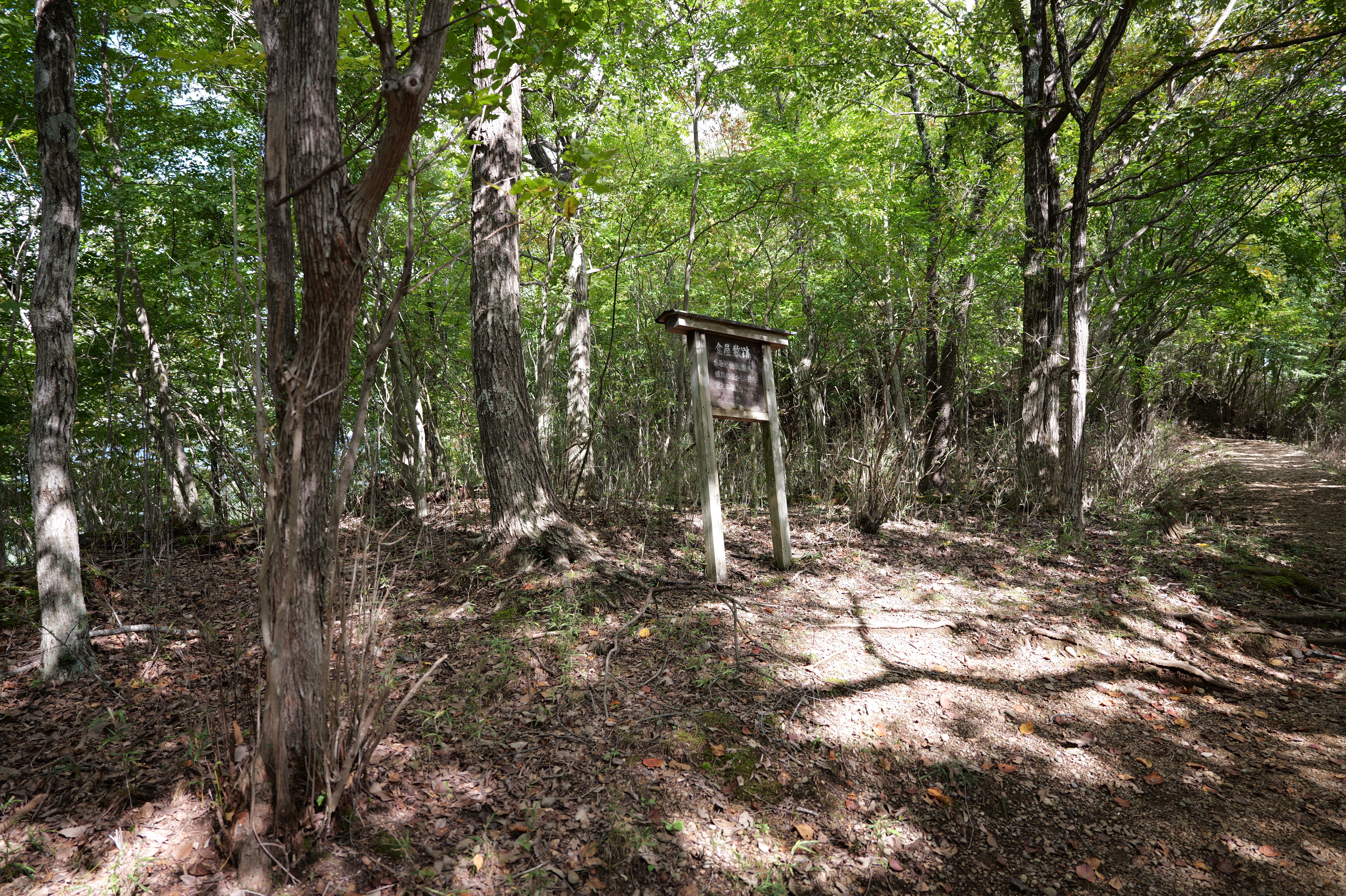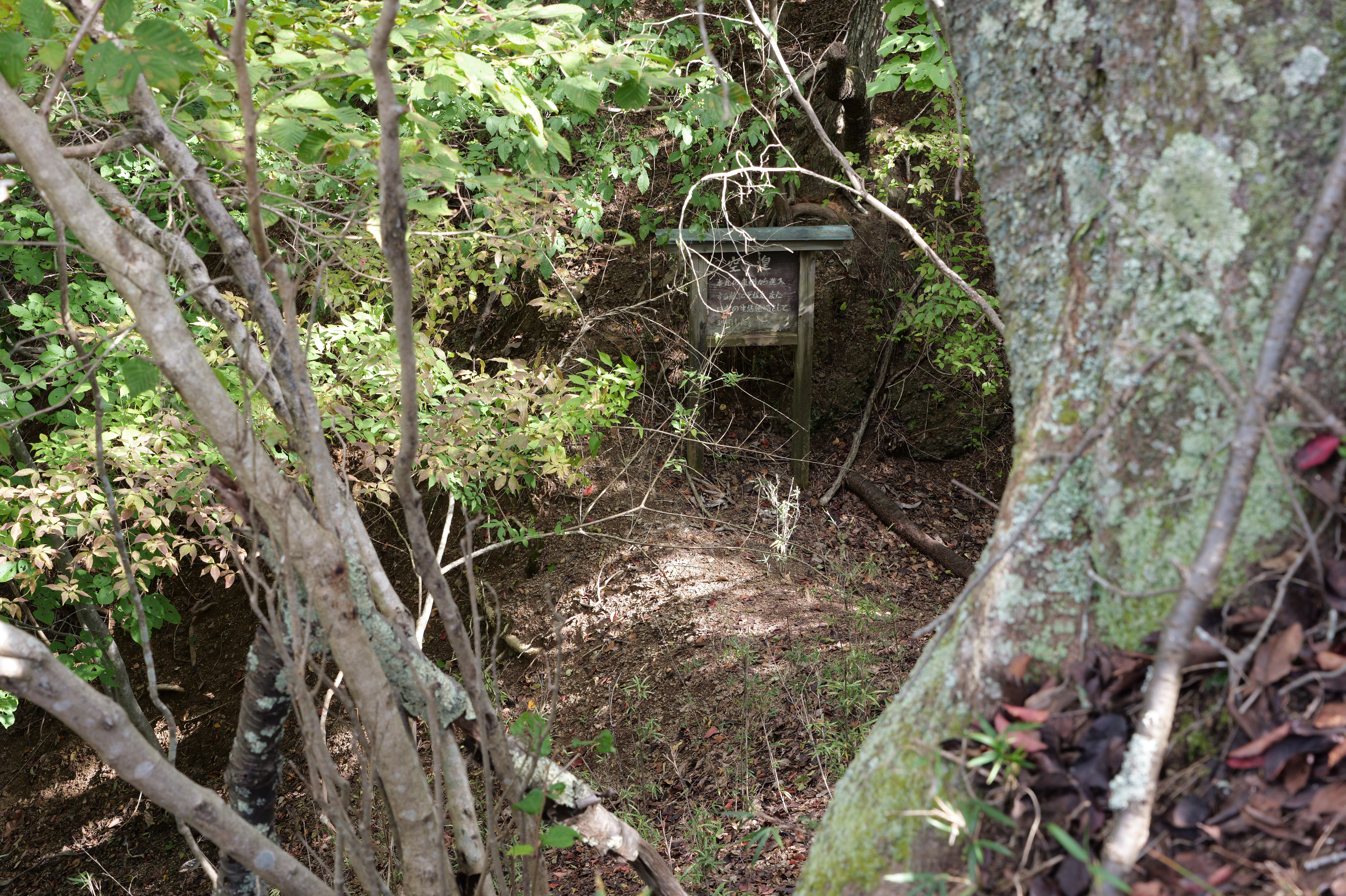 残念ながら富士山は雲に隠れています。通信施設の脇を通っていった東側先に空堀があります。案内板が見えるので以前は入れたようですが、今は通行禁止になっていて上から眺めるのみです。
