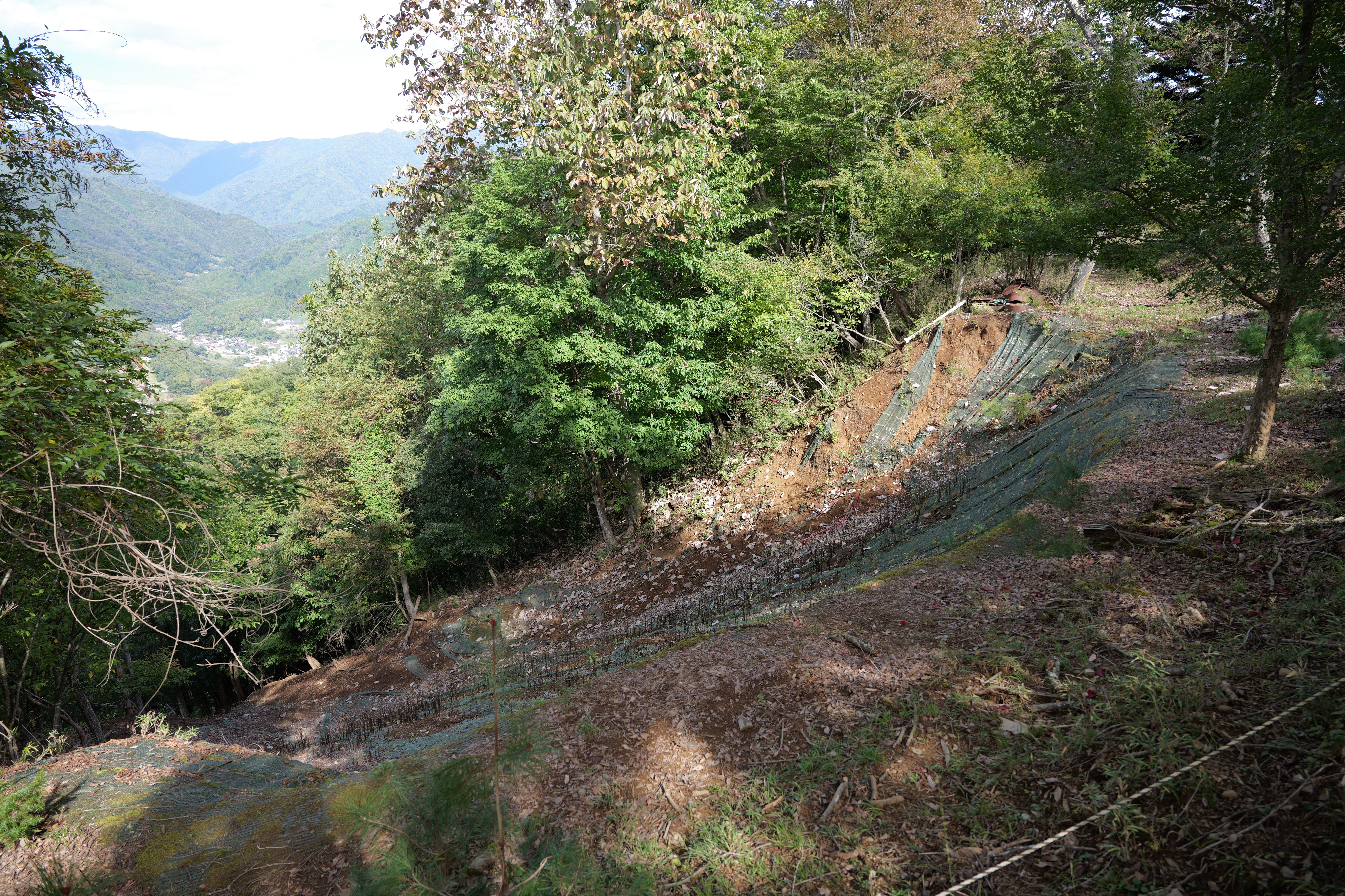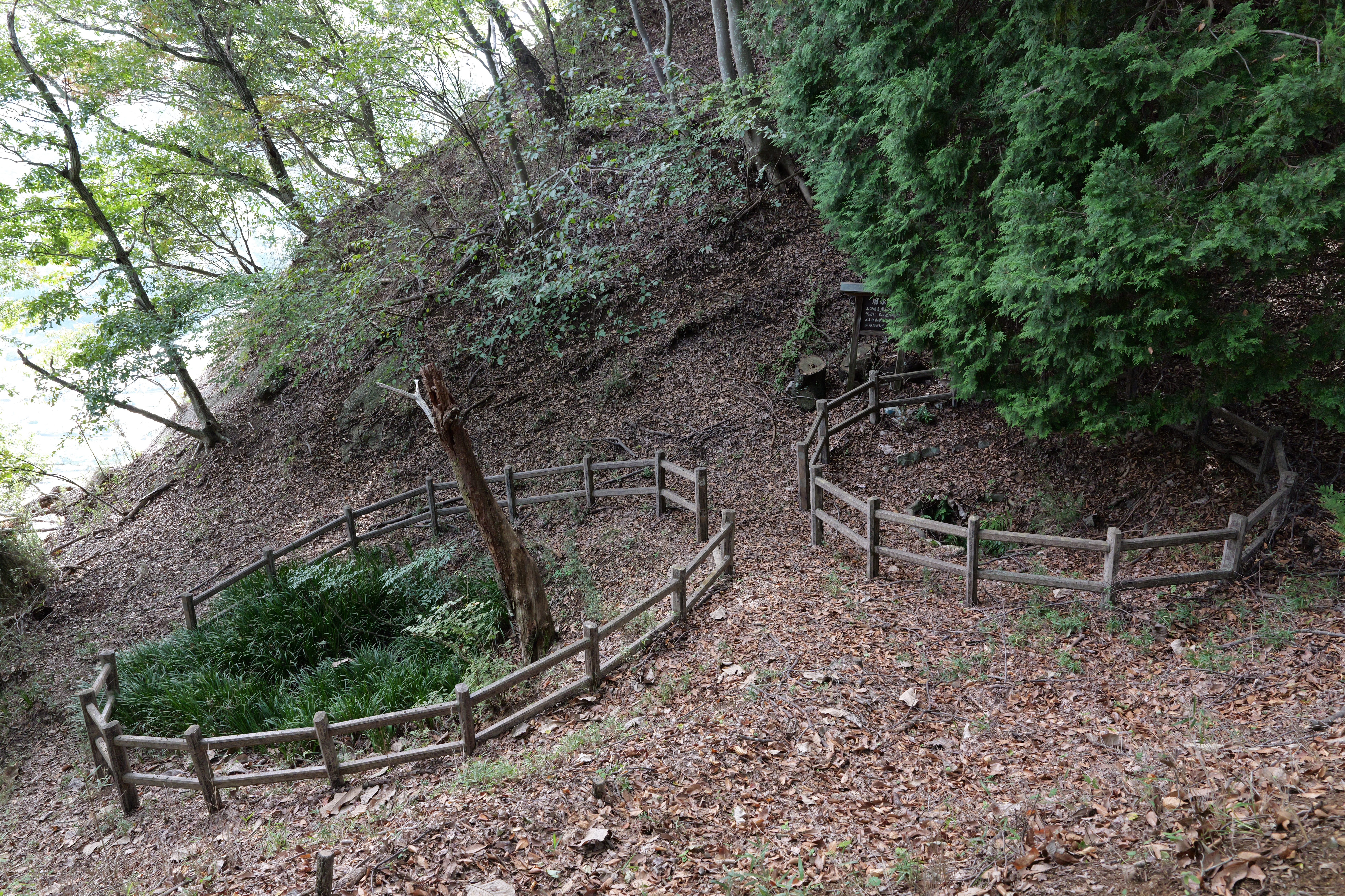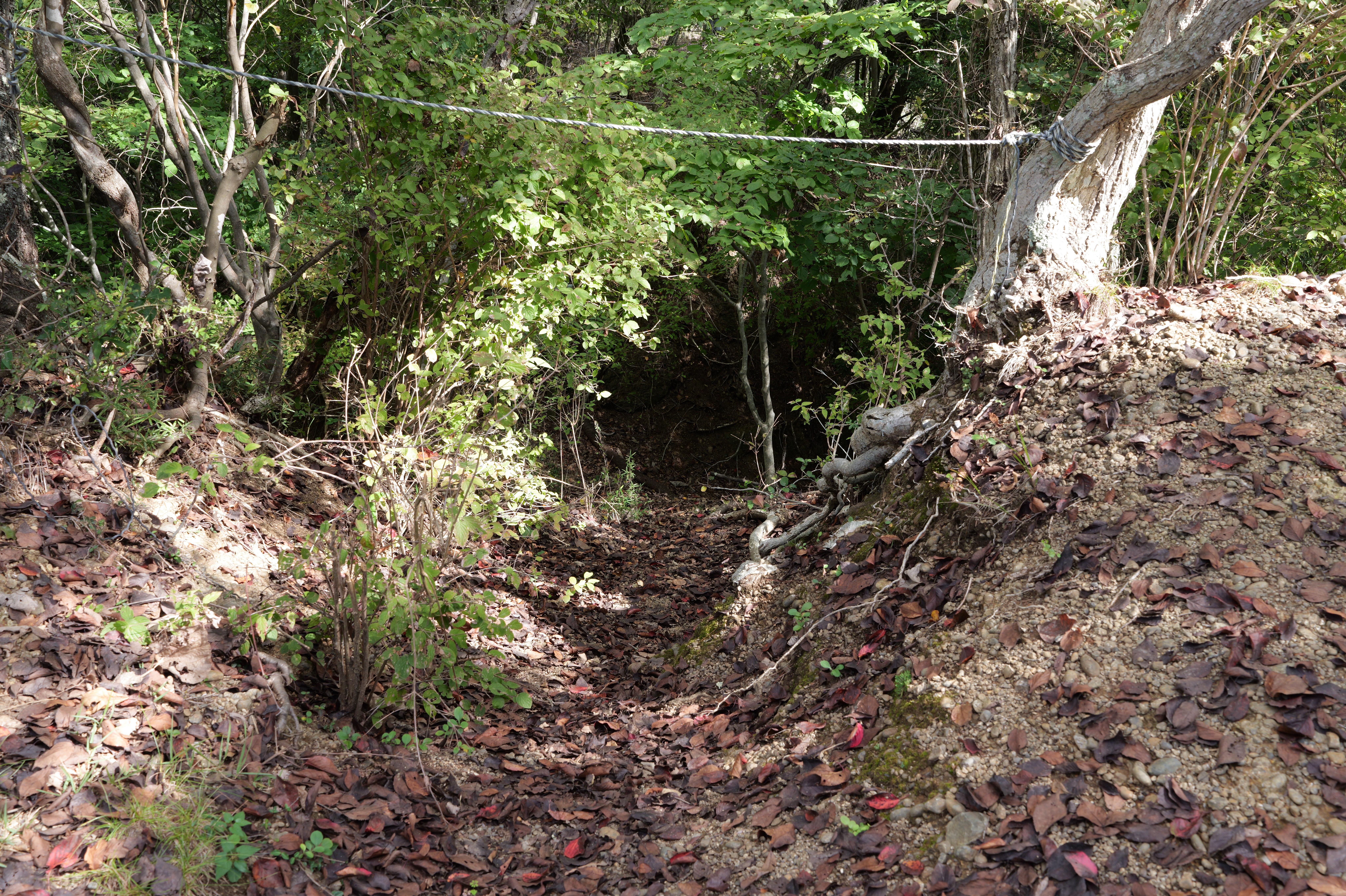 南櫓台からさらに西に進んで少し降りていくと、右側には馬屋跡。法面が崩れて立ち入り禁止となっています。