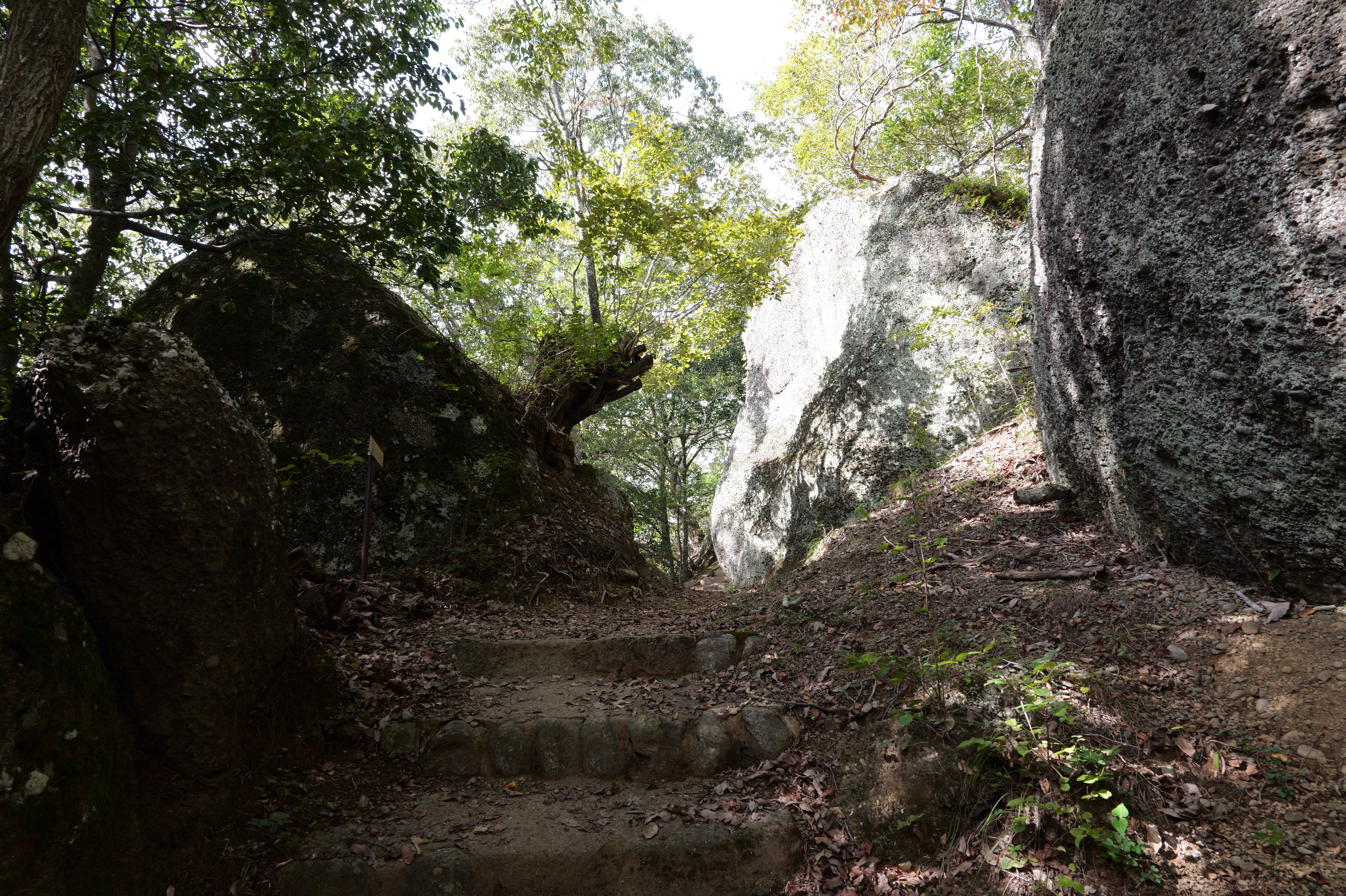 本丸のある山頂までは多少ゆるやかな部分があるものの、ひたすら急坂を登っていくことに。2~3か所トレッキングシューズでも容赦なくずるっといく場所がありましたが転倒はせずに済みました。途中2回ほど座っての休憩と数回の息整え立ち休憩をはさんで、