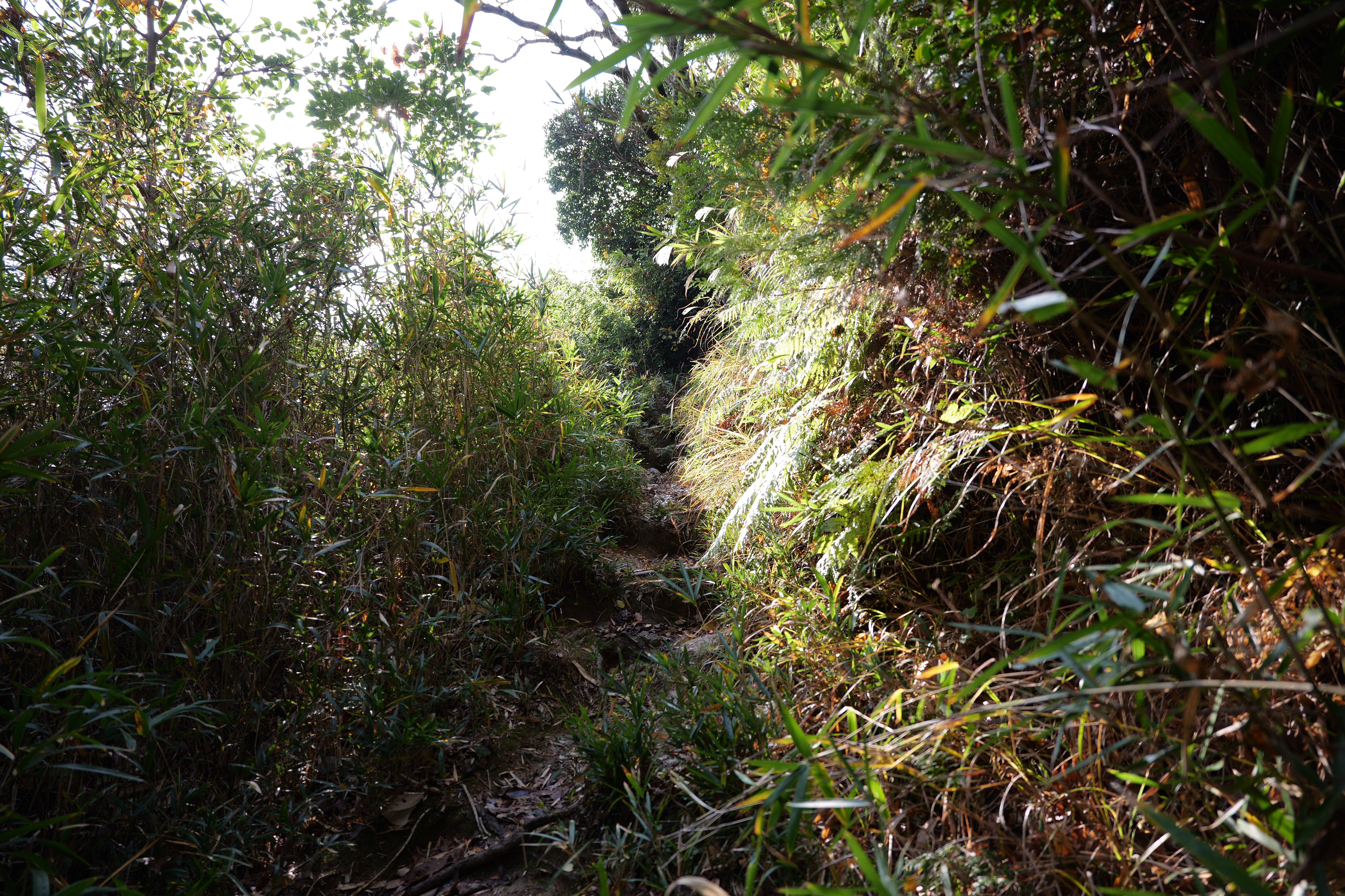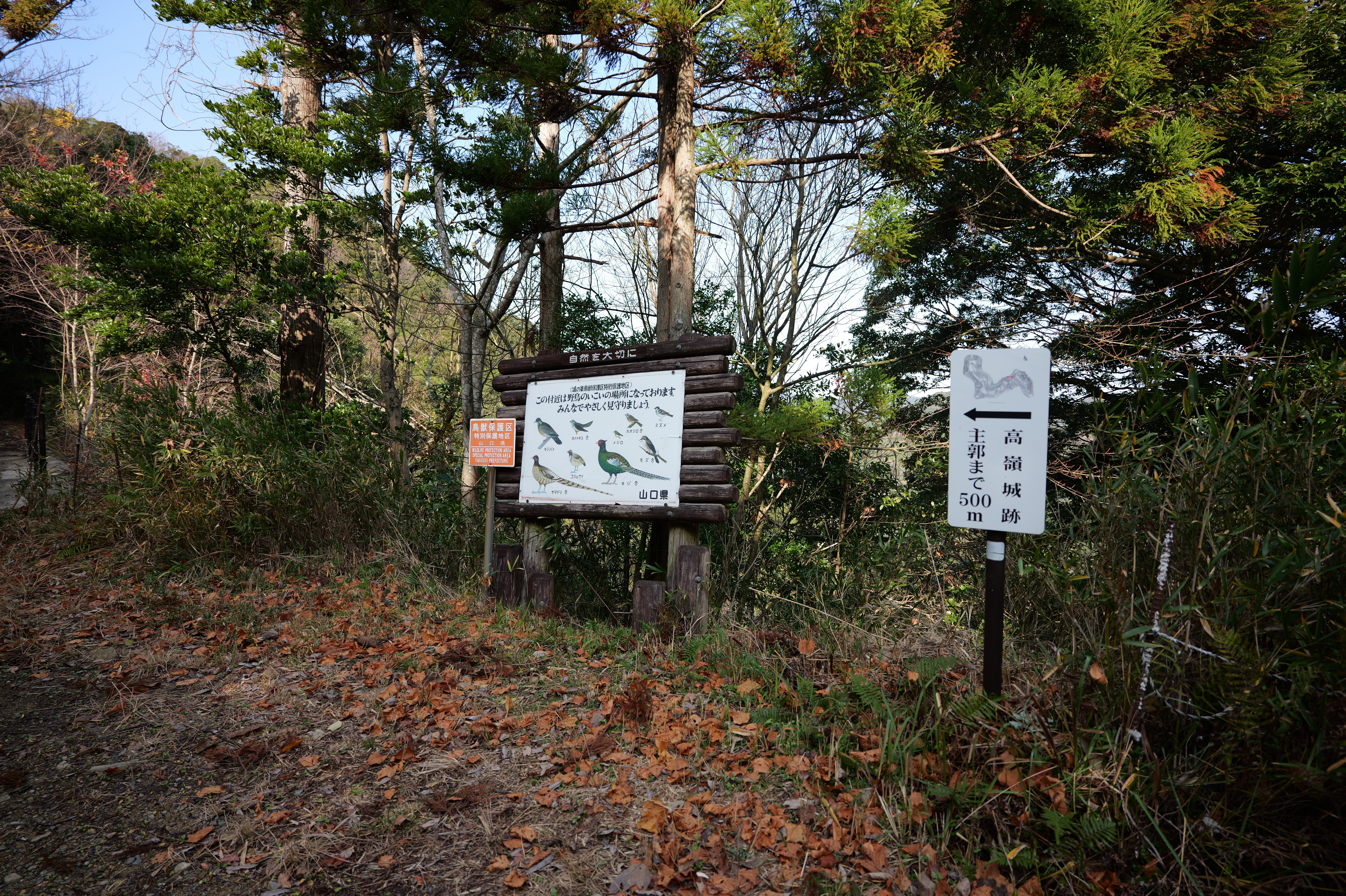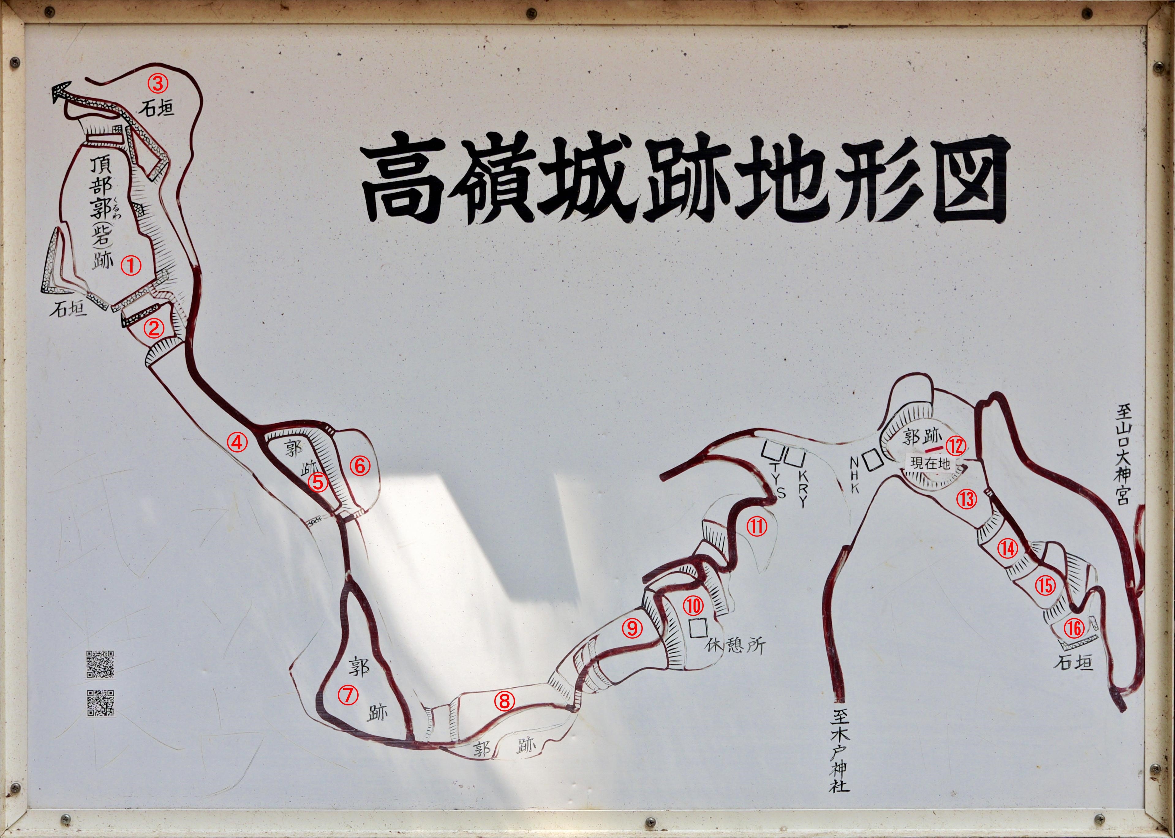 城跡には駐車スペースがありクルマで行けますが、そこまでの山道がとにかく狭くこれまでの中でも一番と言えるくらいでした。駐車スペースについたのは11:50ごろです。史跡の範囲は主郭までの西側と東側の段郭の区域です。最初に東側の一番上の郭(その下の郭はのちほど)で案内板を確認しました。高嶺城にはたくさんの郭がありますが、名称などがないので案内板にあった地形図に便宜上番号を振ってこのあと進めます。