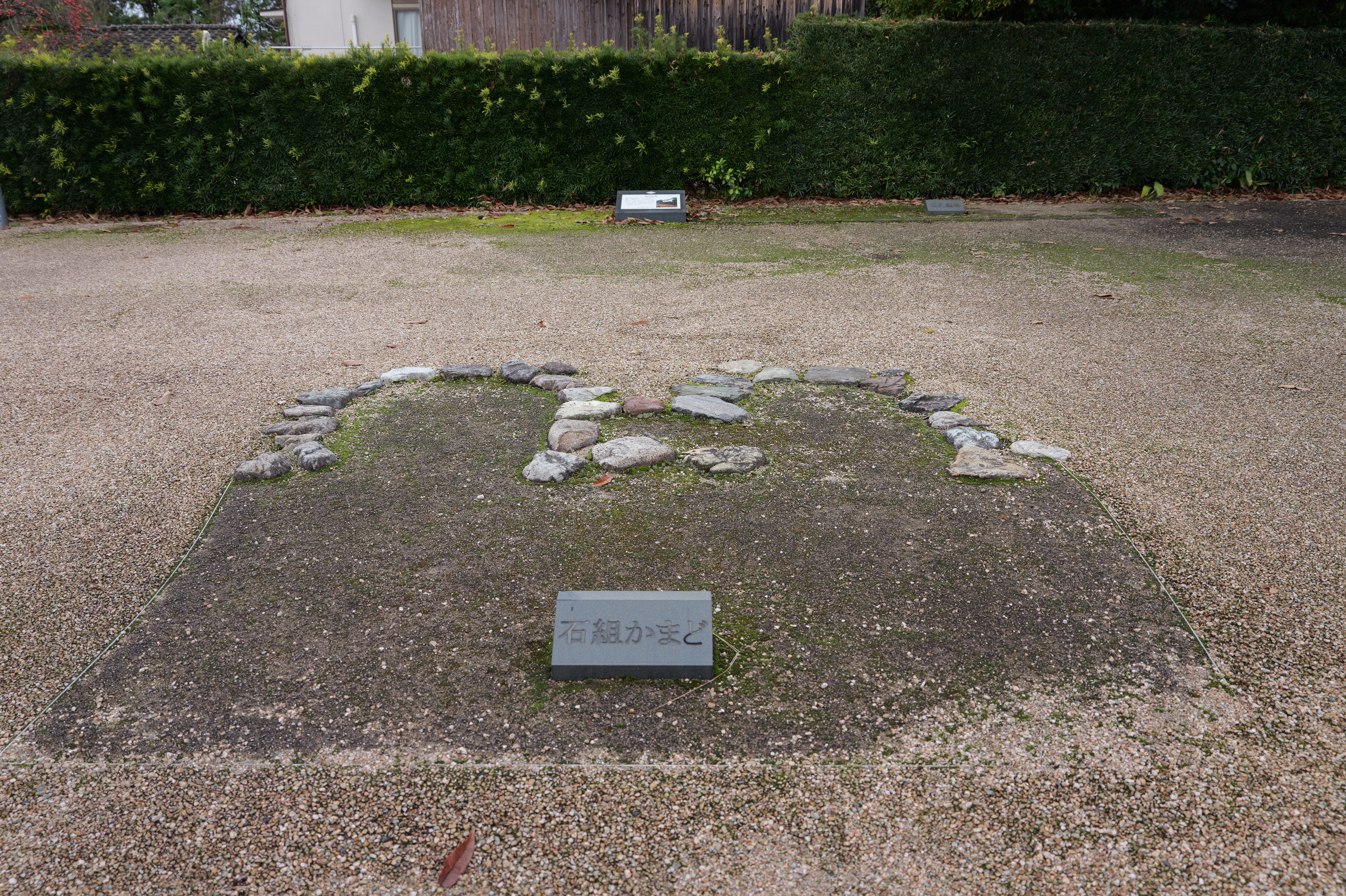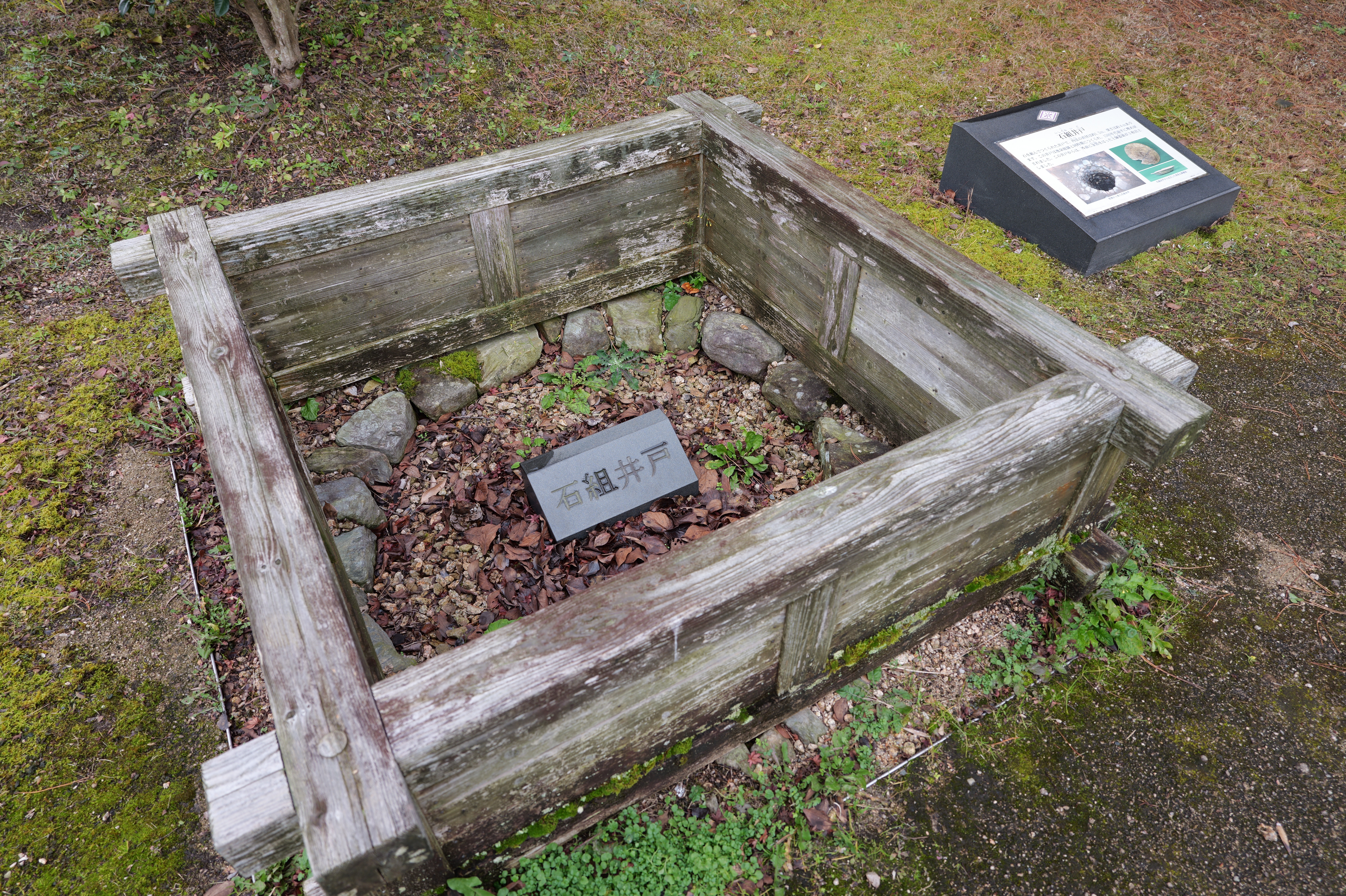 土塁に沿って西へ進むと、北西隅付近に枯山水庭園(3号庭園)が復元されています。出土した石組を使って築城当時とほぼ同じ状態に復元されているそうです。南に進むと西門があり屋敷の中の区画を仕切る「内門」と考えられています。そのすぐ先には16世紀前半のものを修復した石組水路があります。