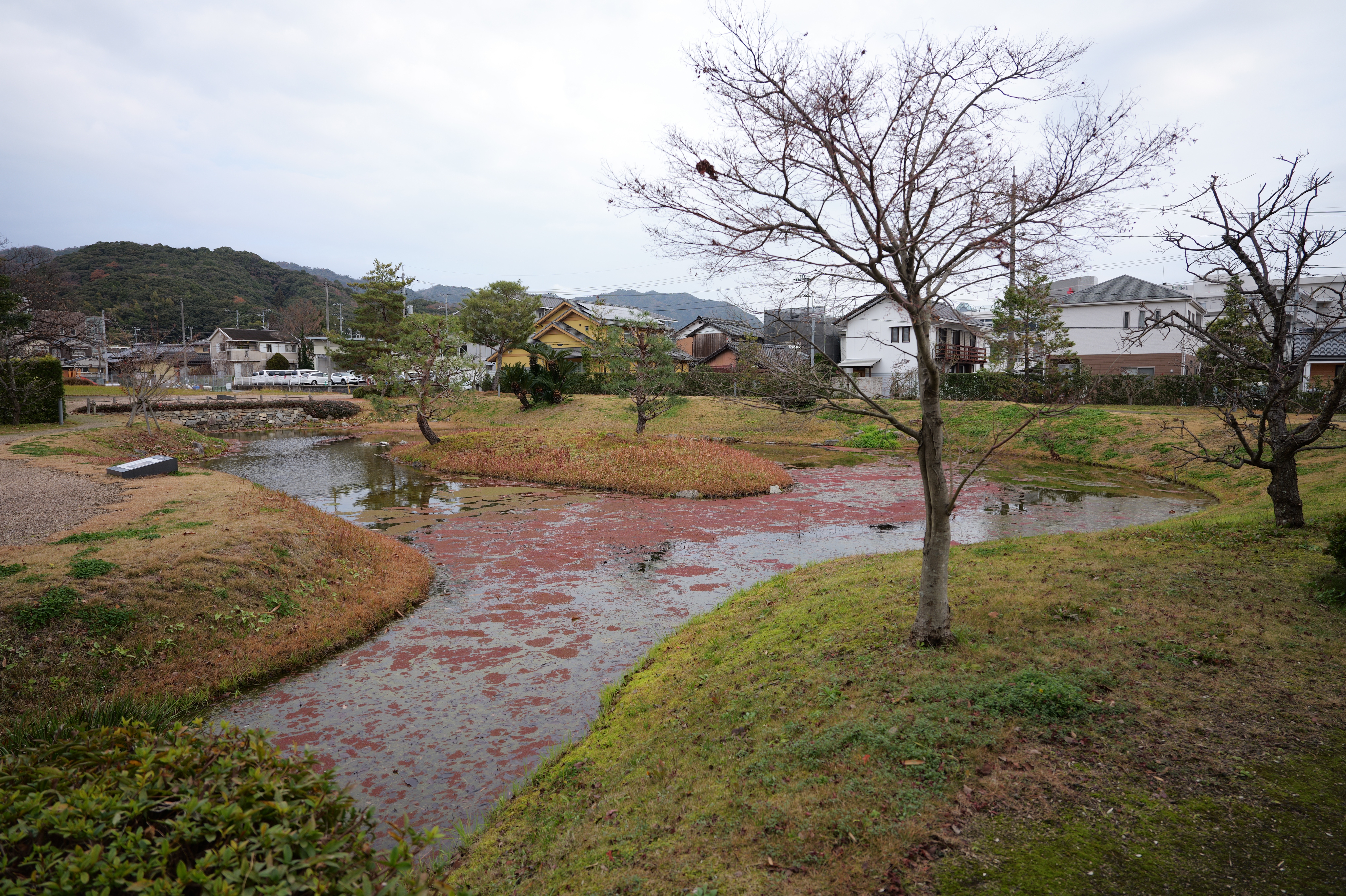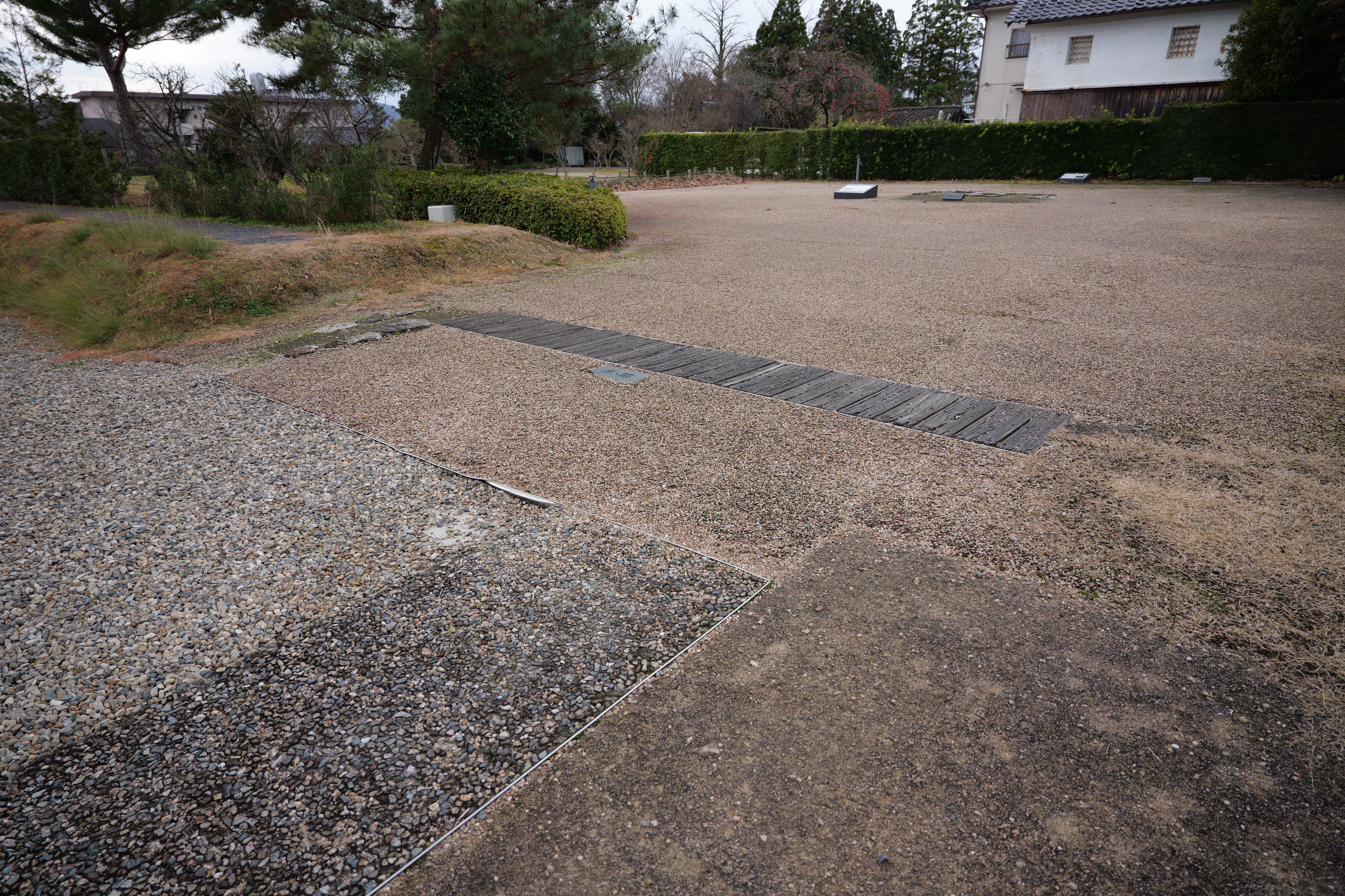 本堂に向かって右側には当時の形状をそのまま残す形で発掘・復元された池泉庭園(2号庭園)があり、池の南側に石組井戸、池の南東側に庭の観賞用と考えられる建物跡、北側には石組かまど・せん列建物跡があります。1号庭園や4号庭園も発掘されましたが埋め戻されています。館跡東側に出ると水路や堀の跡が整備されています。