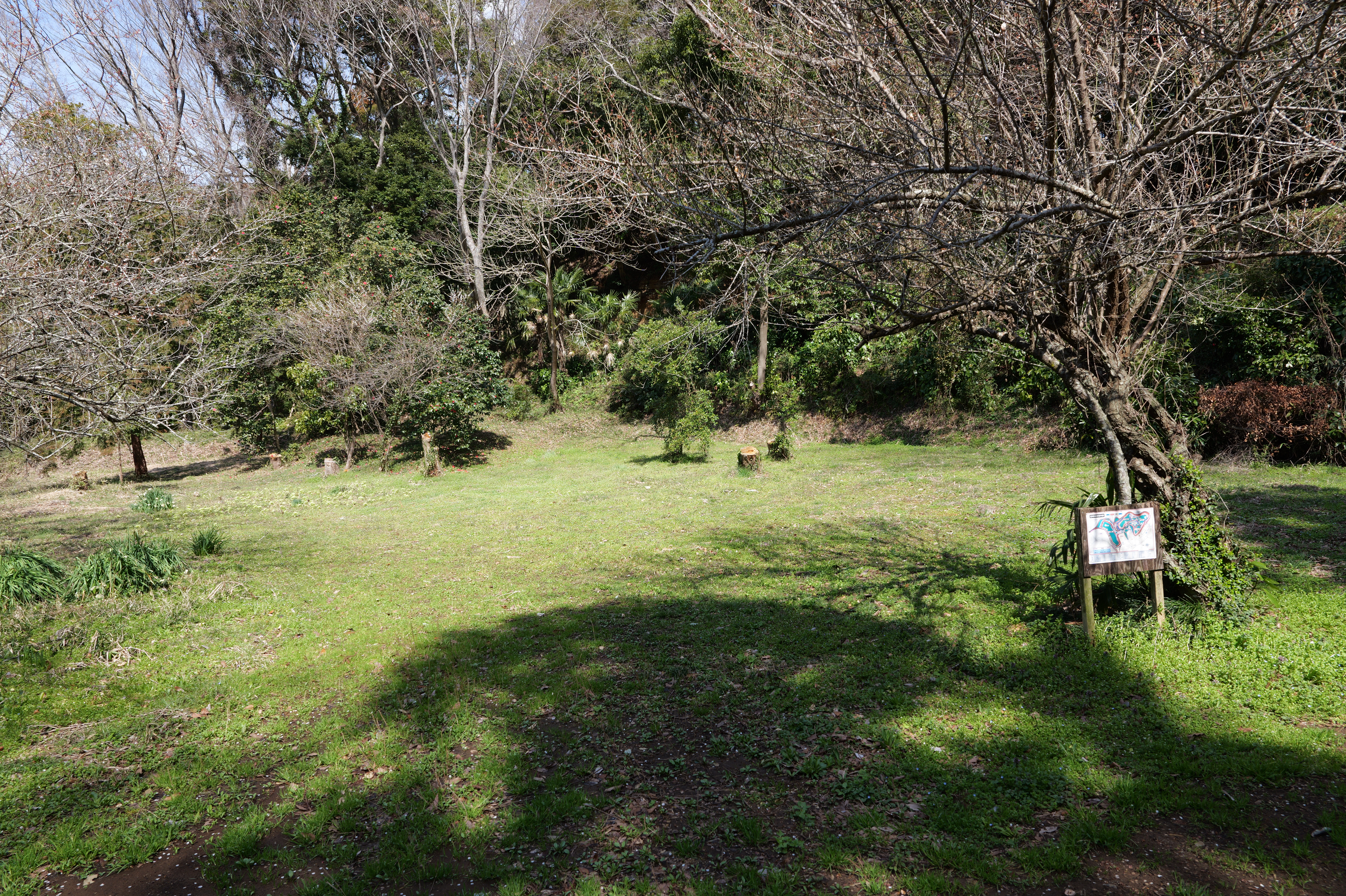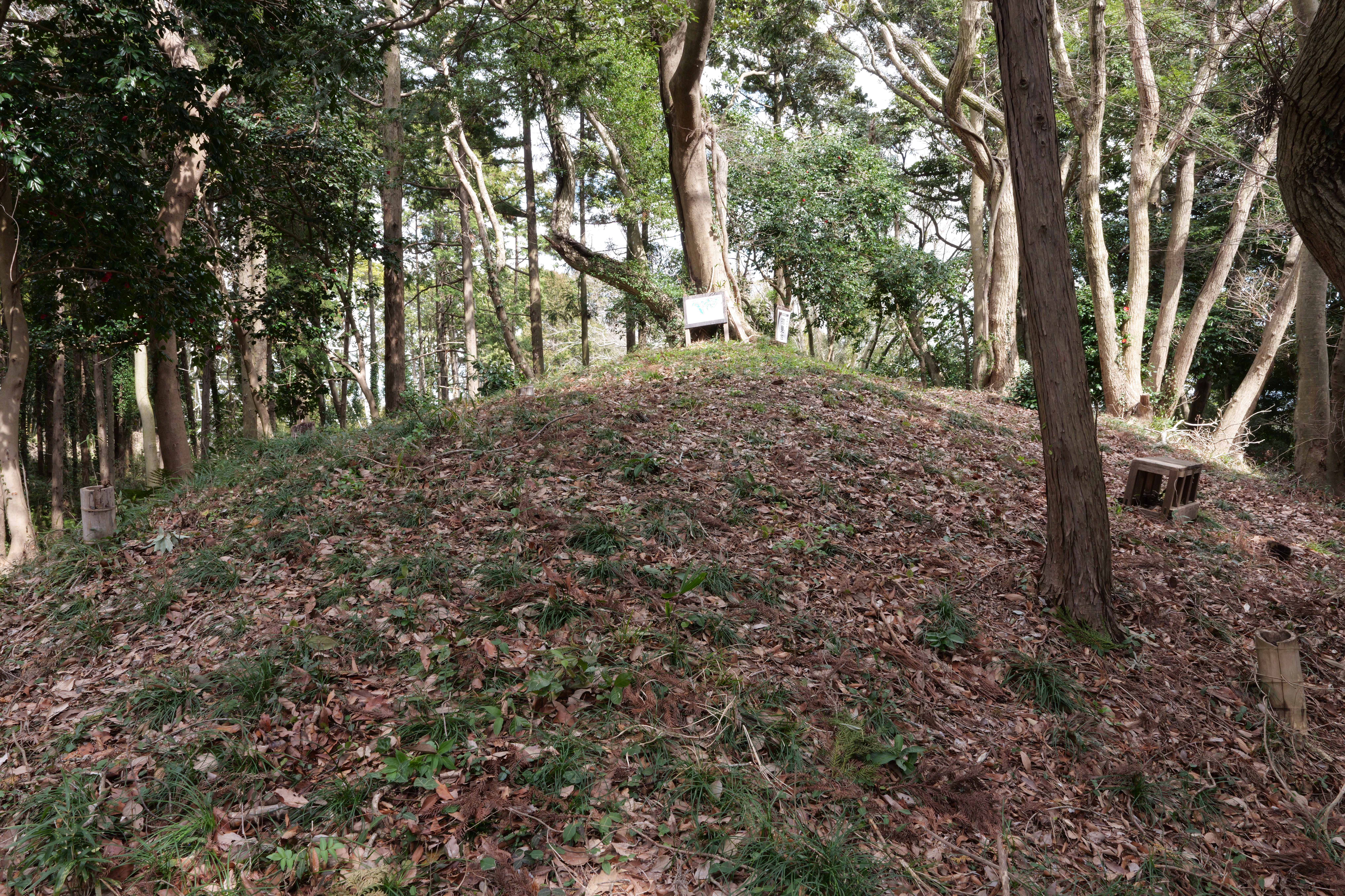 帯曲輪の虎口を抜けると左側下には坊主屋敷、正面には物見台が見えてきます。物見台の前には、右へ行くと物見台(二重空堀)、左に下りると三の曲輪・大堀との案内。ここでは物見台を挟んだ二重空堀の南側の空堀(物見台 – 東二の曲輪間)を見るために右へ。