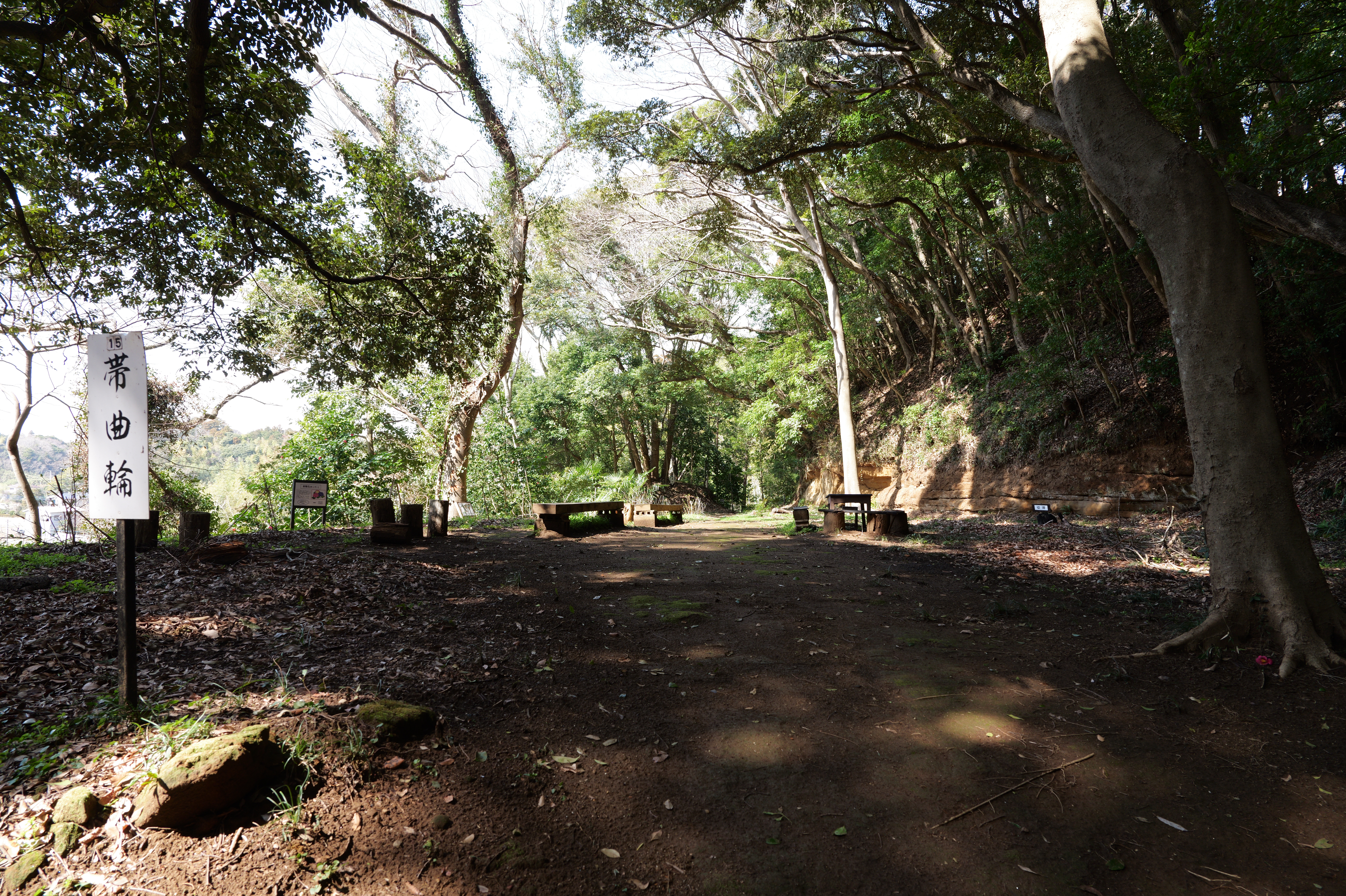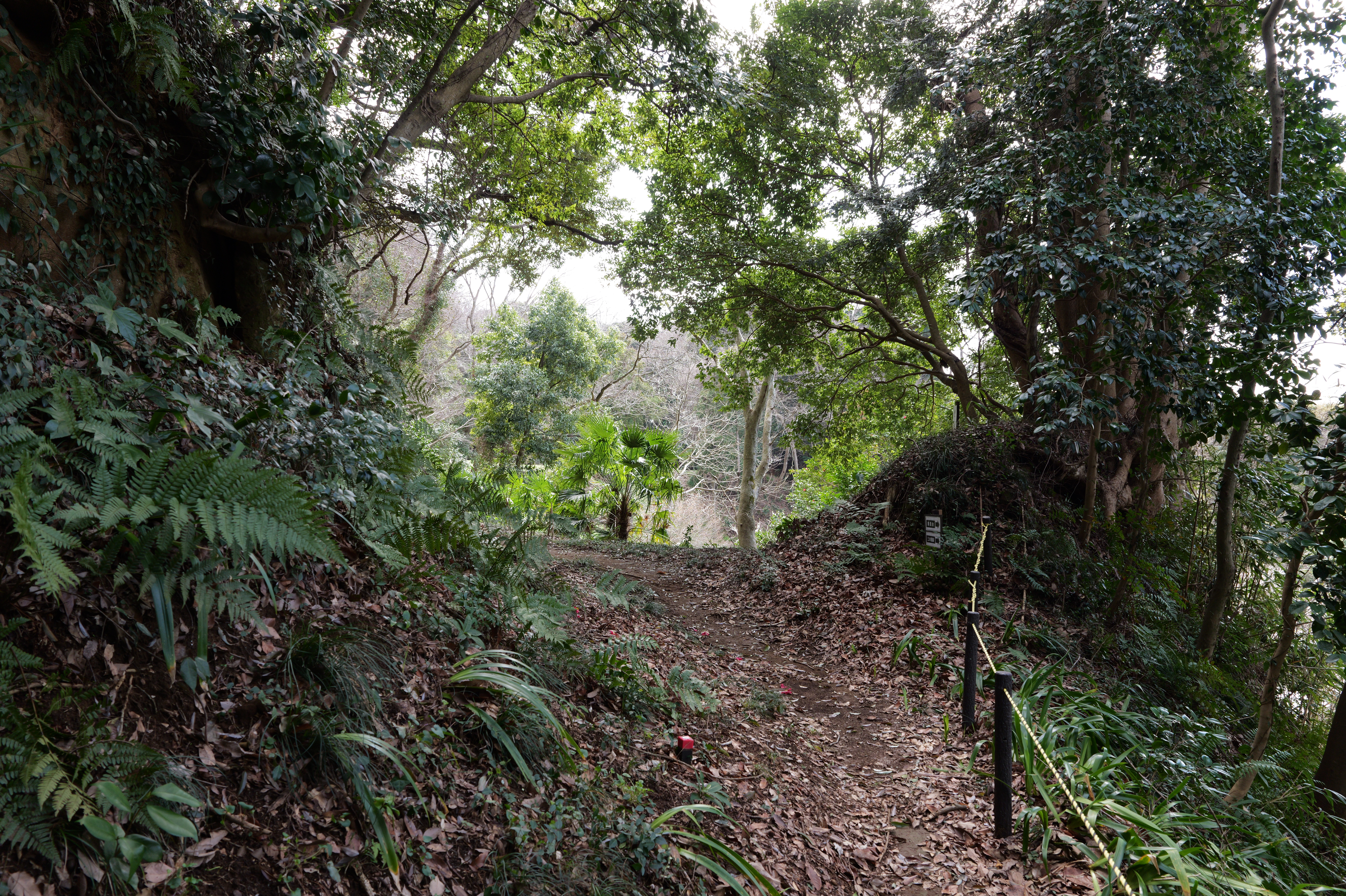 左に進んですぐに帯曲輪。ここは東二の曲輪の西下に位置します。一番奥には虎口があります。
