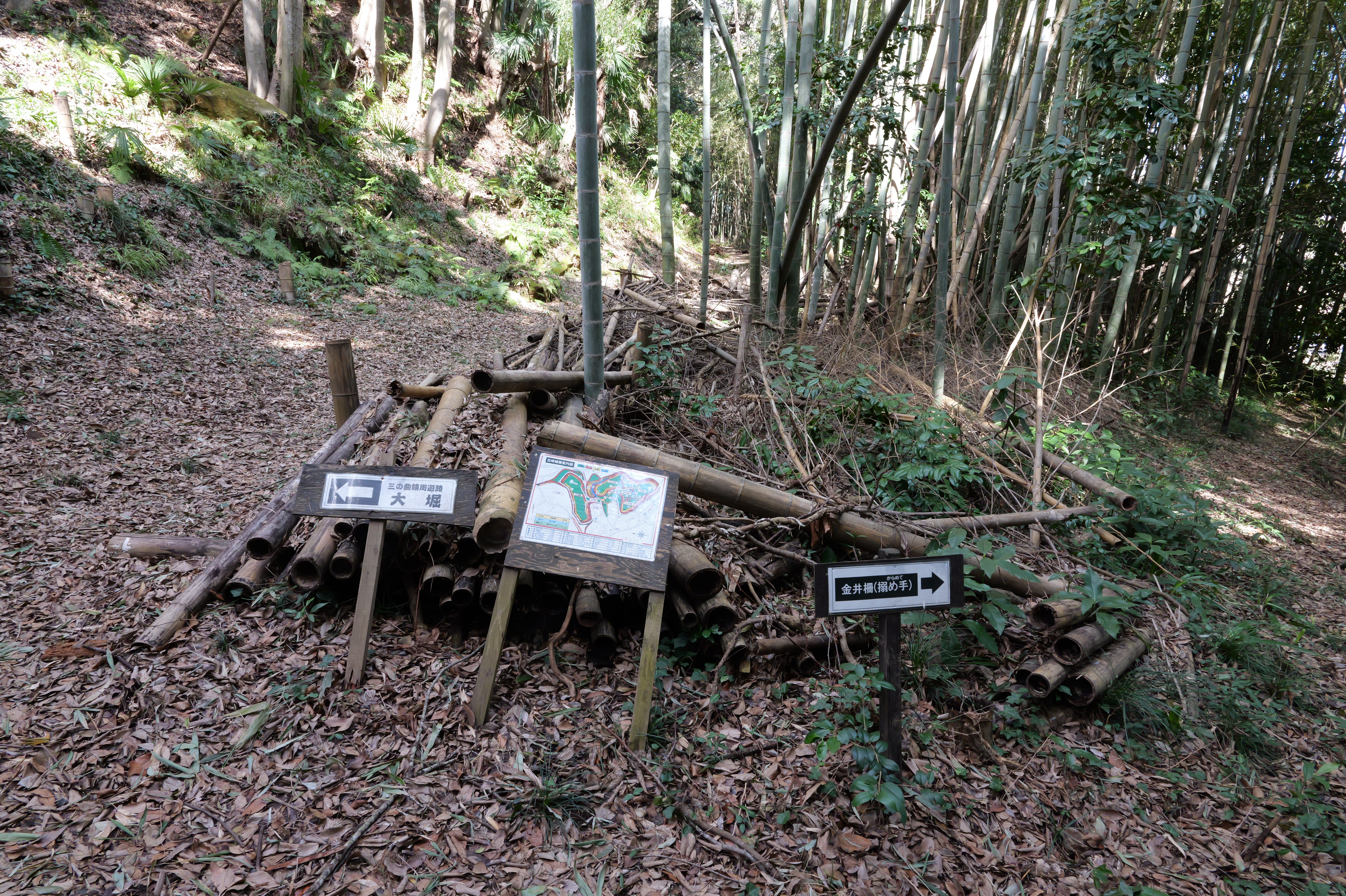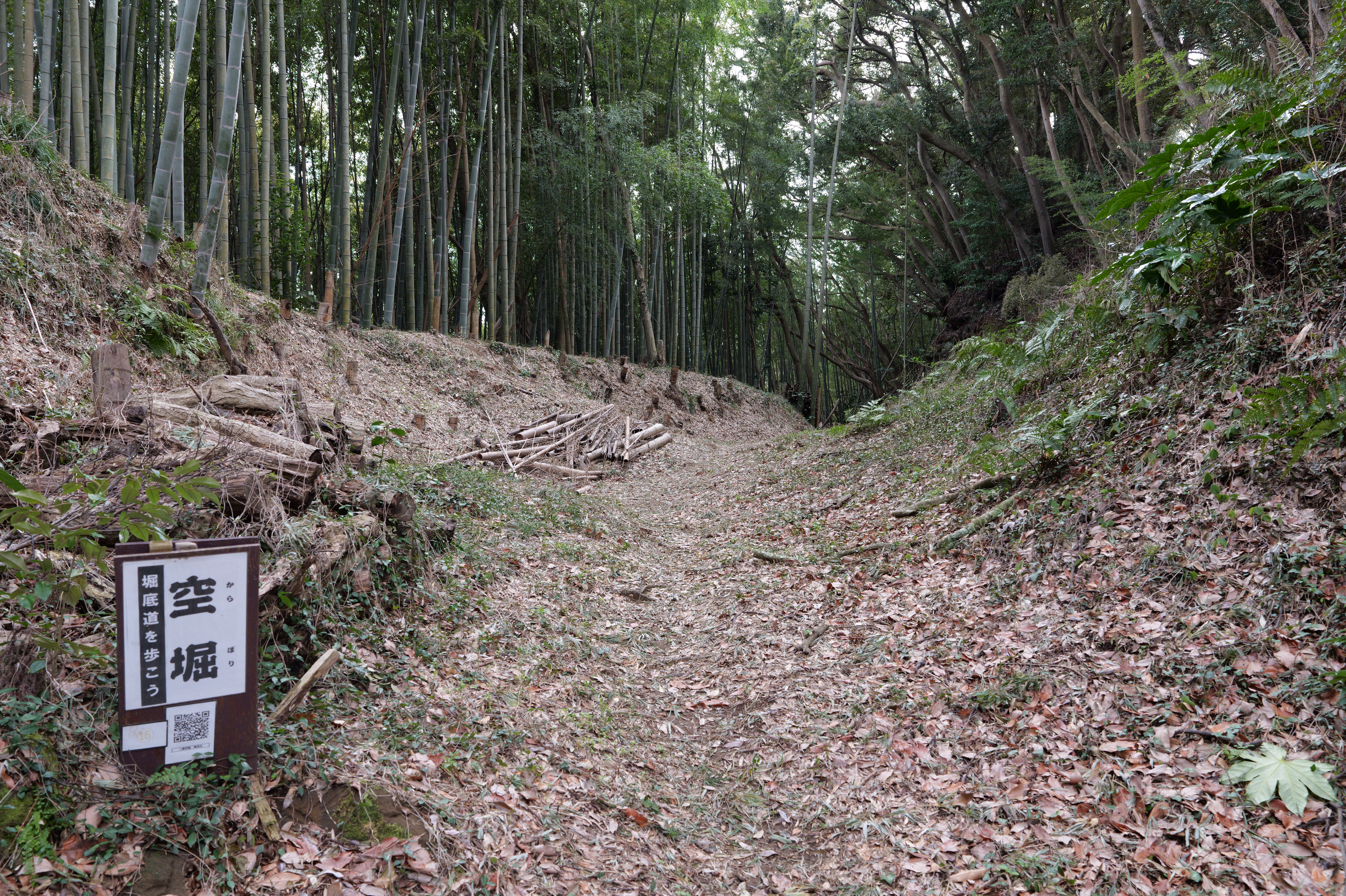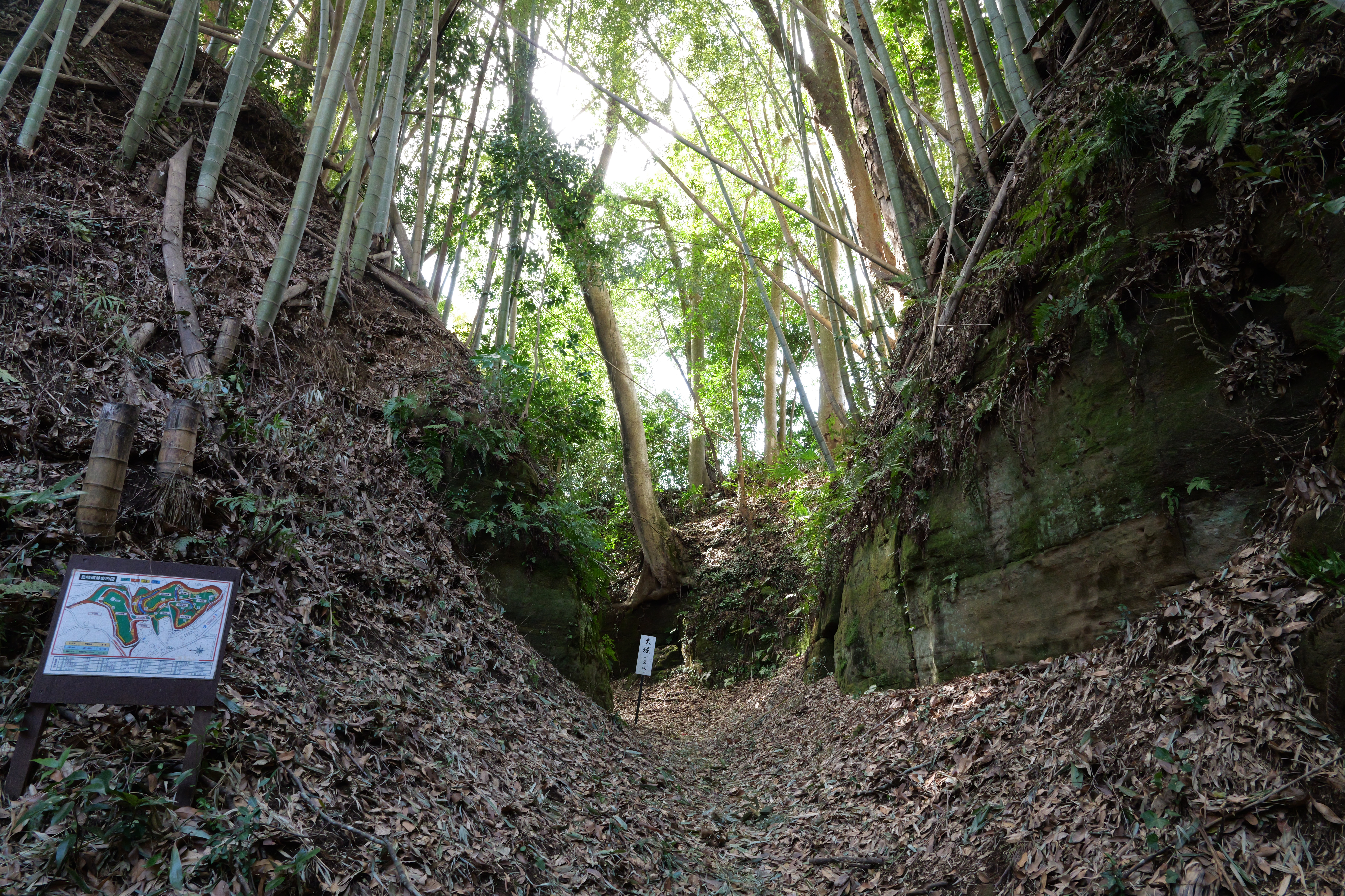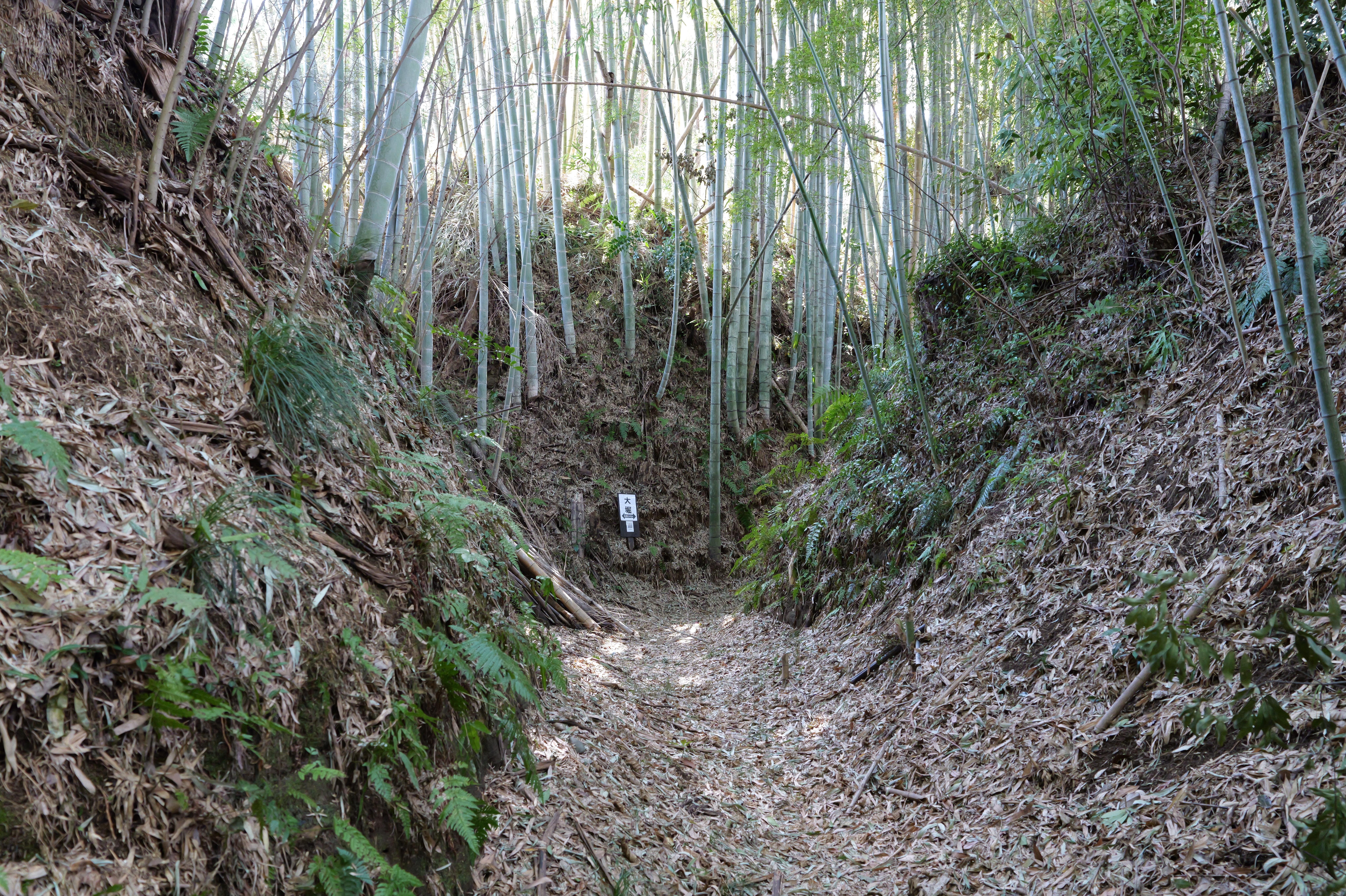 左に 三の曲輪の切岸、右に竹林を見ながら進んで行くと、左右岩盤になる場所に出ます。ここに「大堀」の看板が立っているということは、ここからが全長240メートルの大堀ですね。いや、ほんとに感動ものの堀です。今日は天気がよかったからか、それほど暗くはなかったですが、日が照っていないと相当暗い堀底道かと思います。 結構蛇行していてアップダウンもあります。
